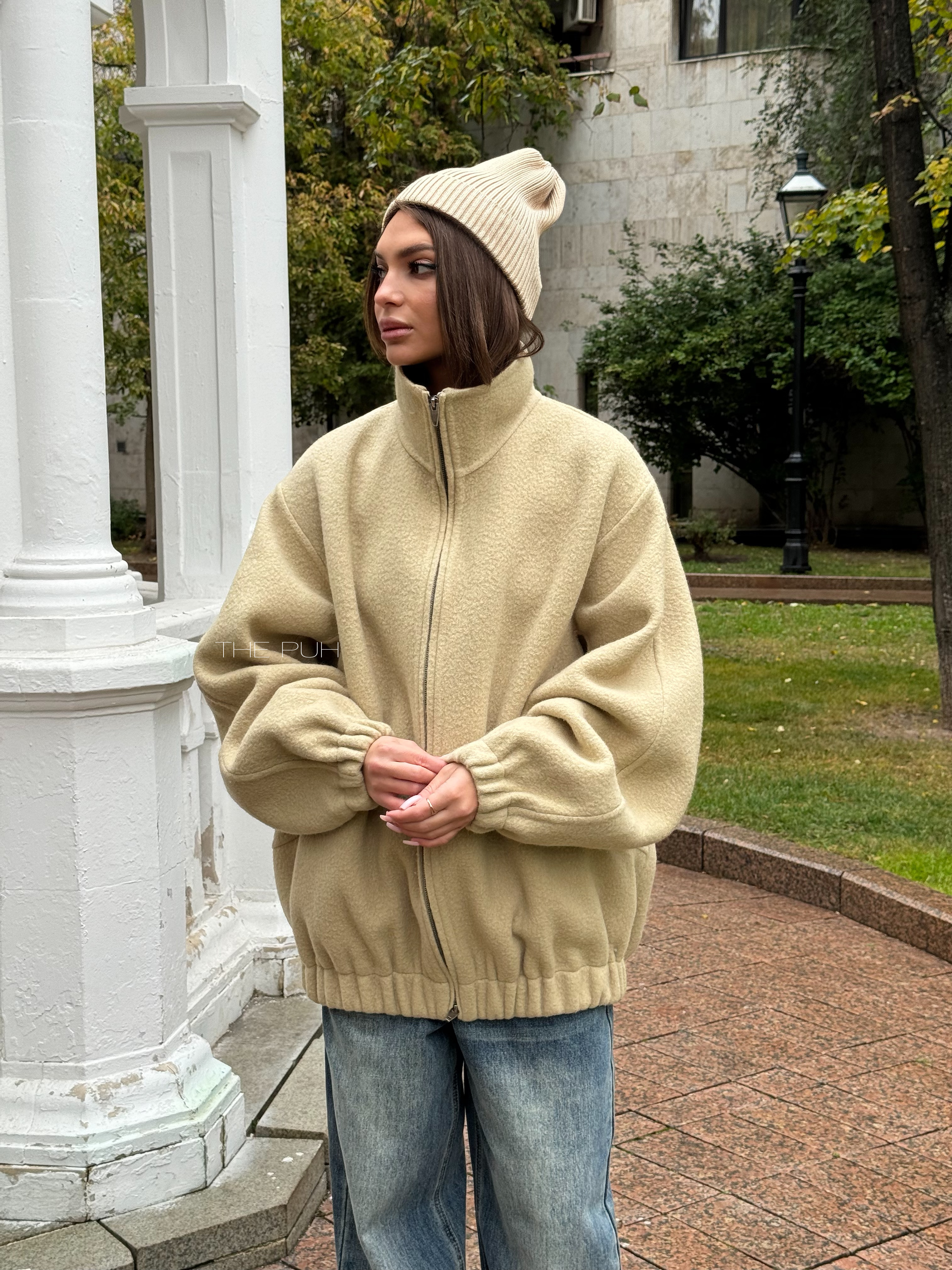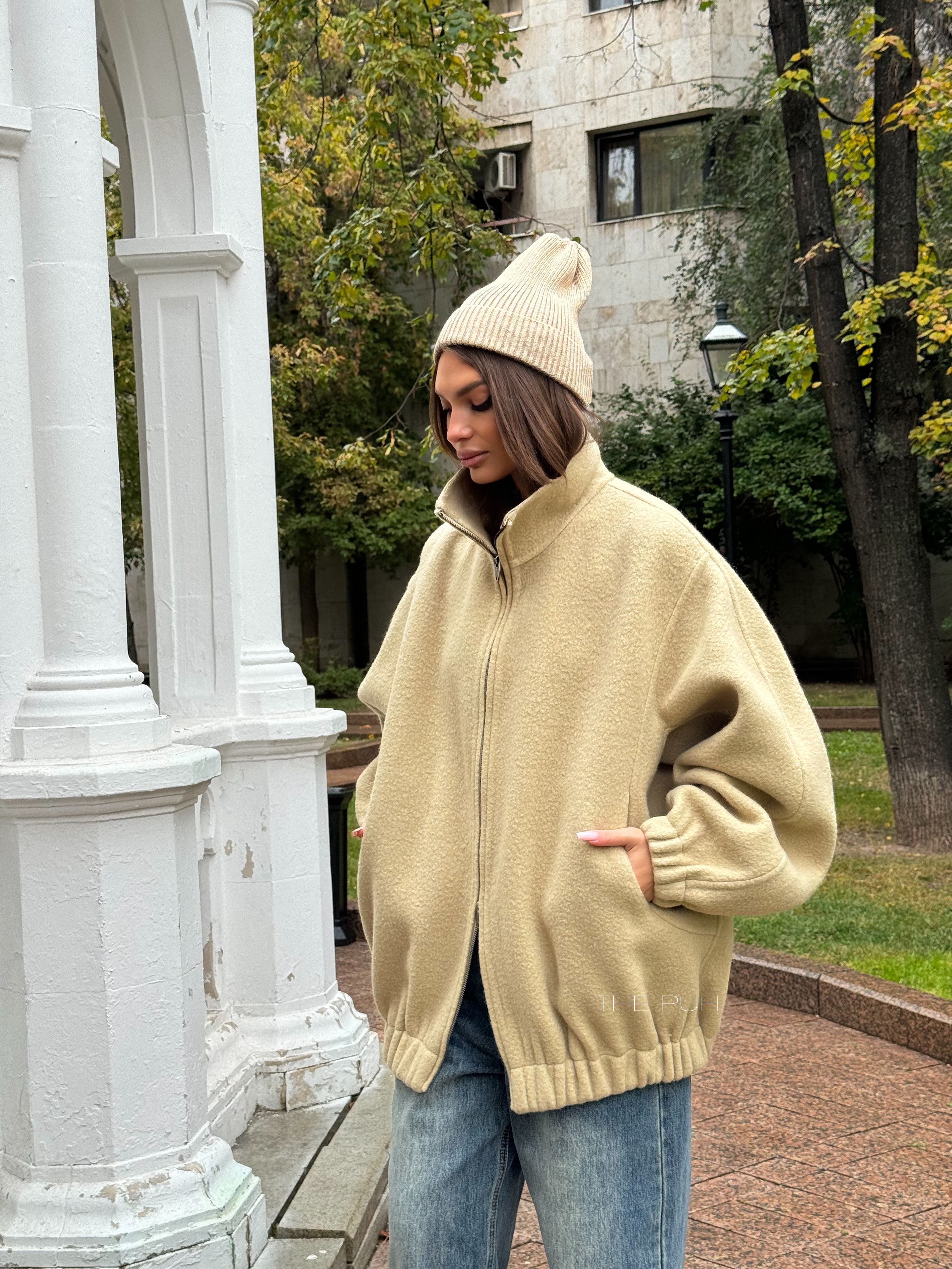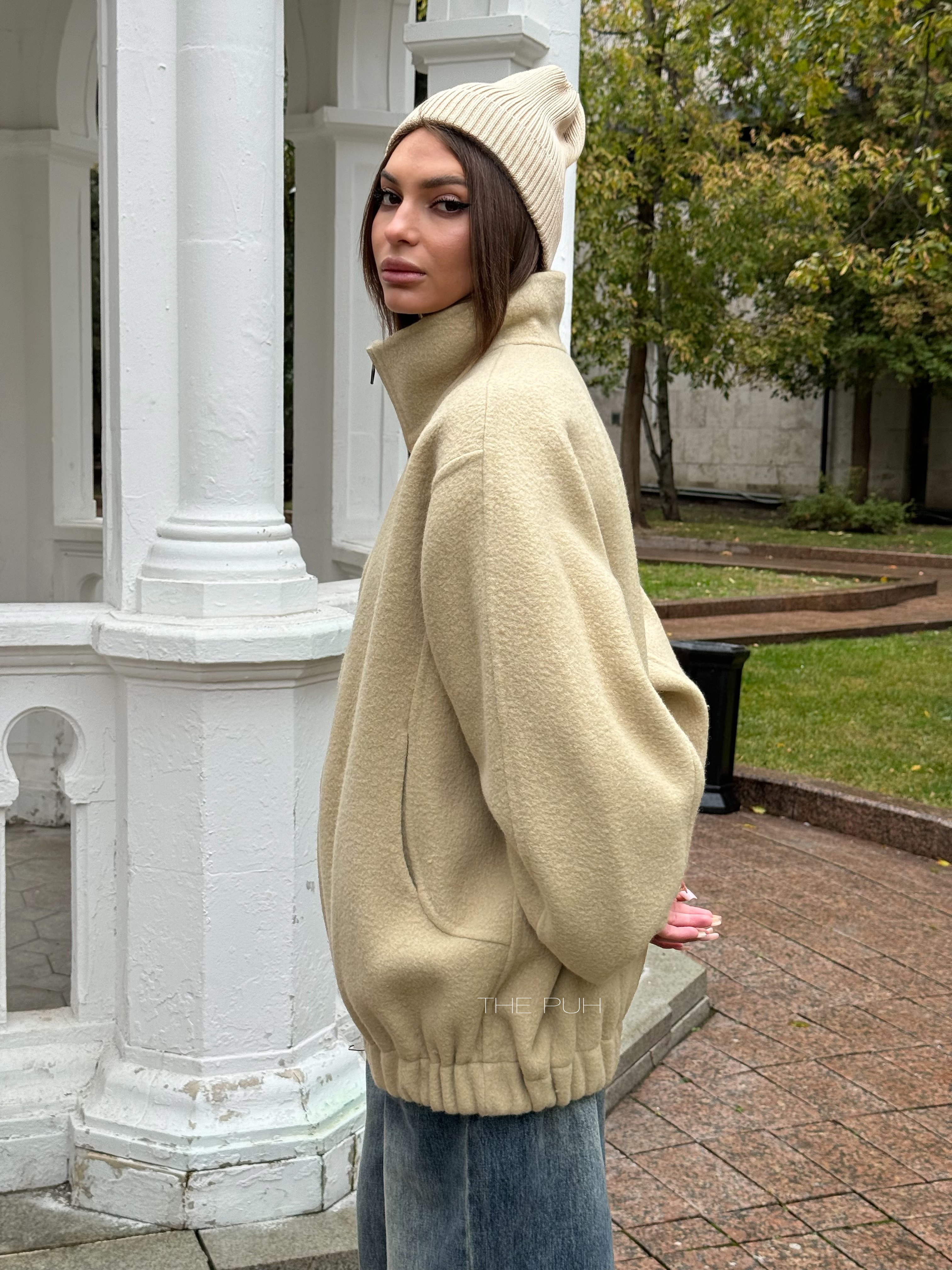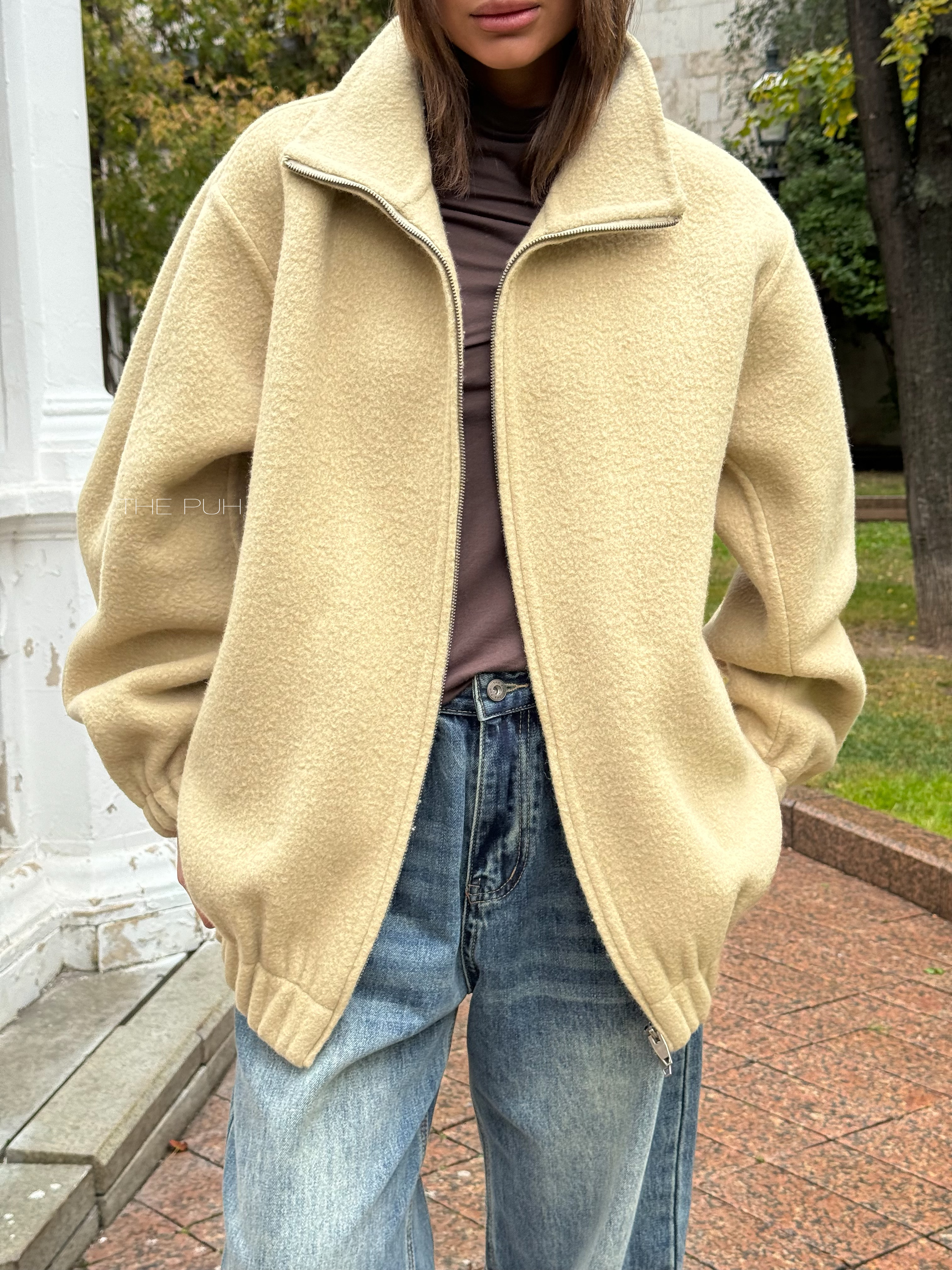 Бежевый оверсайз бомбер на молнии выполнен из пальтовой шерсти без подкладки. Модель в минималистичном дизайне и классической расцветке идеально впишется в осенний гардероб.