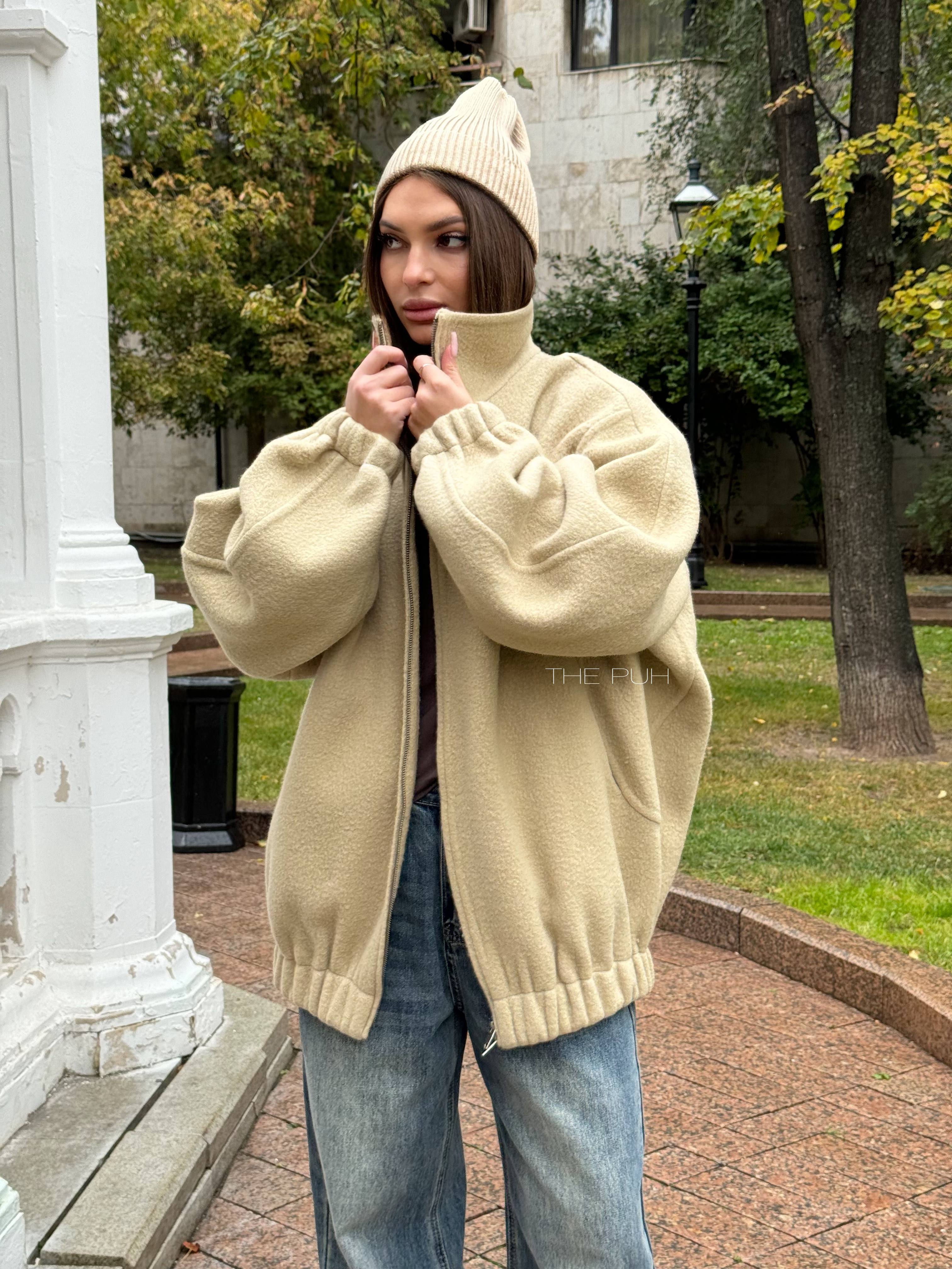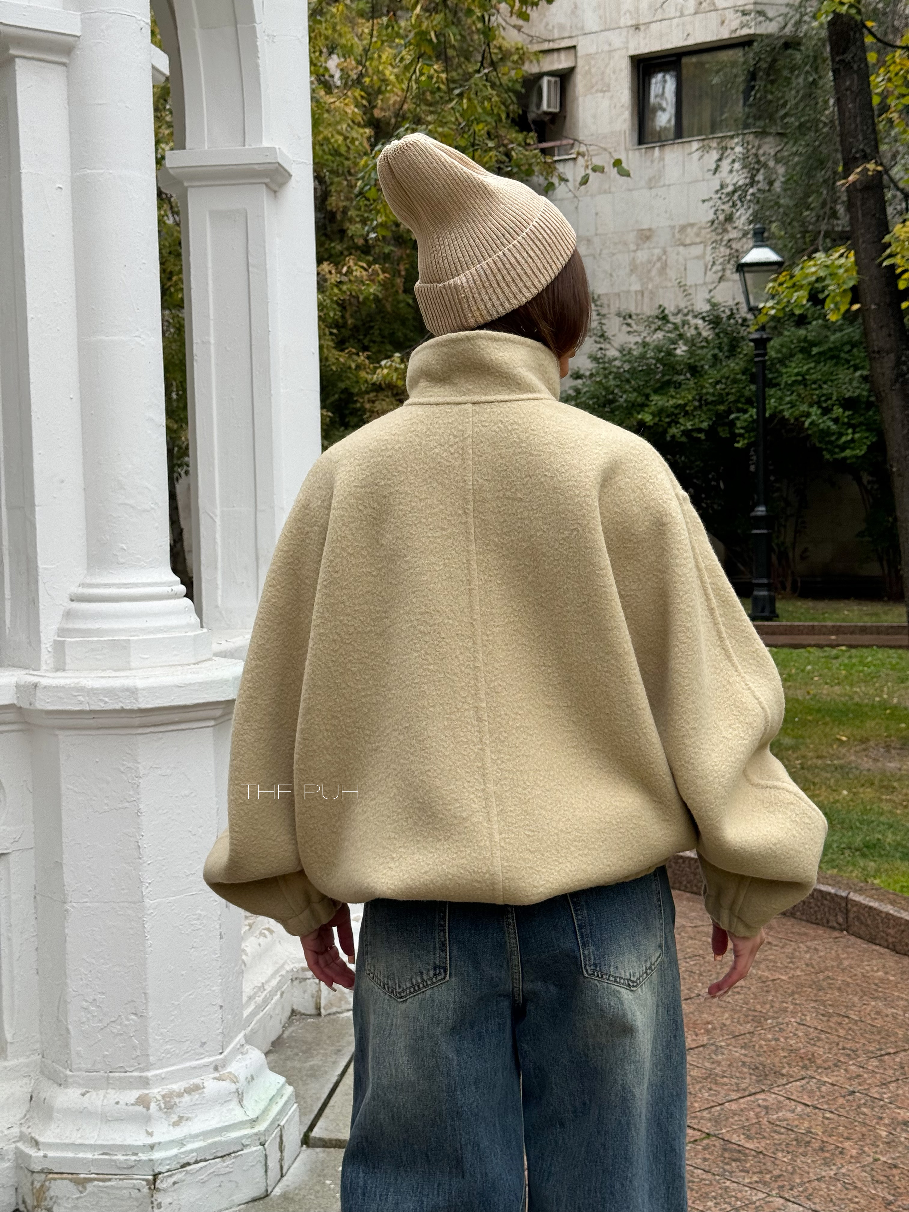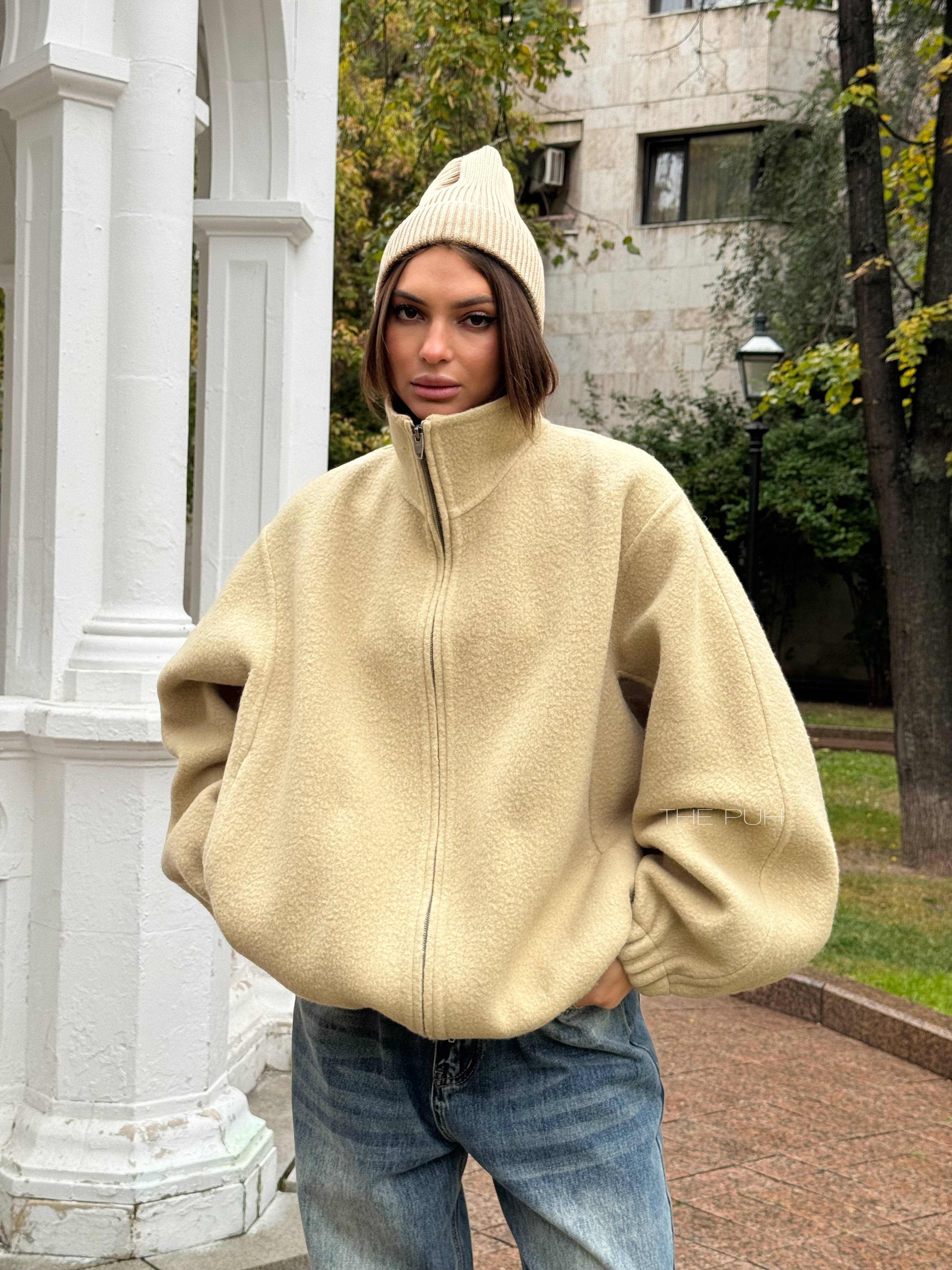 Бежевый оверсайз бомбер на молнии выполнен из пальтовой шерсти без подкладки. Модель в минималистичном дизайне и классической расцветке идеально впишется в осенний гардероб.
