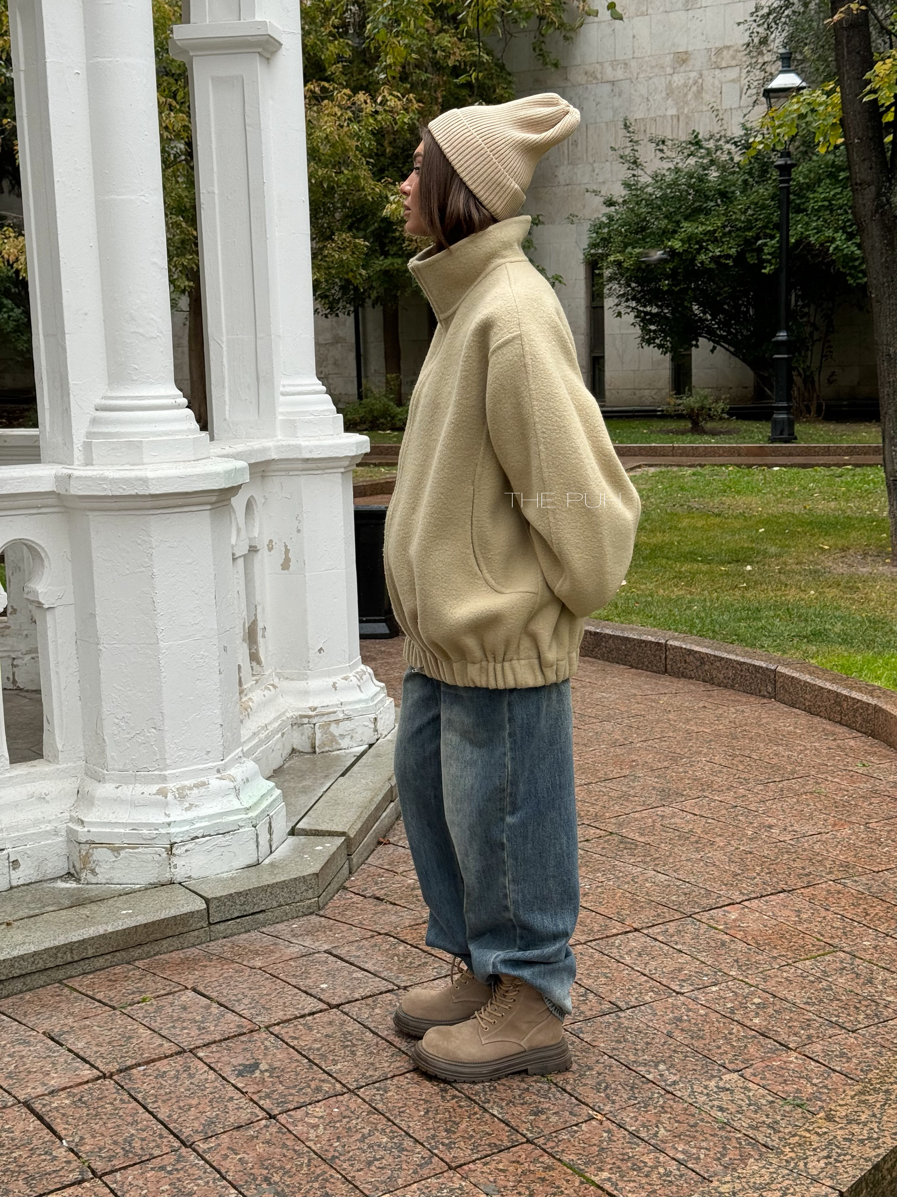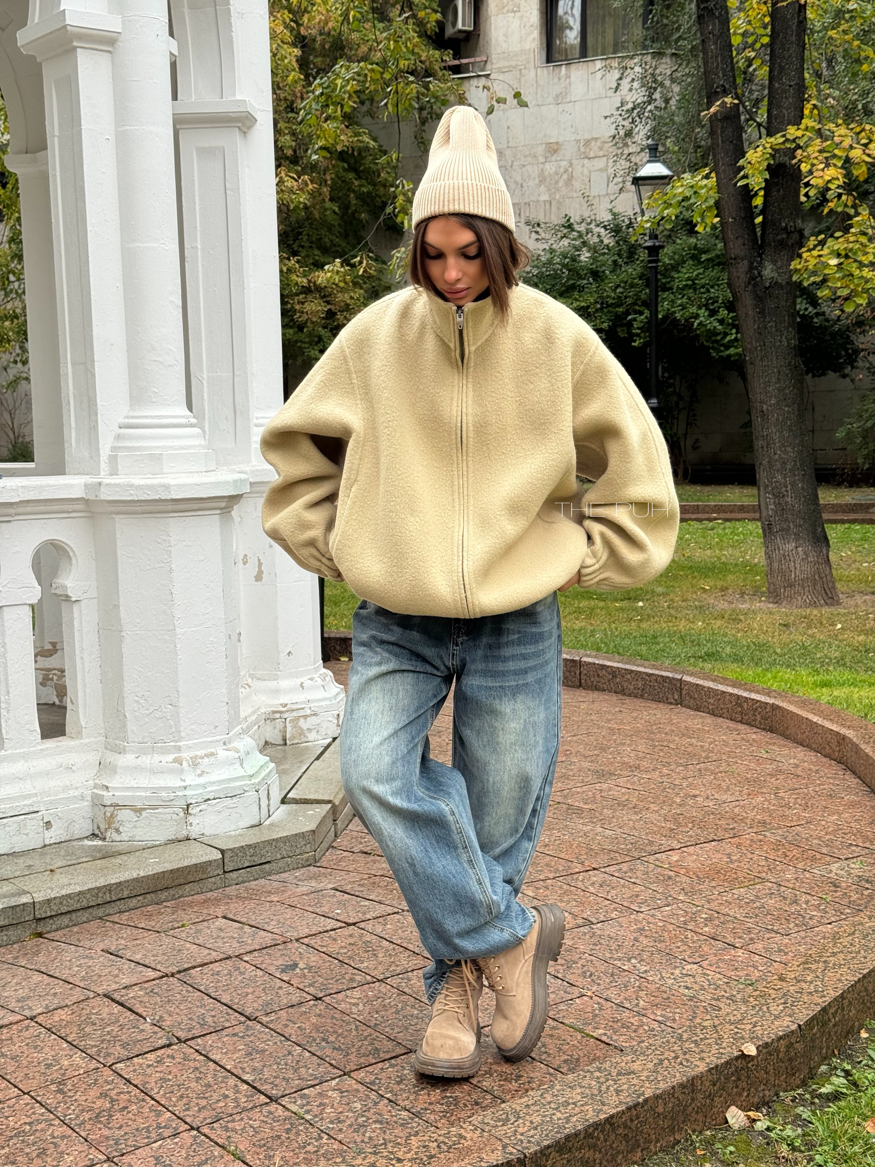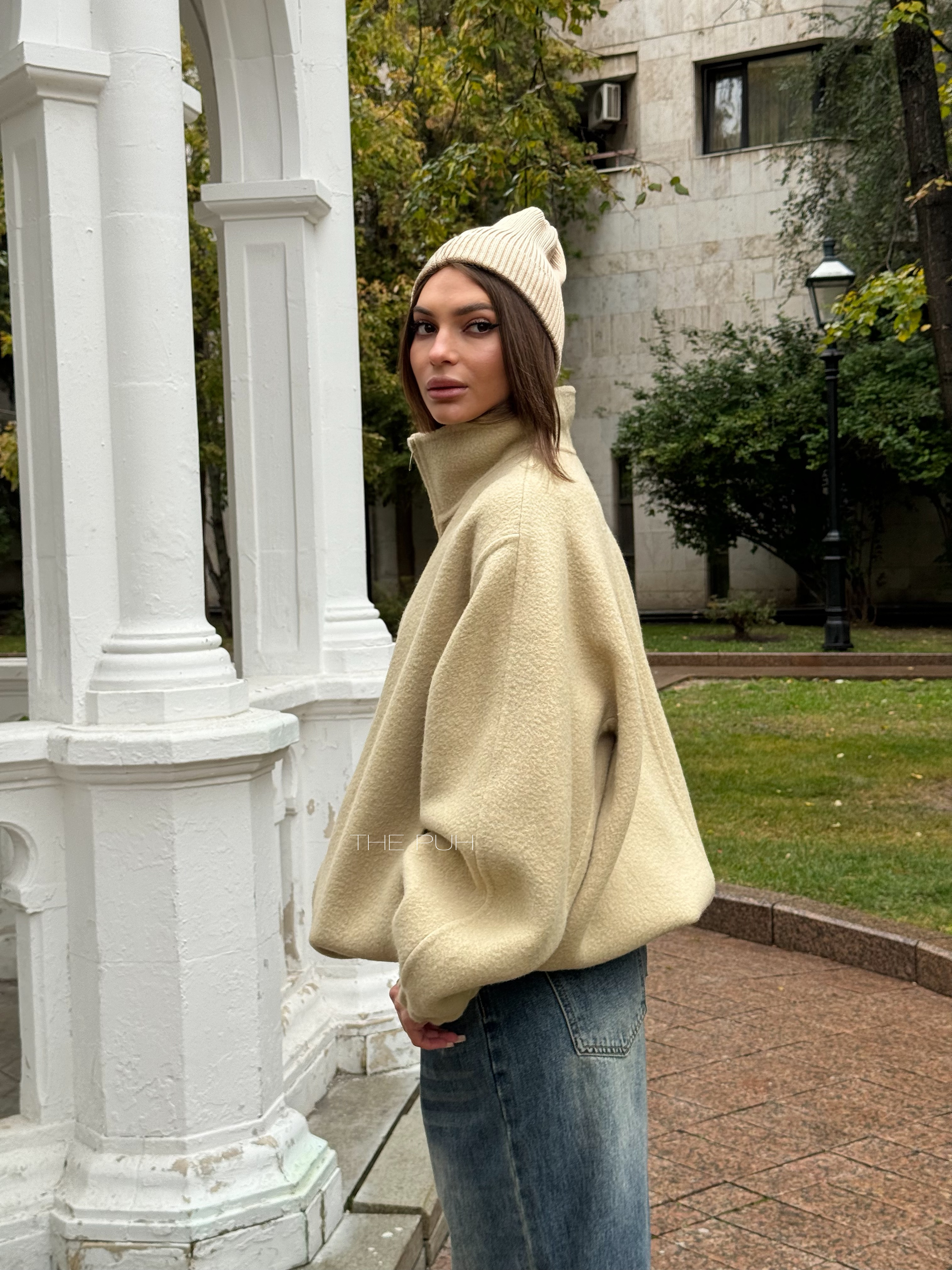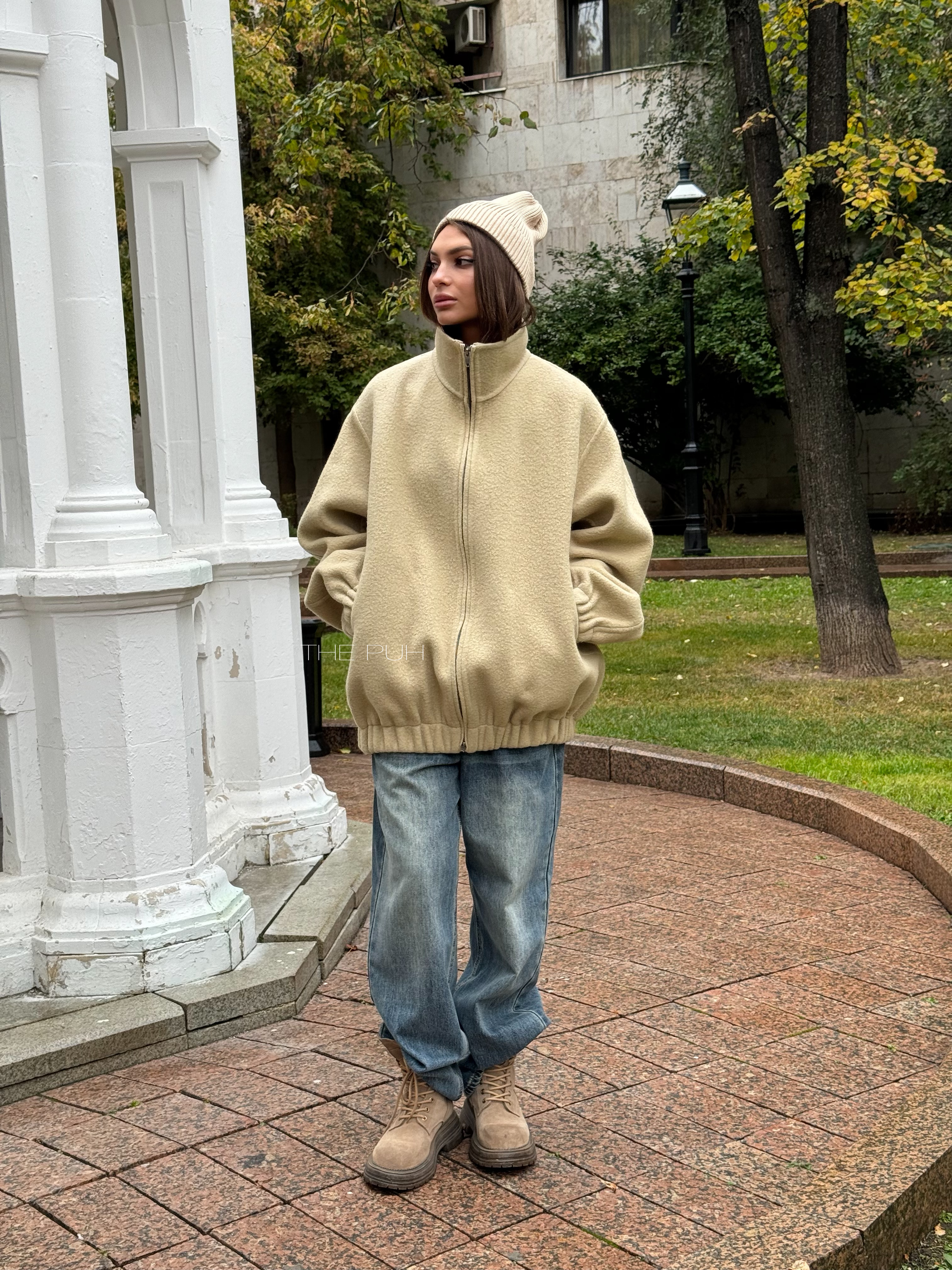 Бежевый оверсайз бомбер на молнии выполнен из пальтовой шерсти без подкладки. Модель в минималистичном дизайне и классической расцветке идеально впишется в осенний гардероб.
