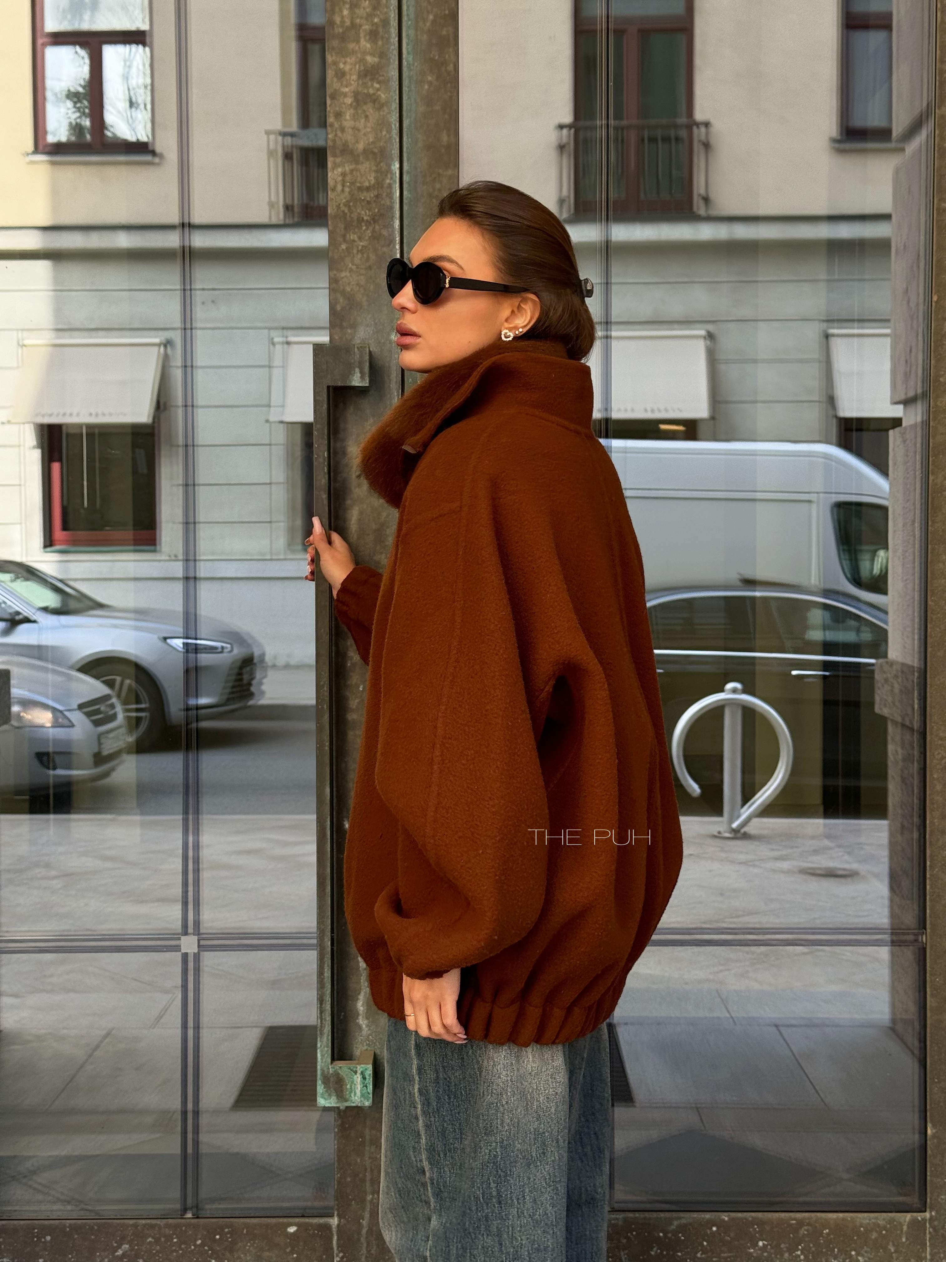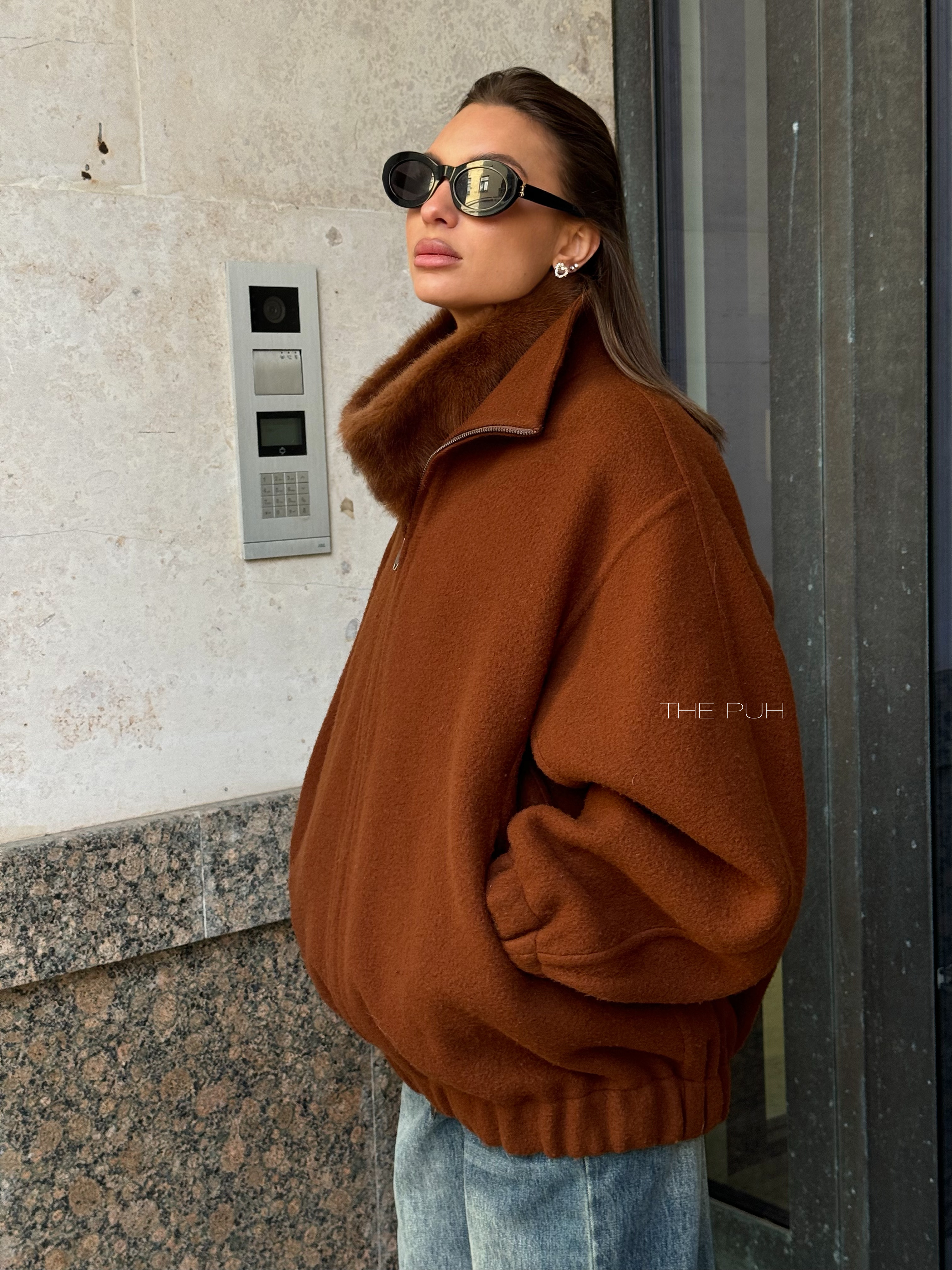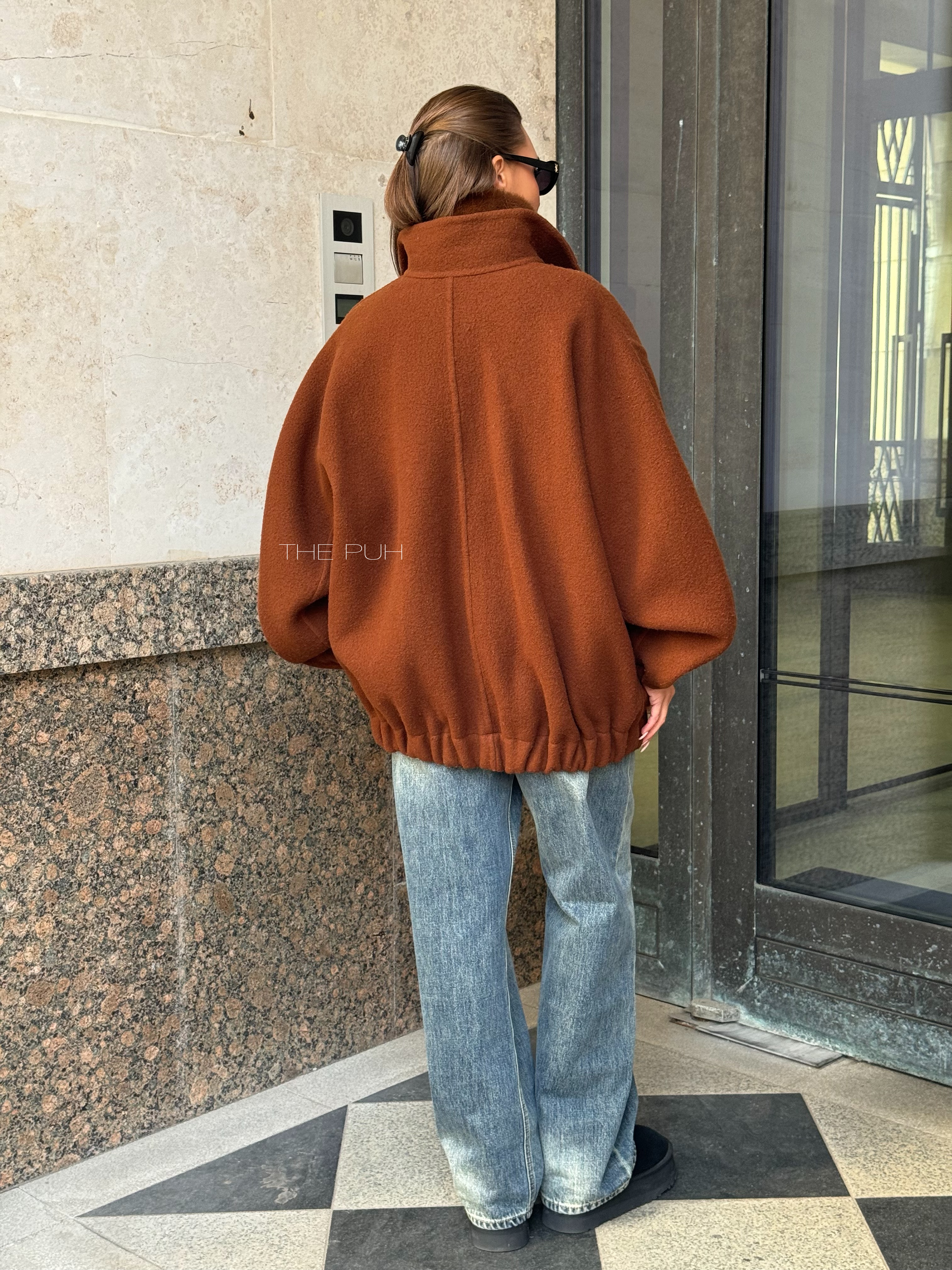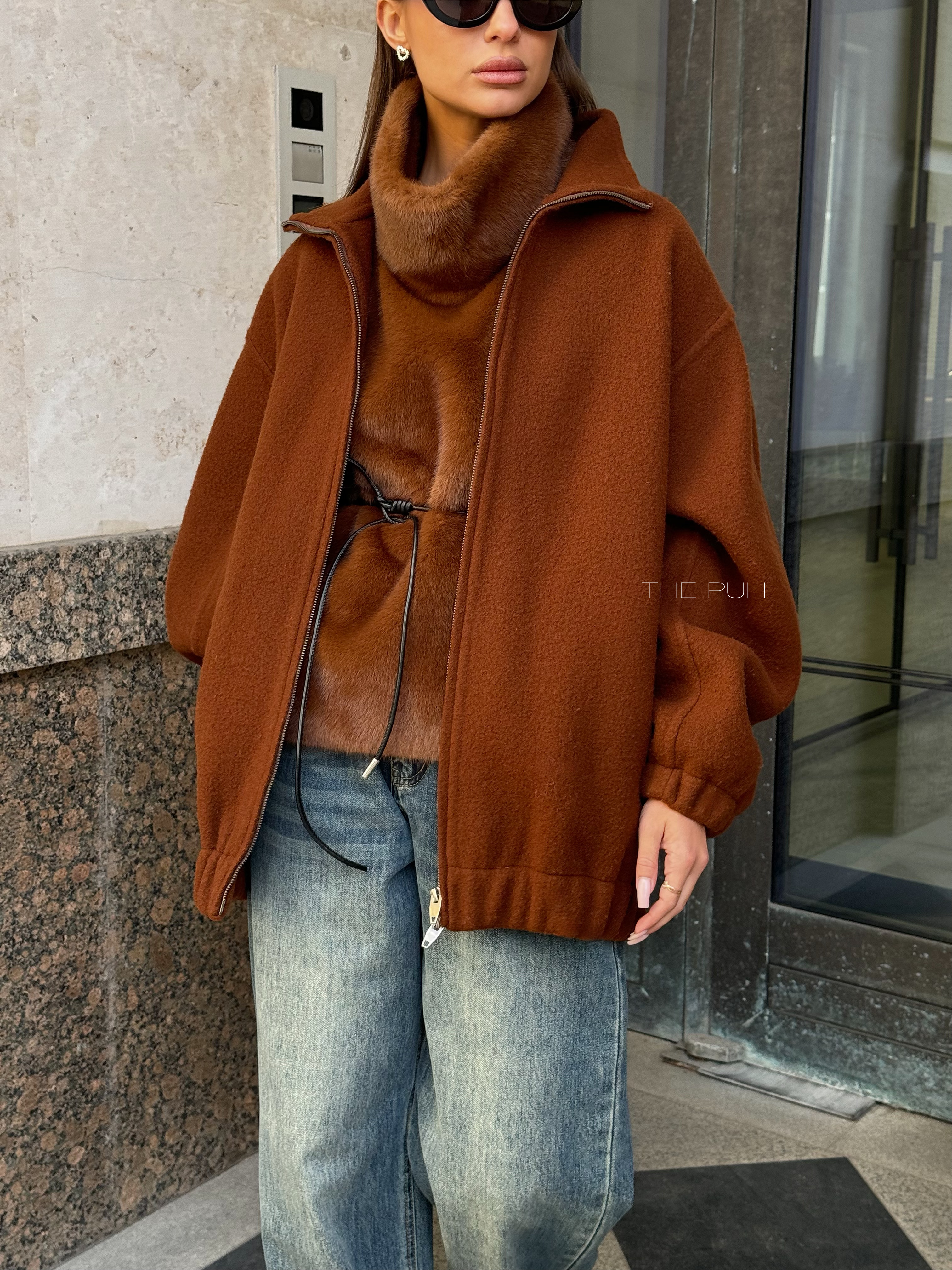 Коричневый оверсайз бомбер на молнии выполнен из пальтовой шерсти без подкладки. Модель в минималистичном дизайне и классической расцветке идеально впишется в осенний гардероб.