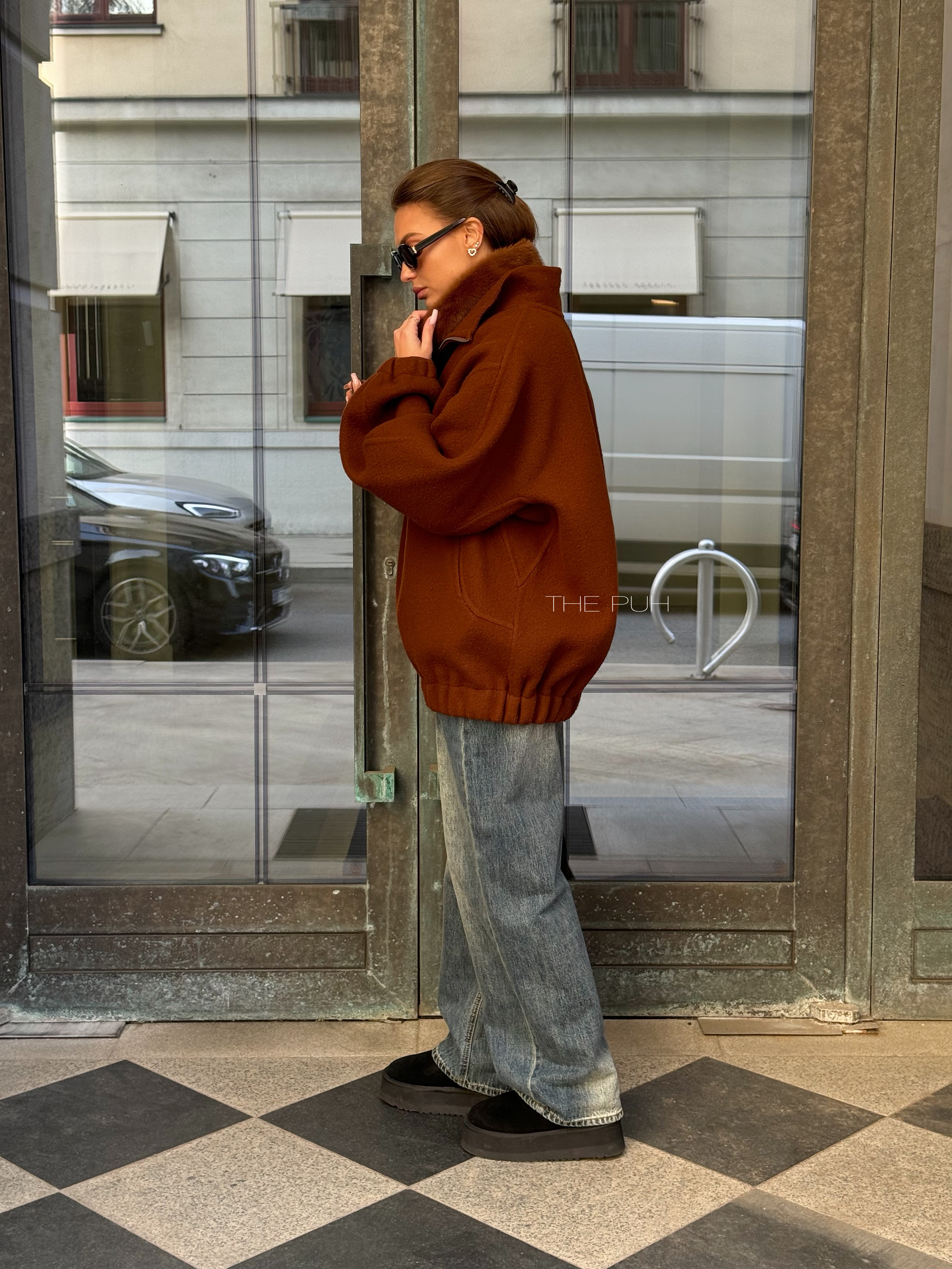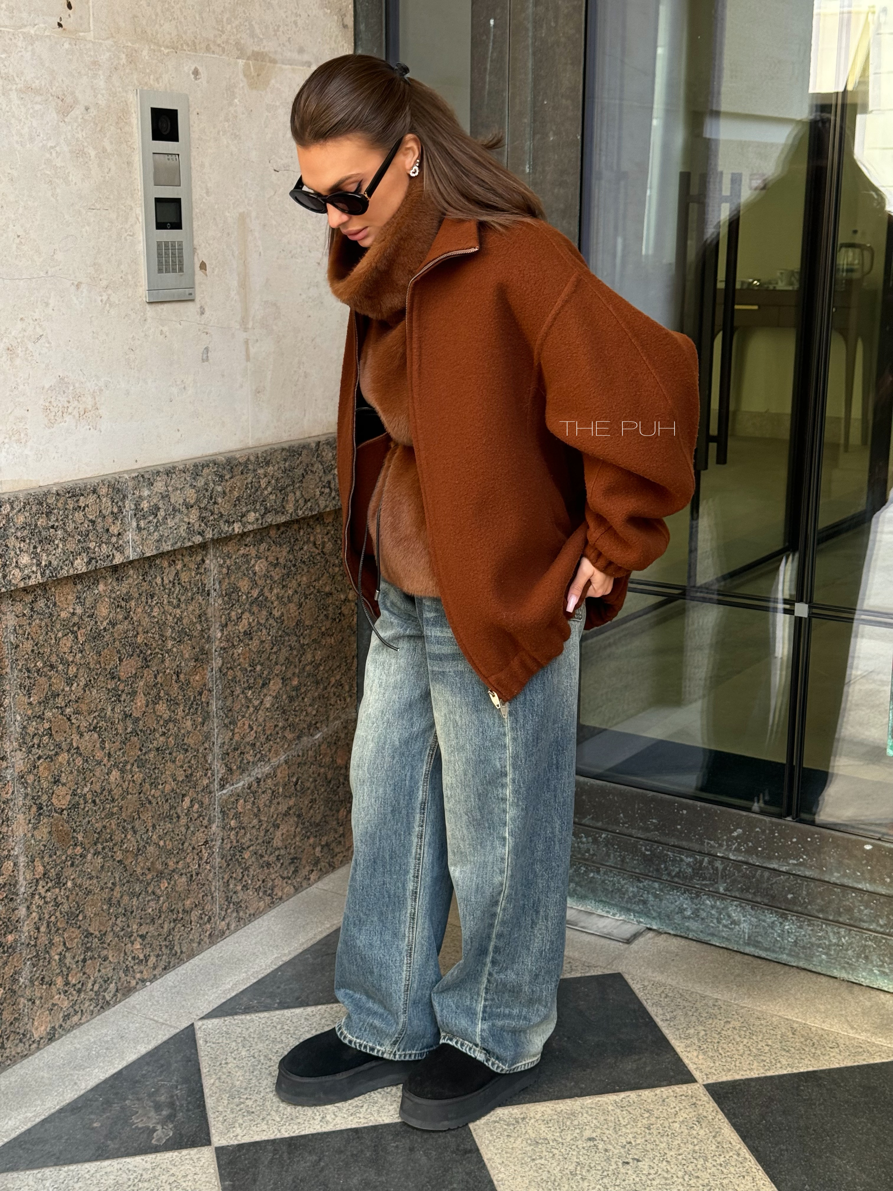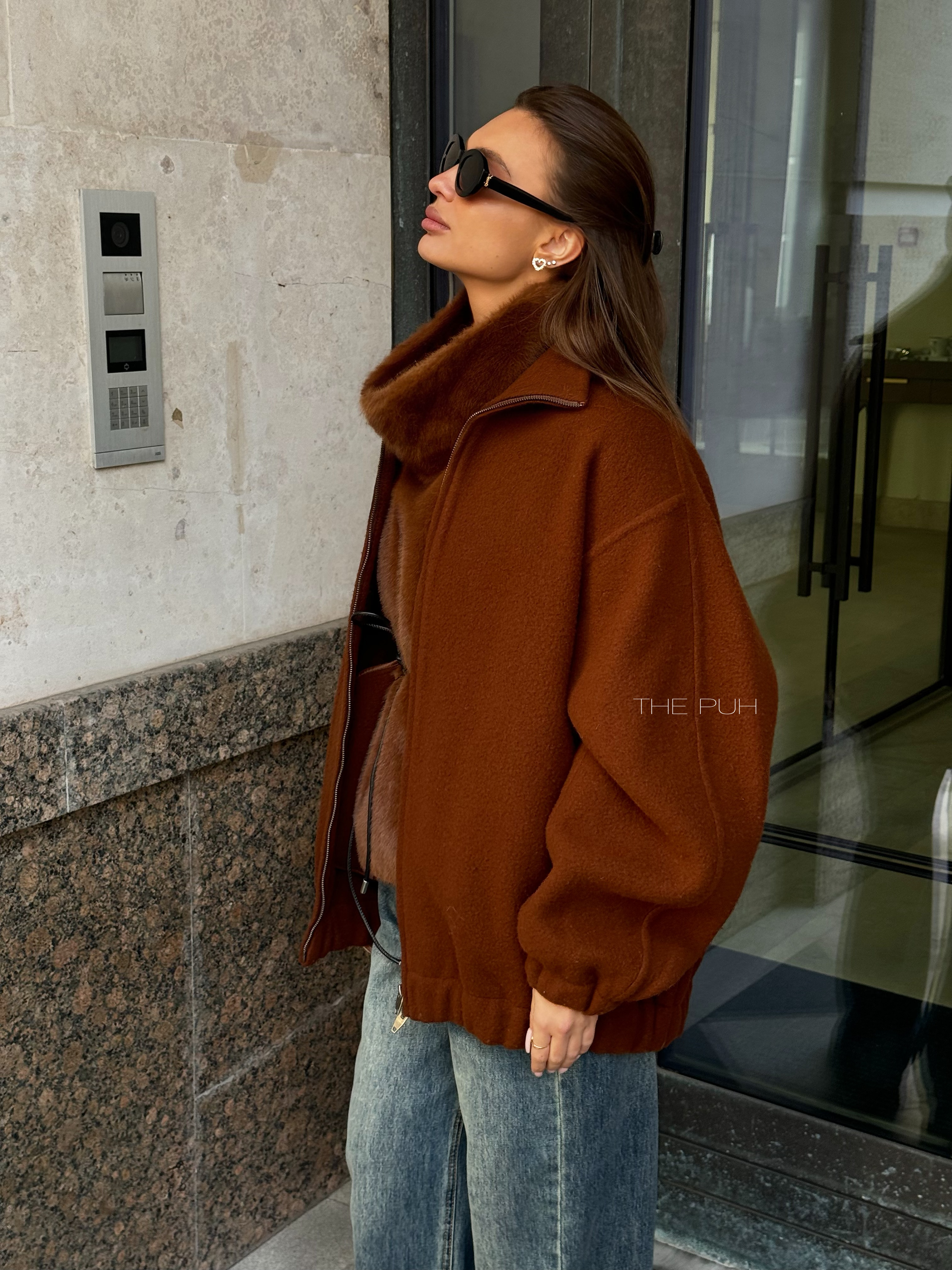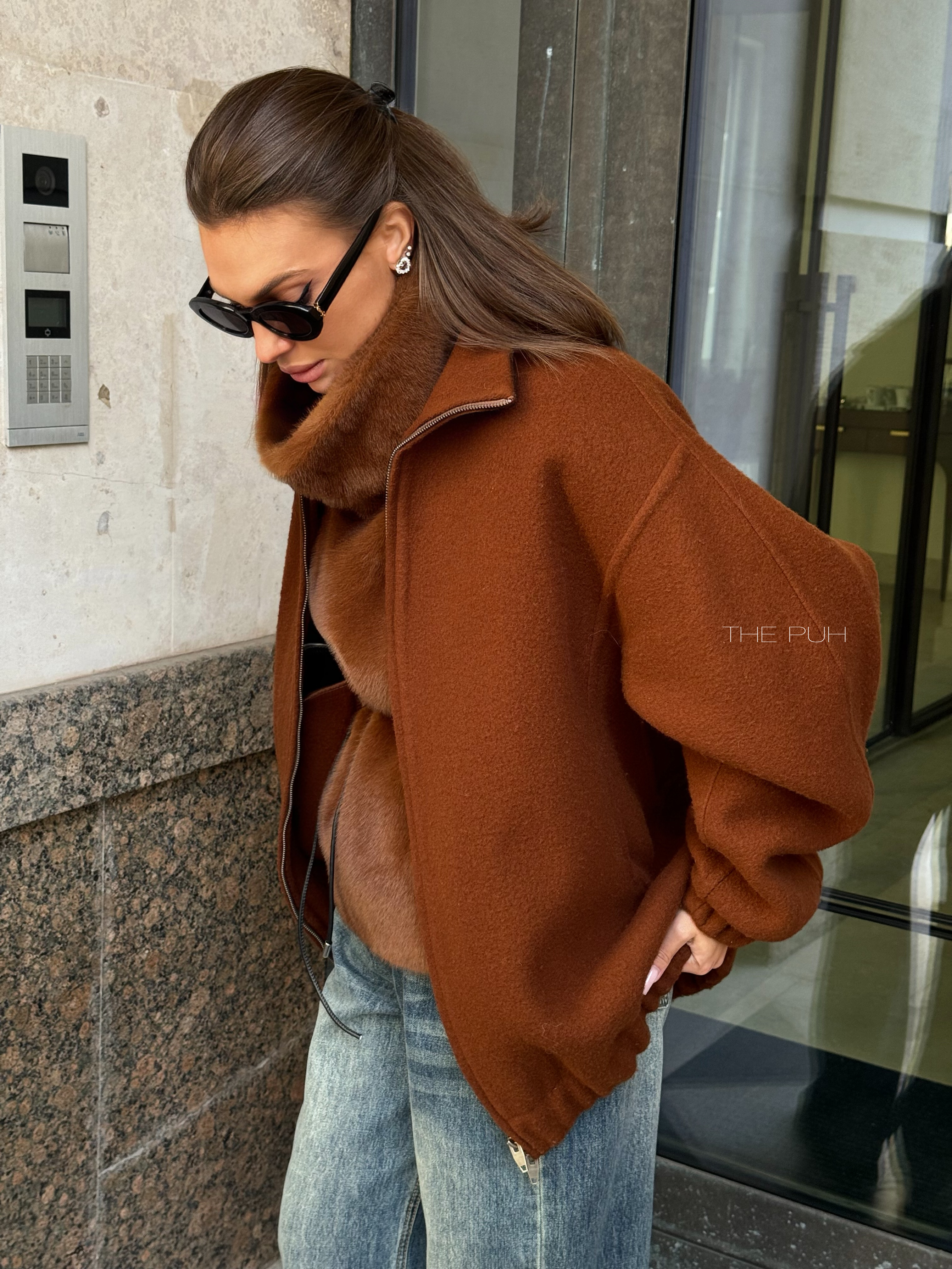 Коричневый оверсайз бомбер на молнии выполнен из пальтовой шерсти без подкладки. Модель в минималистичном дизайне и классической расцветке идеально впишется в осенний гардероб.