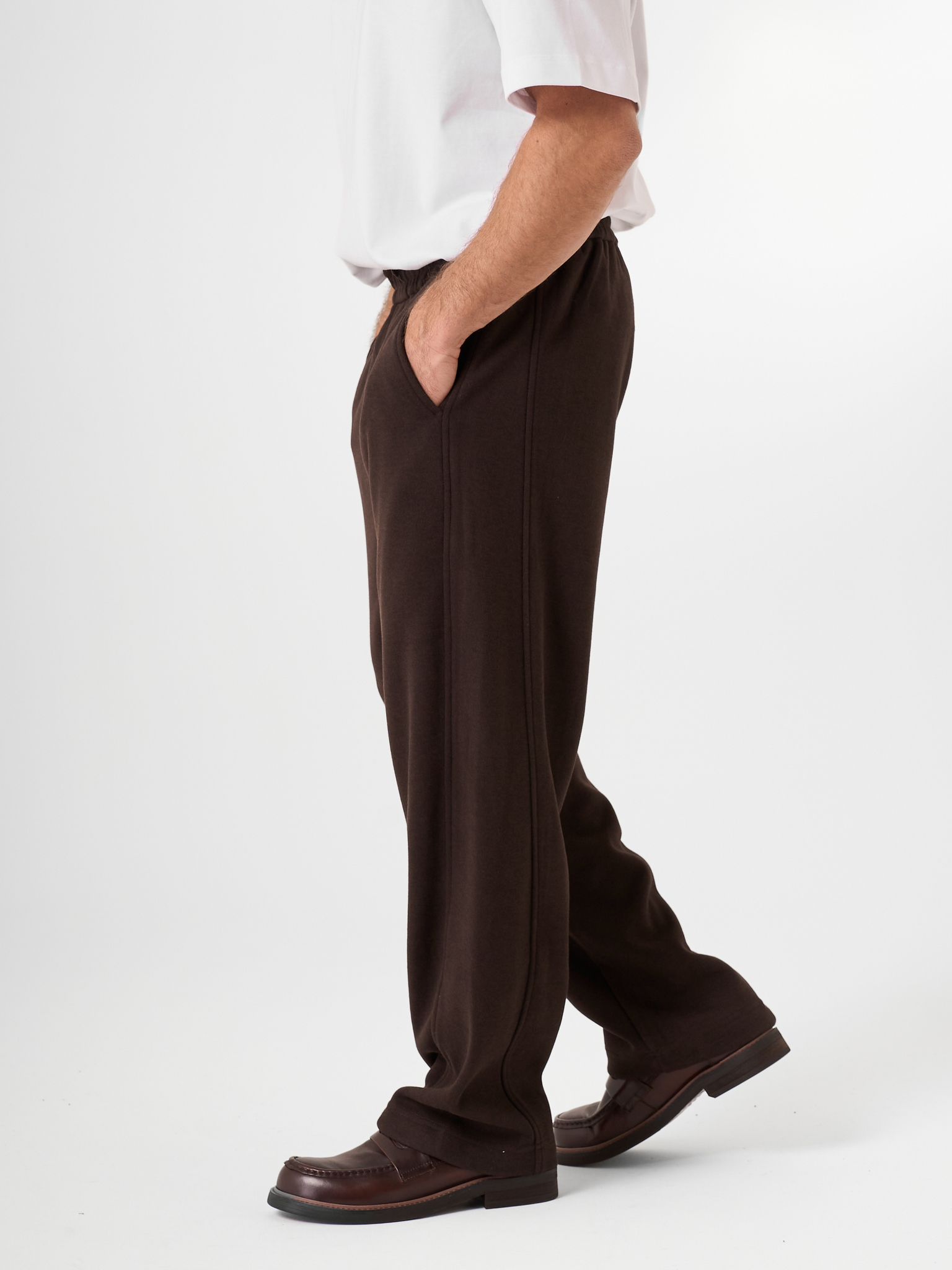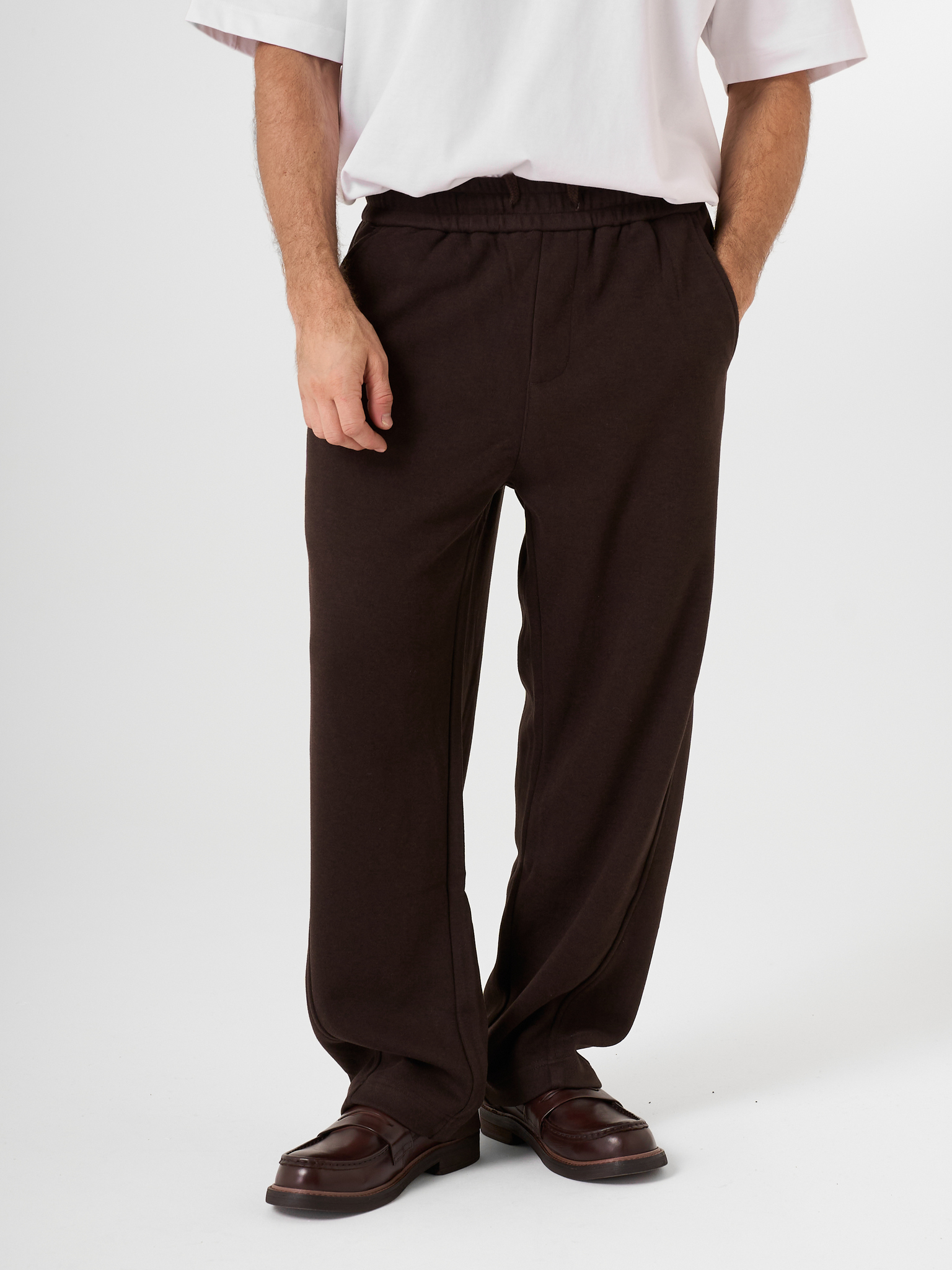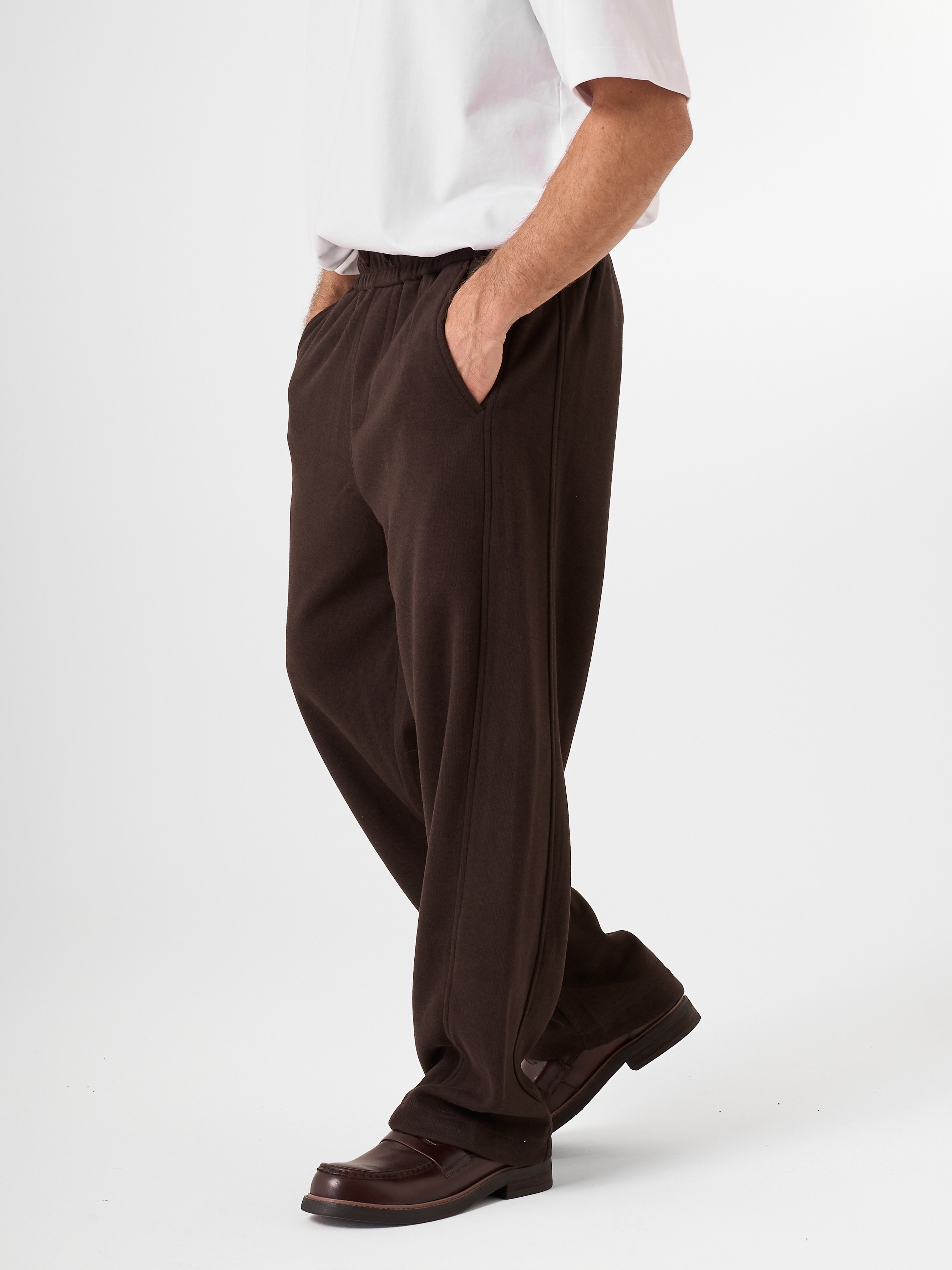 Трикотажные брюки на резинке выполнены из теплого трикотажа терракотового цвета и декорированы рельефными швами-лампасами по бокам.