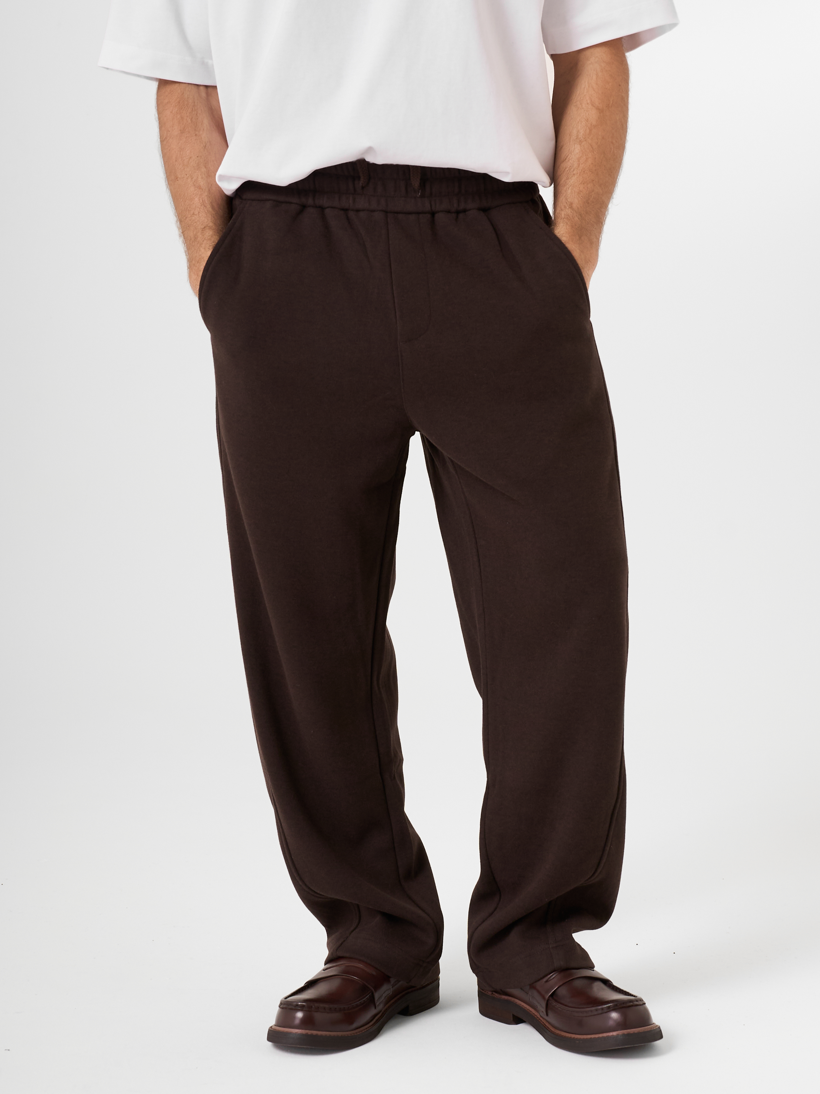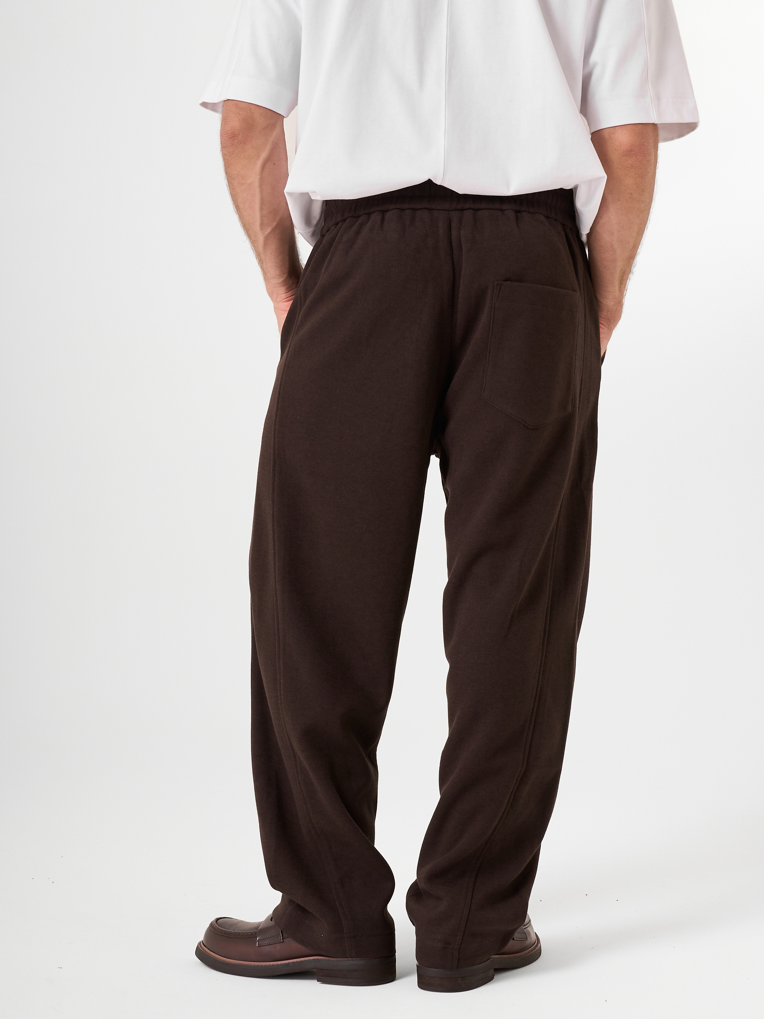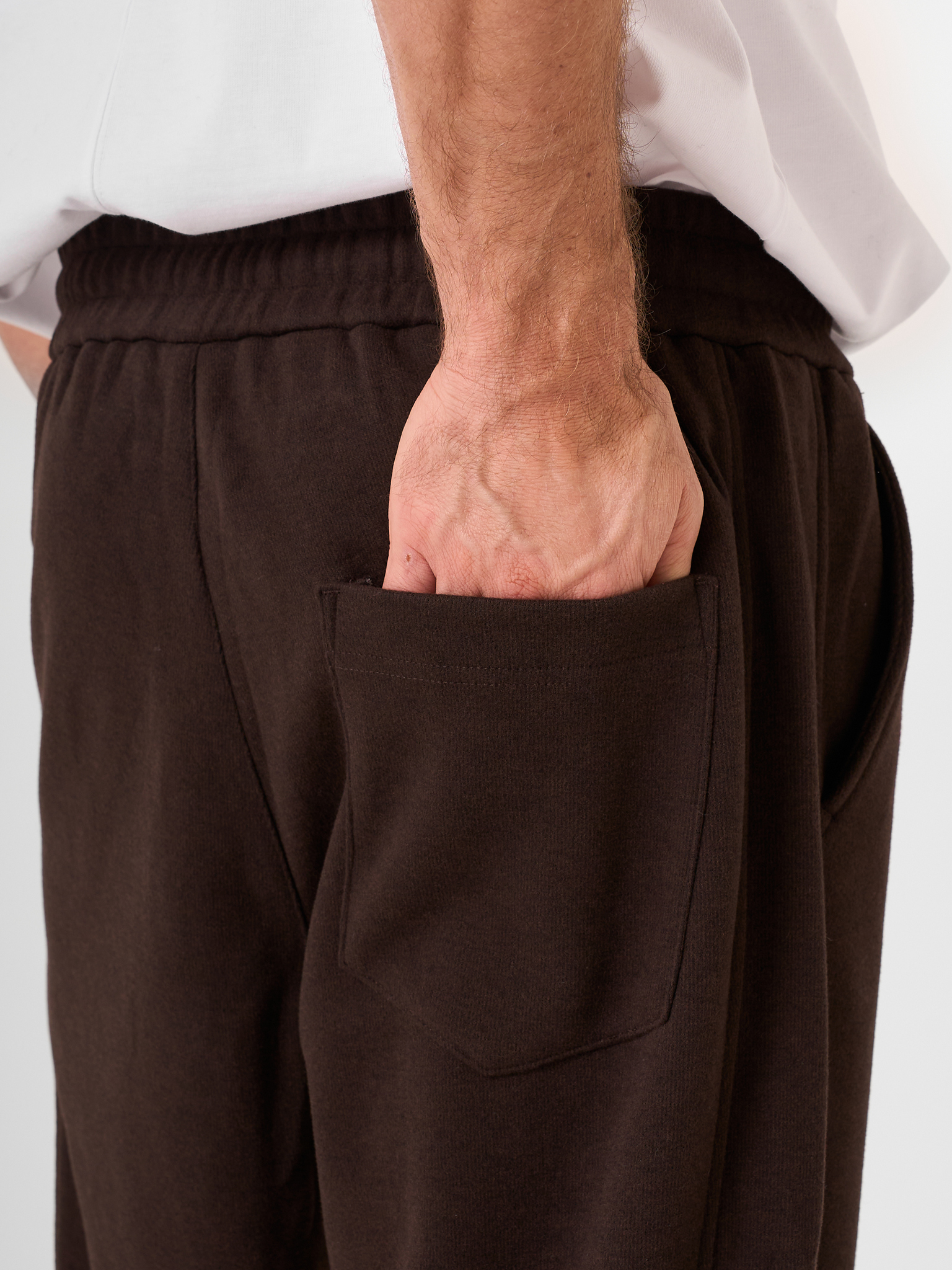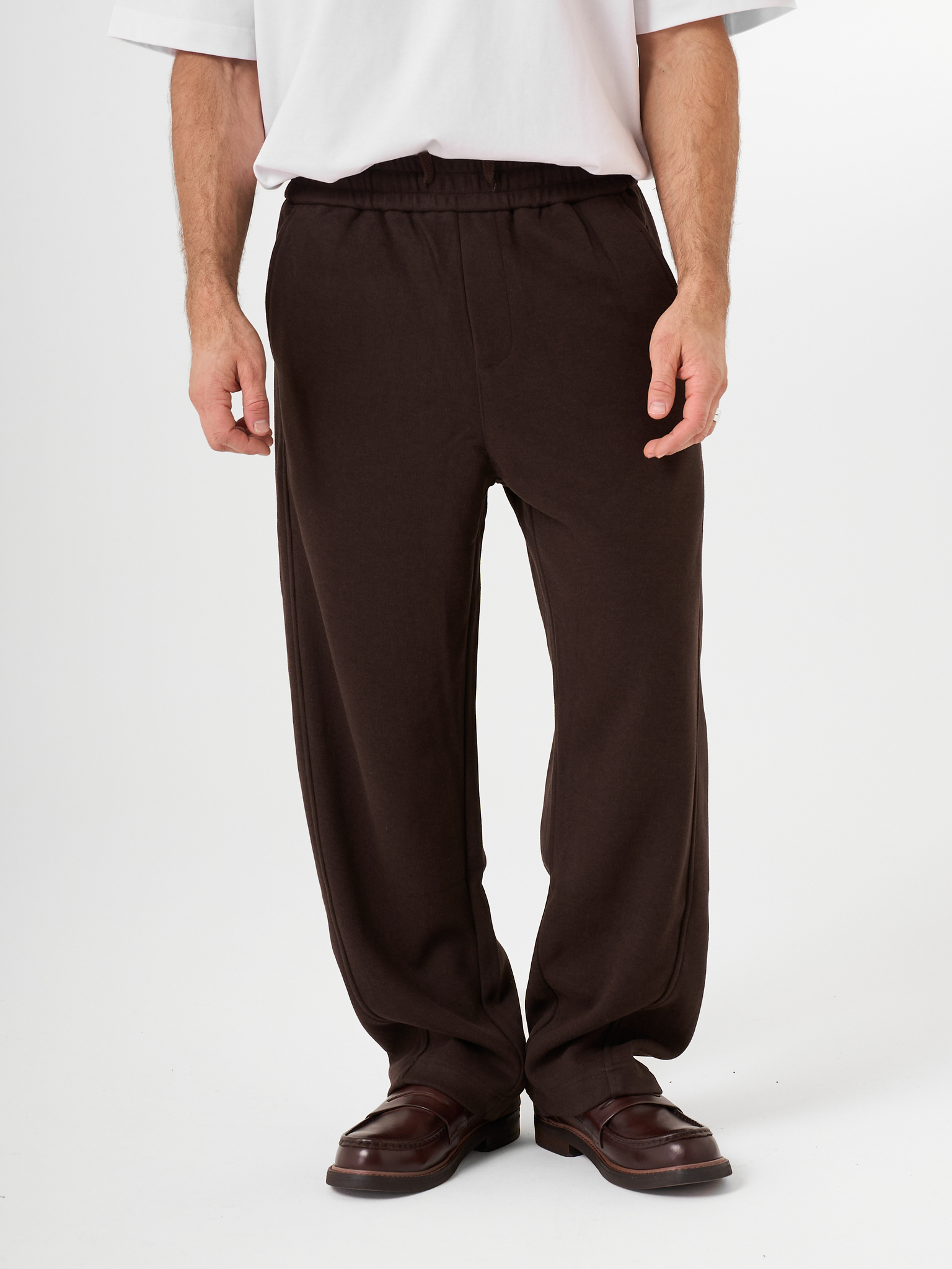 Трикотажные брюки на резинке выполнены из теплого трикотажа терракотового цвета и декорированы рельефными швами-лампасами по бокам.