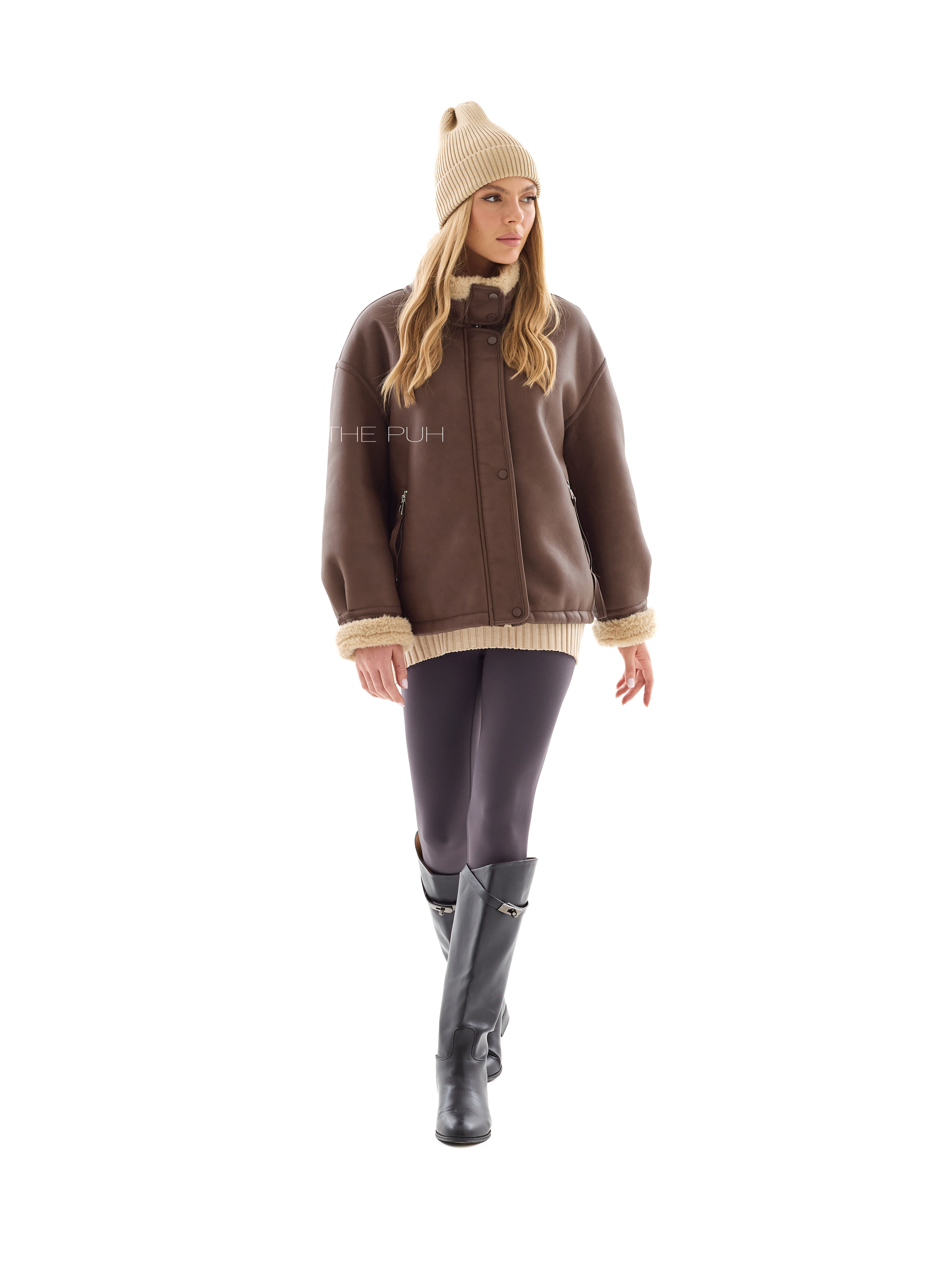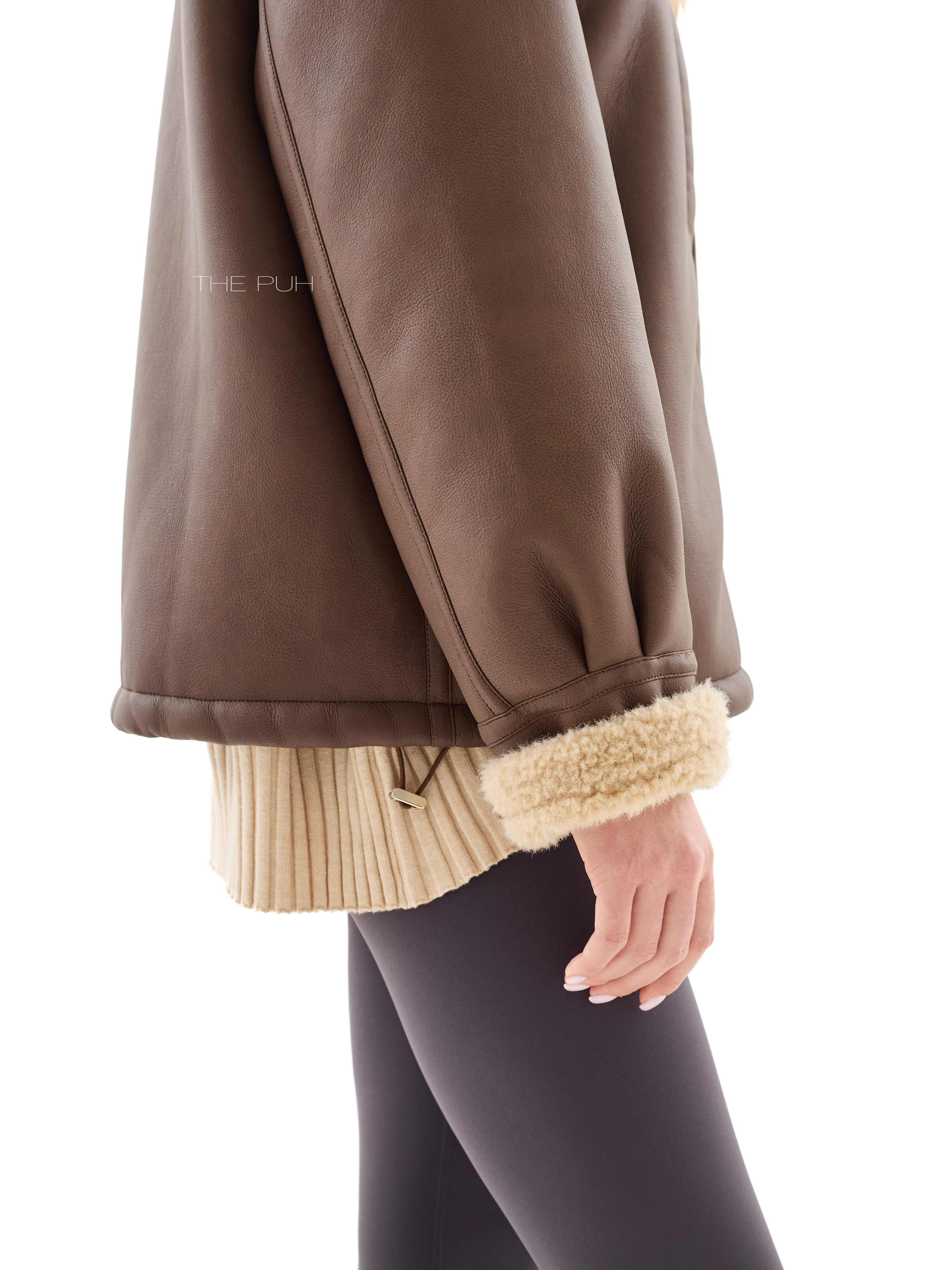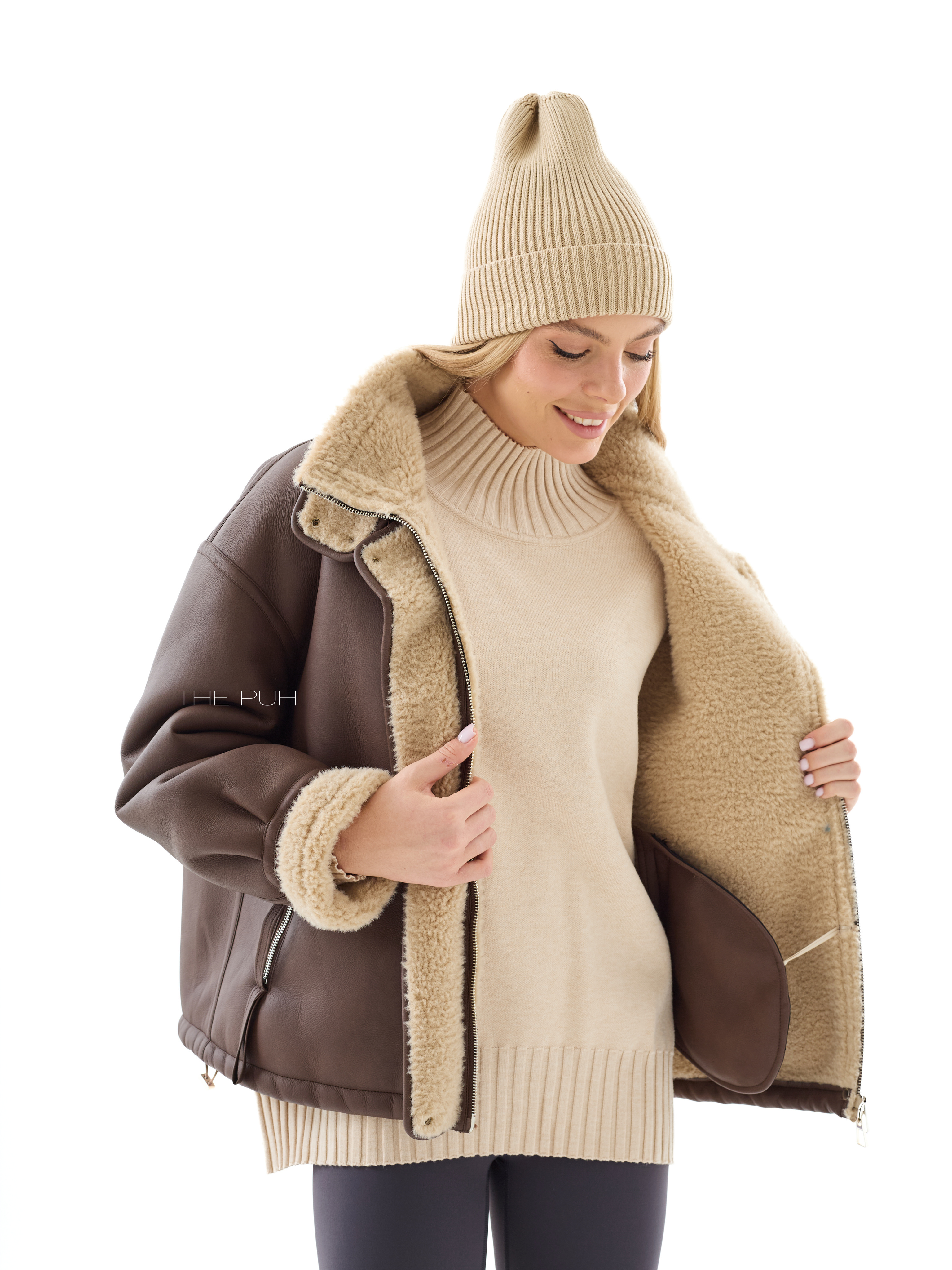 Коричневая дубленка выполнена из эко-меха контрастного бежевого цвета. Модель дополнена воротом-стойкой и кулиской с фиксаторами по низу, которые защитят от ветра и непогоды.