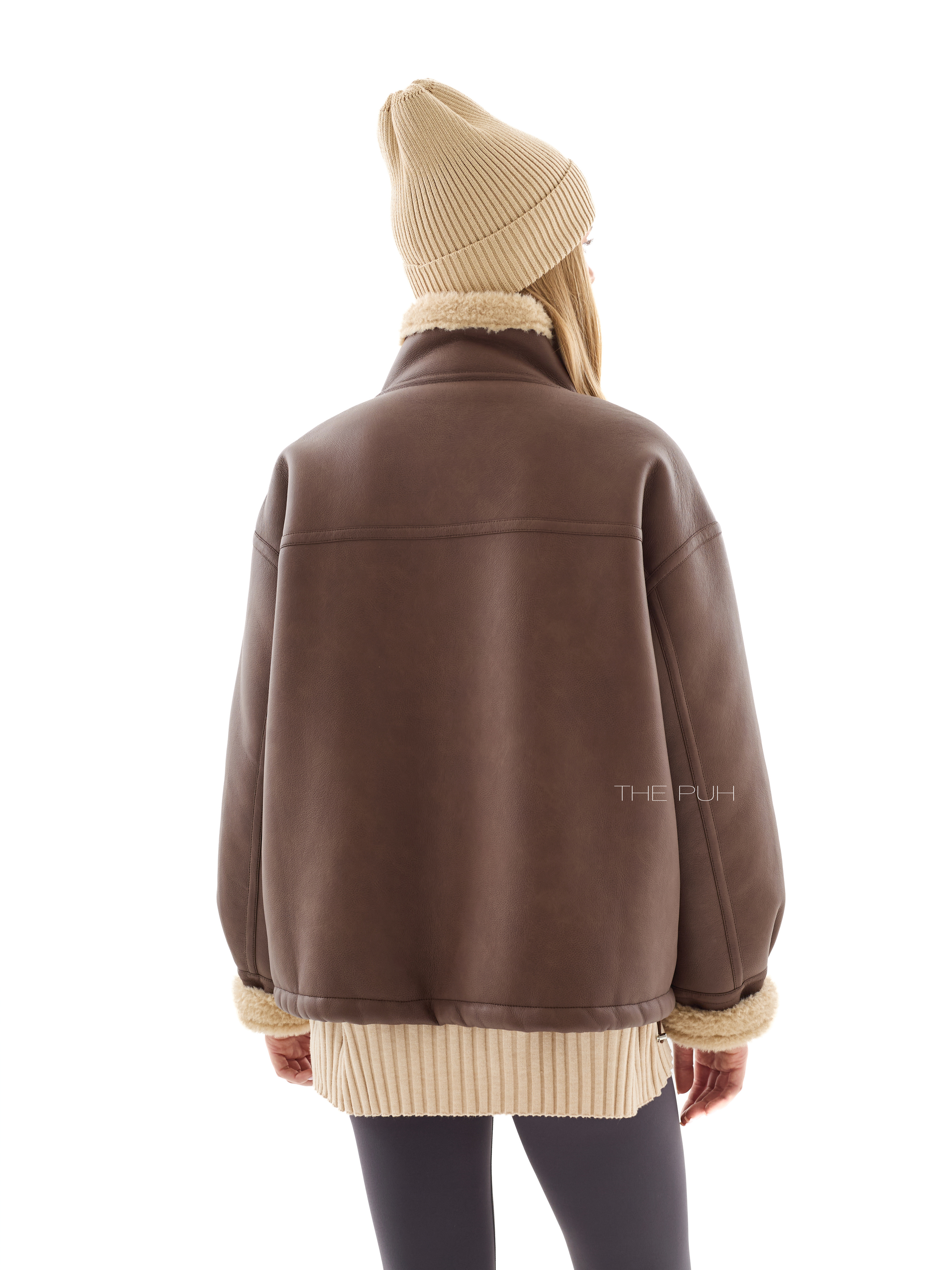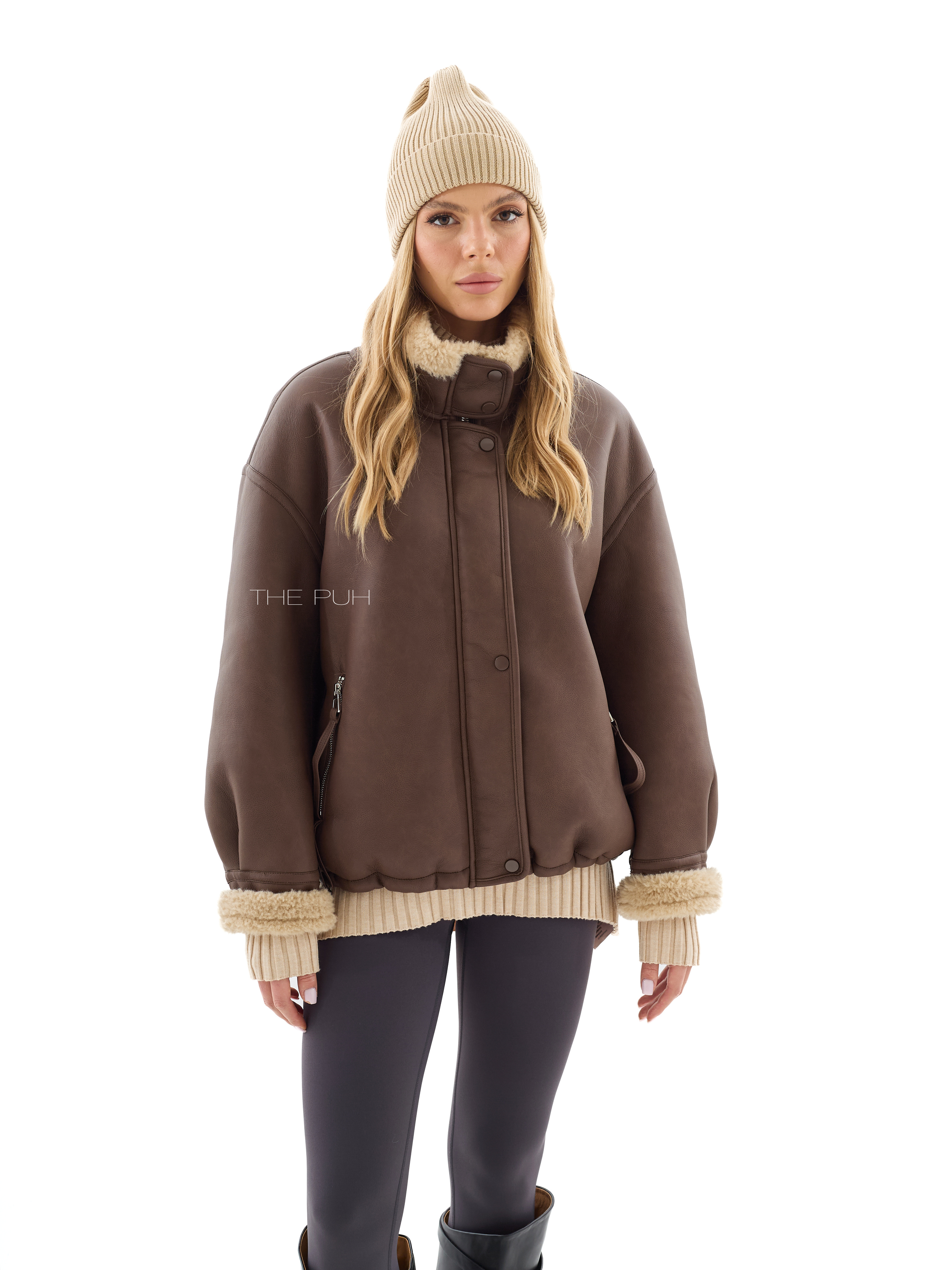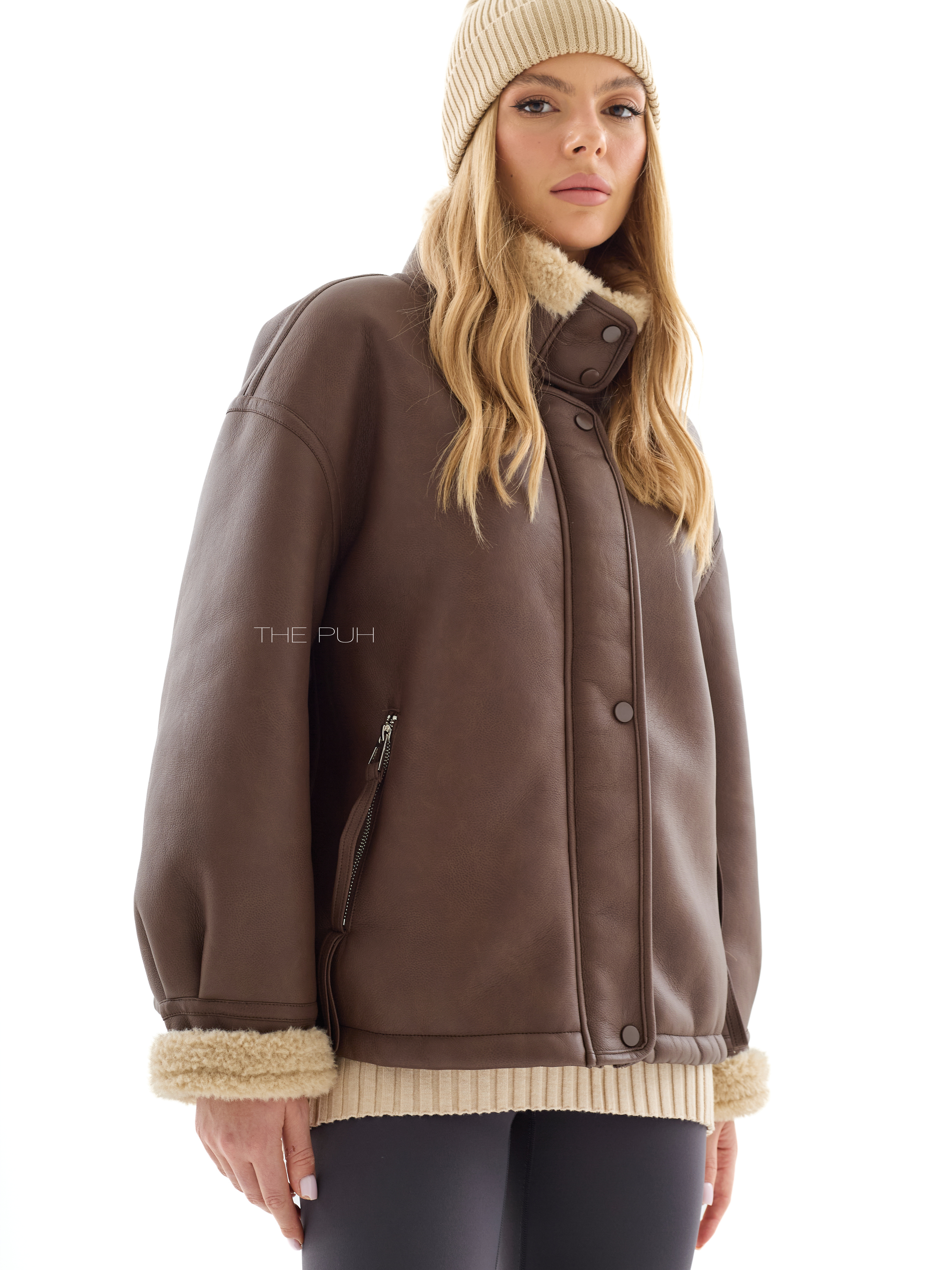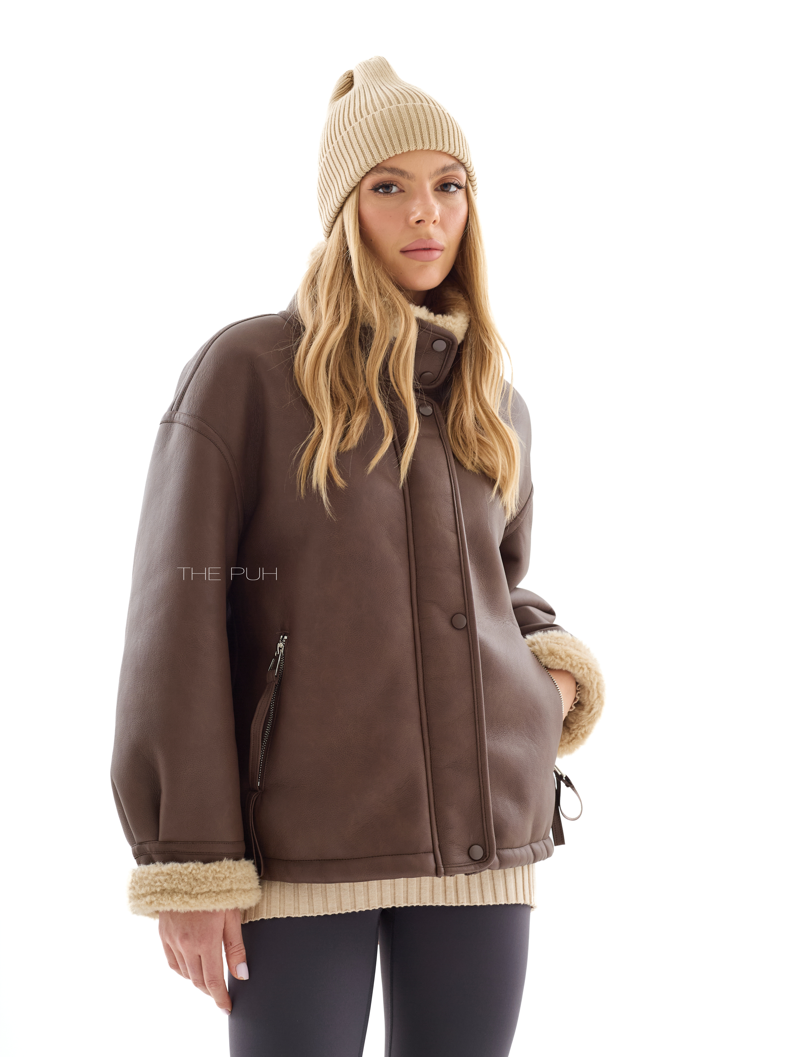 Коричневая дубленка выполнена из эко-меха контрастного бежевого цвета. Модель дополнена воротом-стойкой и кулиской с фиксаторами по низу, которые защитят от ветра и непогоды.