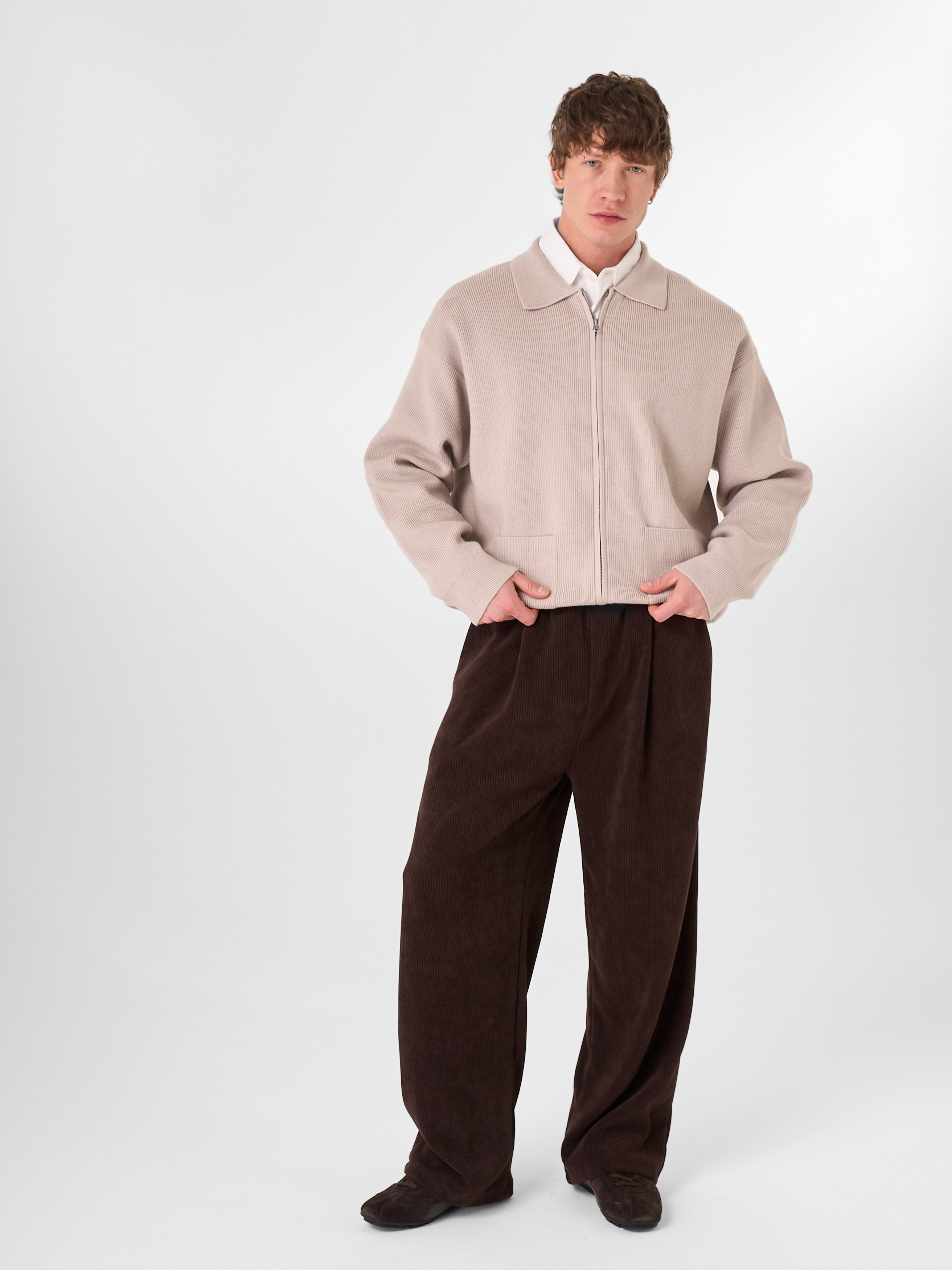 Бежевый джемпер на молнии в стиле смарт-кэжуал. Модель выполнена из смесовой пряжи и дополнена отложным воротником и двумя карманами спереди.