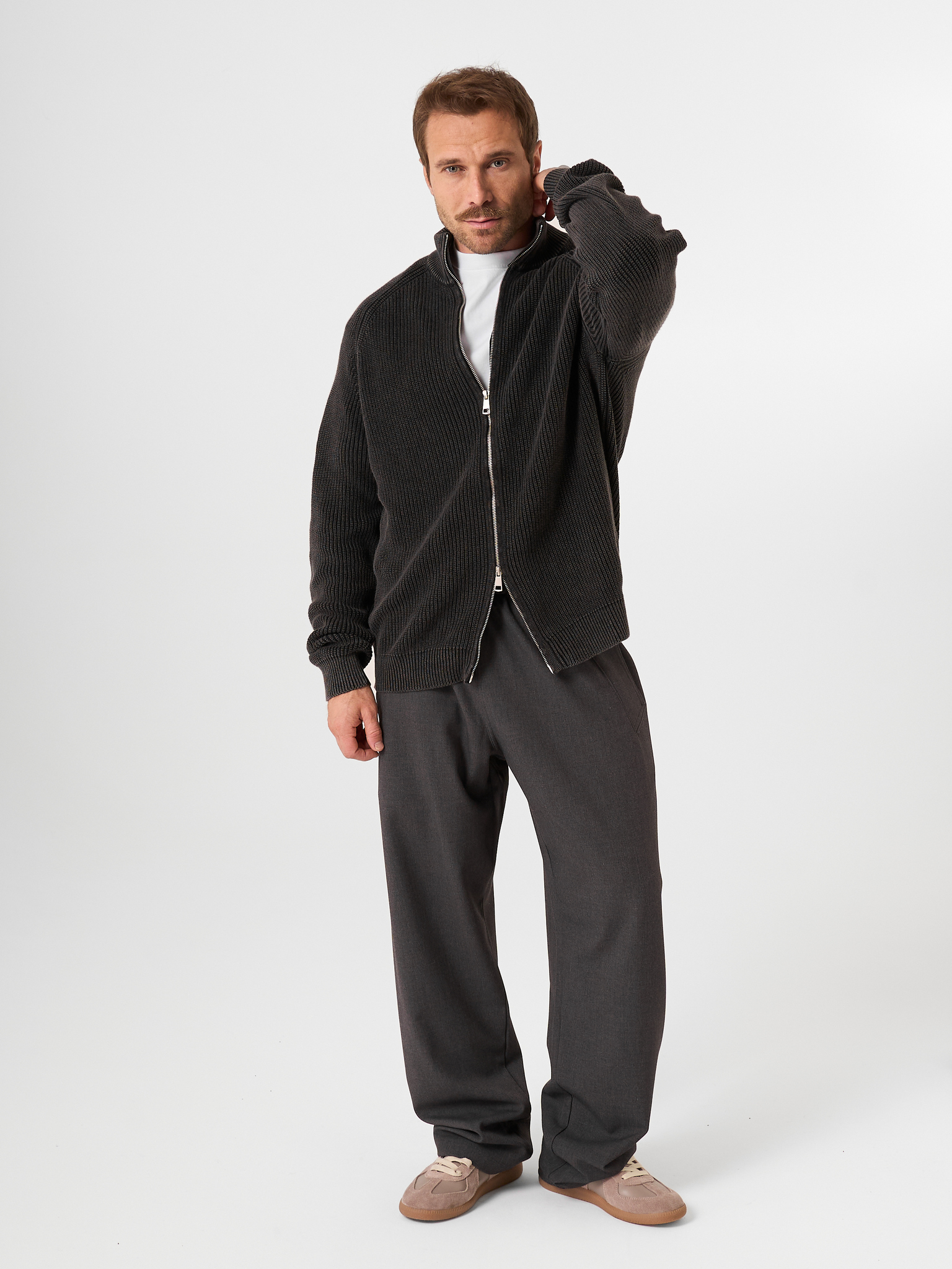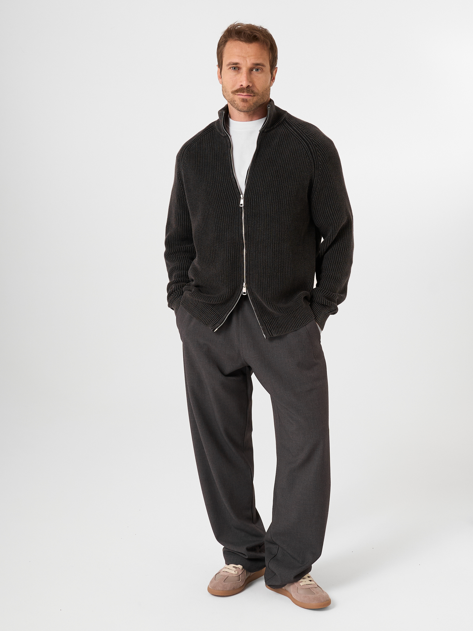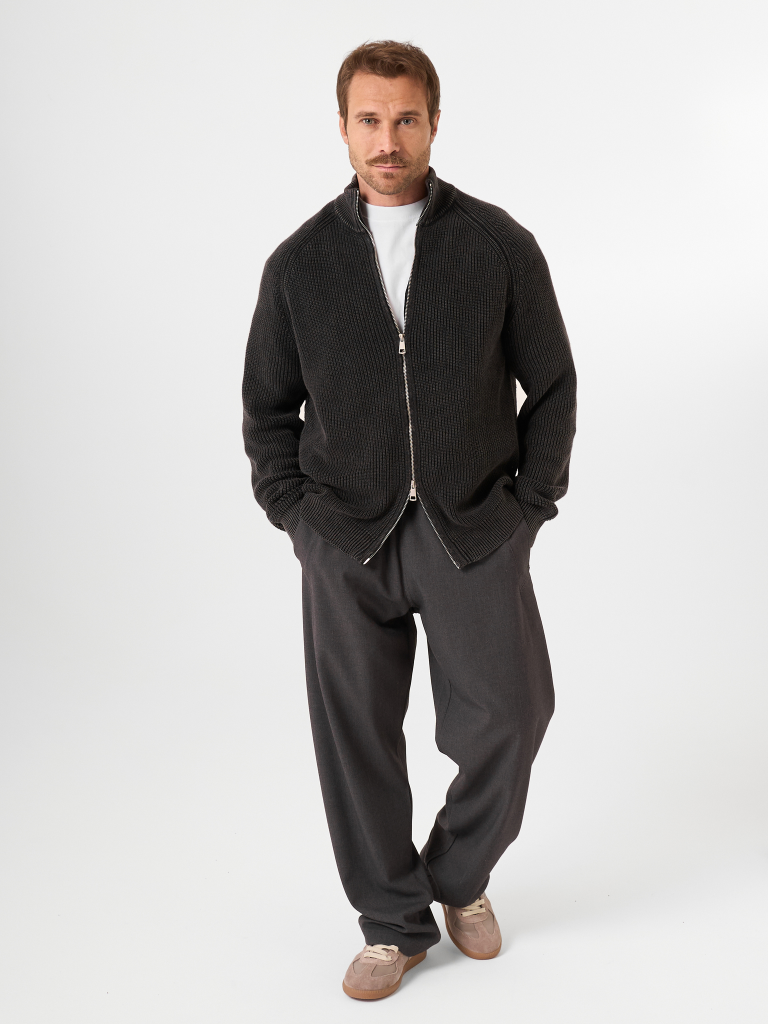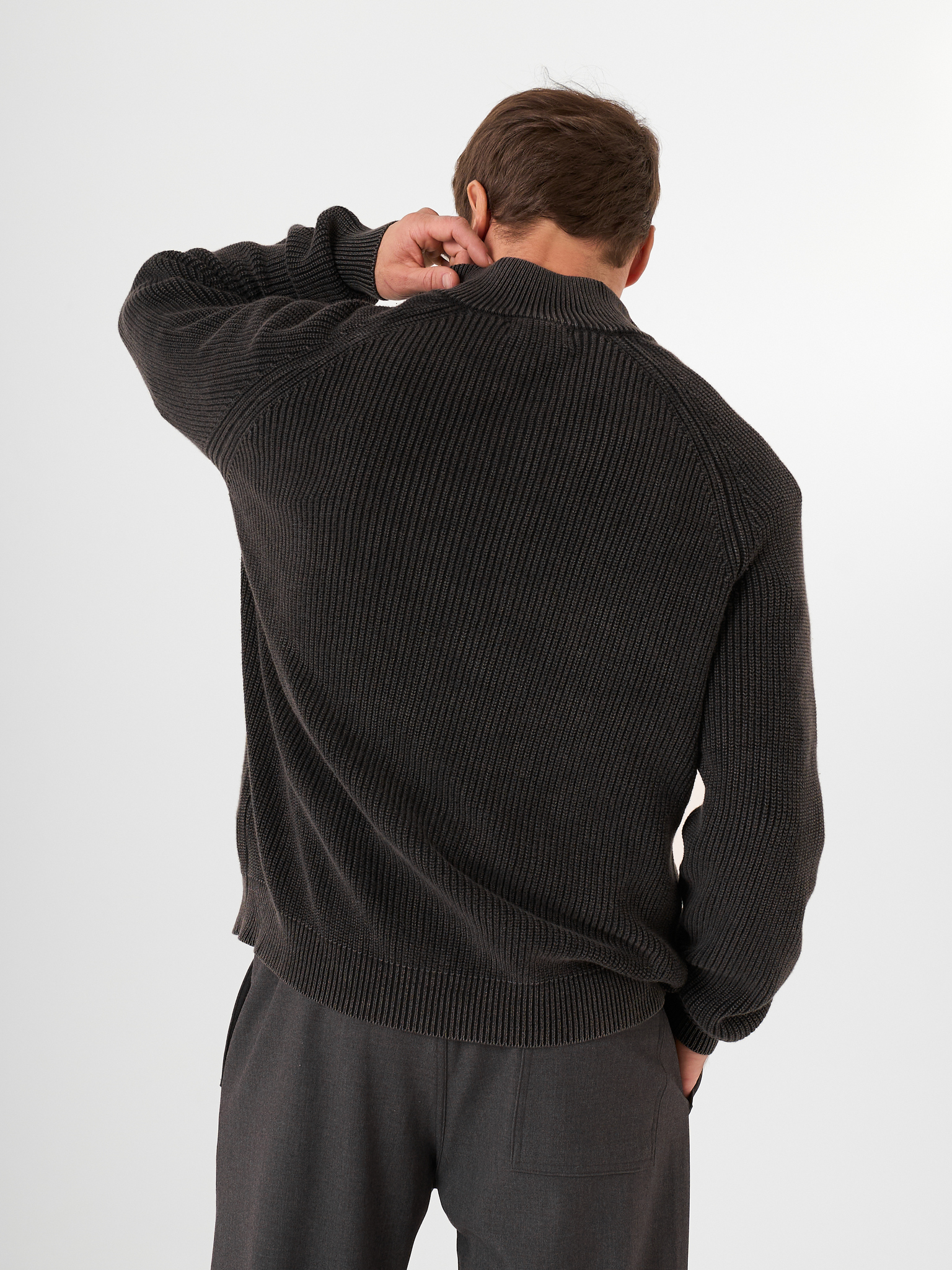Темно-серый хлопковый джемпер в рубчик на молнии выполнен из тяжелой пряжи с гранжевым эффектом варки. Универсальная модель будет неприхотлива в стайлинге и отлично подойдет как под галстук с рубашкой, так и под спортивные брюки.
