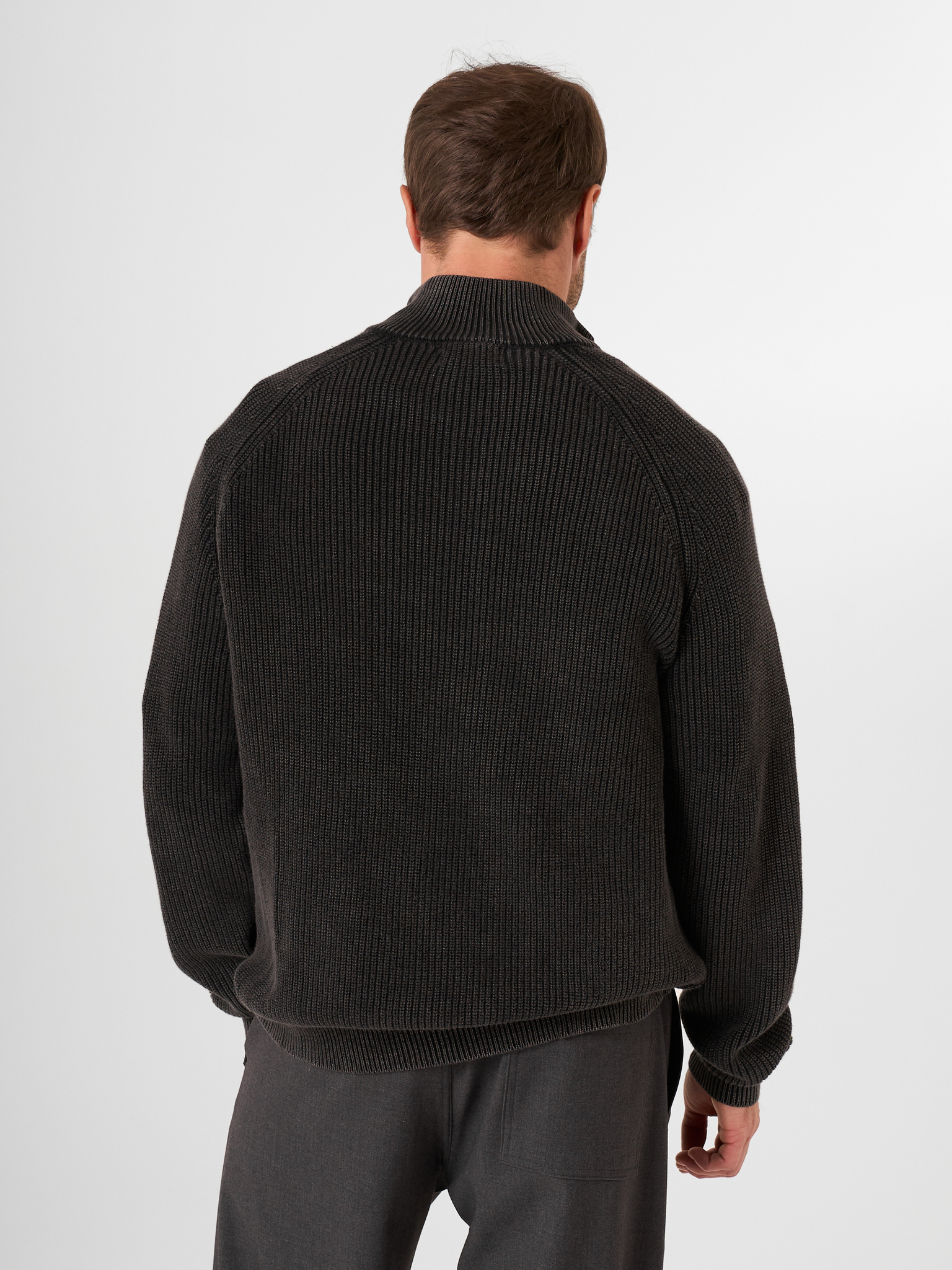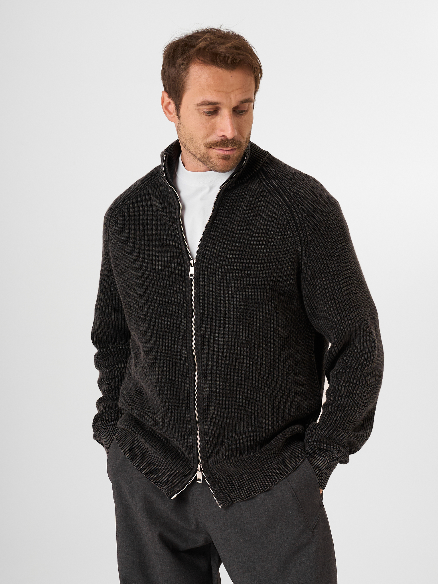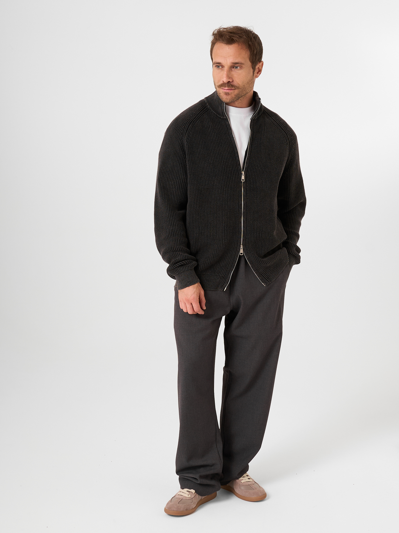Темно-серый хлопковый джемпер в рубчик на молнии выполнен из тяжелой пряжи с гранжевым эффектом варки. Универсальная модель будет неприхотлива в стайлинге и отлично подойдет как под галстук с рубашкой, так и под спортивные брюки.