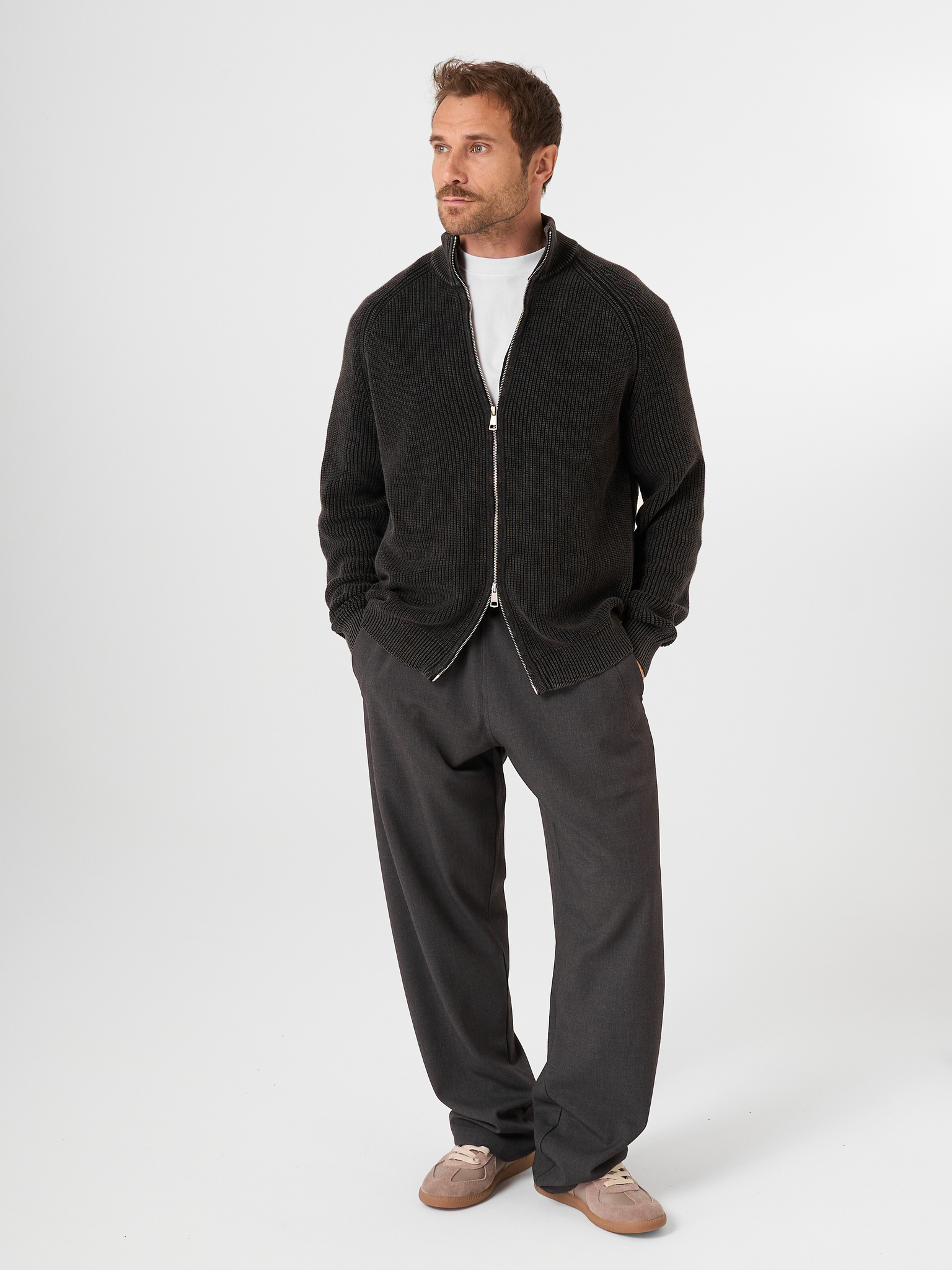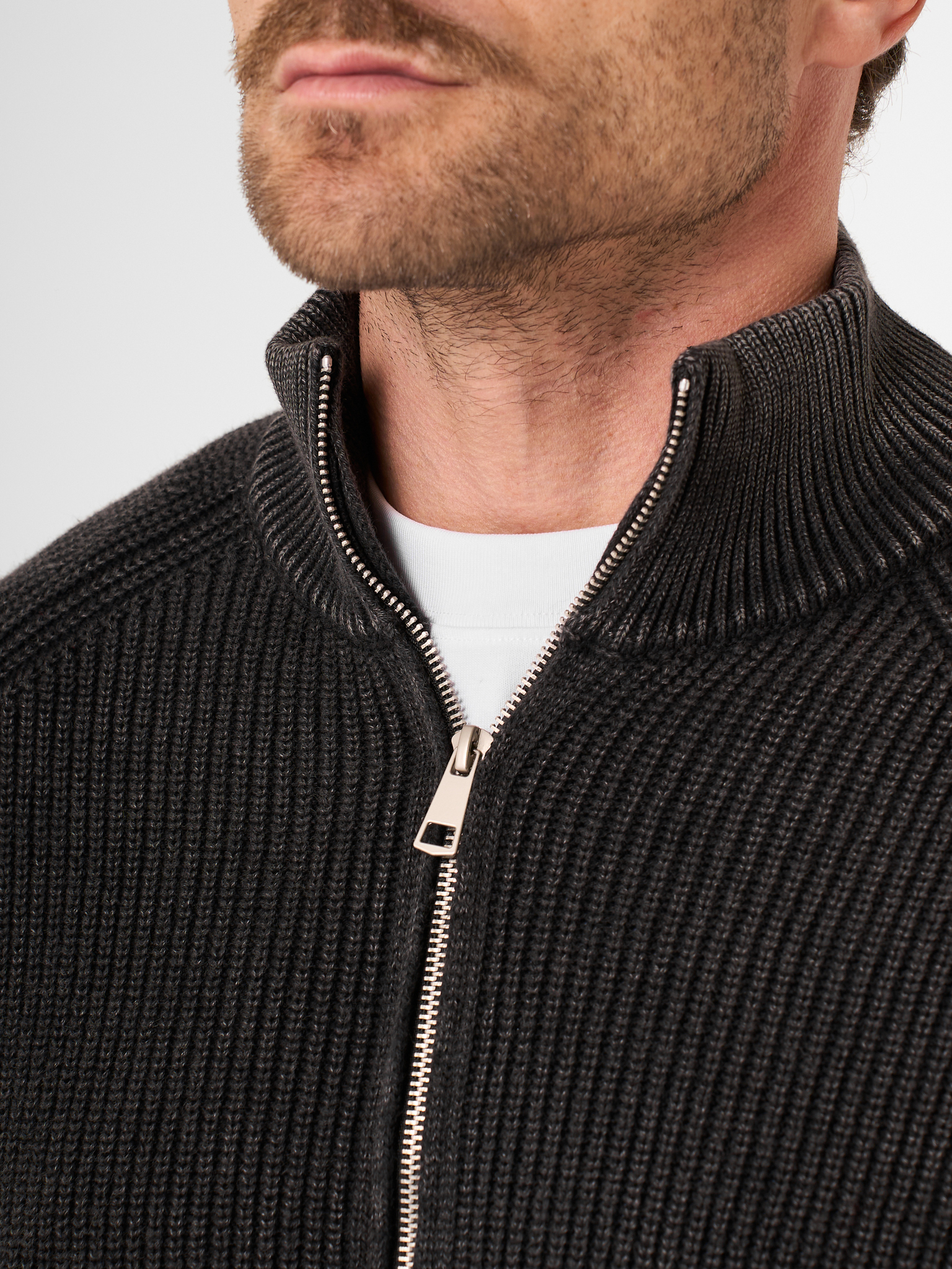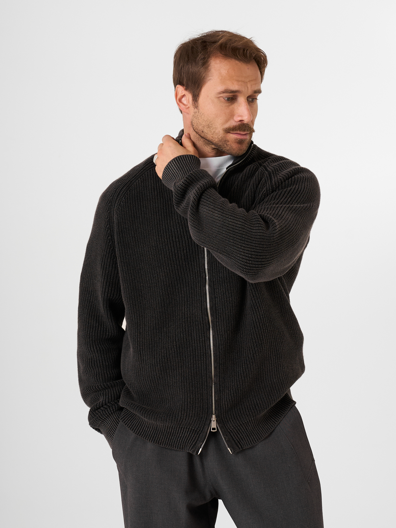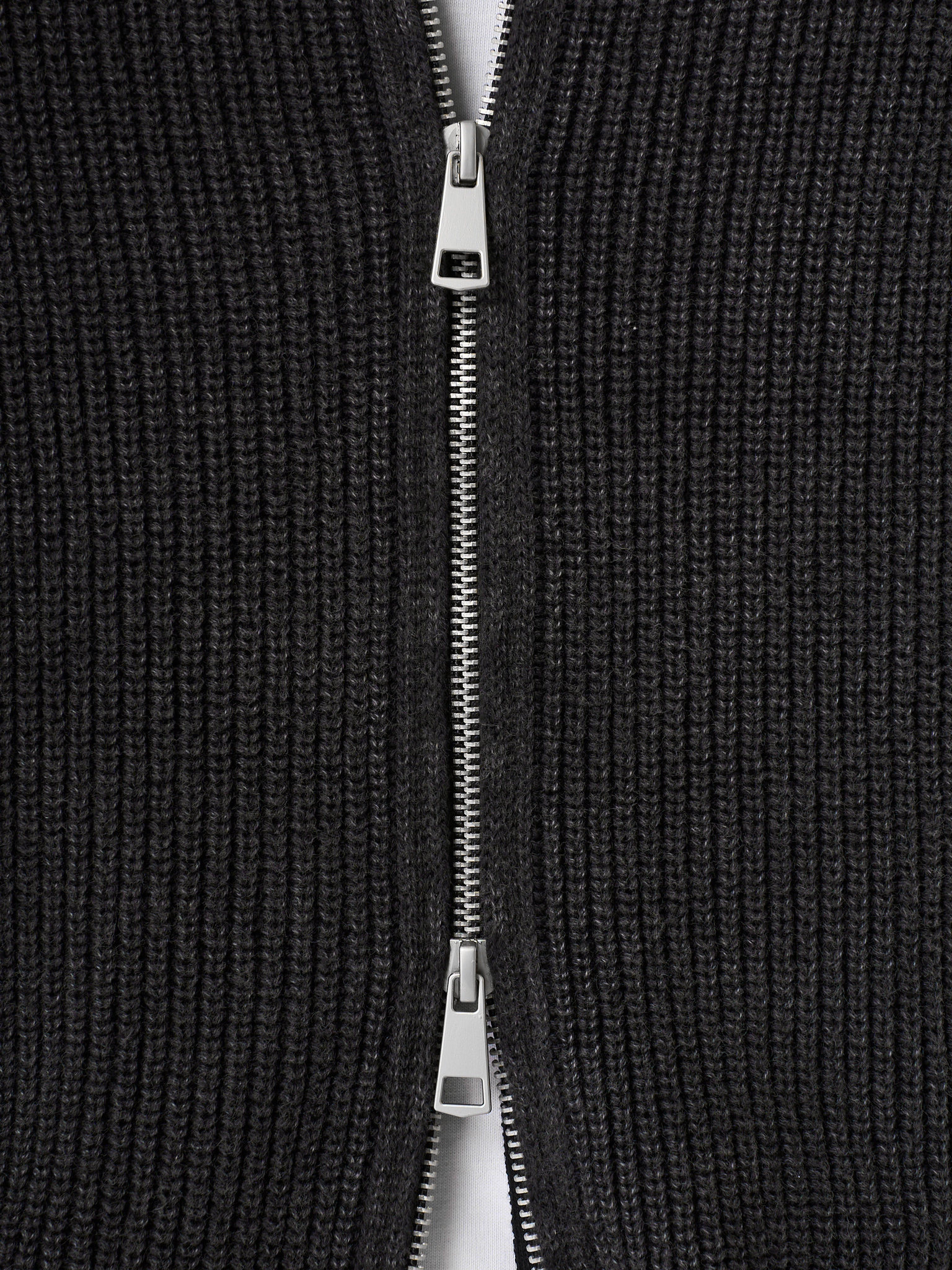 Темно-серый хлопковый джемпер в рубчик на молнии выполнен из тяжелой пряжи с гранжевым эффектом варки. Универсальная модель будет неприхотлива в стайлинге и отлично подойдет как под галстук с рубашкой, так и под спортивные брюки.