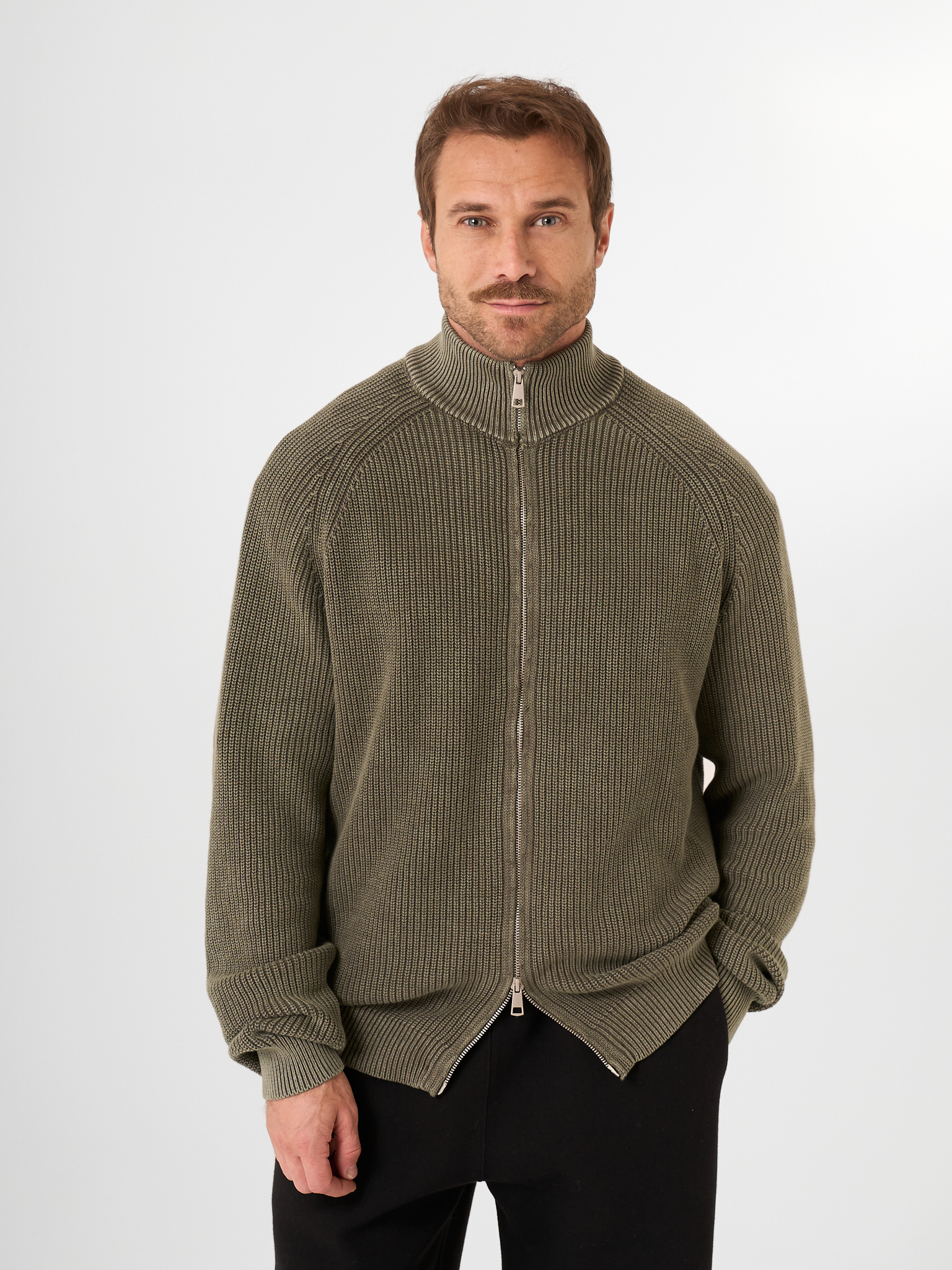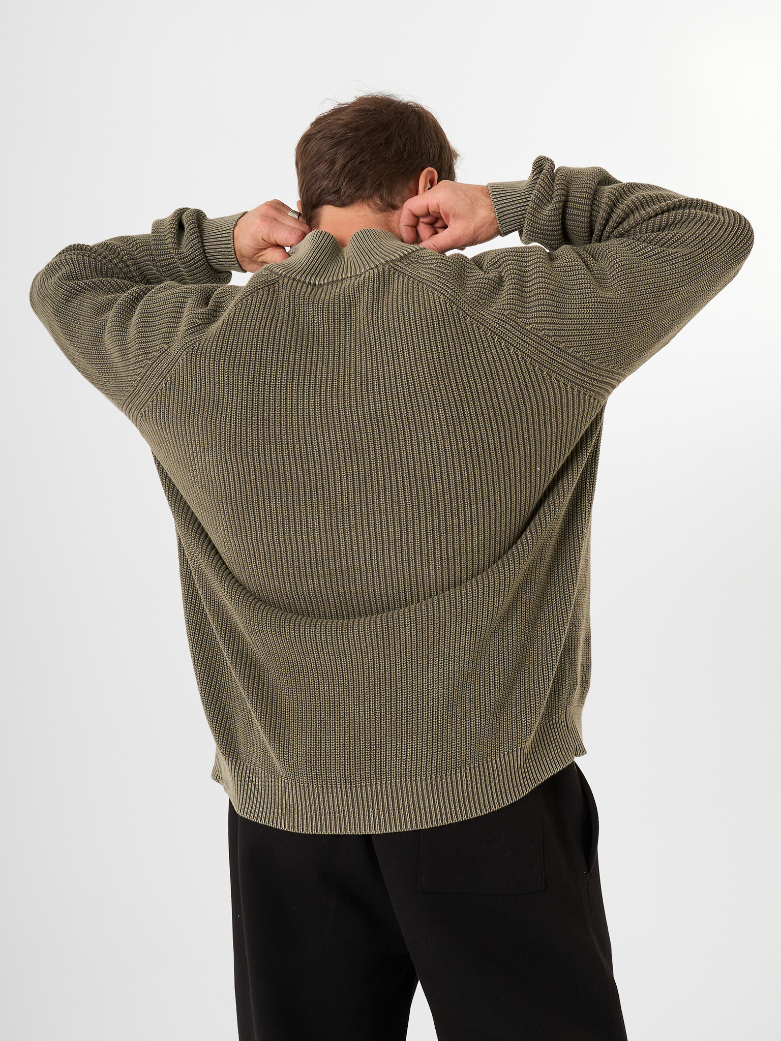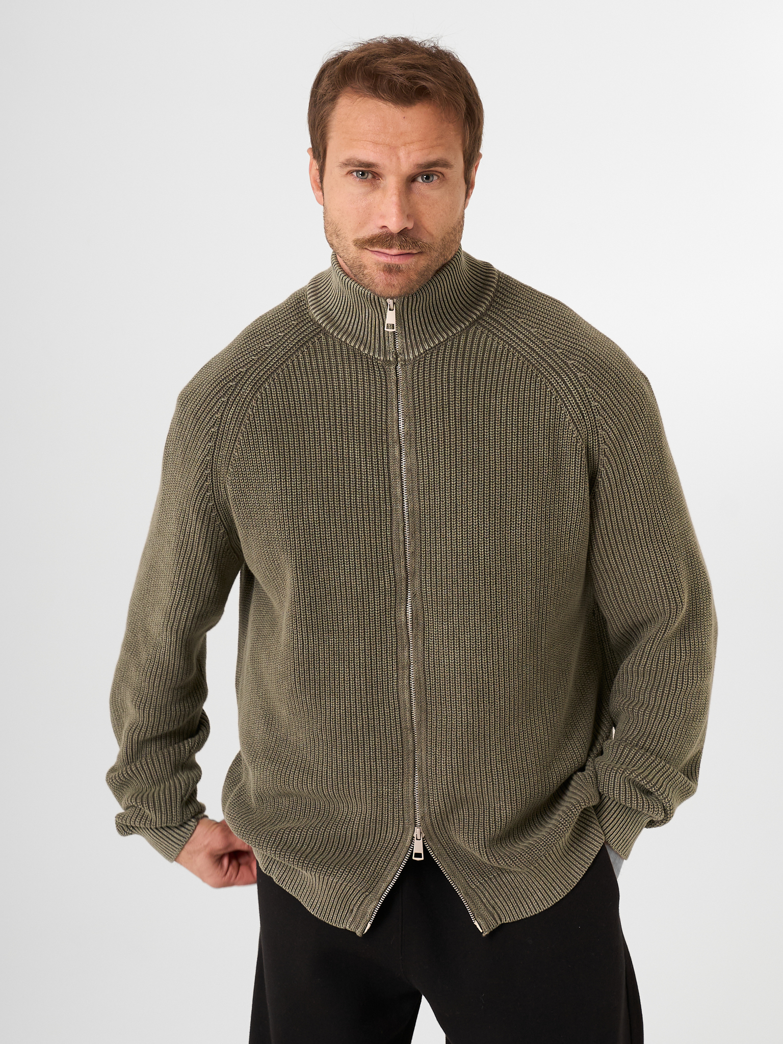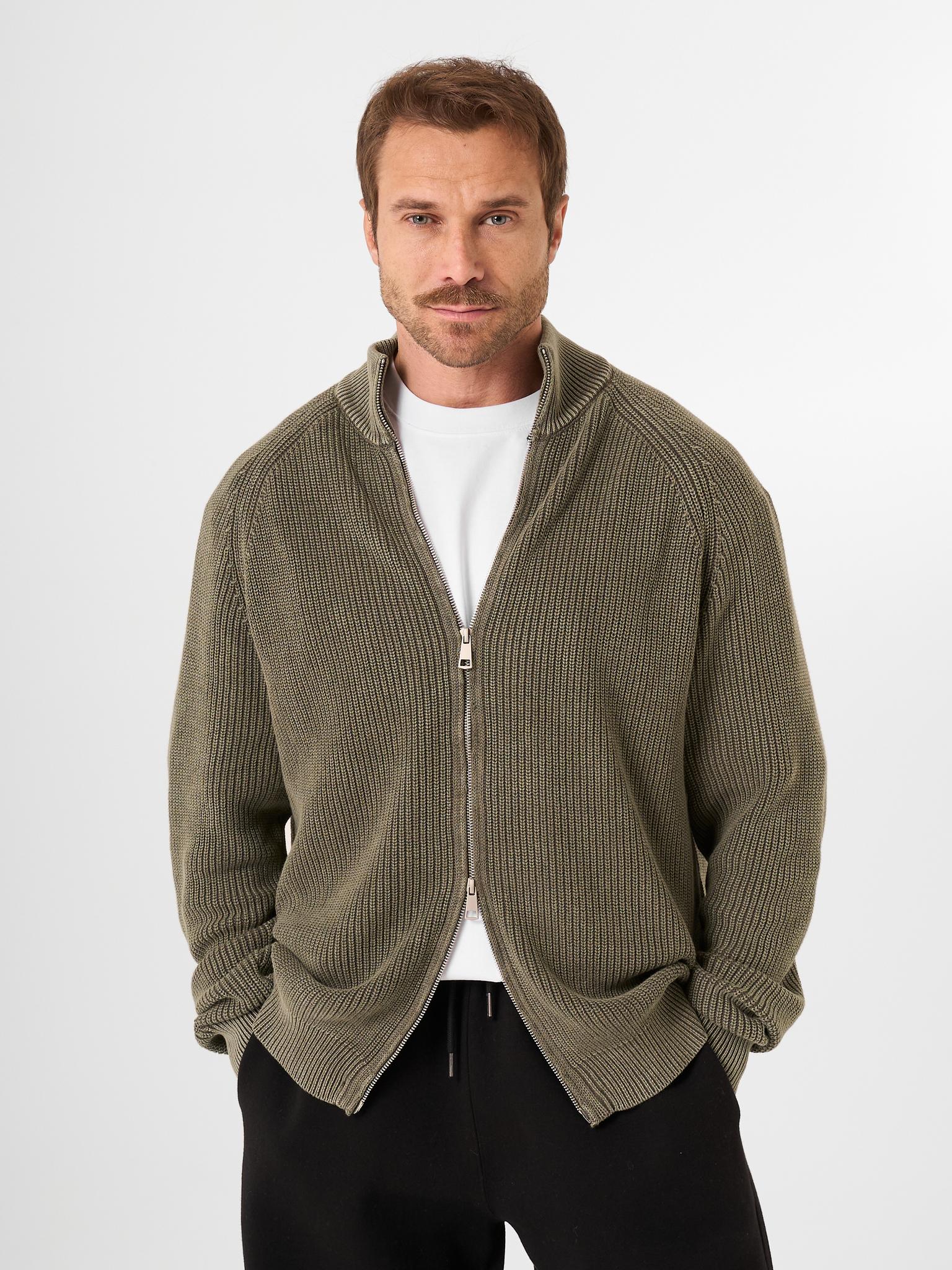 Хлопковый джемпер цвета хаки в рубчик на молнии выполнен из тяжелой пряжи с гранжевым эффектом варки. Универсальная модель будет неприхотлива в стайлинге и отлично подойдет как под галстук с рубашкой, так и под спортивные брюки.