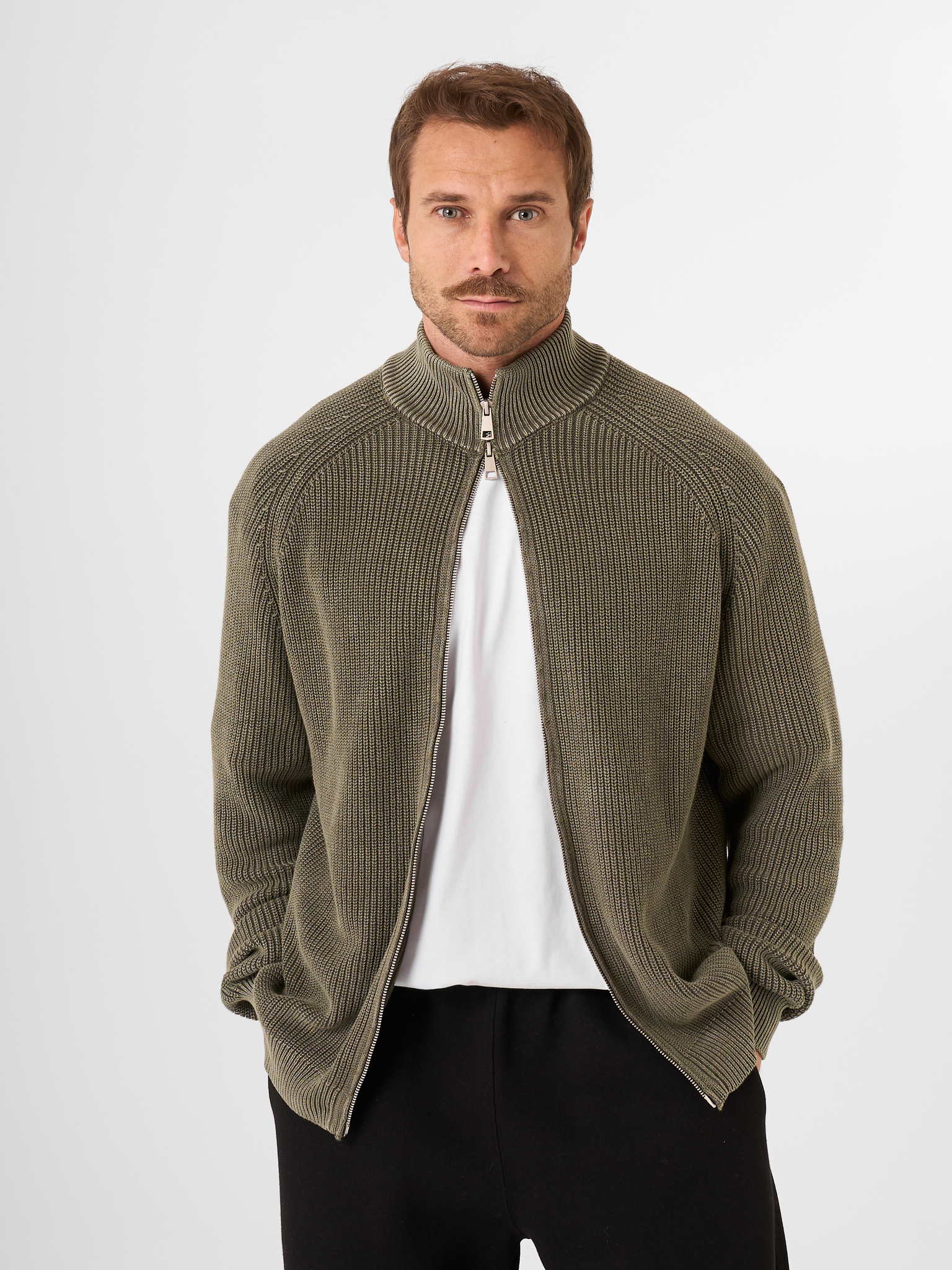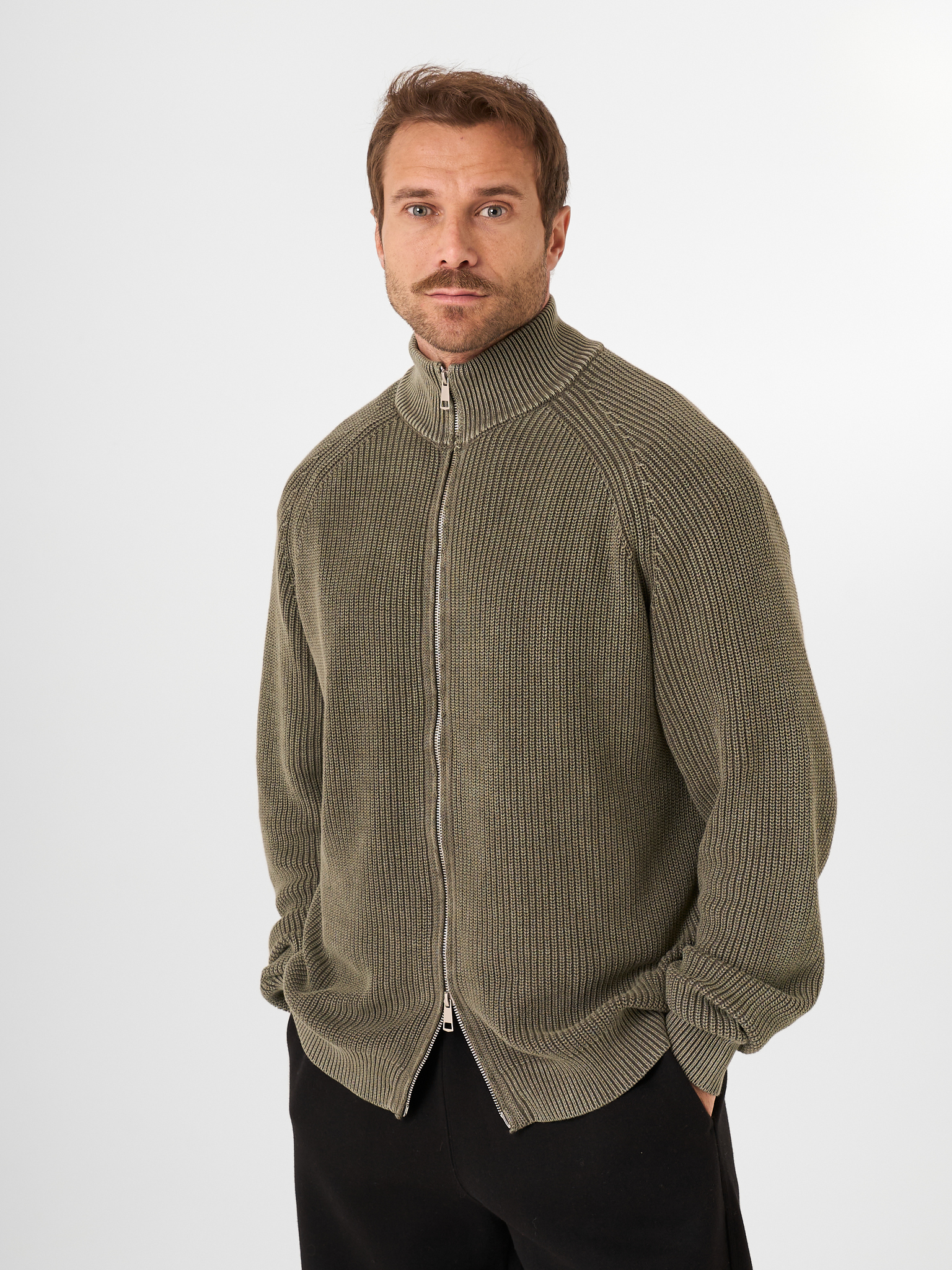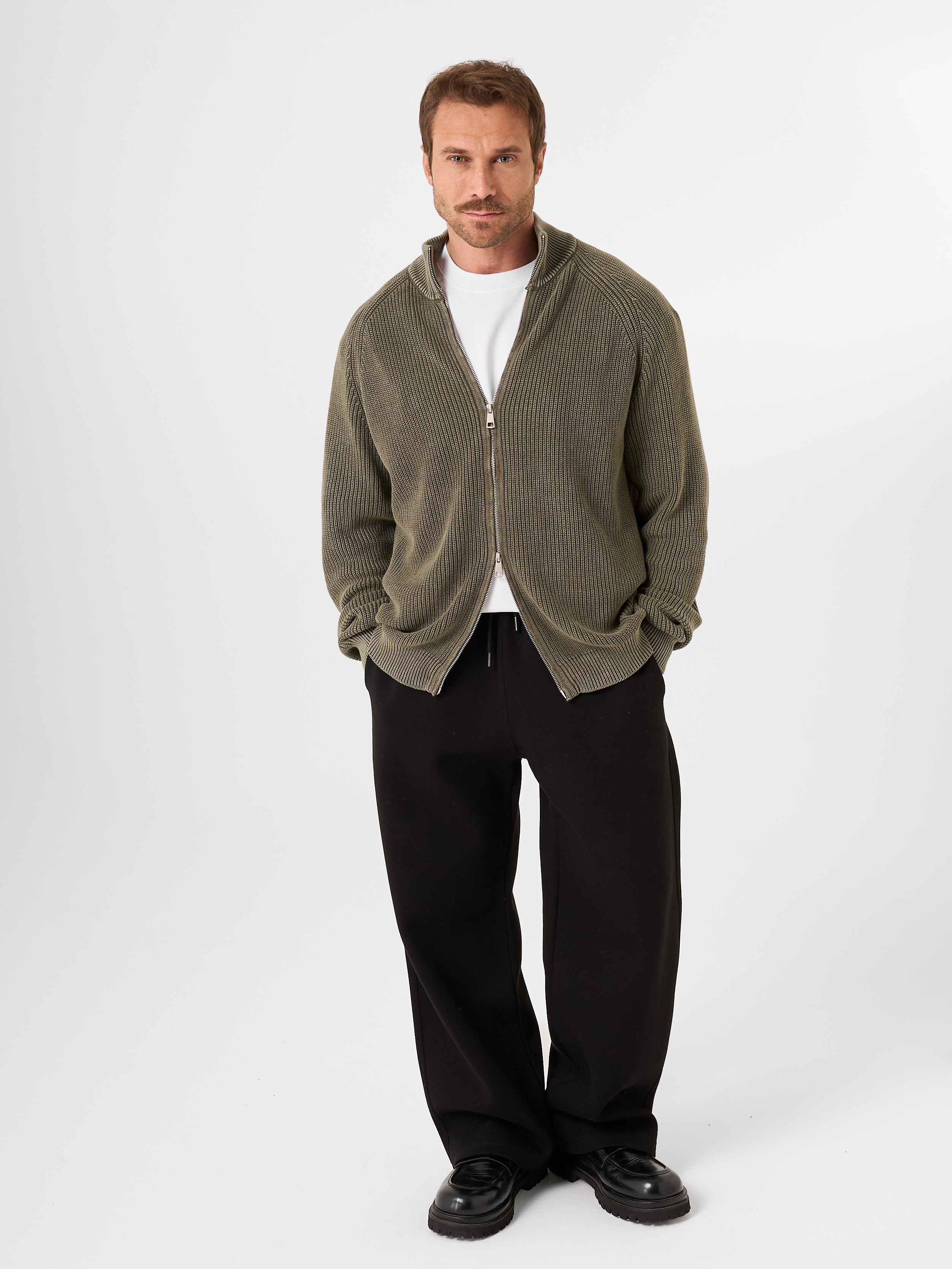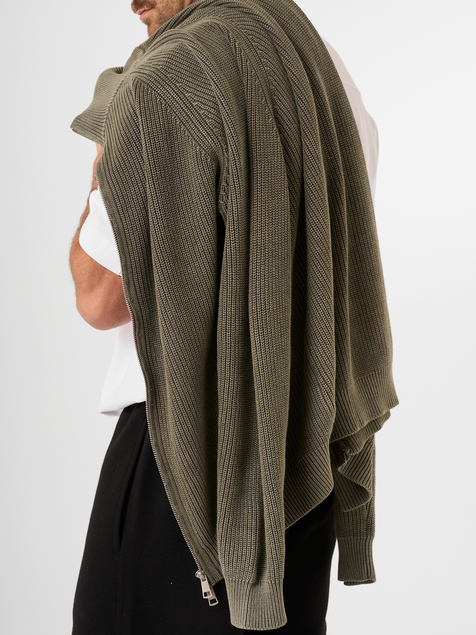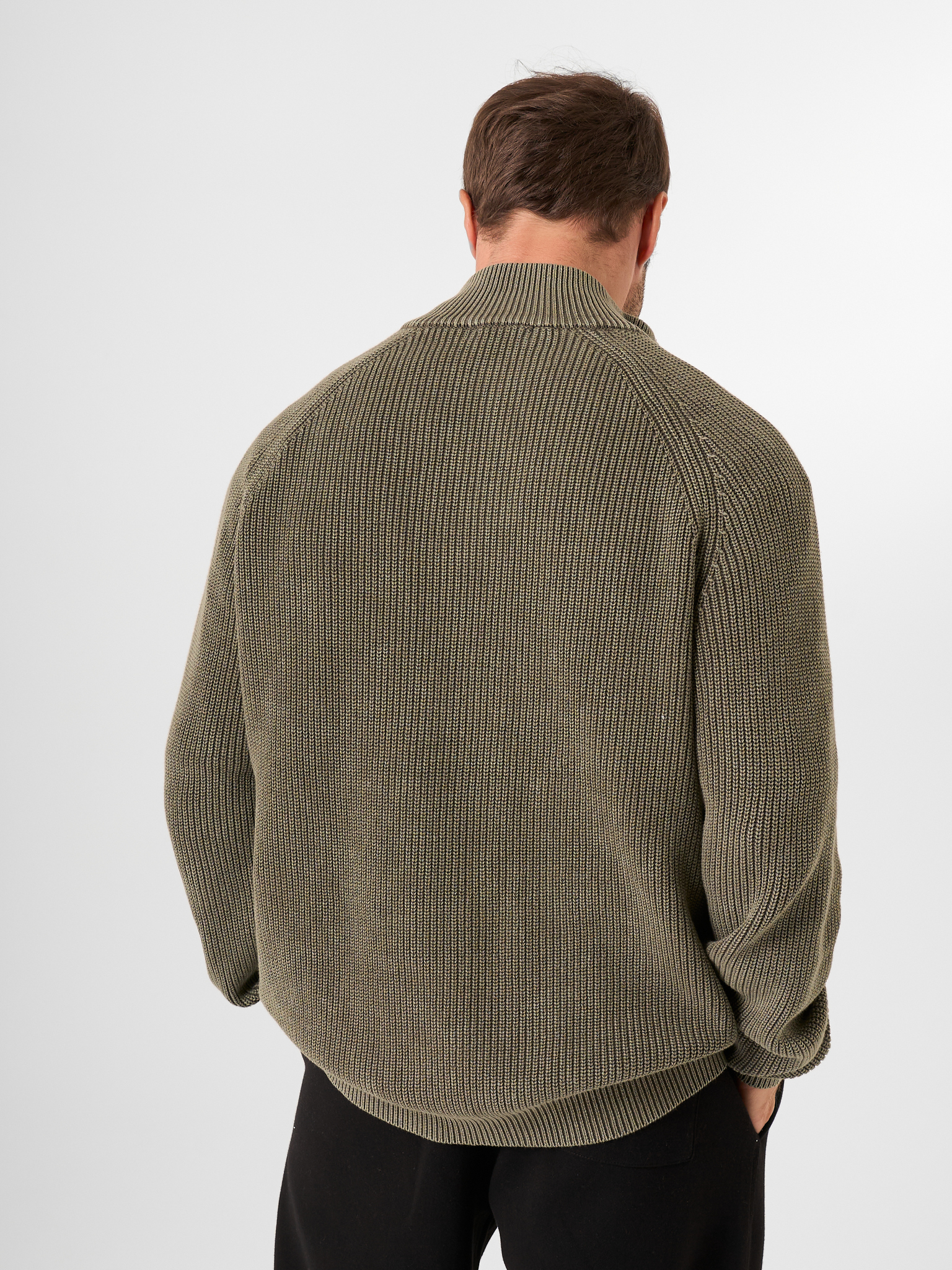 Хлопковый джемпер цвета хаки в рубчик на молнии выполнен из тяжелой пряжи с гранжевым эффектом варки. Универсальная модель будет неприхотлива в стайлинге и отлично подойдет как под галстук с рубашкой, так и под спортивные брюки.