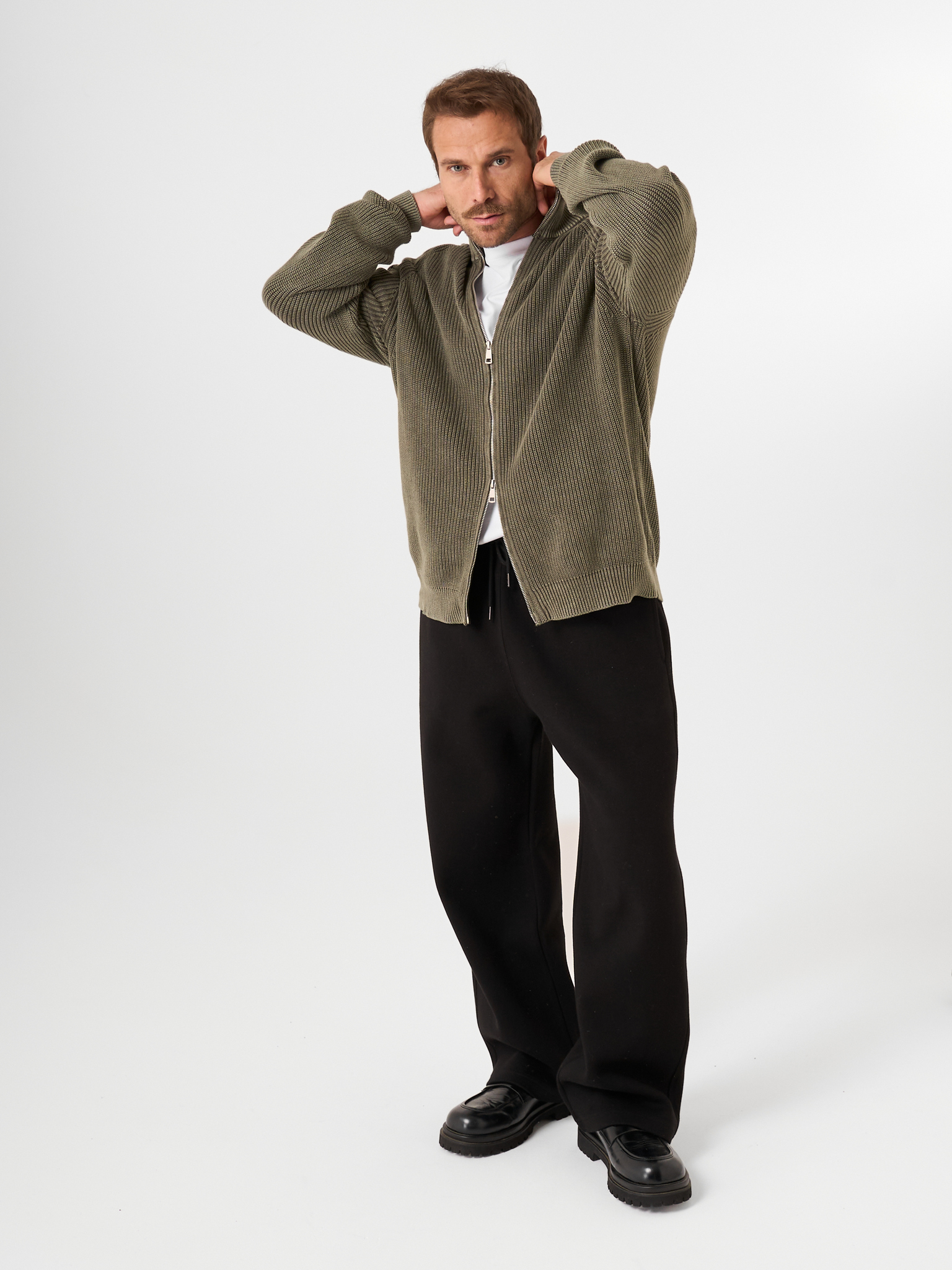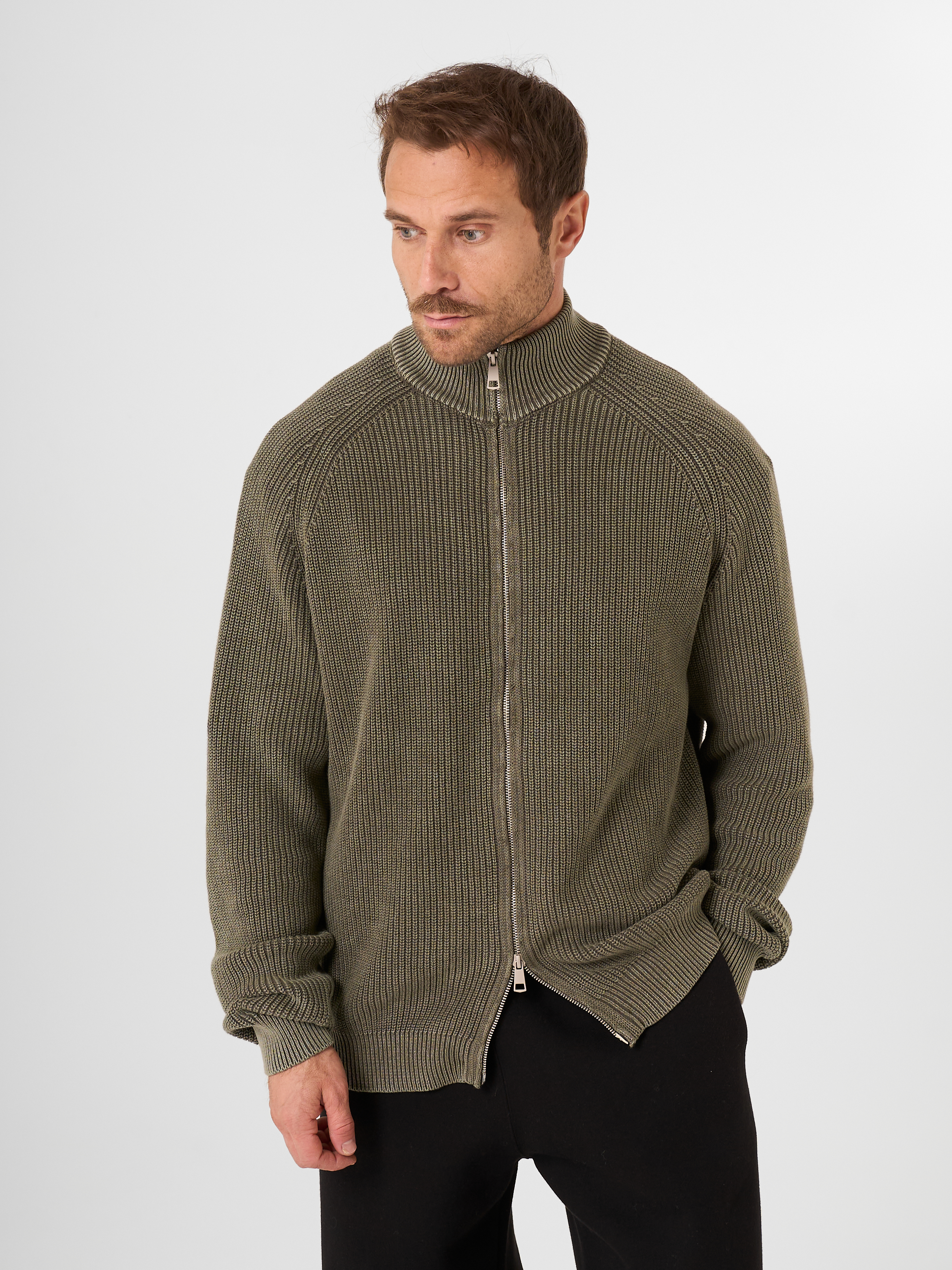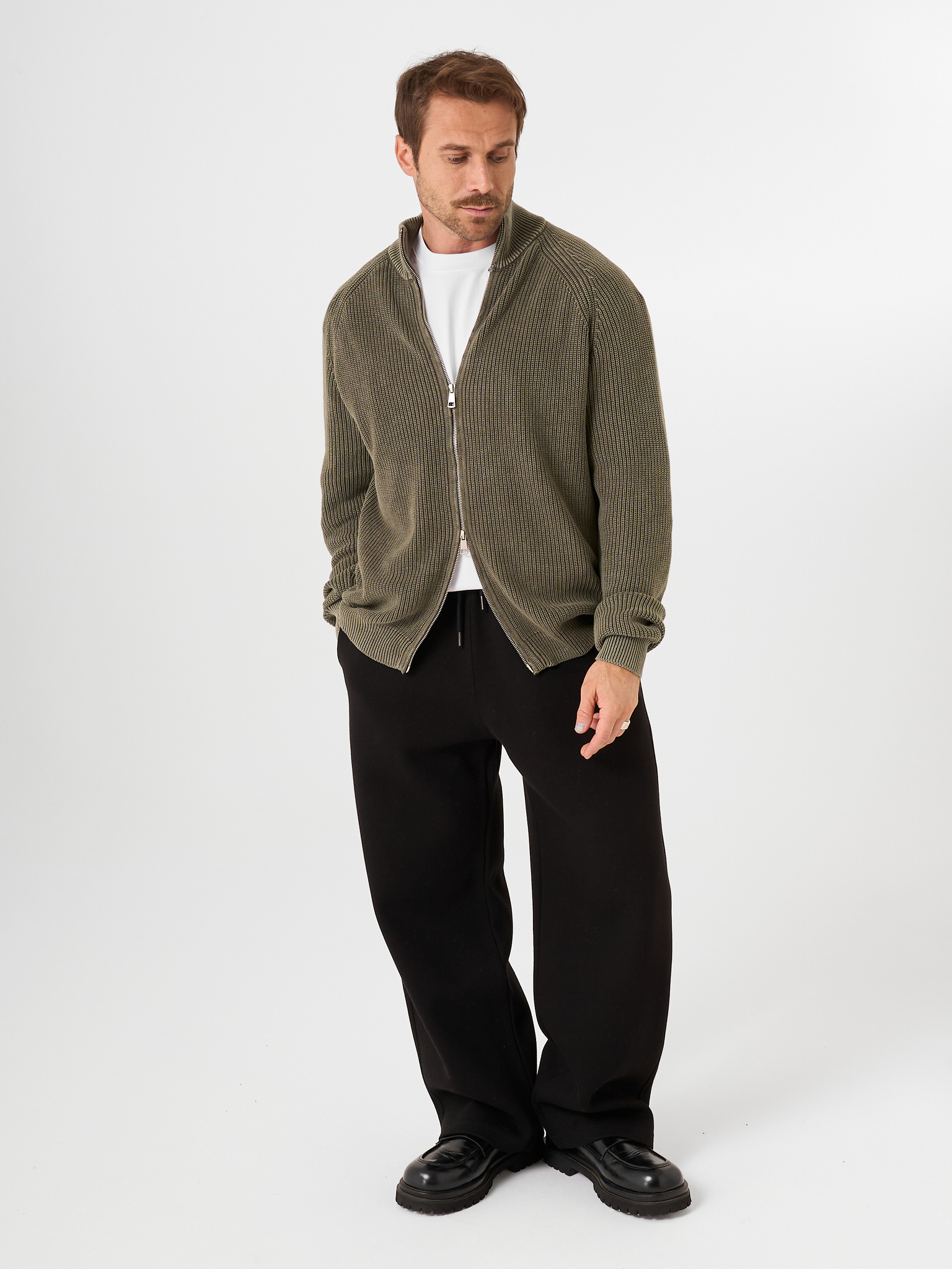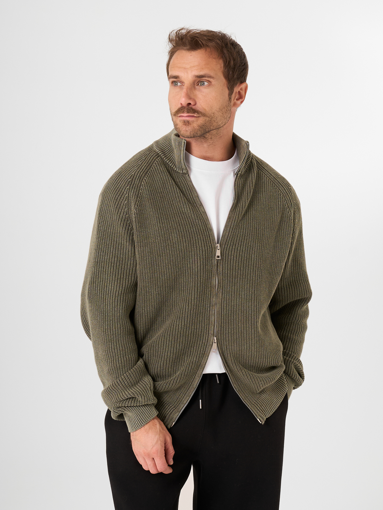 Хлопковый джемпер цвета хаки в рубчик на молнии выполнен из тяжелой пряжи с гранжевым эффектом варки. Универсальная модель будет неприхотлива в стайлинге и отлично подойдет как под галстук с рубашкой, так и под спортивные брюки.
