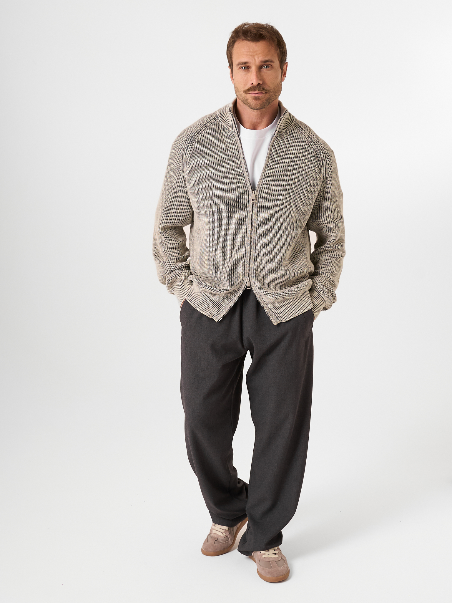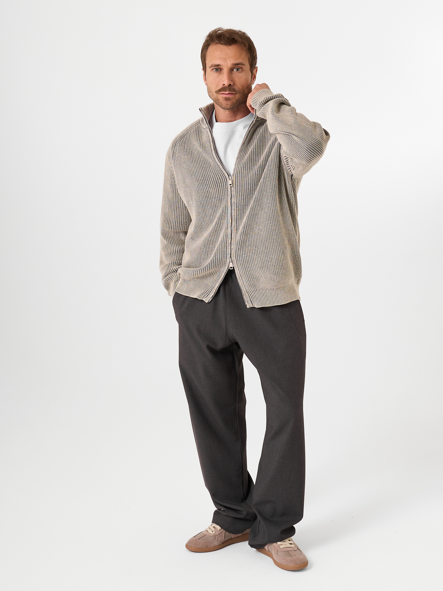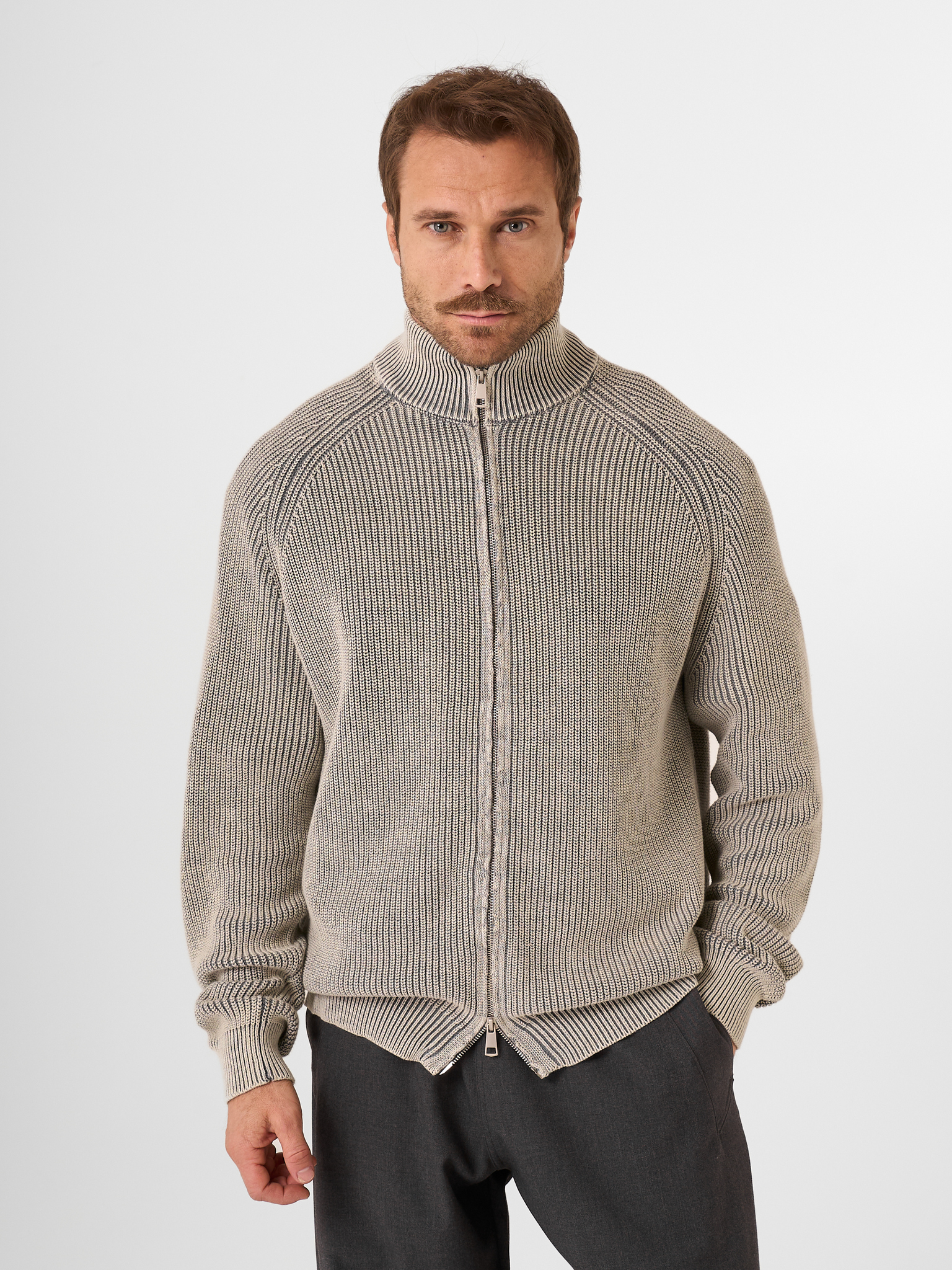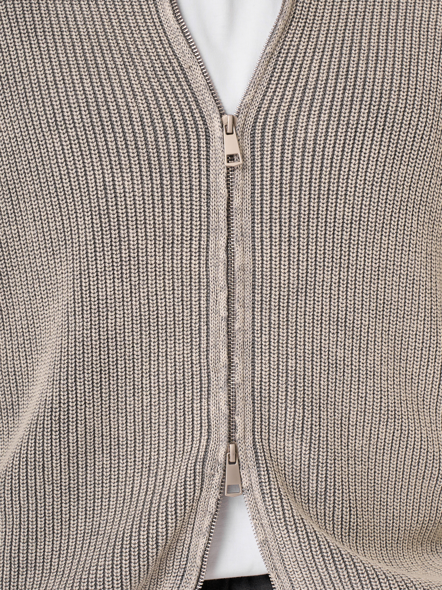 Серо-бежевый хлопковый джемпер в рубчик на молнии выполнен из тяжелой пряжи с гранжевым эффектом варки. Универсальная модель будет неприхотлива в стайлинге и отлично подойдет как под галстук с рубашкой, так и под спортивные брюки.