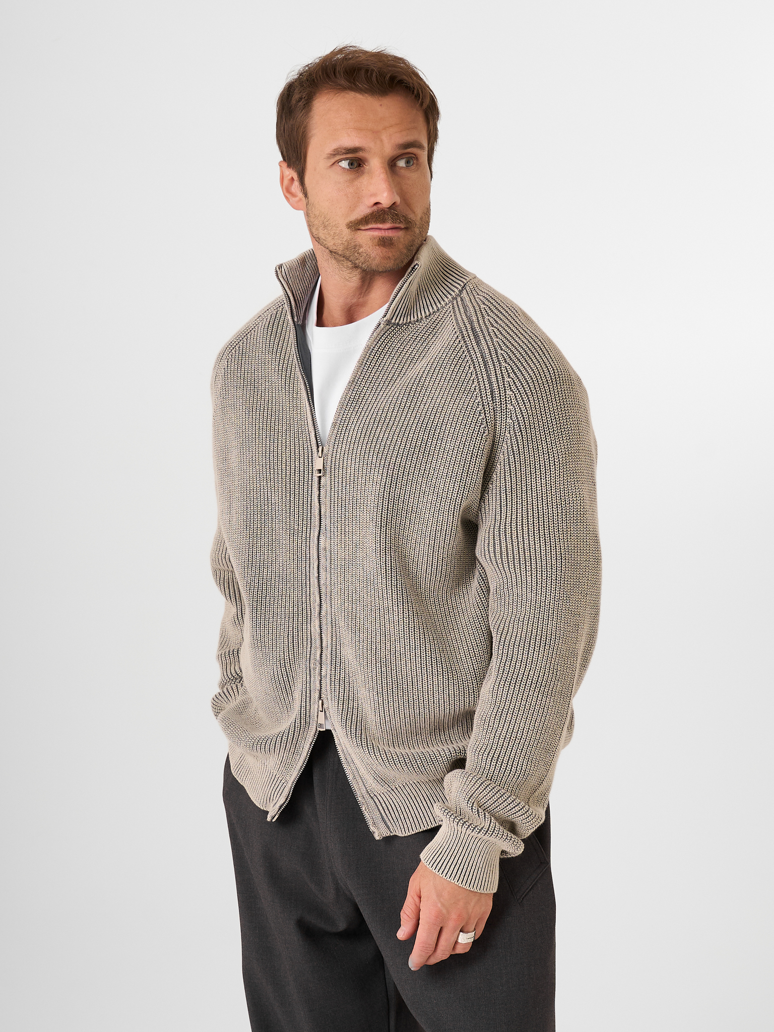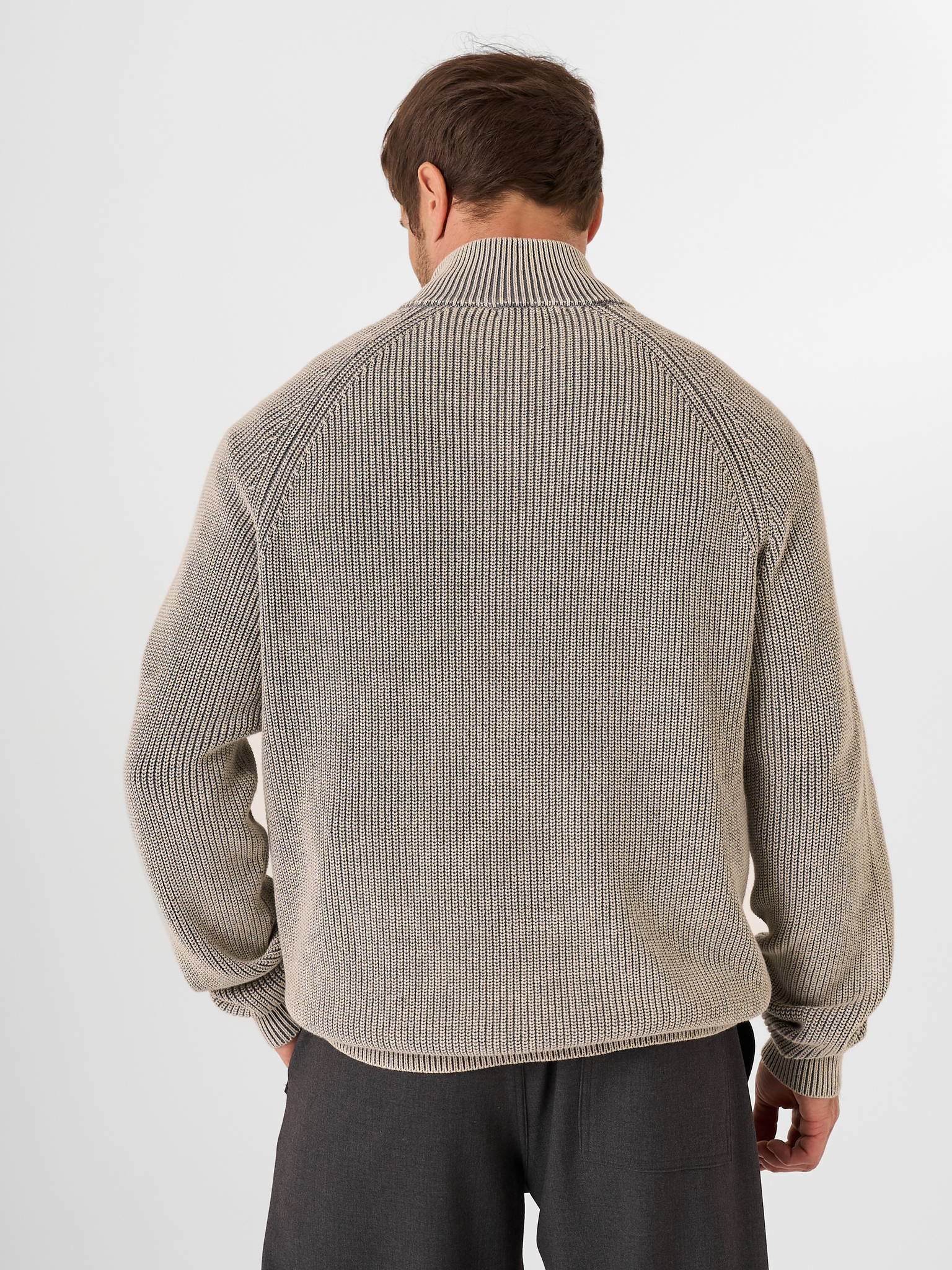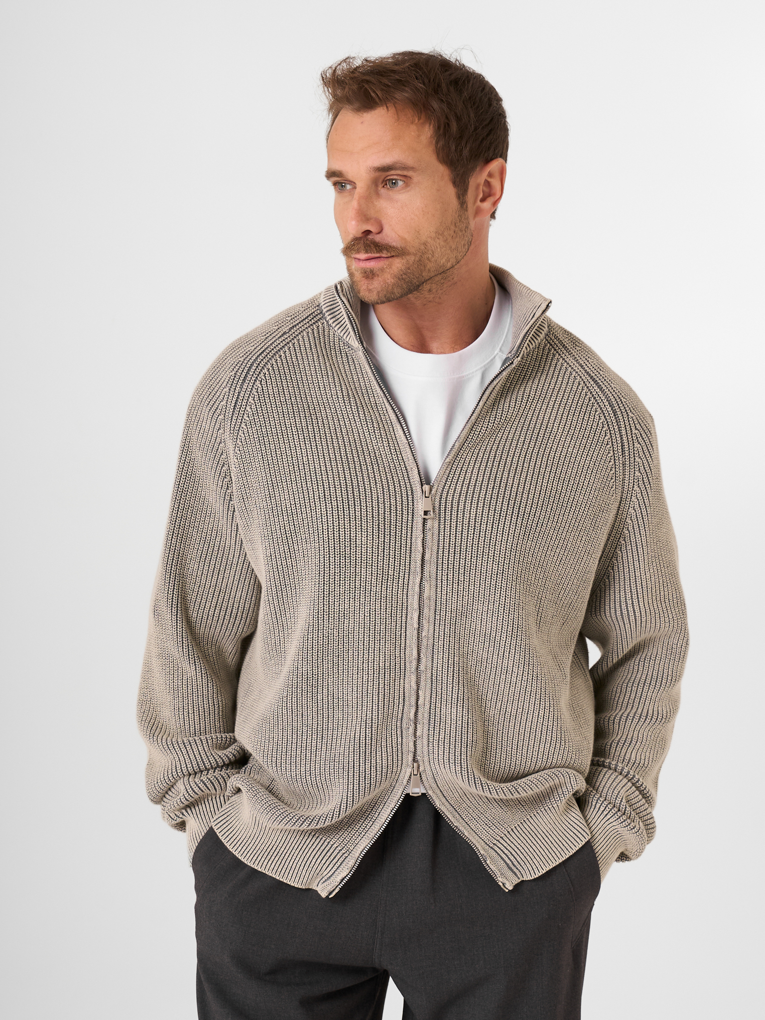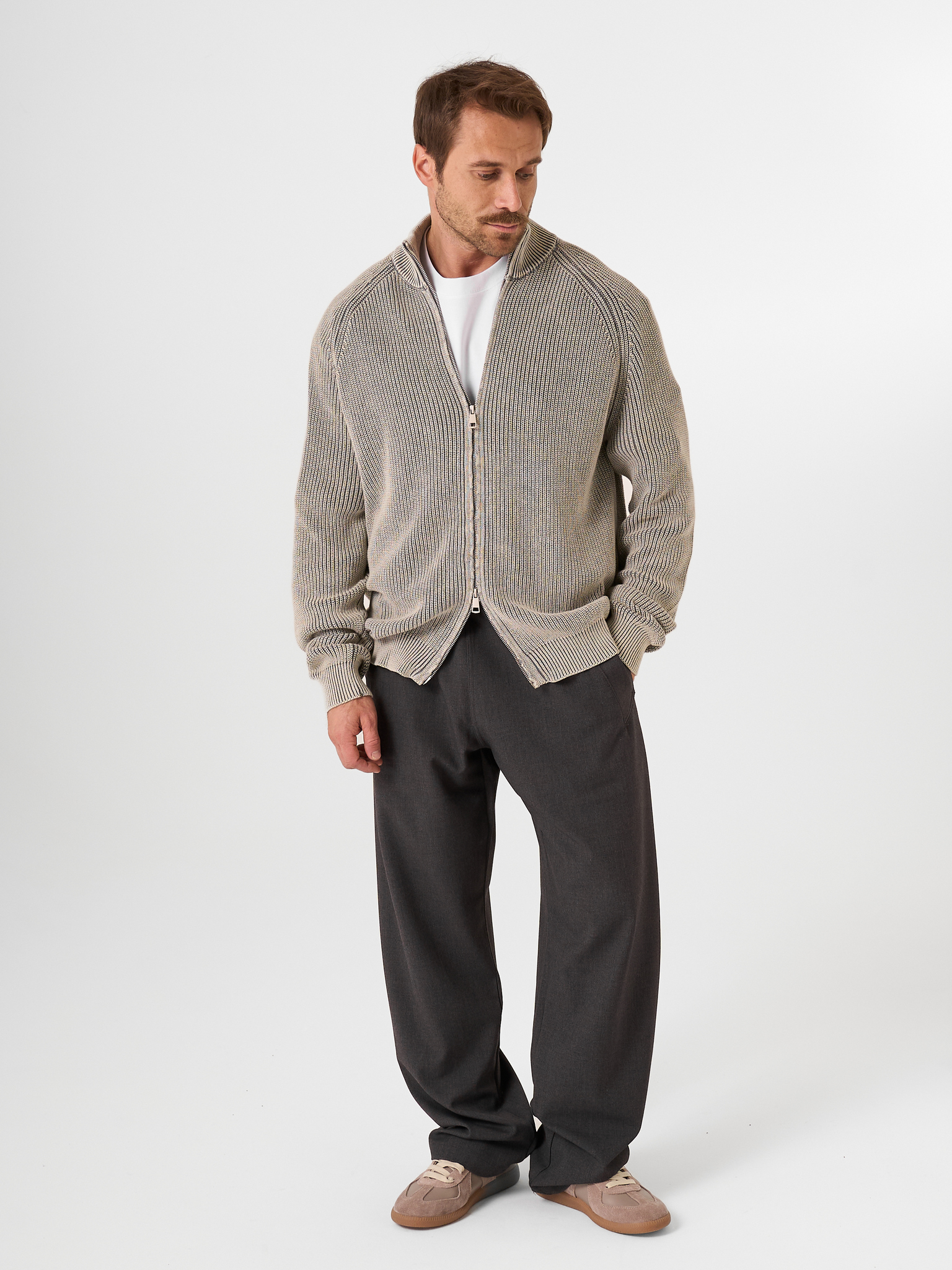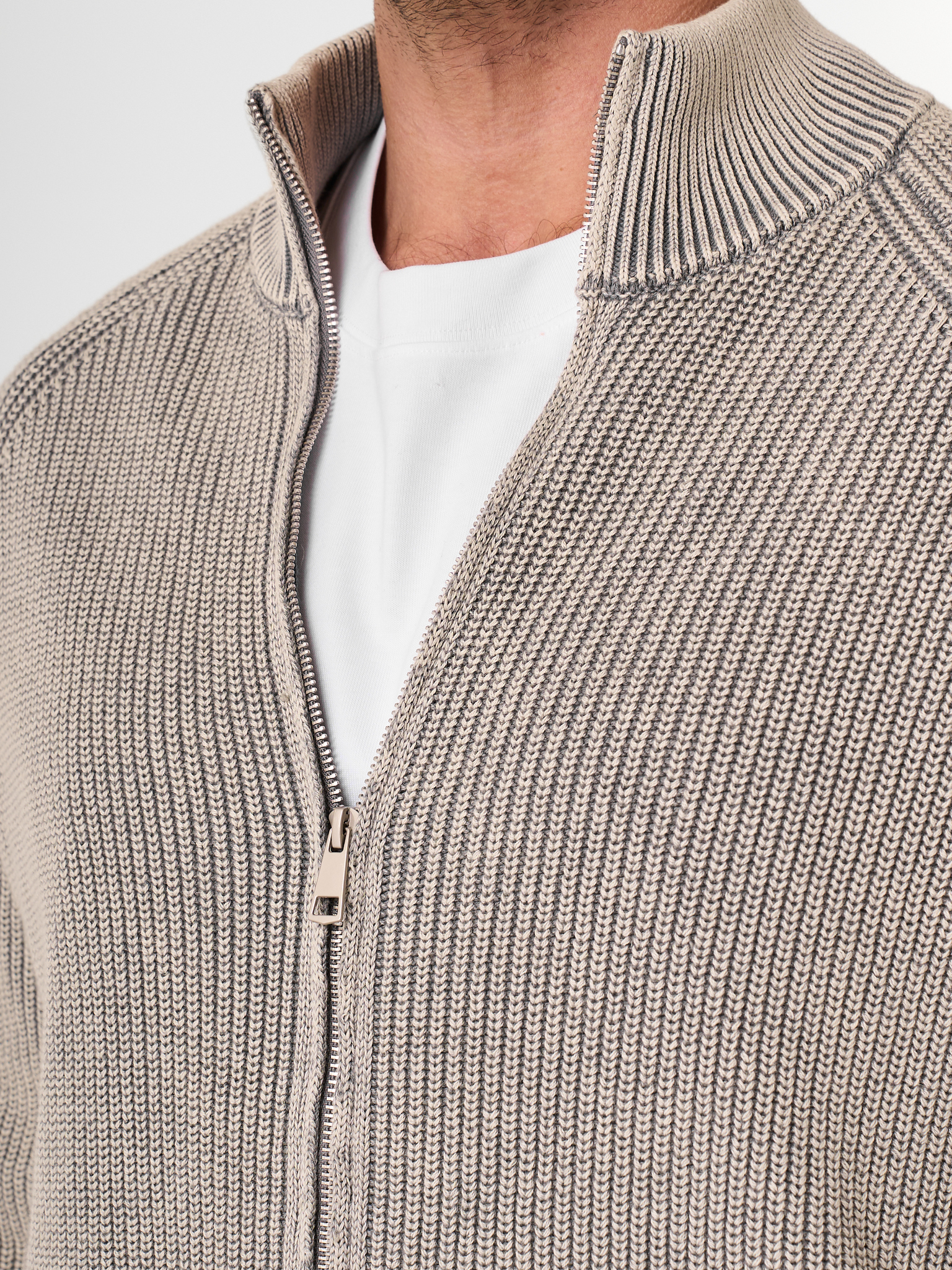 Серо-бежевый хлопковый джемпер в рубчик на молнии выполнен из тяжелой пряжи с гранжевым эффектом варки. Универсальная модель будет неприхотлива в стайлинге и отлично подойдет как под галстук с рубашкой, так и под спортивные брюки.