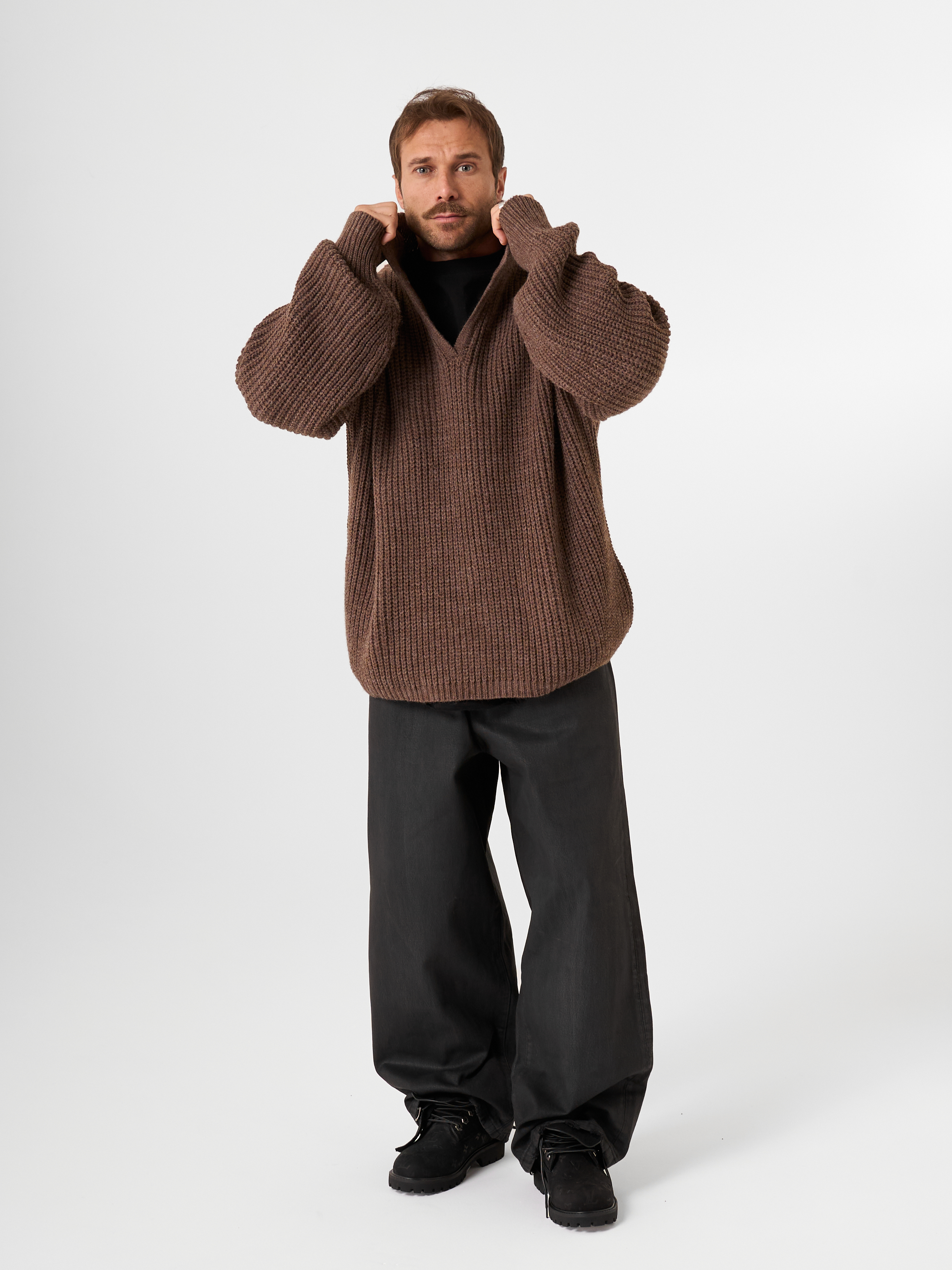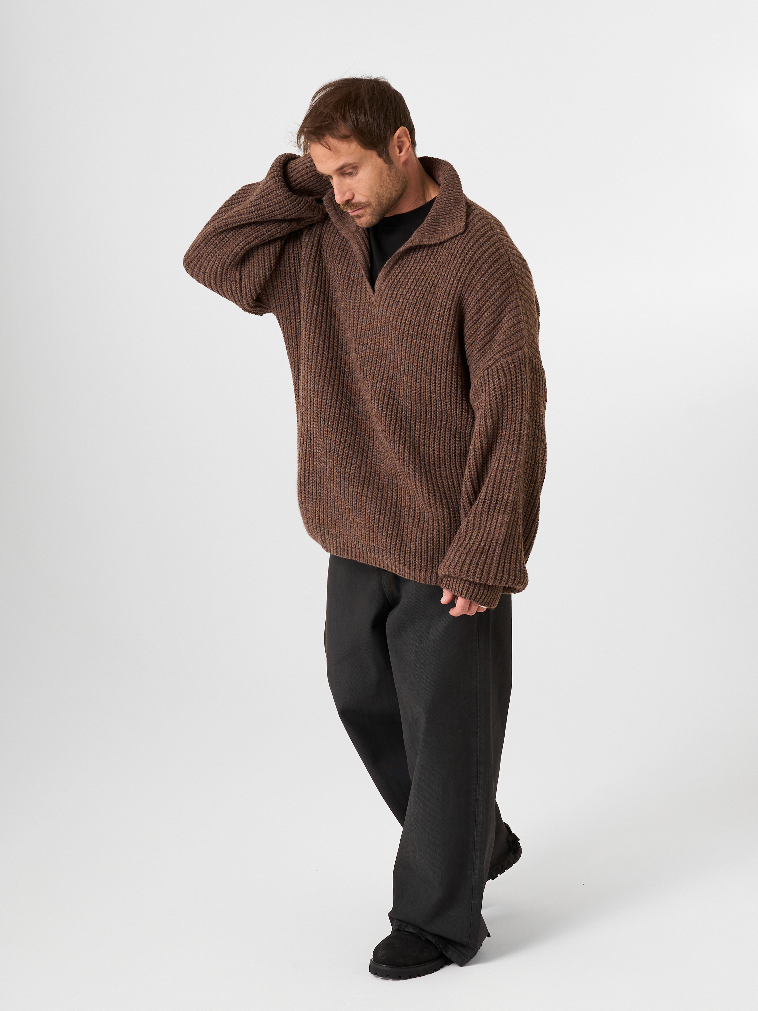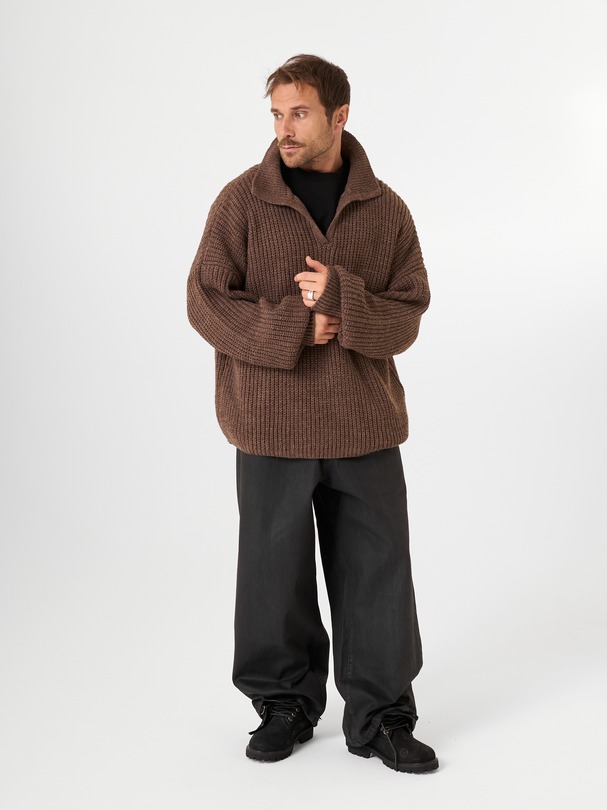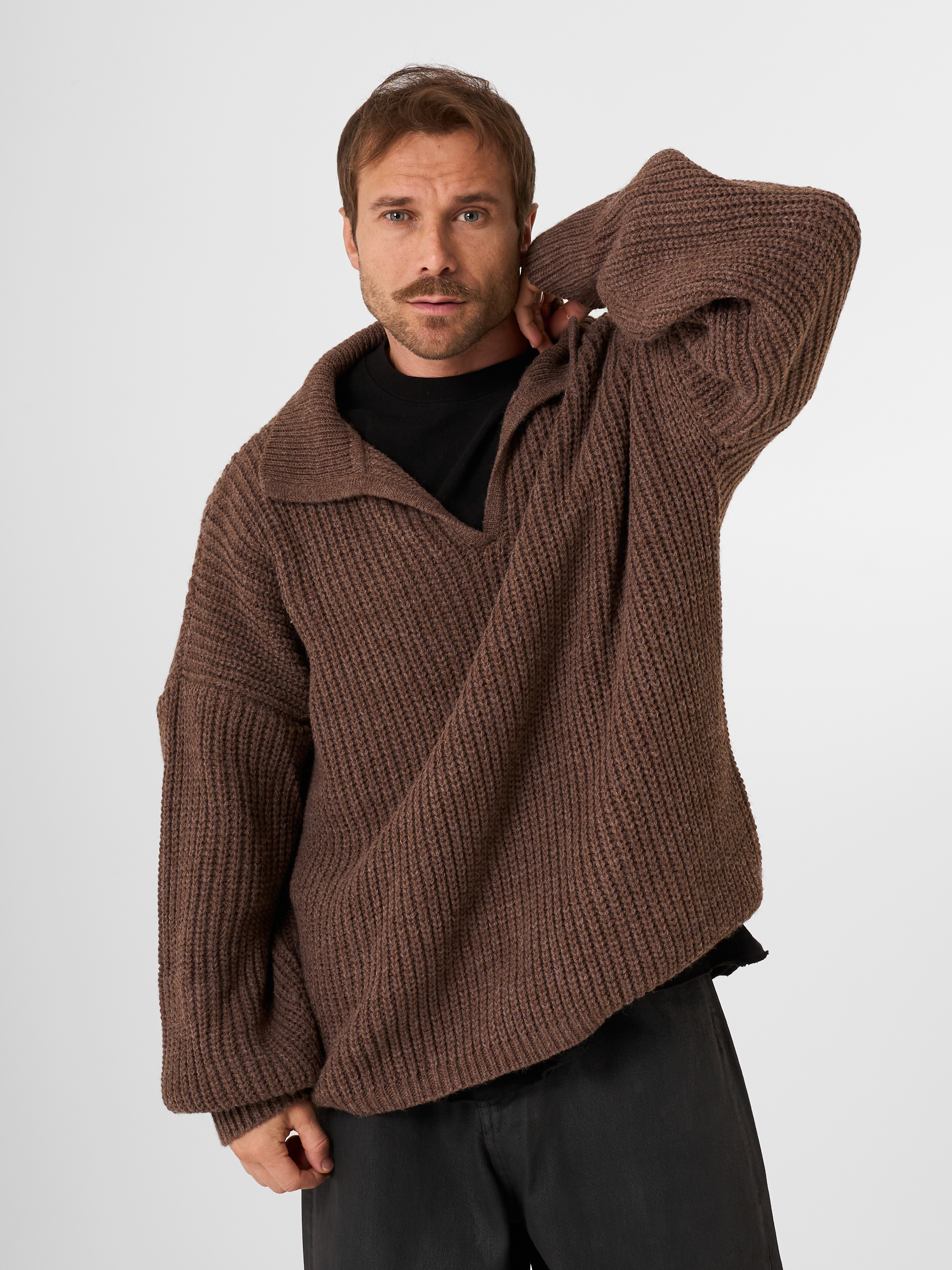 Незаменимый айтем осенне-зимнего сезона - шерстяной свитер крупной вязки в рыбацком стиле. Модель с открытым отложным воротником выполнена в объемном гранжевом крое.