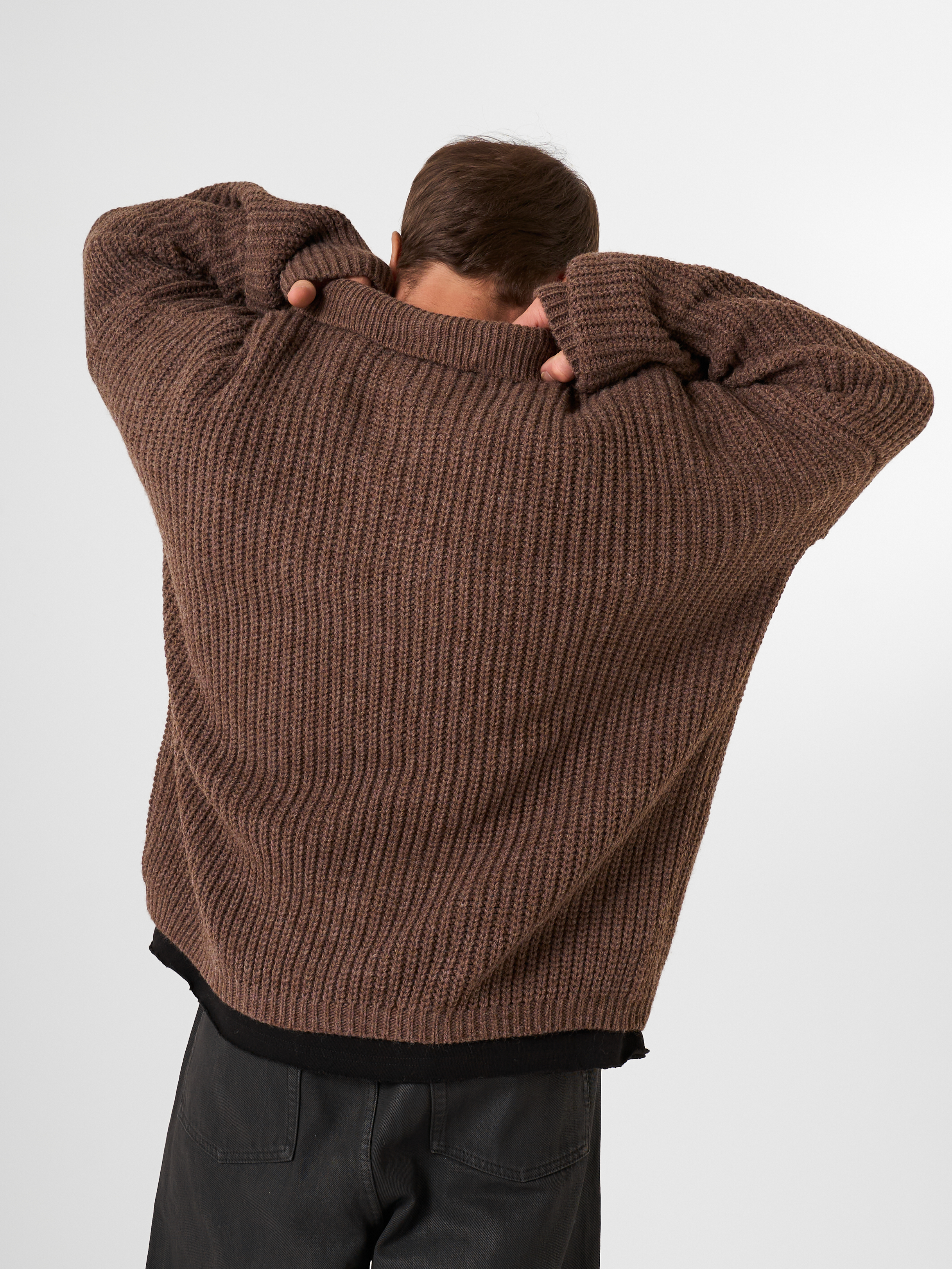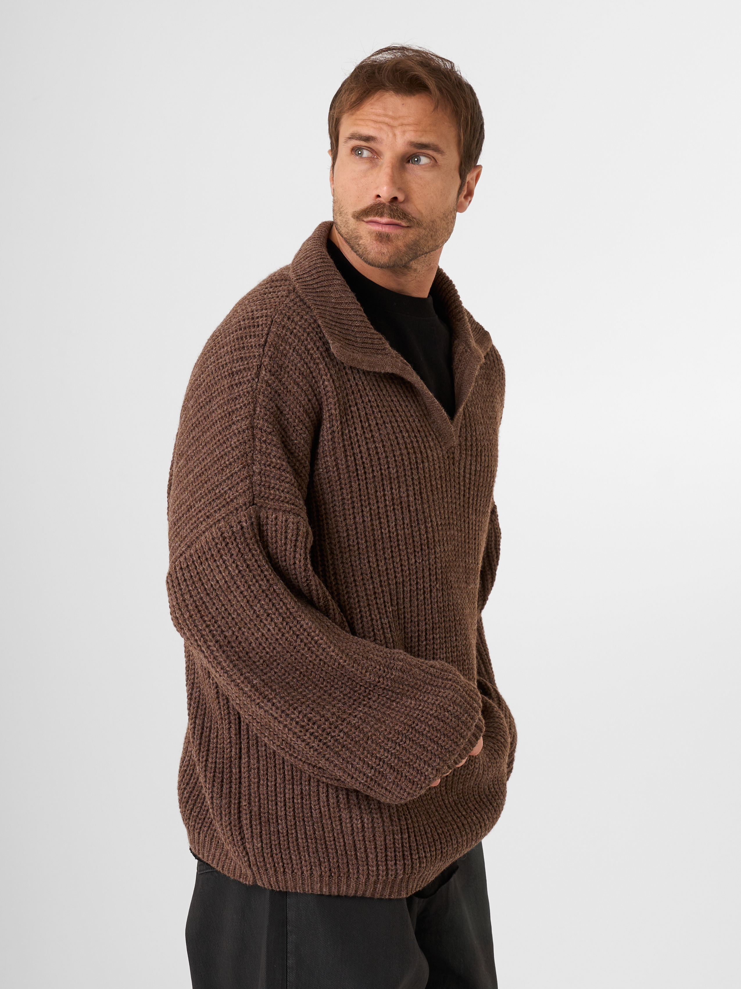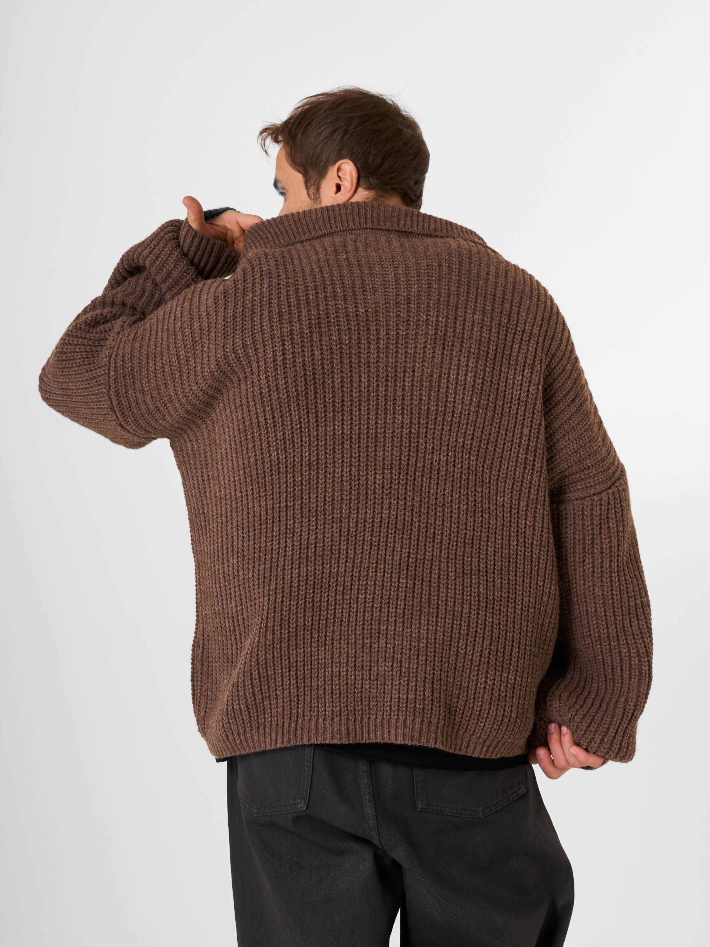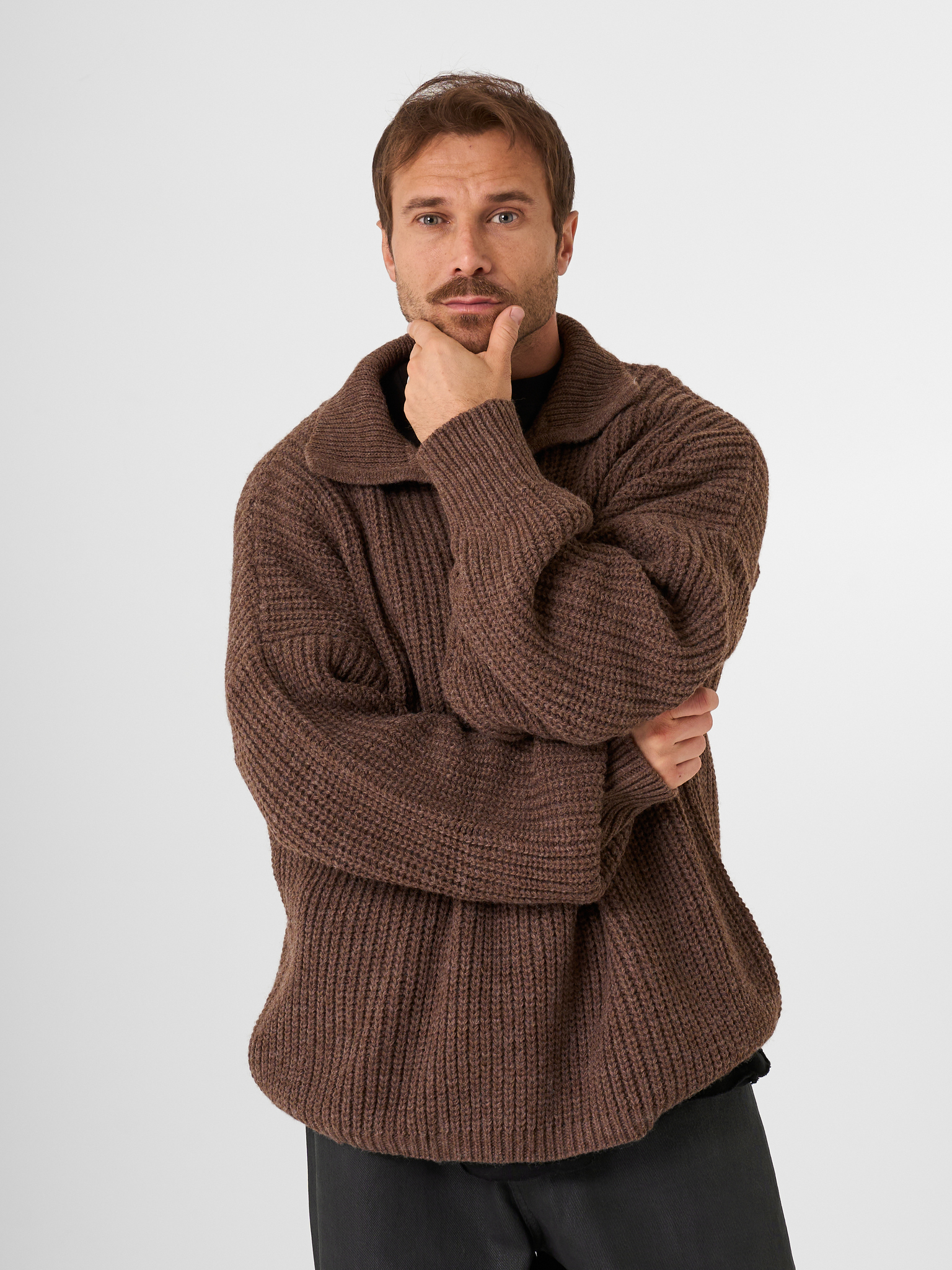 Незаменимый айтем осенне-зимнего сезона - шерстяной свитер крупной вязки в рыбацком стиле. Модель с открытым отложным воротником выполнена в объемном гранжевом крое.