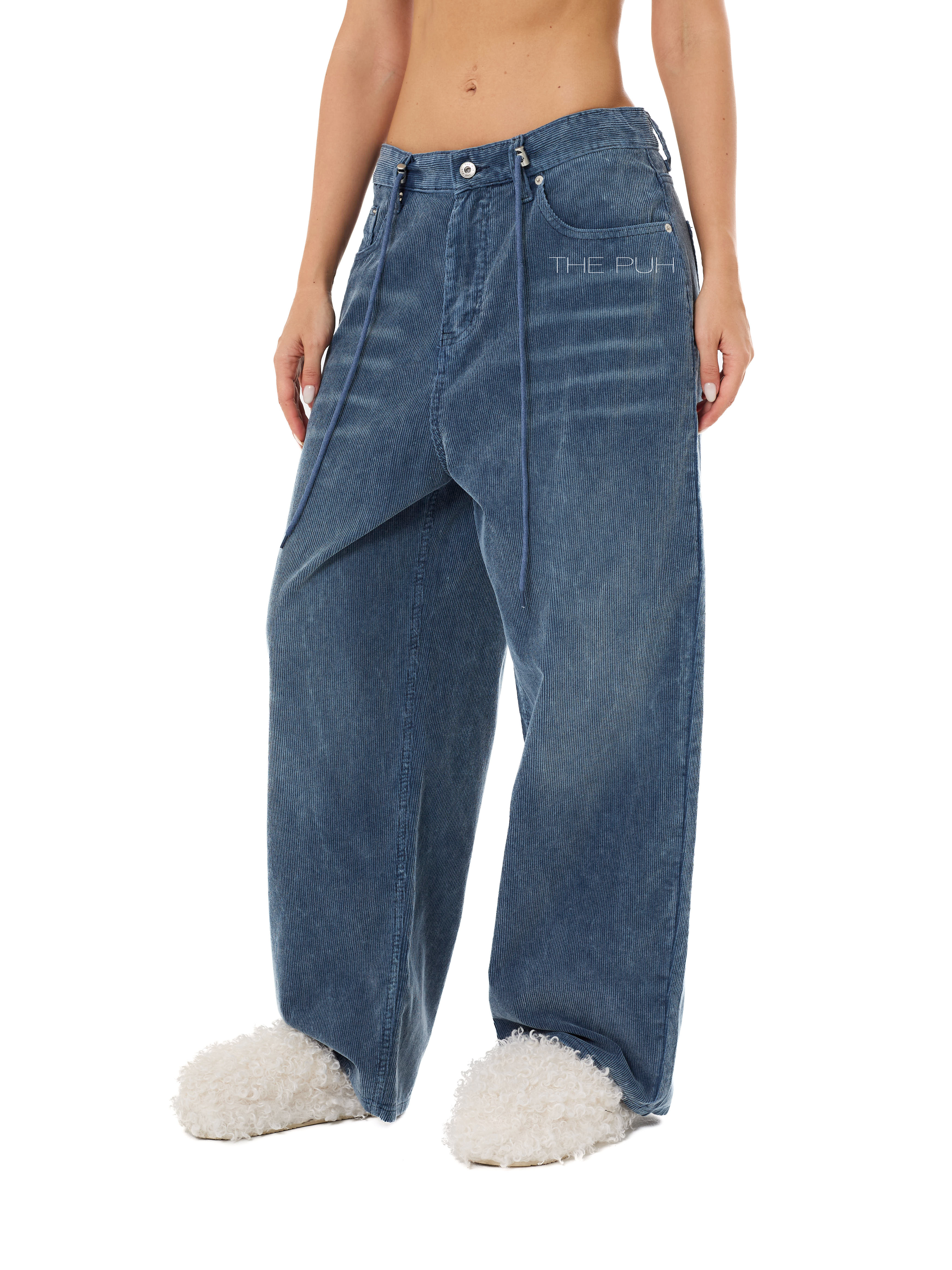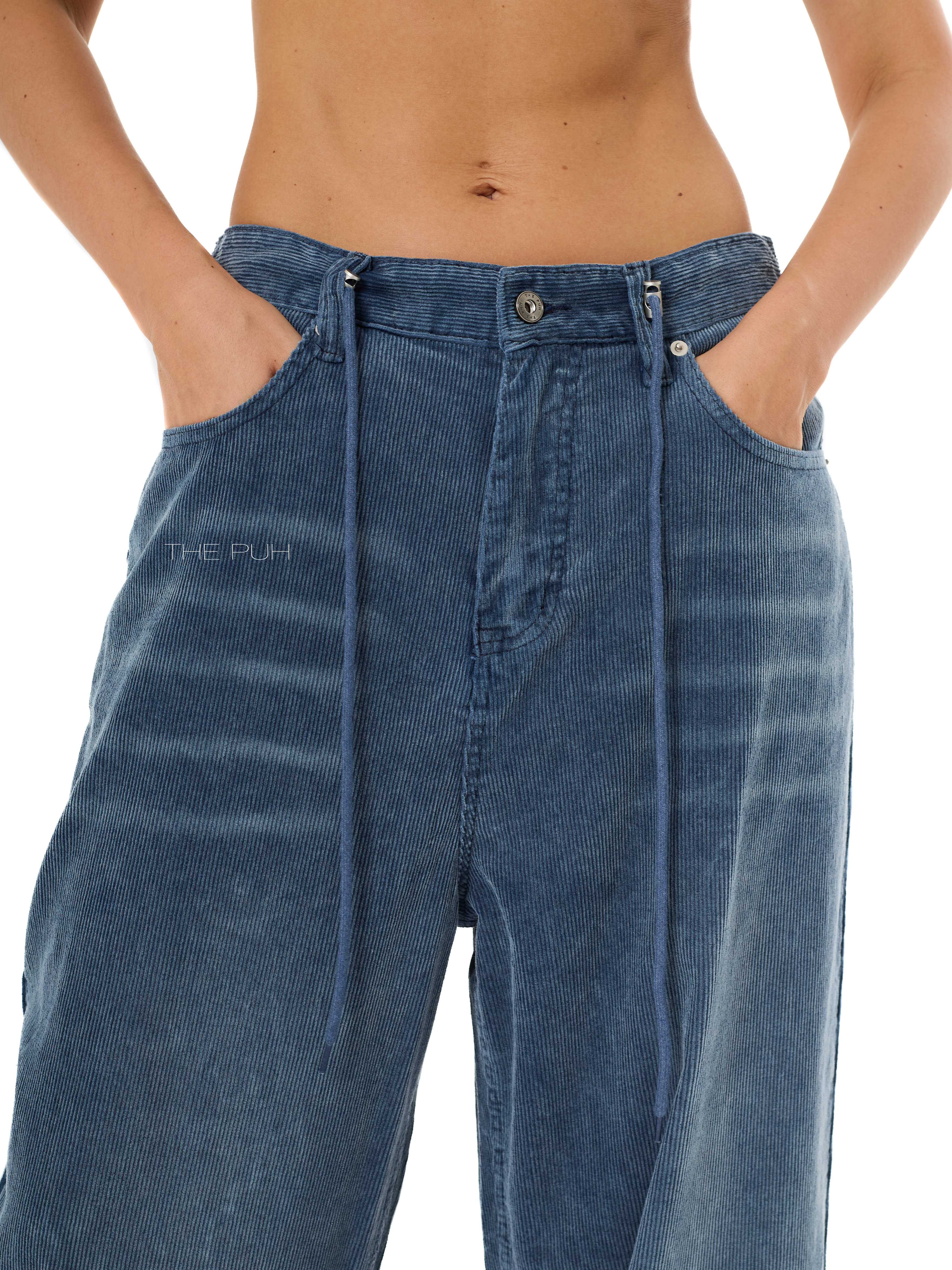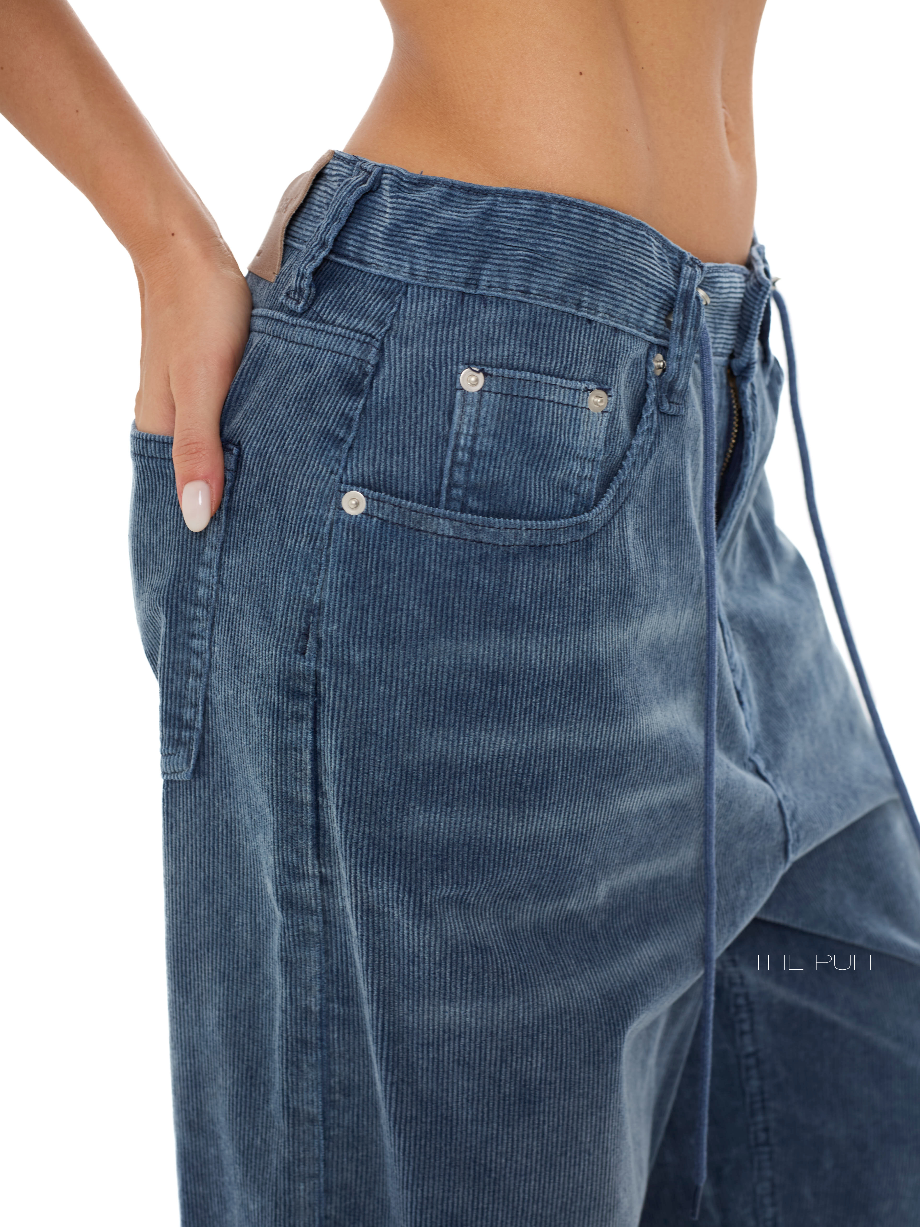 Широкие джинсы-трансформеры выполнены из гсинего вельвета с потертостями. Модель прямого кроя дополнена специальной кулиской со стопперами, которая позволяет менять обхват талии и посадку джинсов по вашему вкусу.