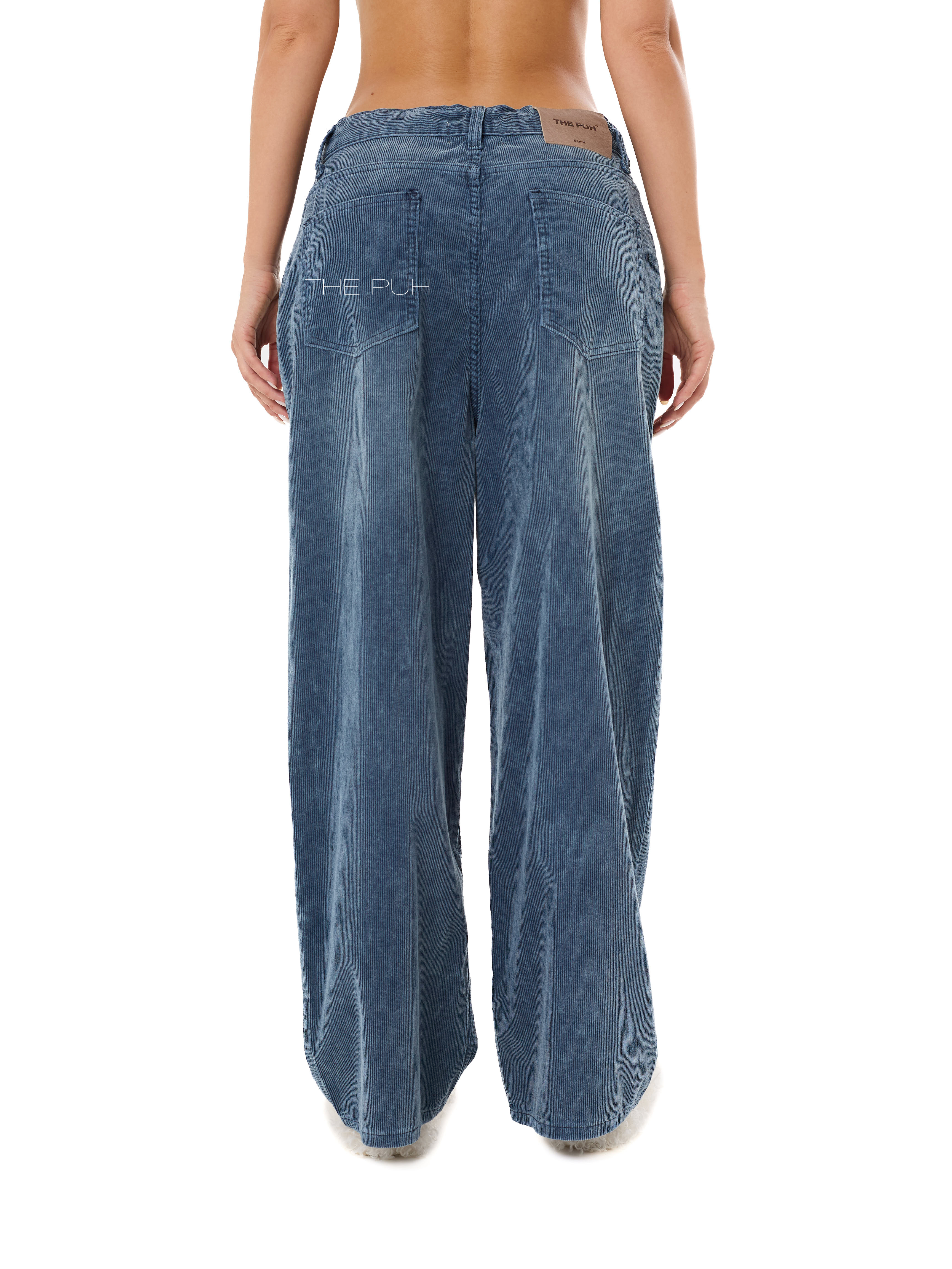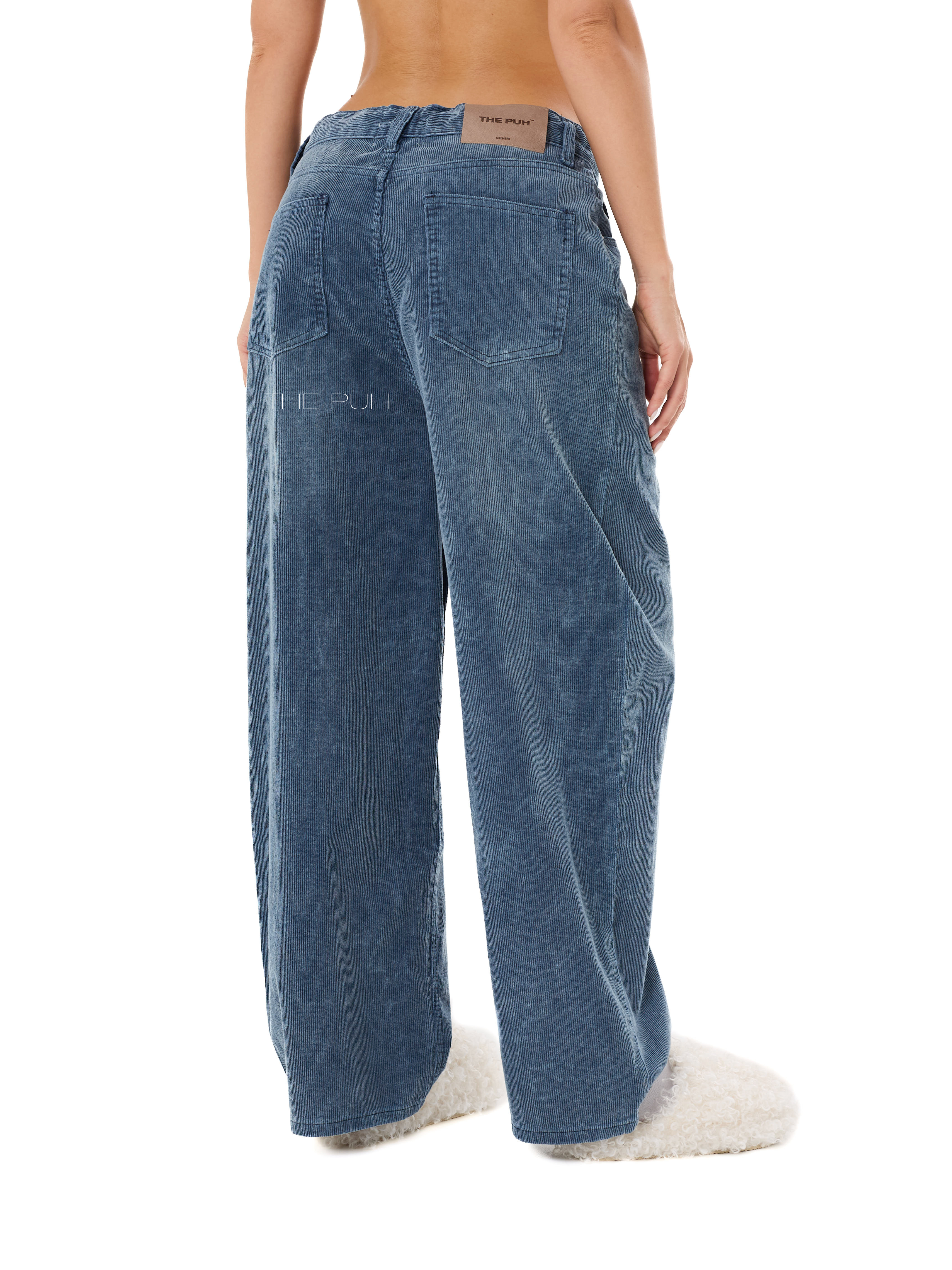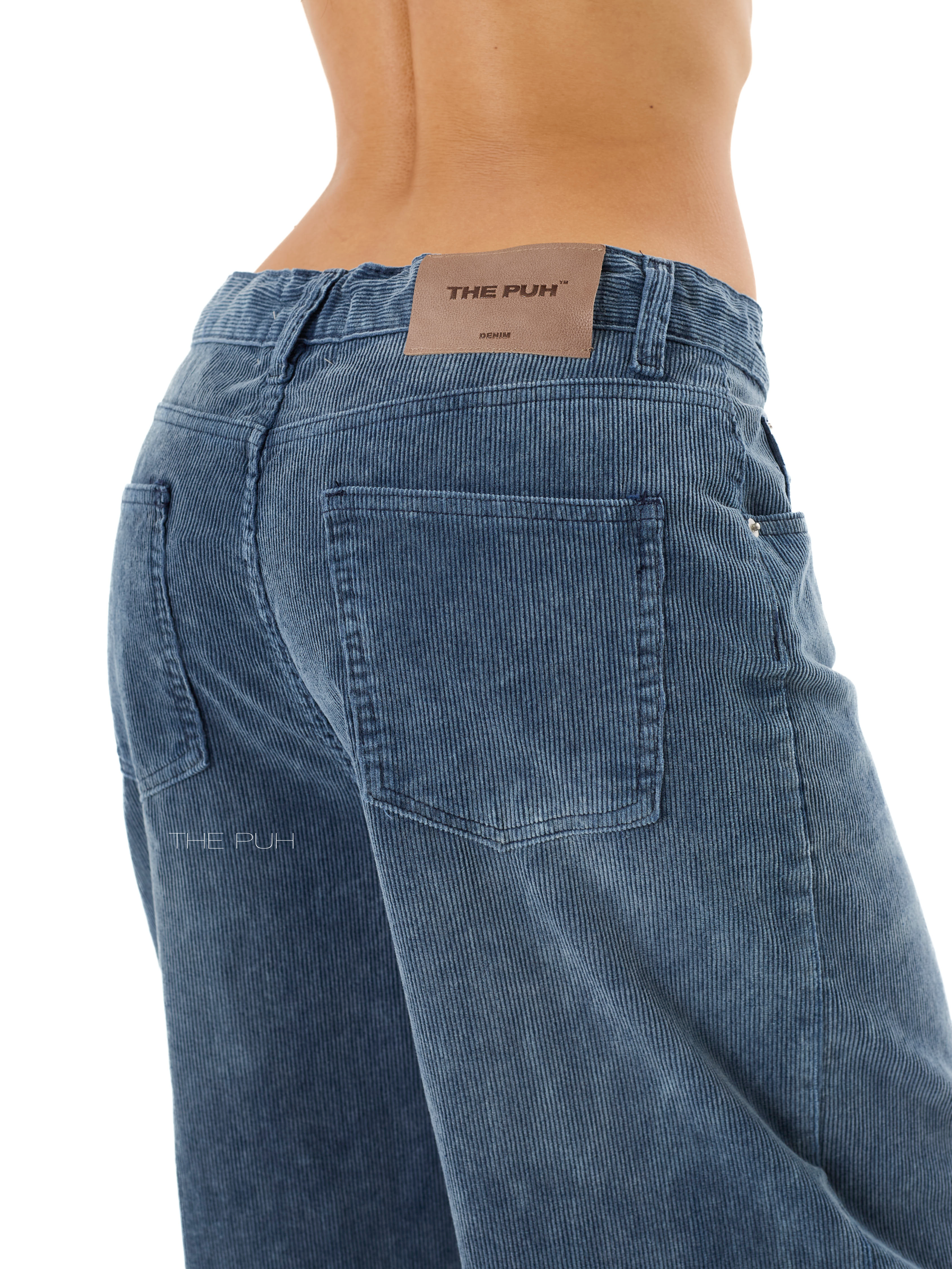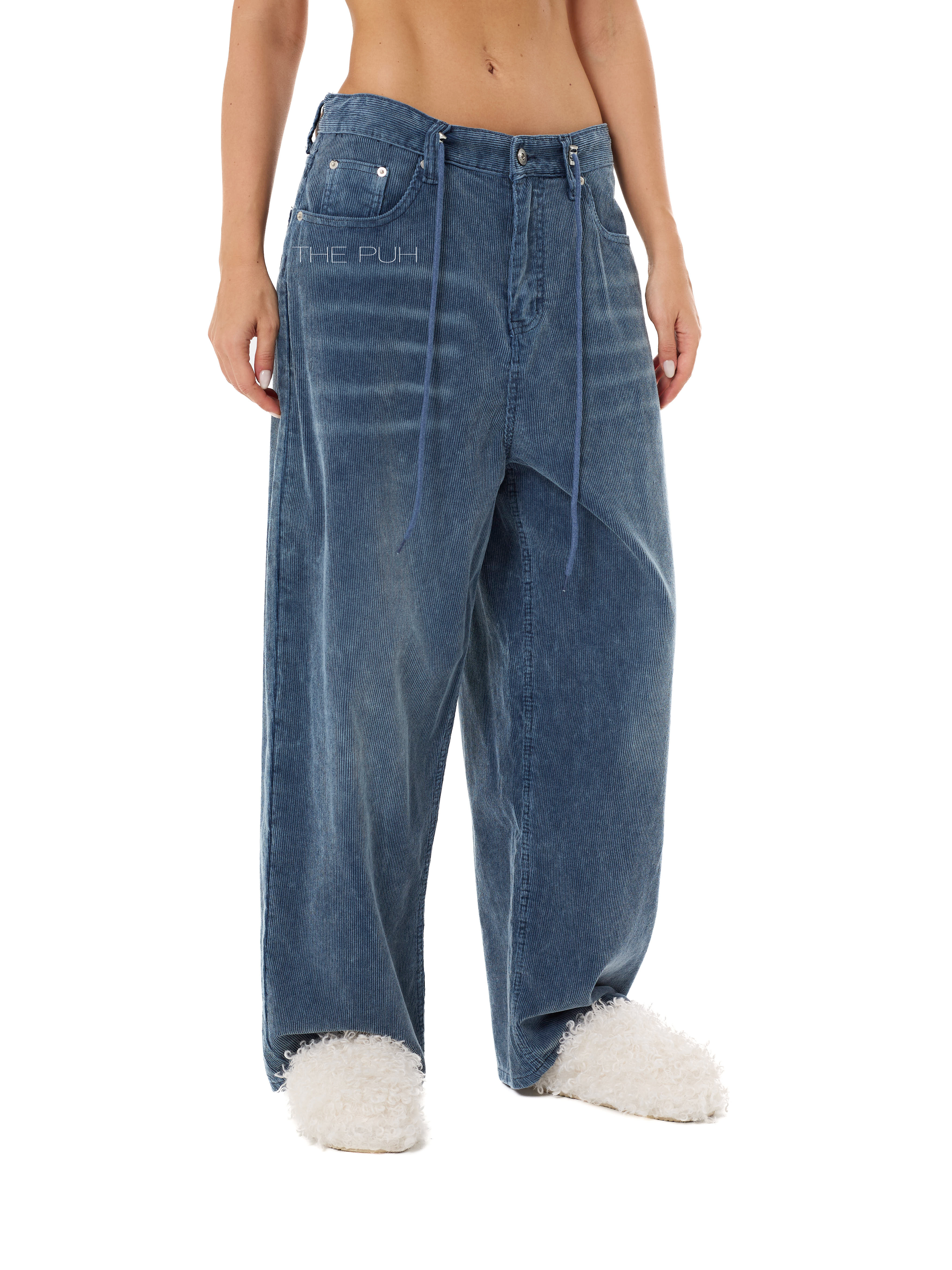 Широкие джинсы-трансформеры выполнены из гсинего вельвета с потертостями. Модель прямого кроя дополнена специальной кулиской со стопперами, которая позволяет менять обхват талии и посадку джинсов по вашему вкусу.
