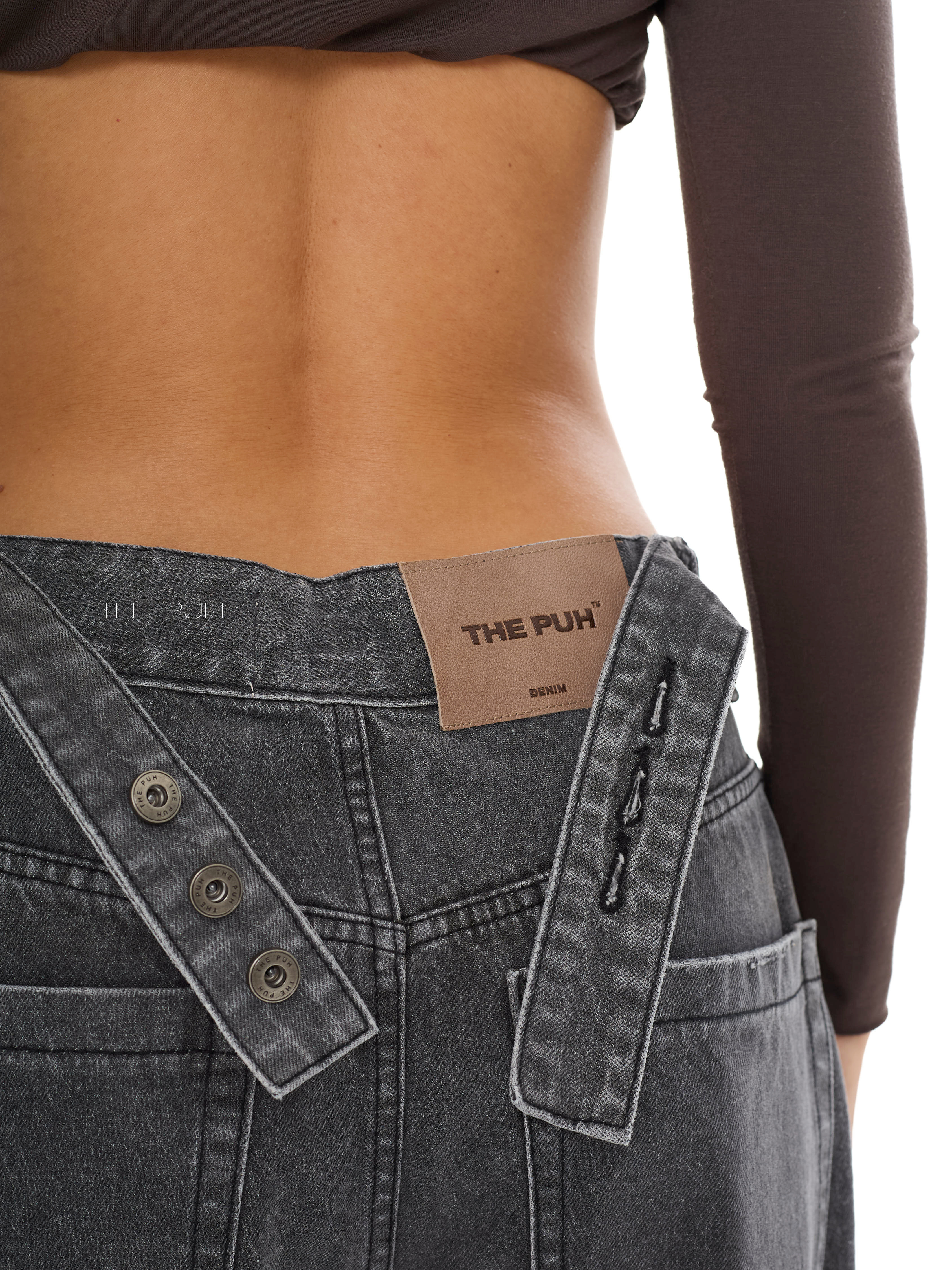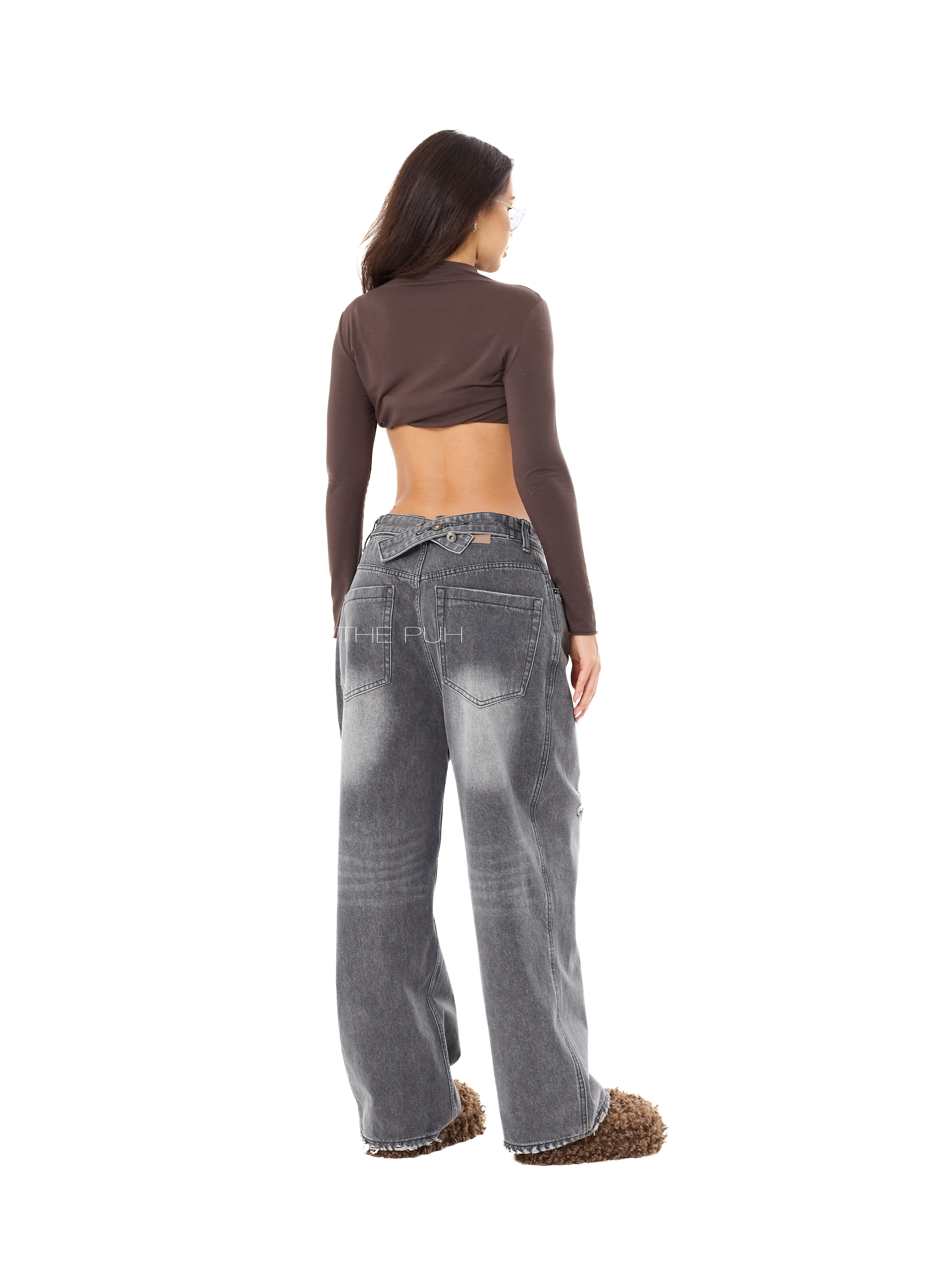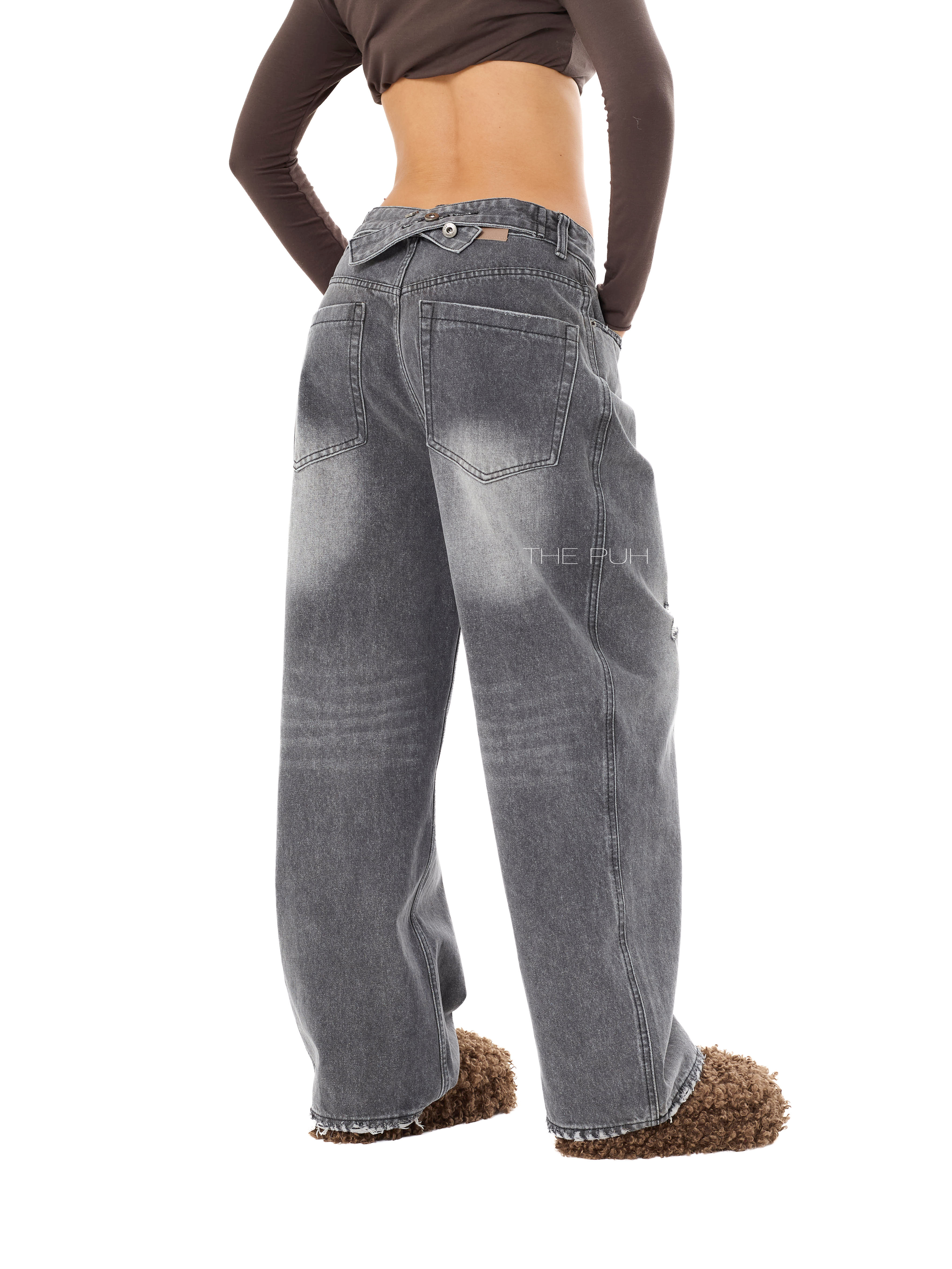 Широкие джинсы-трансформеры выполнены из серого денима с декоративными потертостями. Модель прямого кроя дополнена специальным регулятором на поясе сзади, который позволяет менять обхват талии и посадку джинсов.