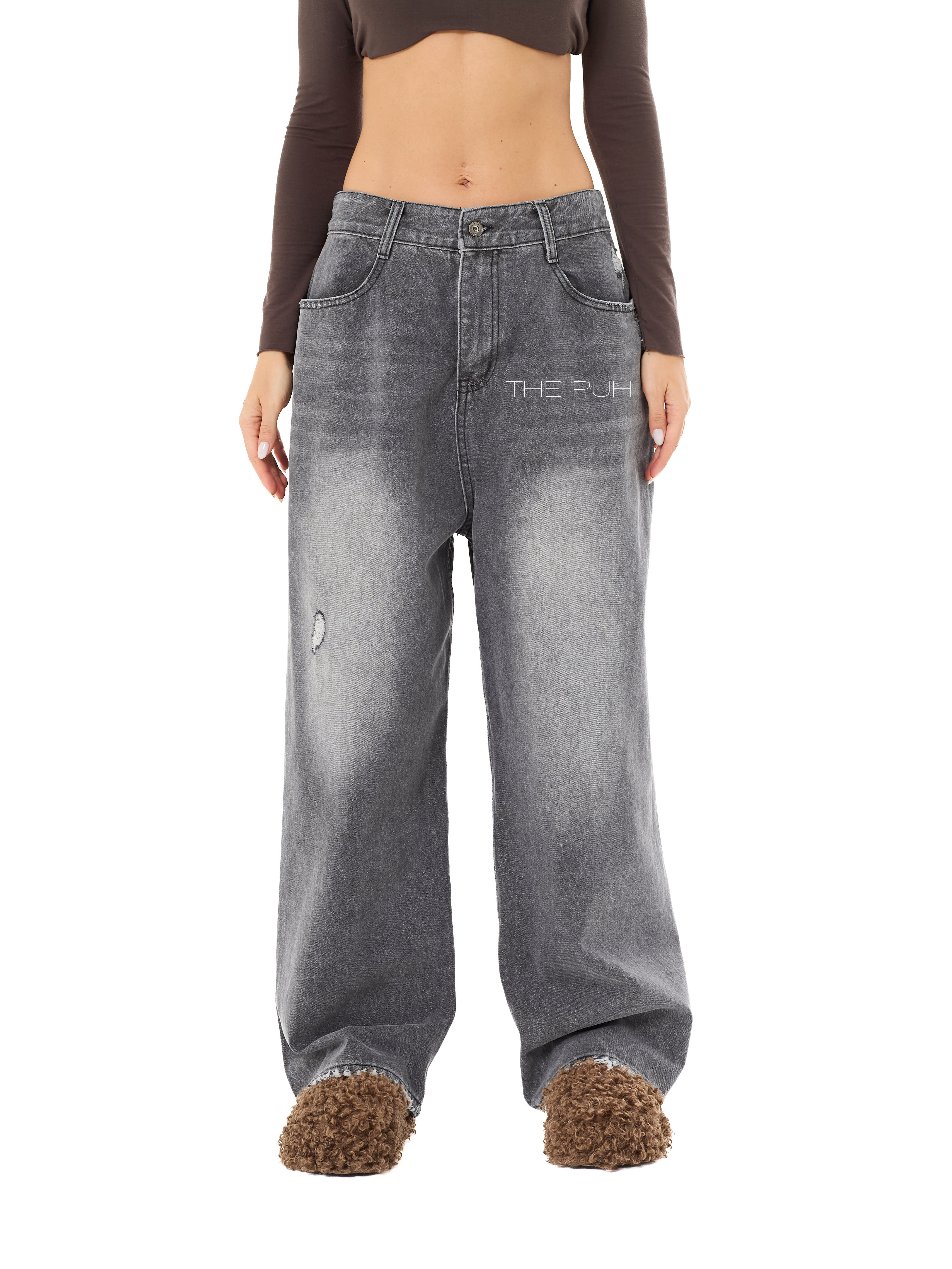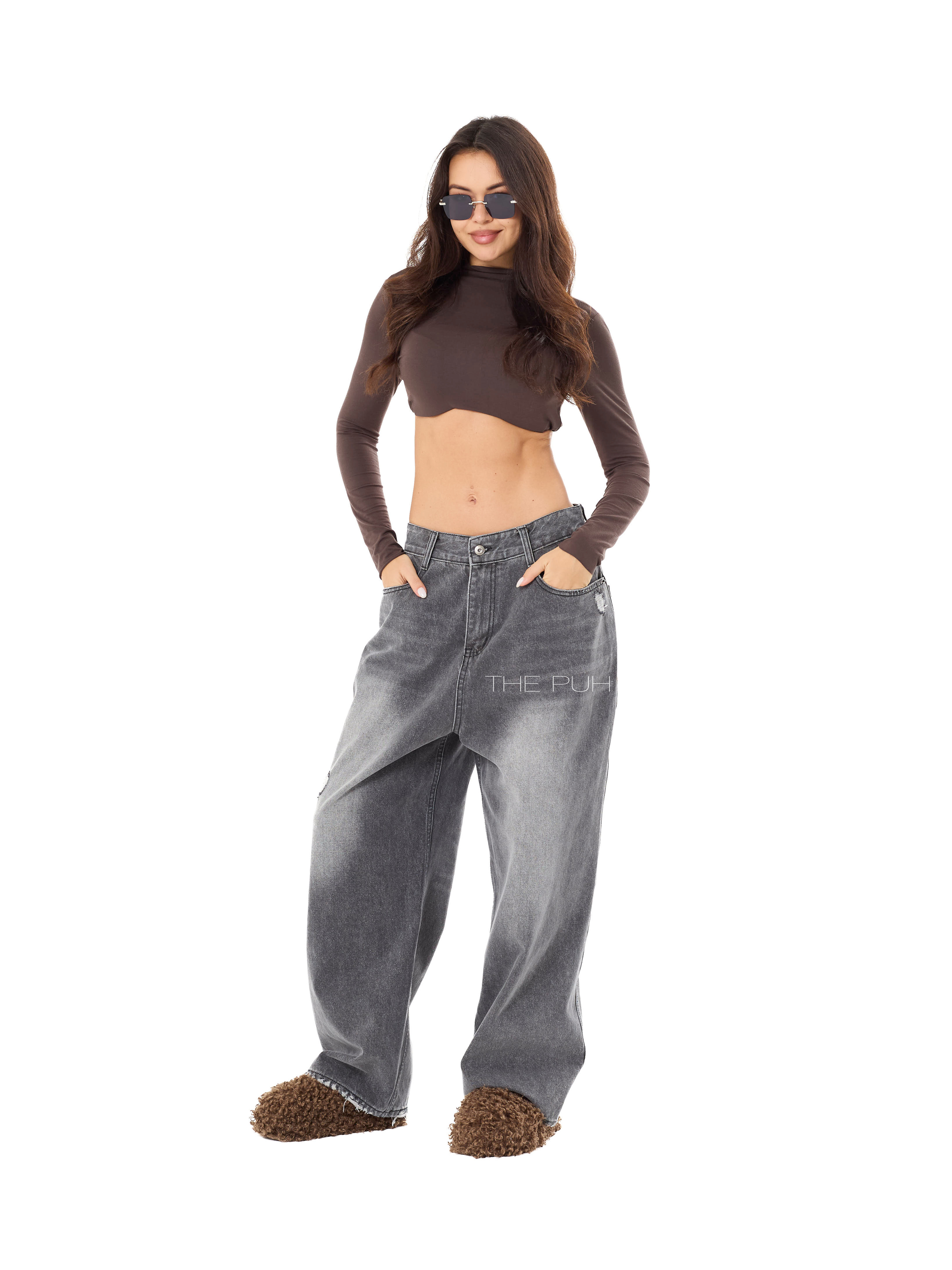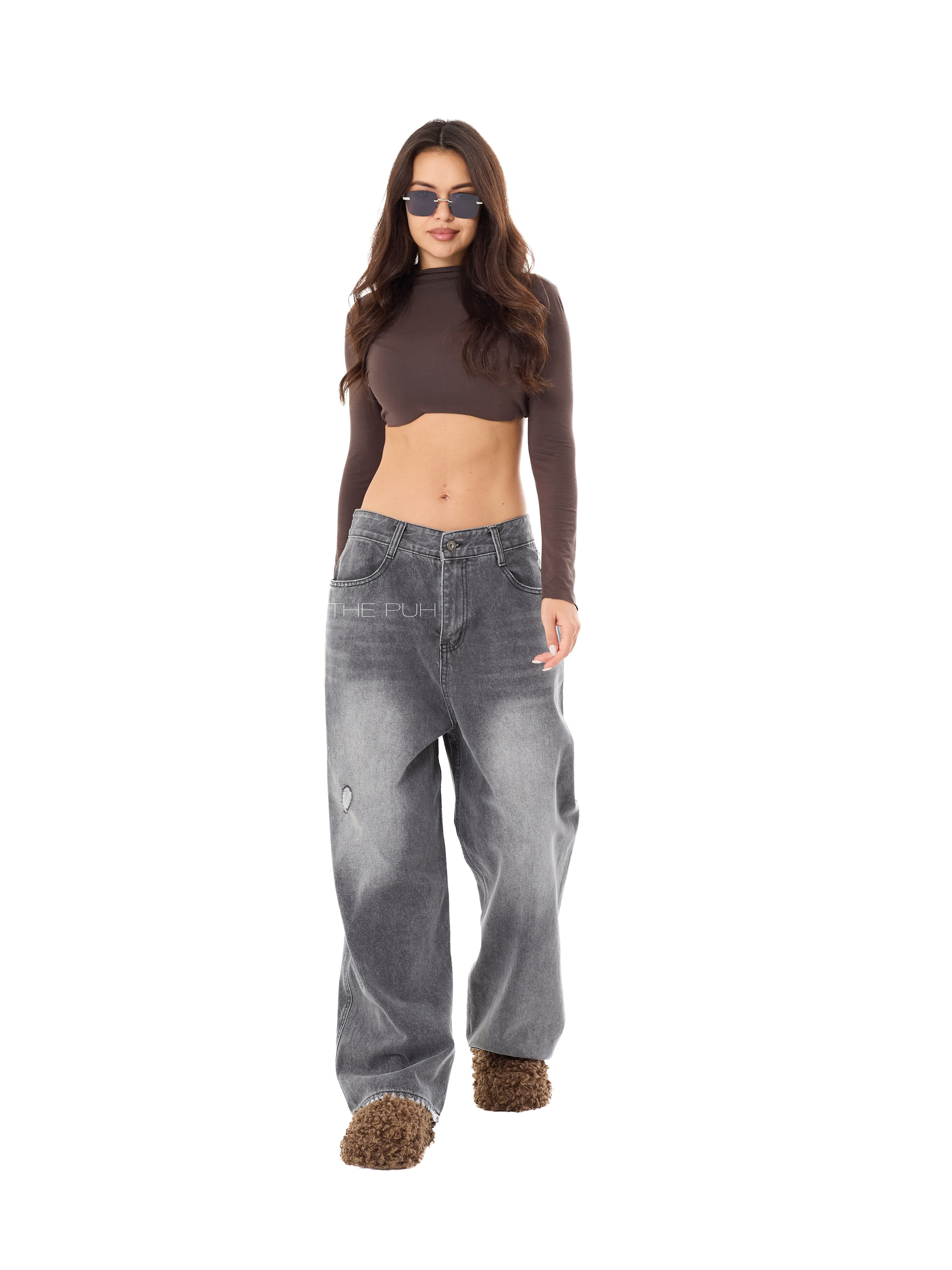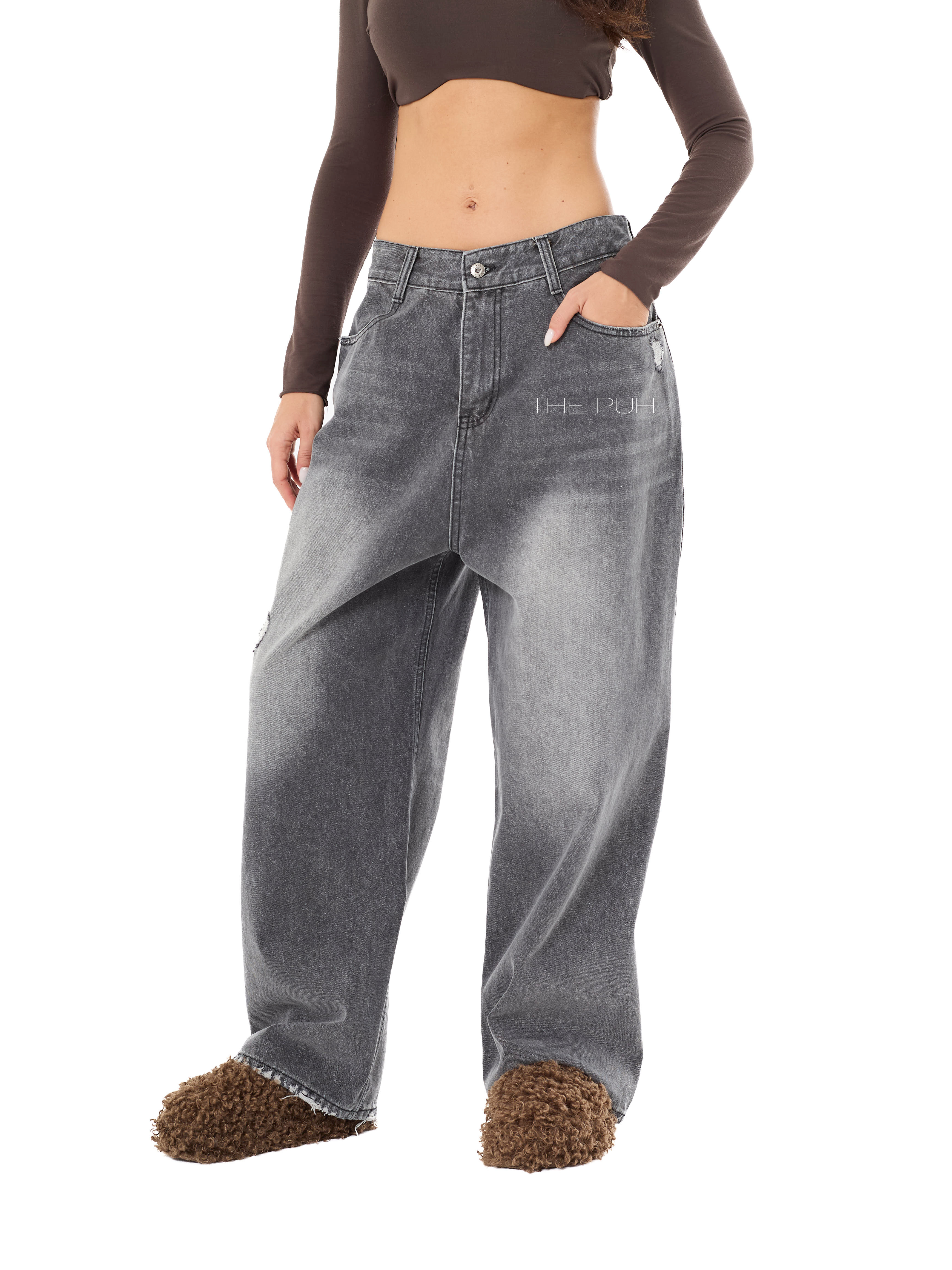 Широкие джинсы-трансформеры выполнены из серого денима с декоративными потертостями. Модель прямого кроя дополнена специальным регулятором на поясе сзади, который позволяет менять обхват талии и посадку джинсов.