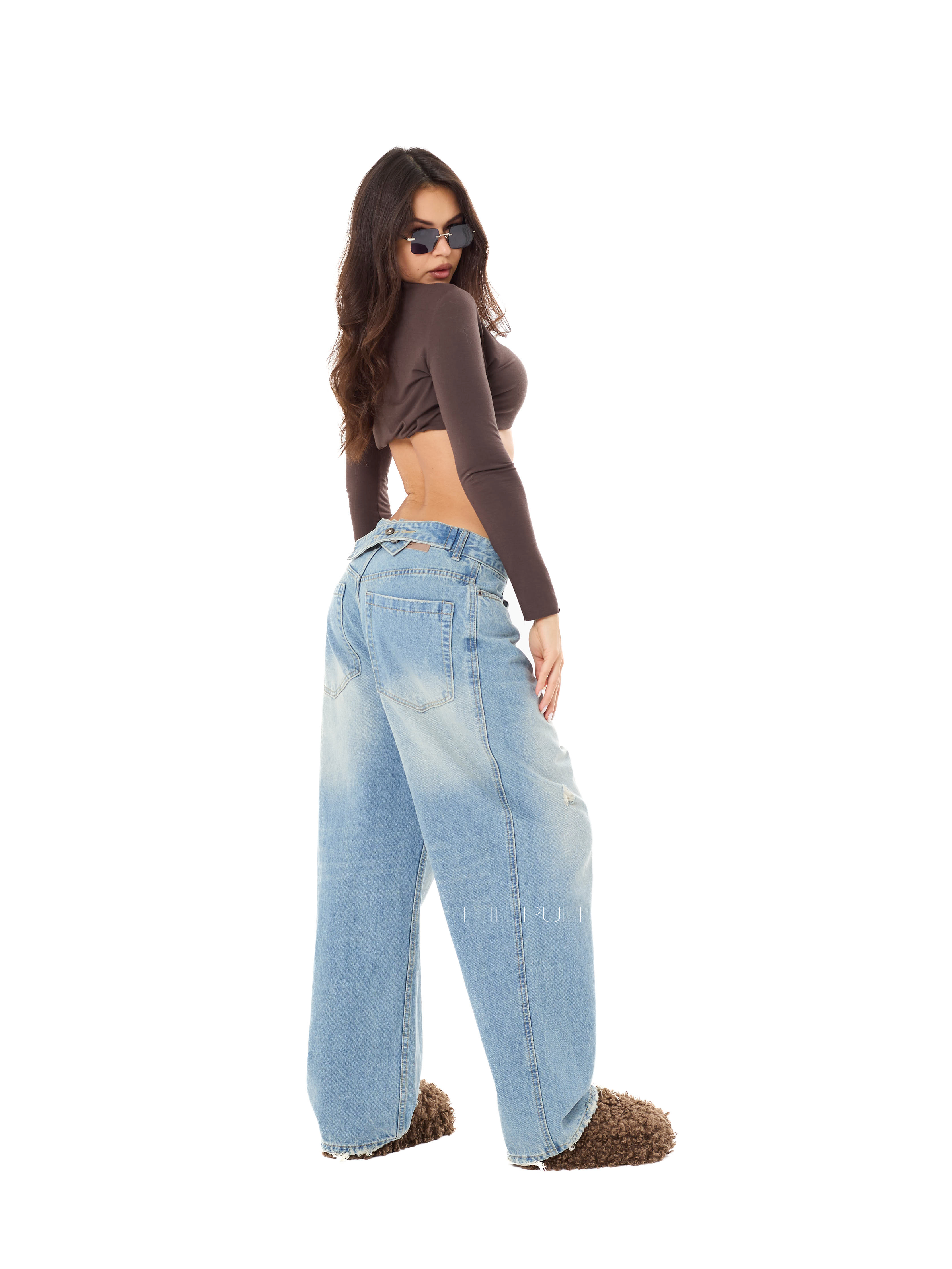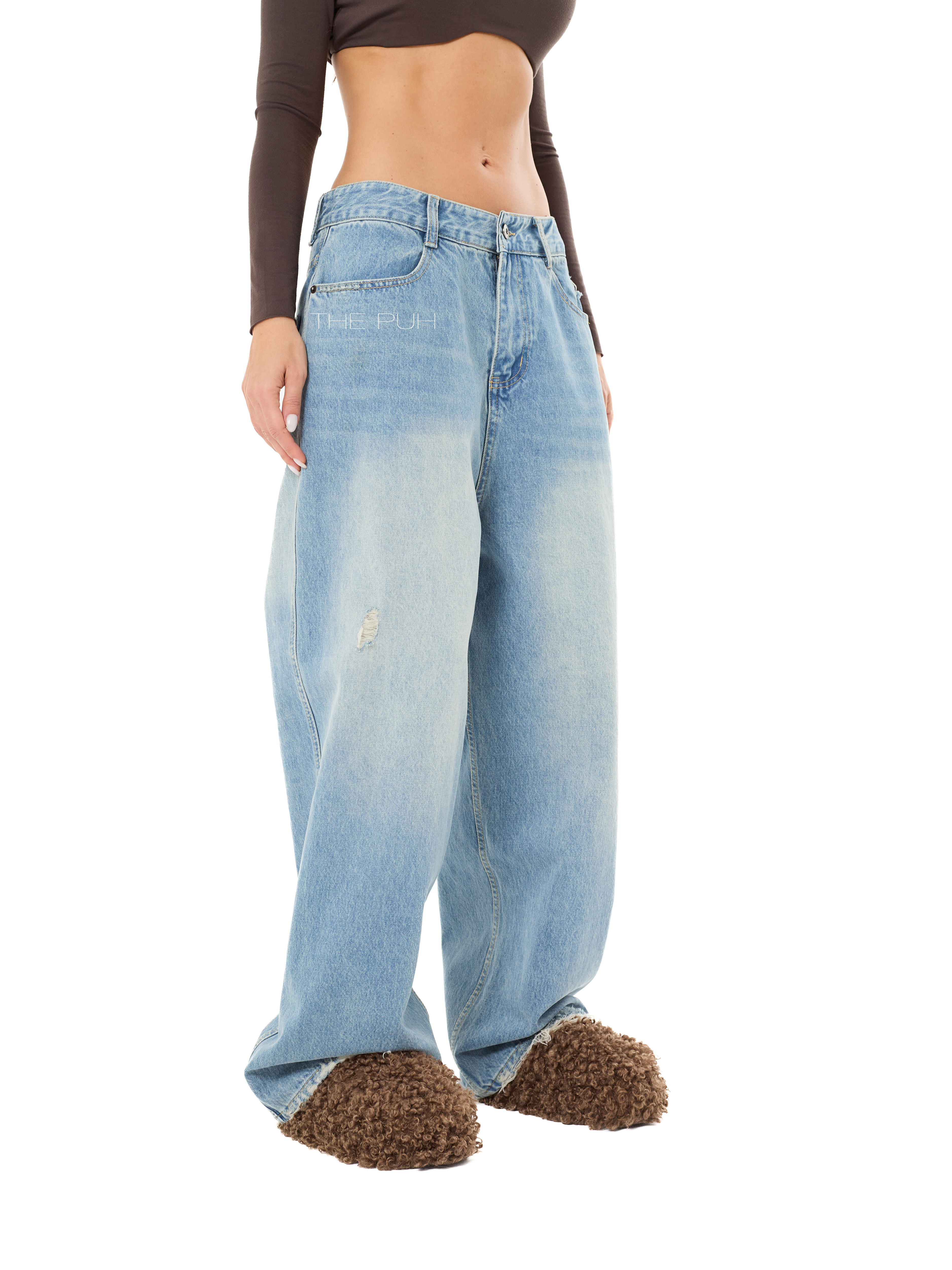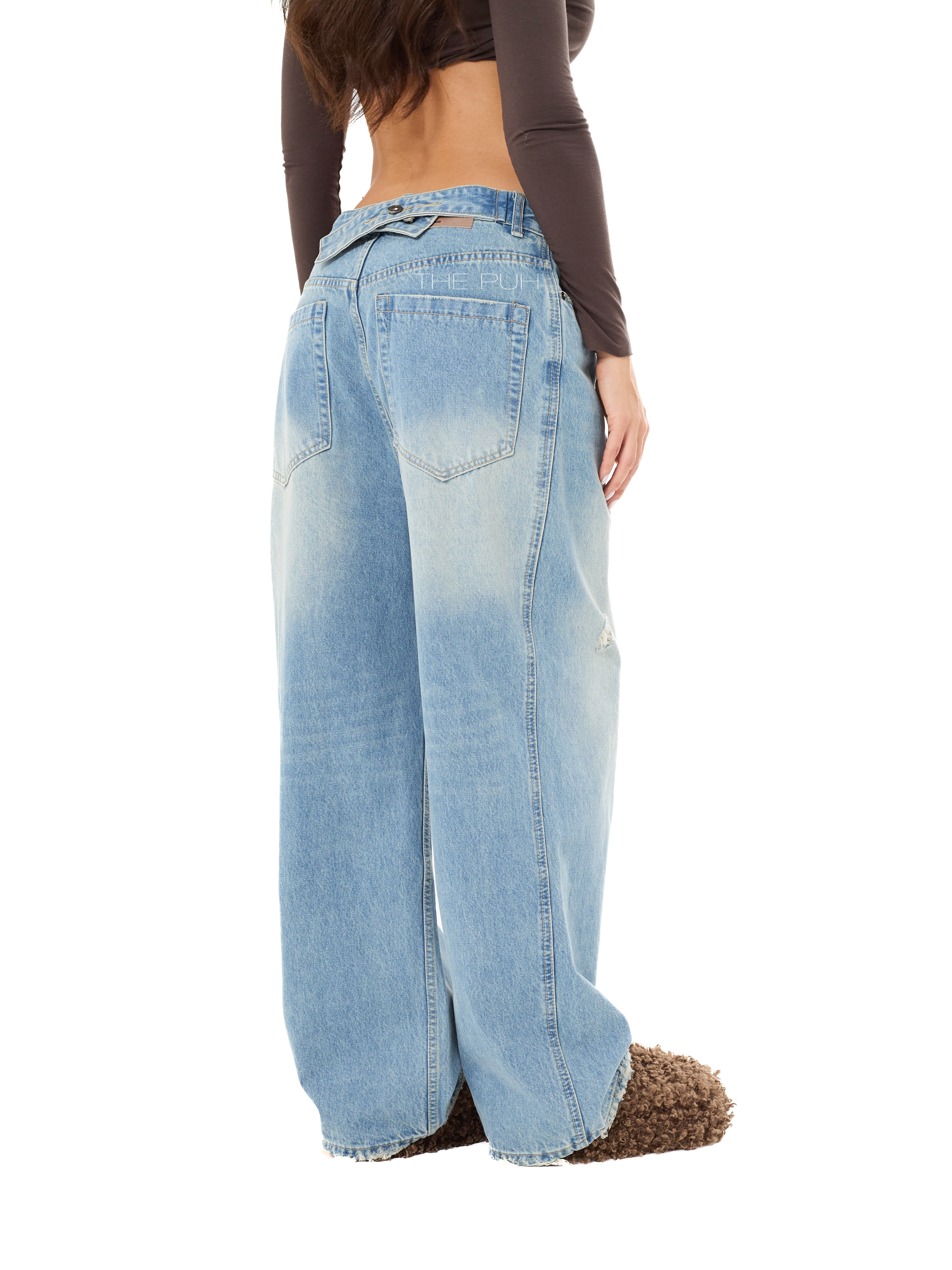 Широкие джинсы-трансформеры выполнены из светло-голубого денима с декоративными потертостями. Модель прямого кроя дополнена специальным регулятором на поясе сзади, который позволяет менять обхват талии и посадку джинсов.