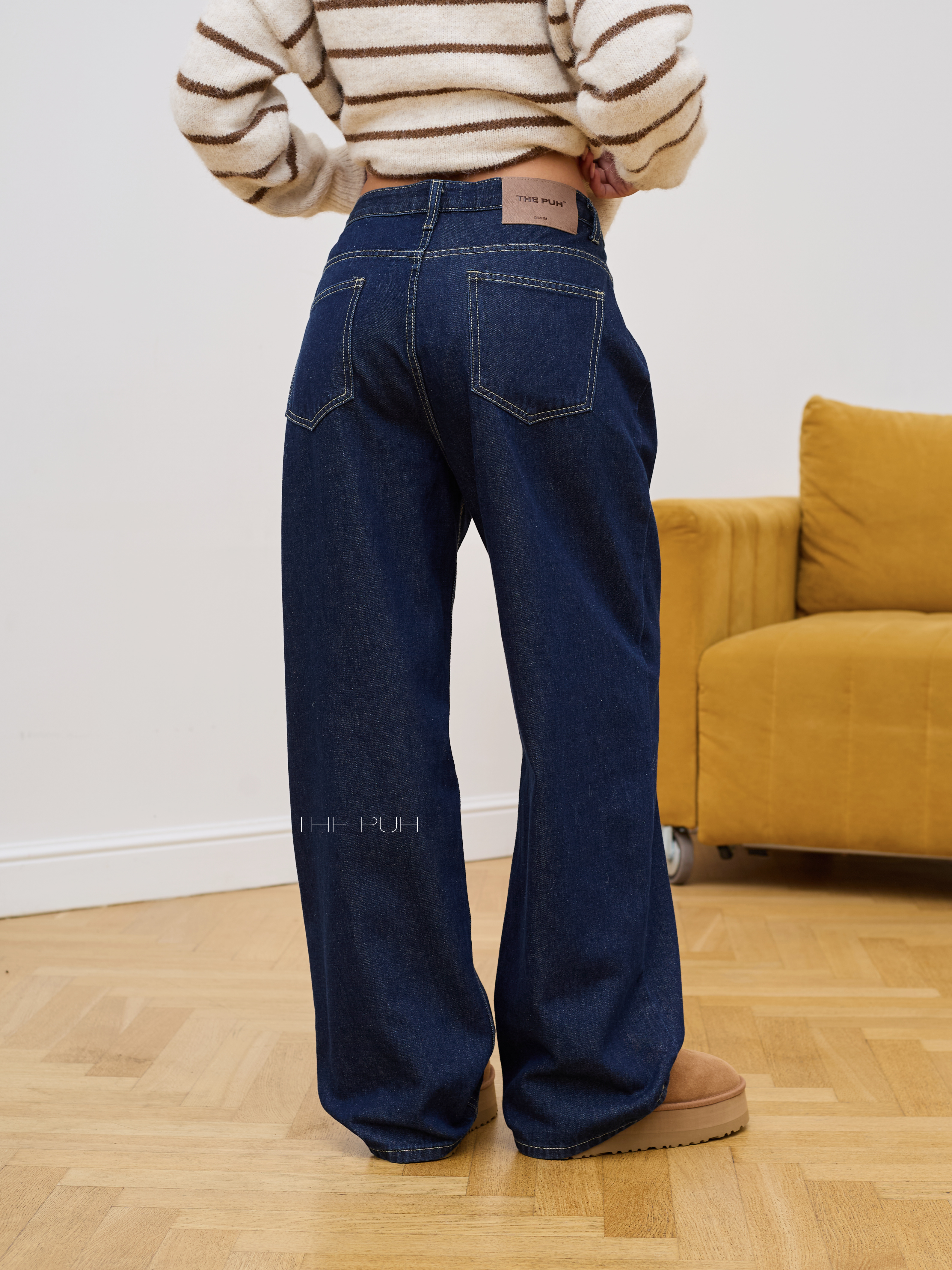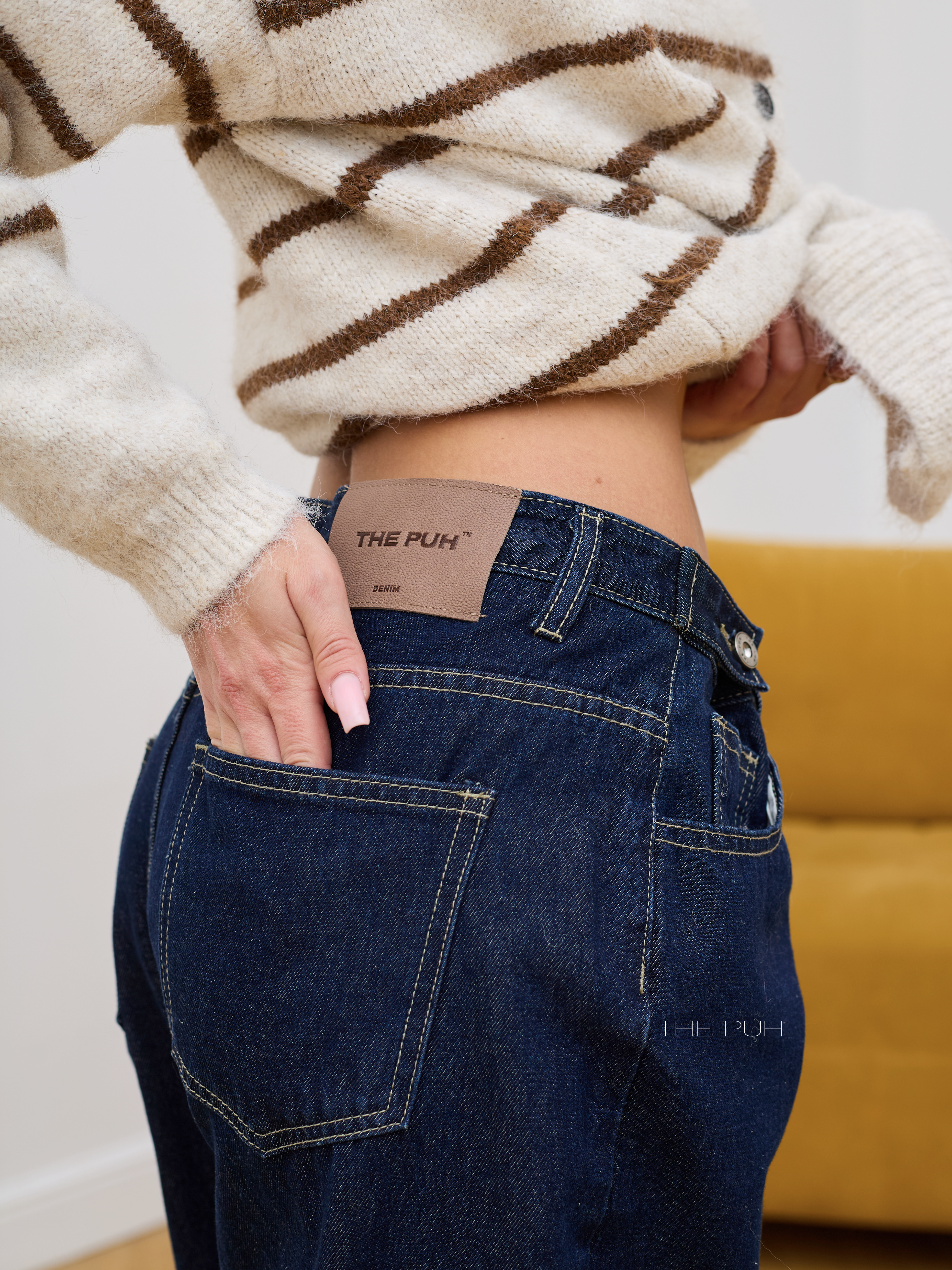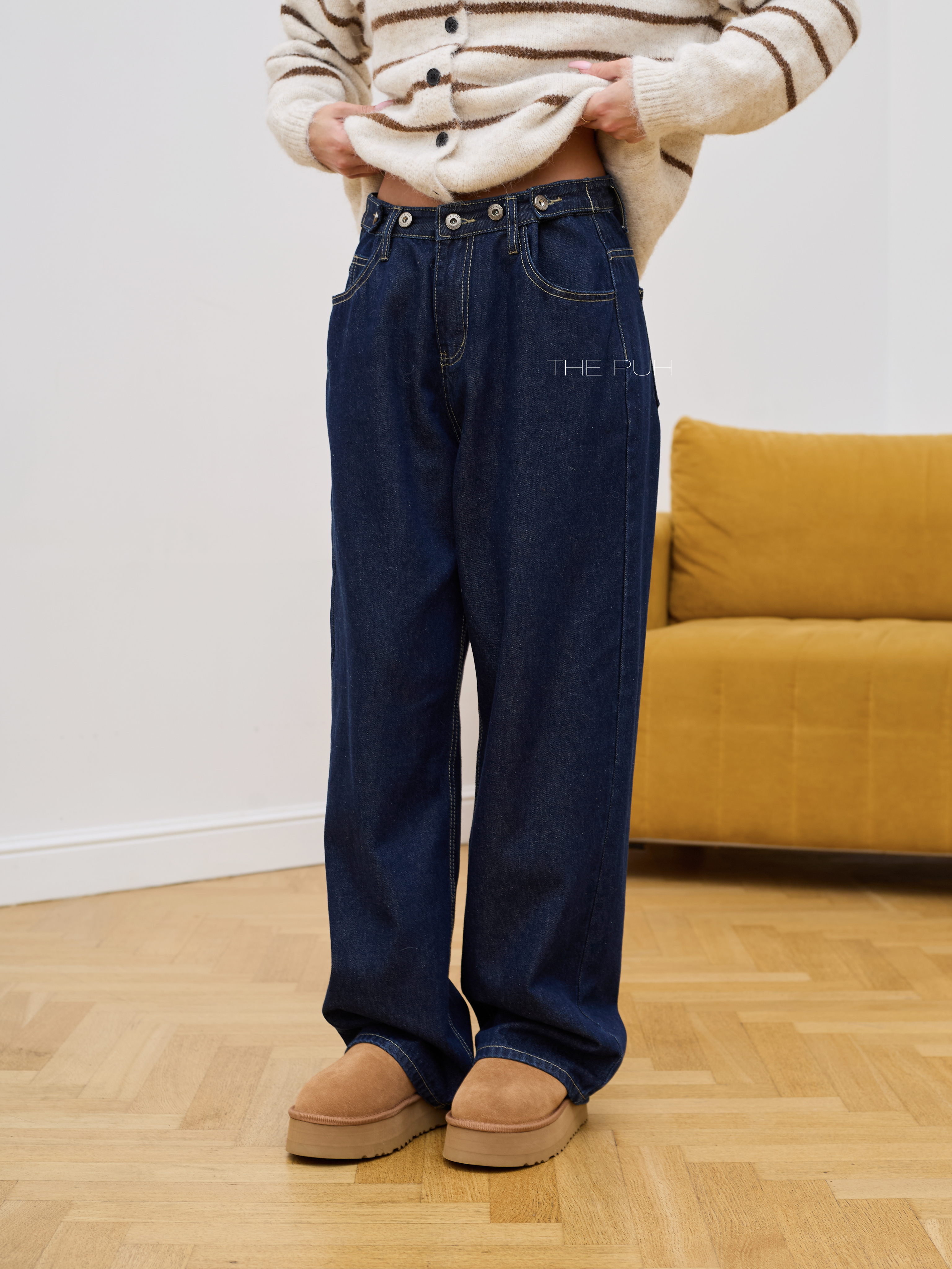 Широкие джинсы-трансформеры выполнены из темно-синего денима равномерного окраса без потертостей. Модель прямого кроя дополнена специальным регулятором на поясе, который позволяет менять обхват талии и посадку джинсов.