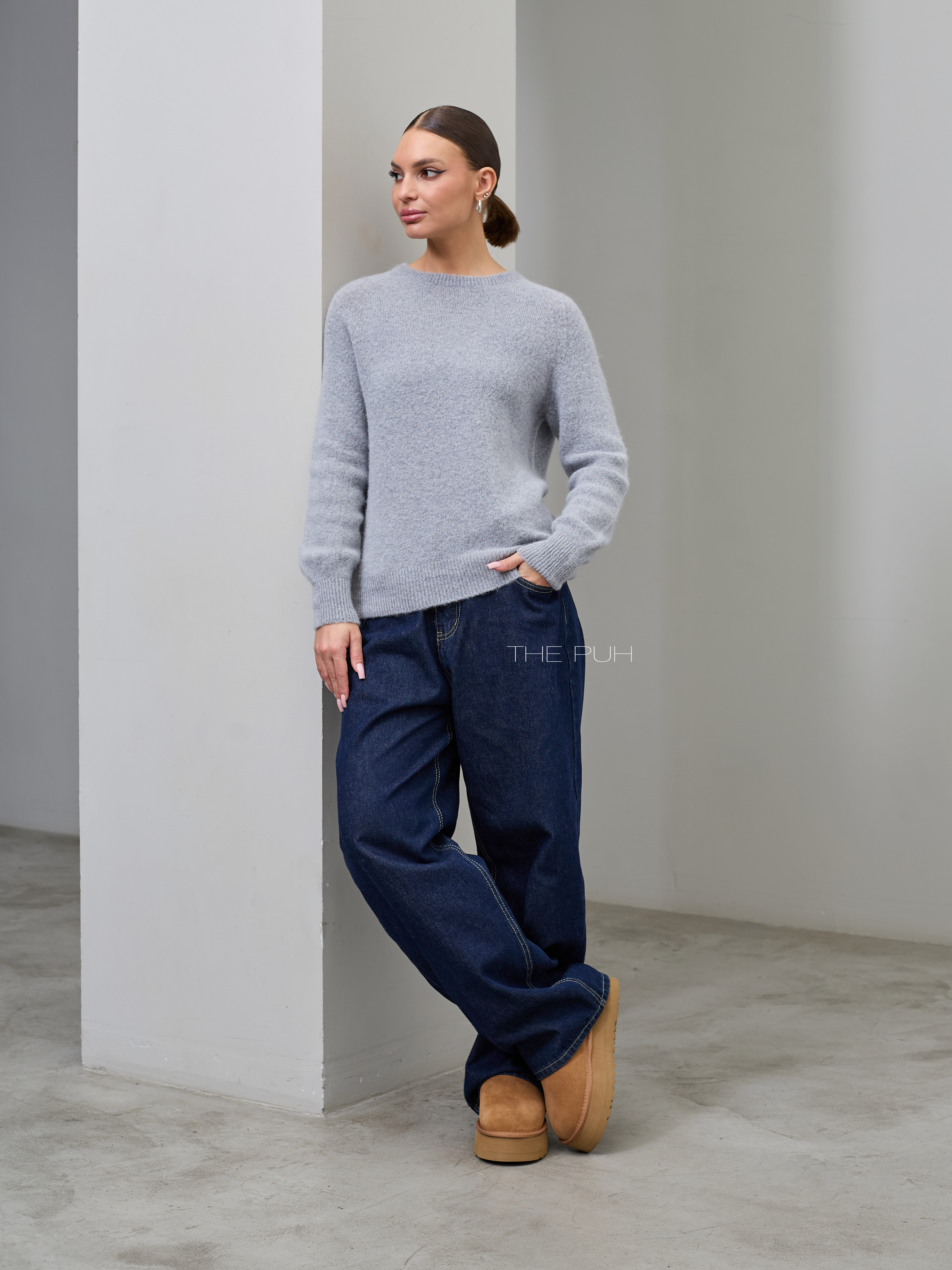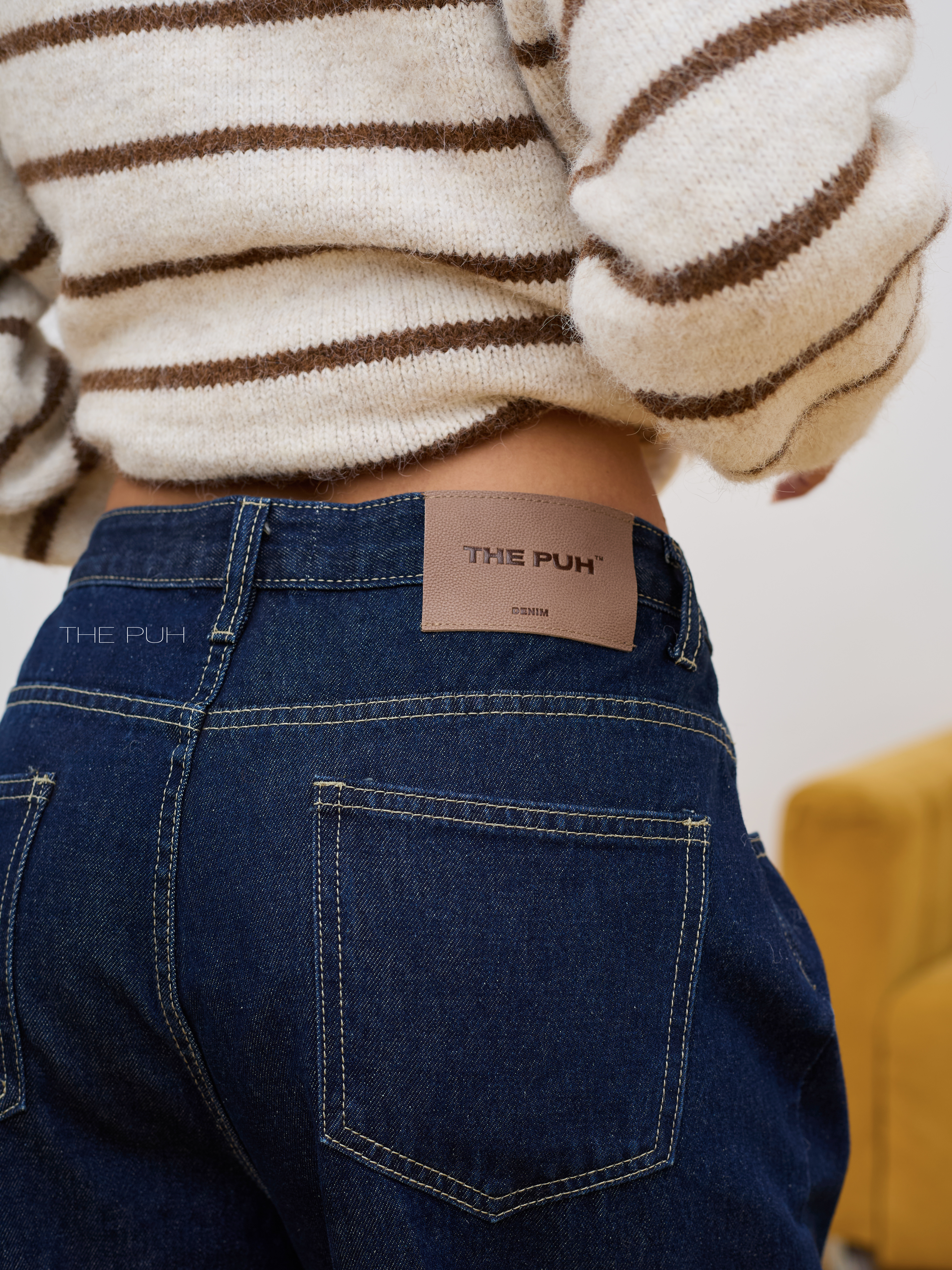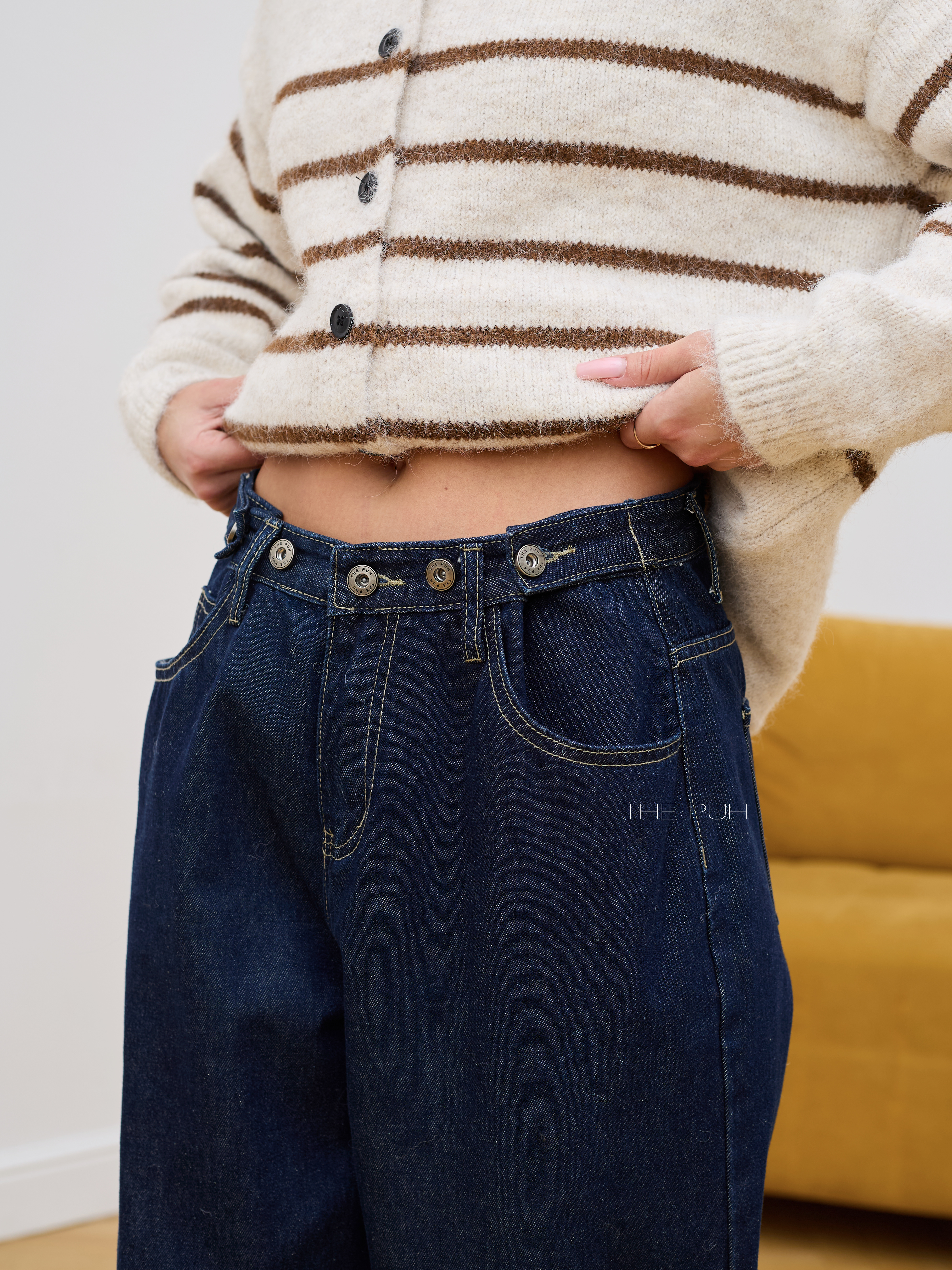 Широкие джинсы-трансформеры выполнены из темно-синего денима равномерного окраса без потертостей. Модель прямого кроя дополнена специальным регулятором на поясе, который позволяет менять обхват талии и посадку джинсов.