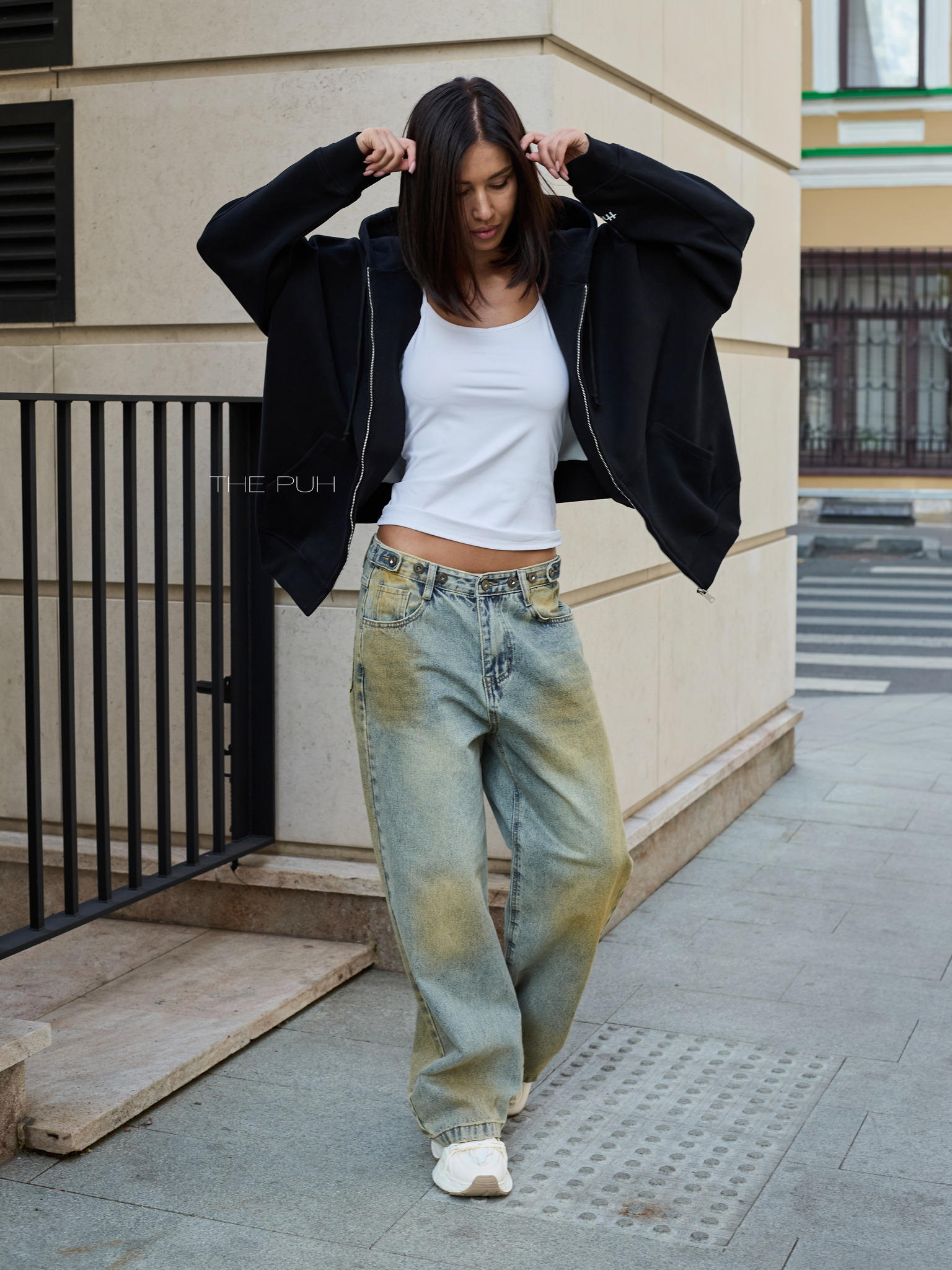 Детали худи: свободный крой, застежка в виде молнии, длинные рукава с манжетами на эластичной резинке, приспущенные плечи, затягивающийся на шнурки капюшон, два боковых кармана-кенгуру, деталь в виде вышивки логотипа на рукаве и спине.
