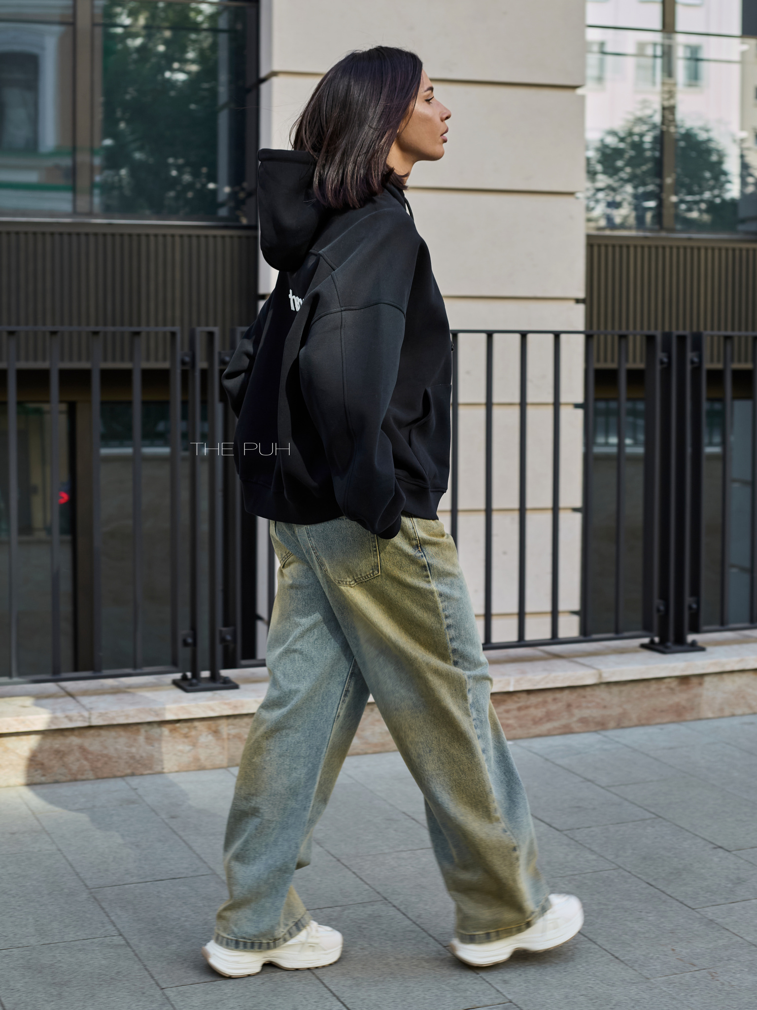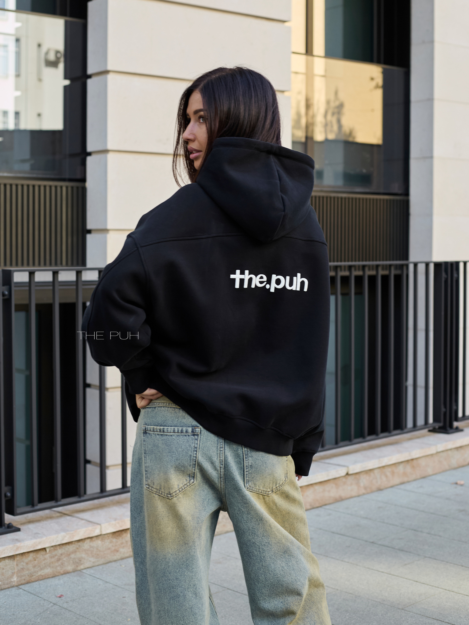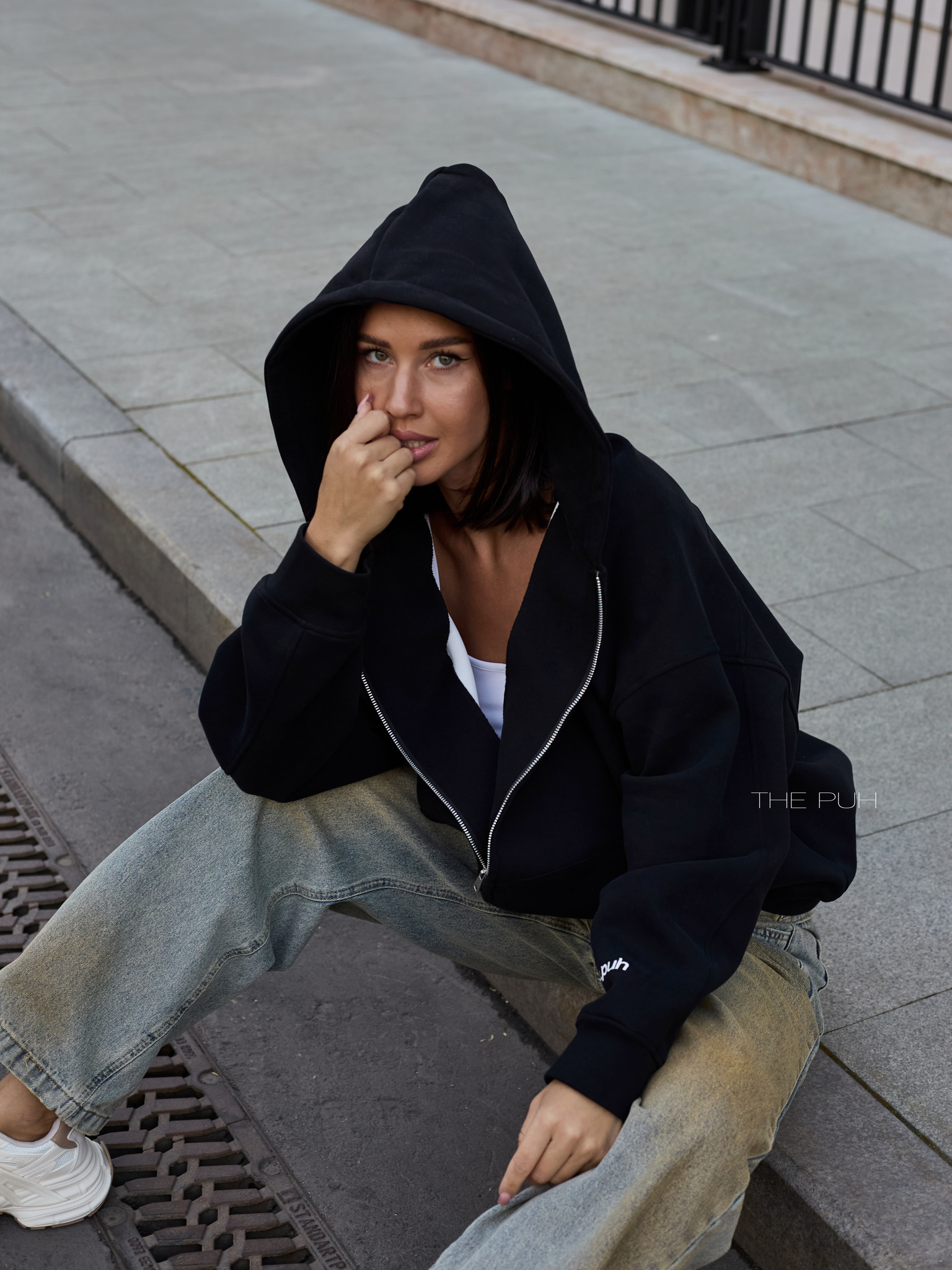 Черная худи с капюшоном из натурального хлопка. Материал с добавлением плотной ткани, которая сохраняет тепло и позволяет коже дышать.