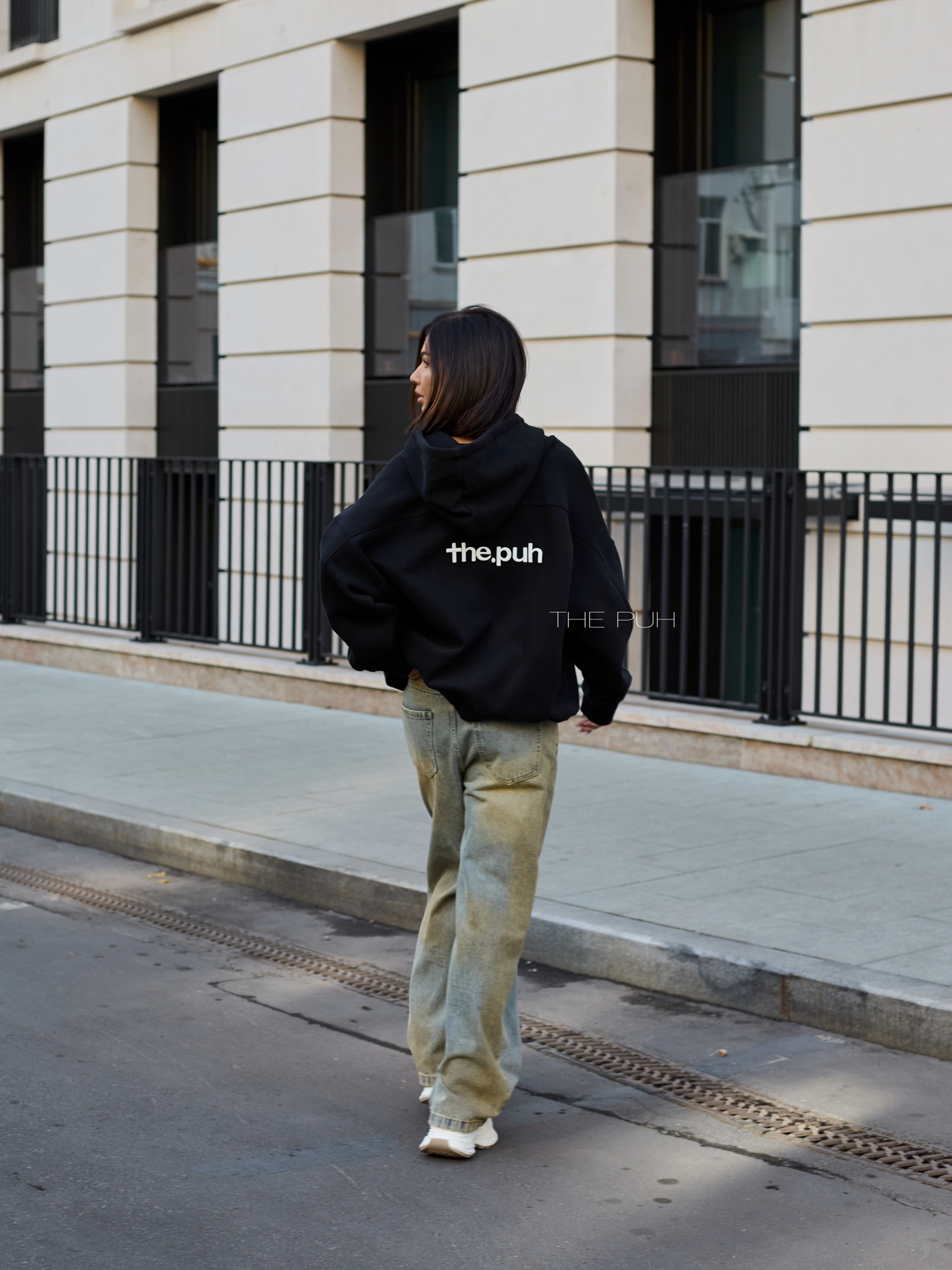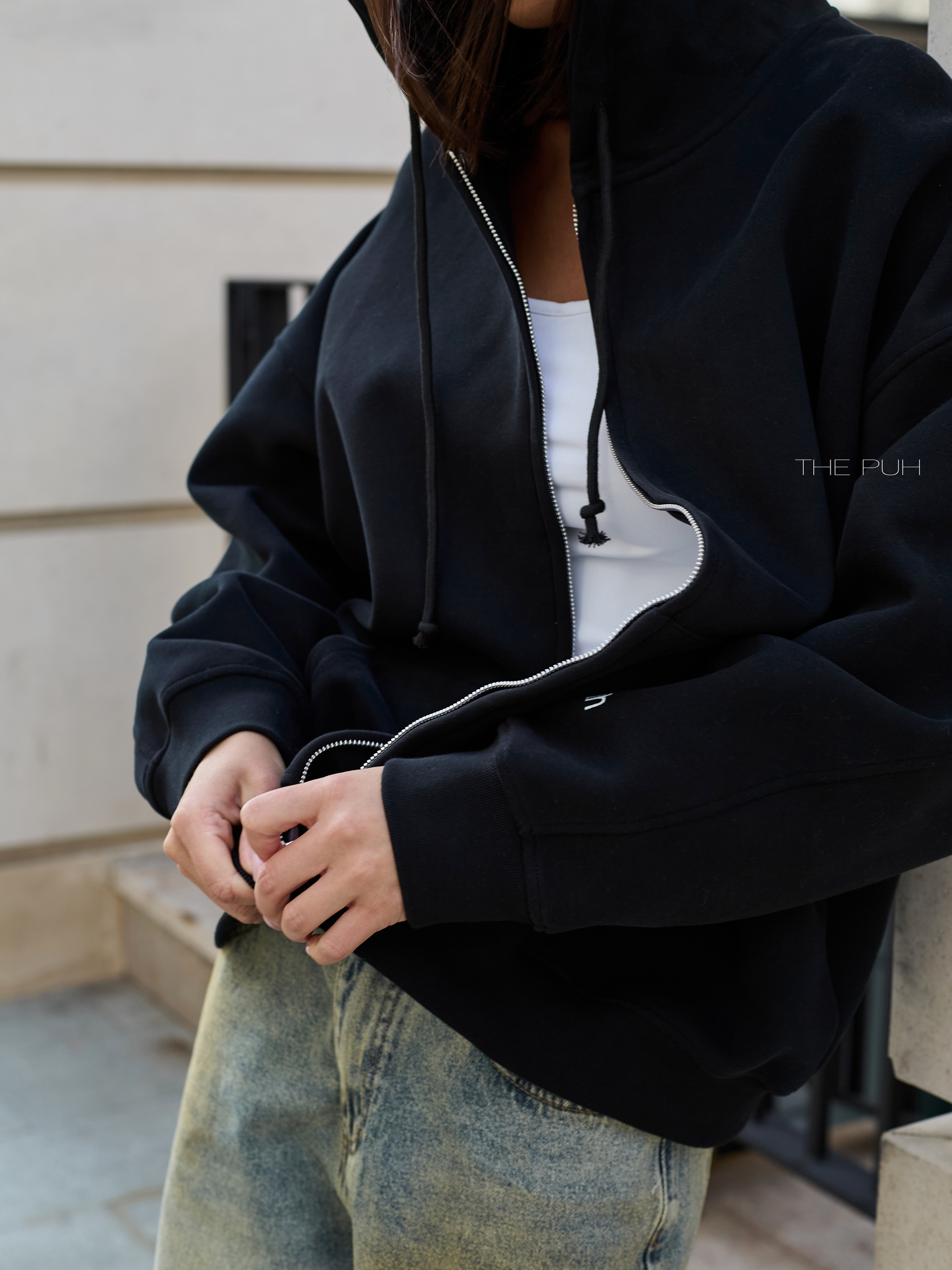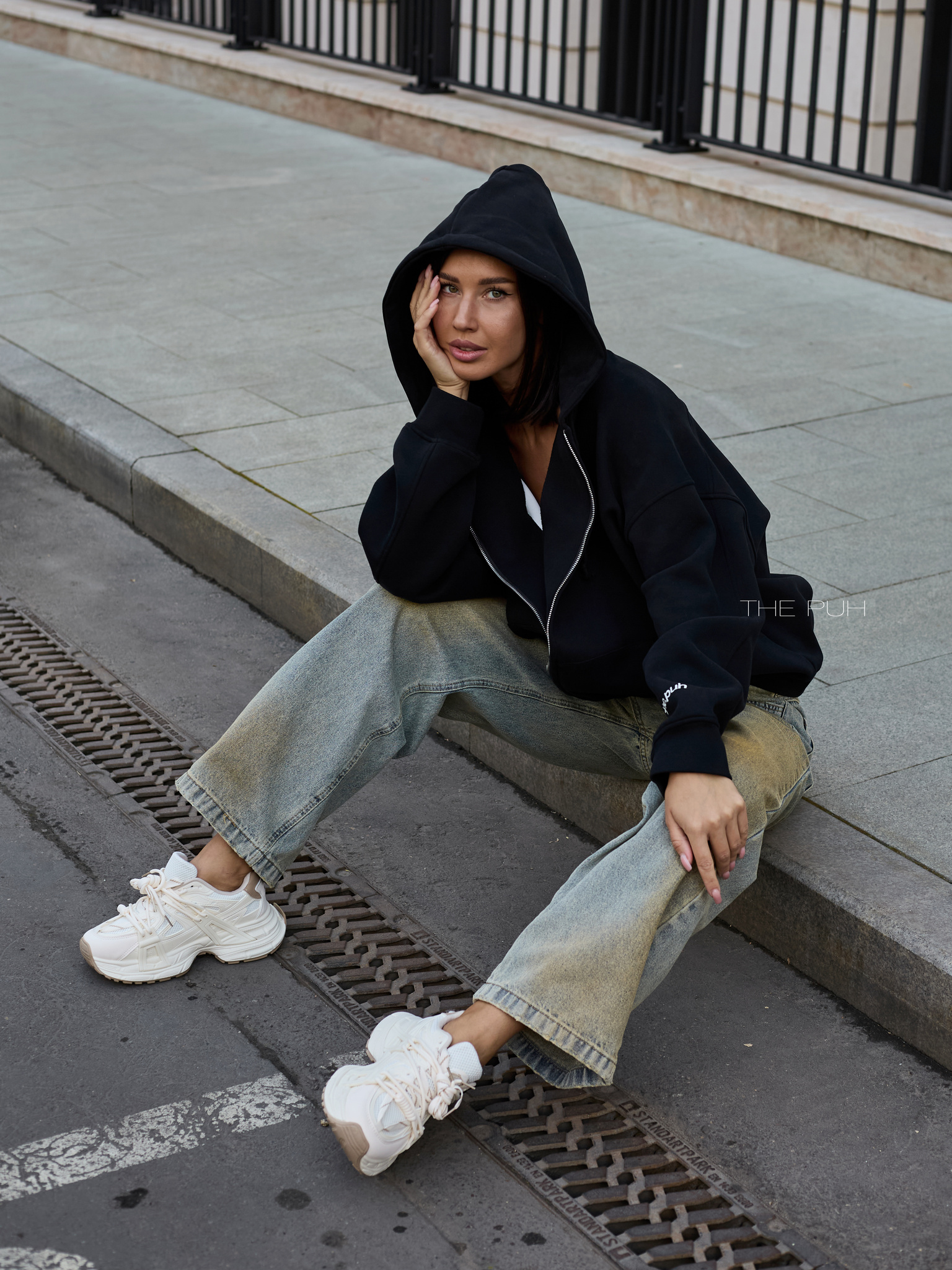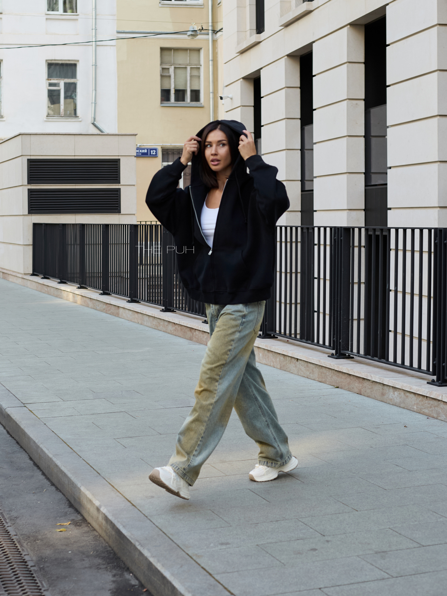 Черная худи с капюшоном из натурального хлопка. Материал с добавлением плотной ткани, которая сохраняет тепло и позволяет коже дышать.