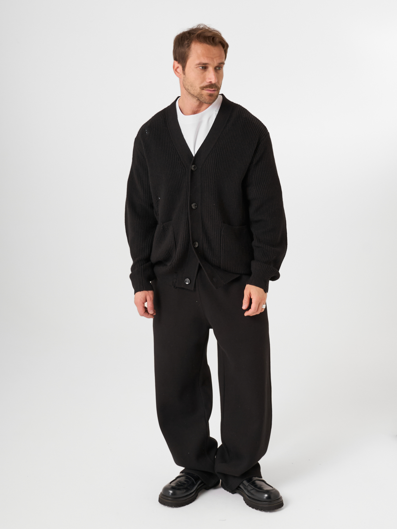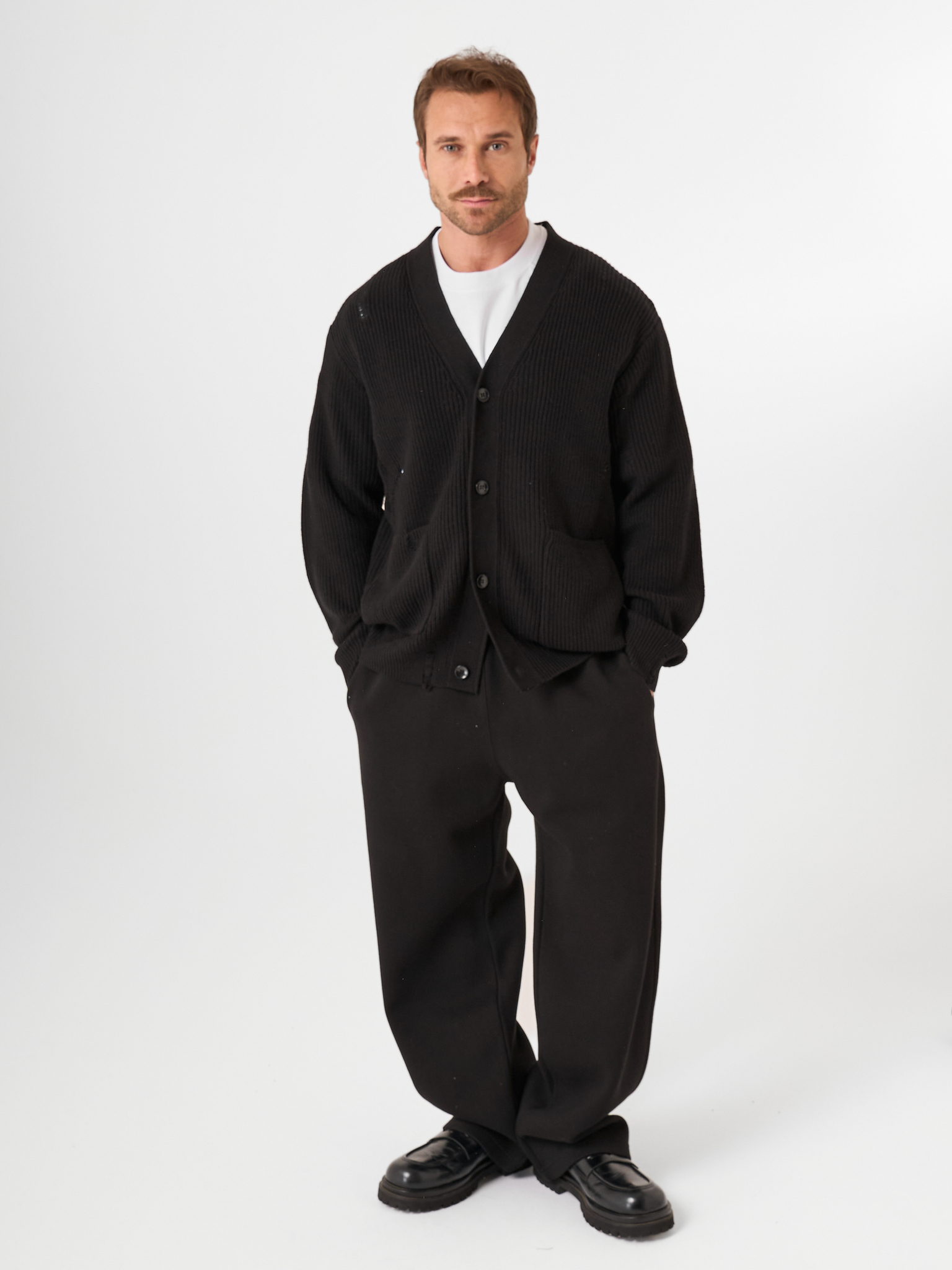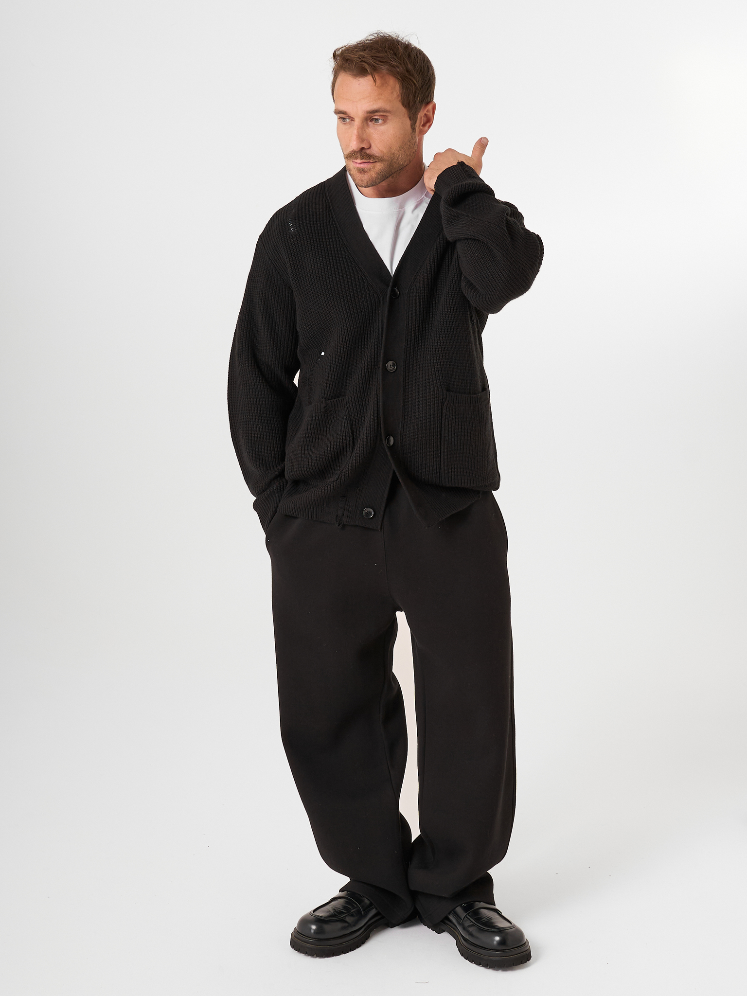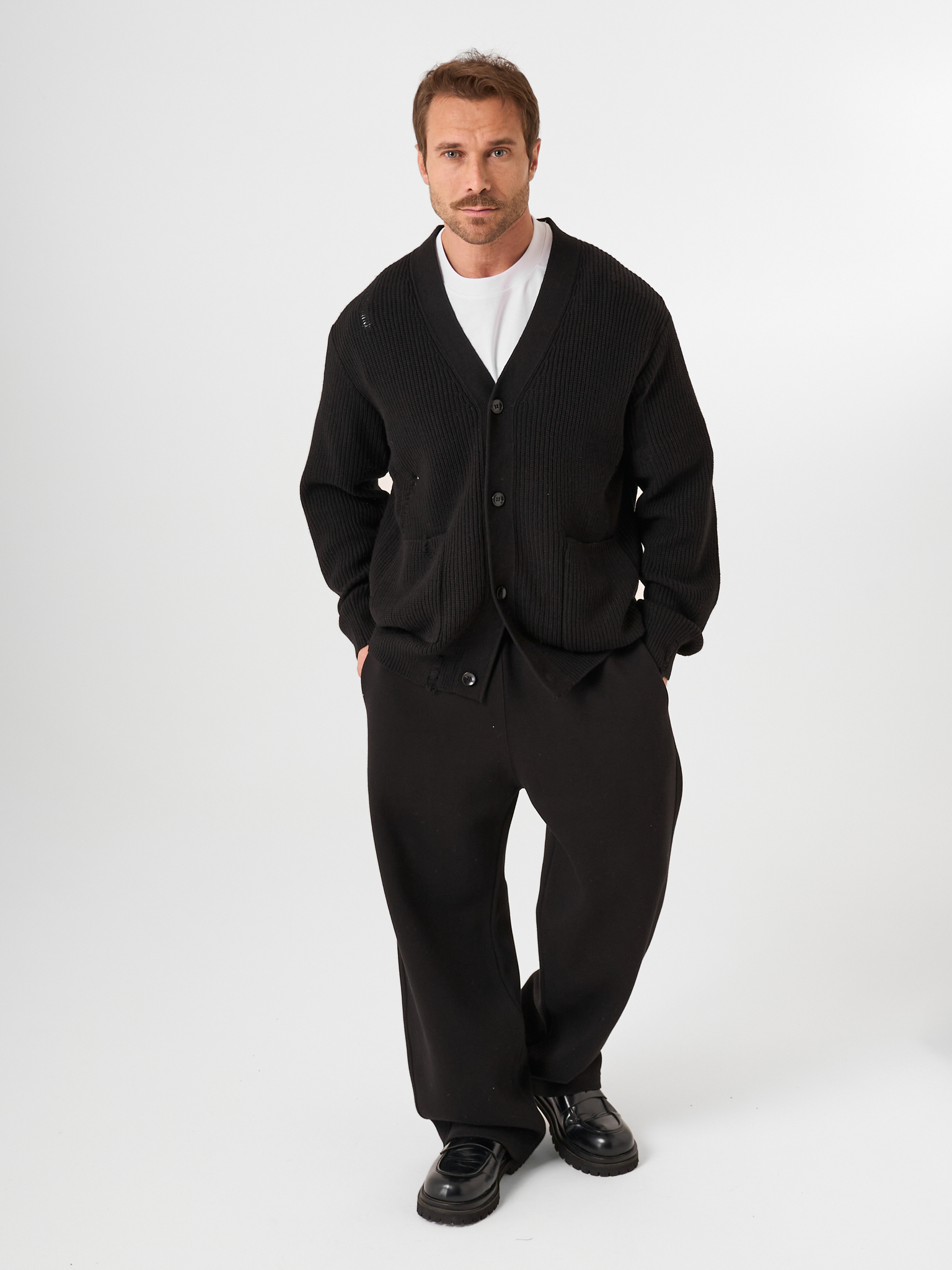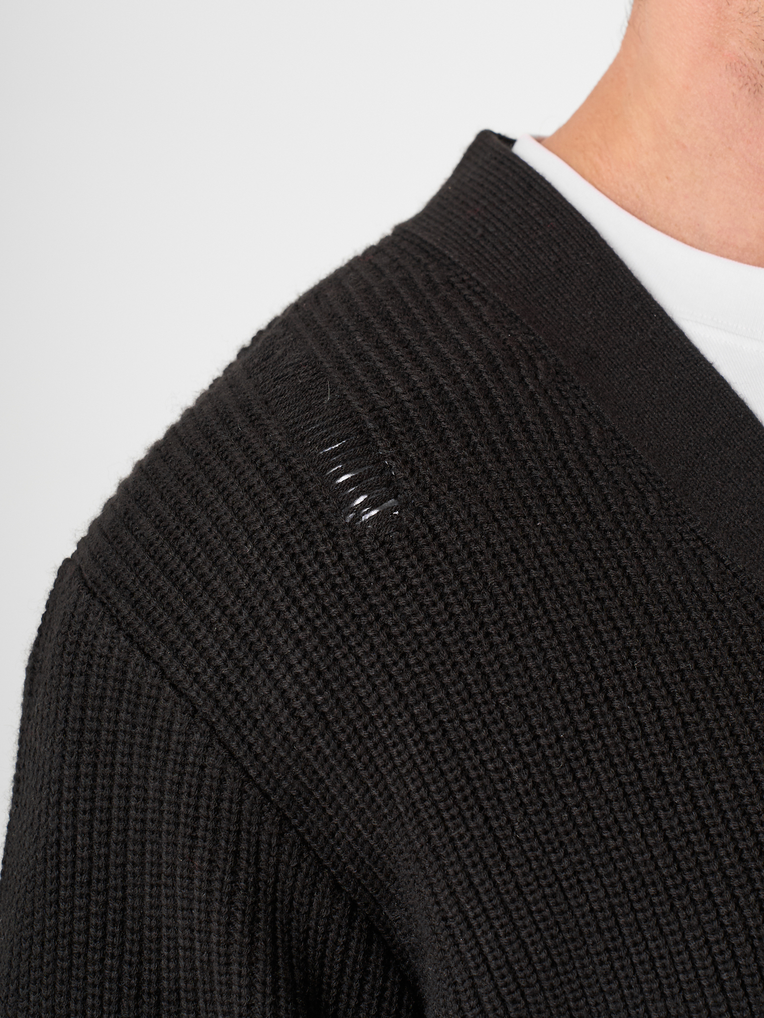 Черный кардиган в рубчик со спущенными петлями, которые образовывают разрывы в гранж-стилистике. Стилизуйте с контрастным низом чтобы подчеркнуть их.