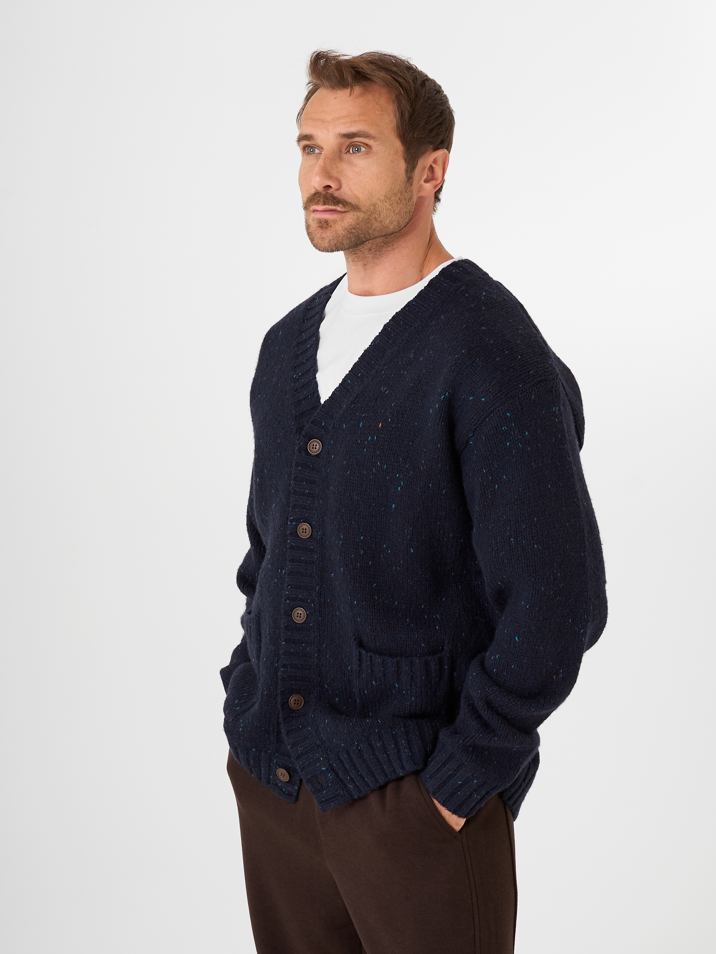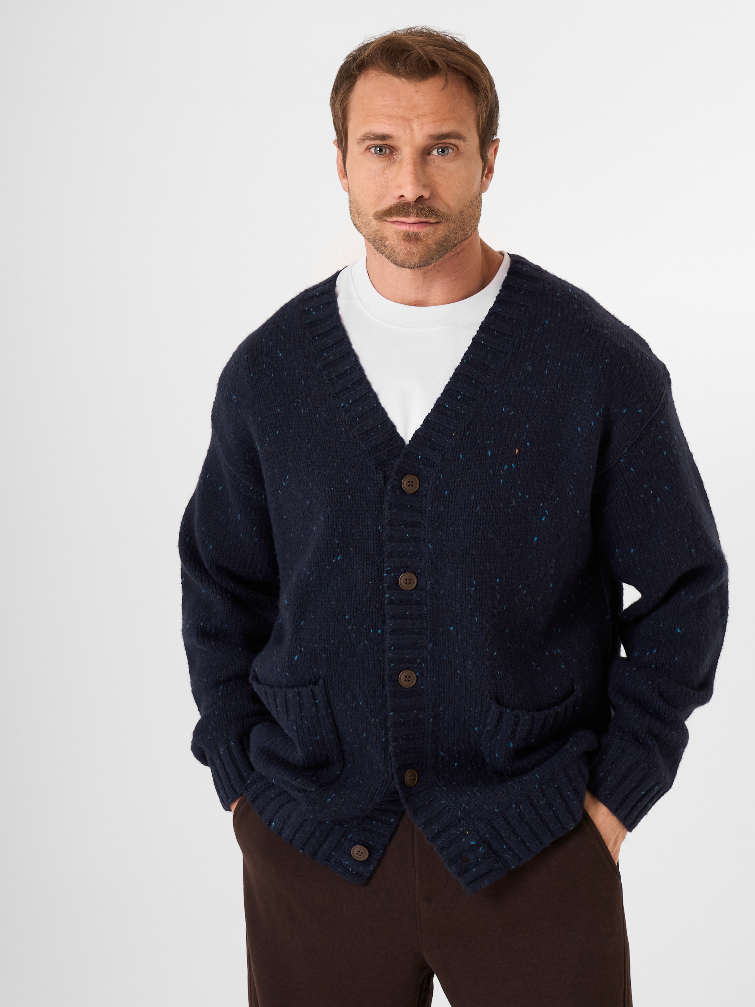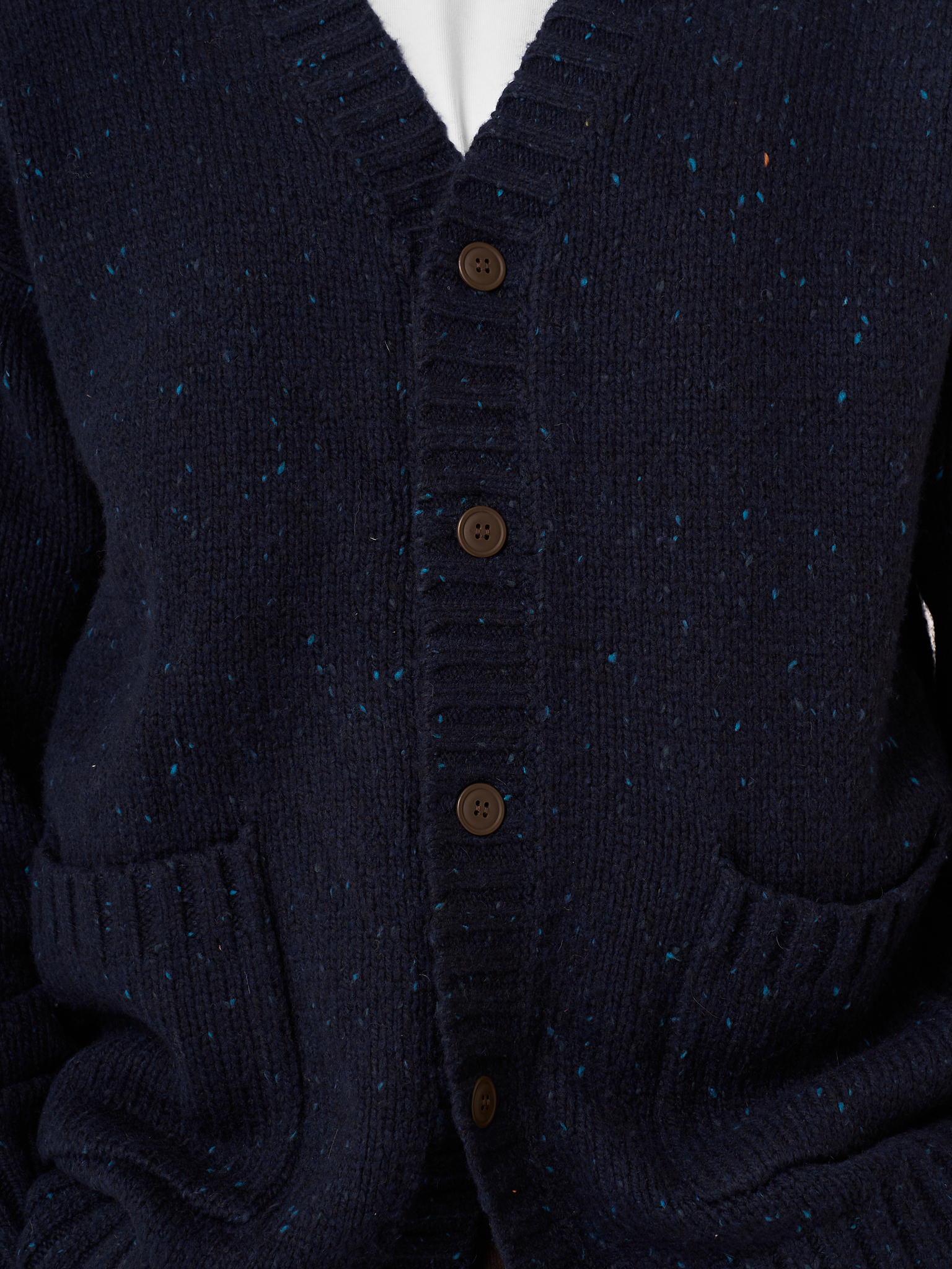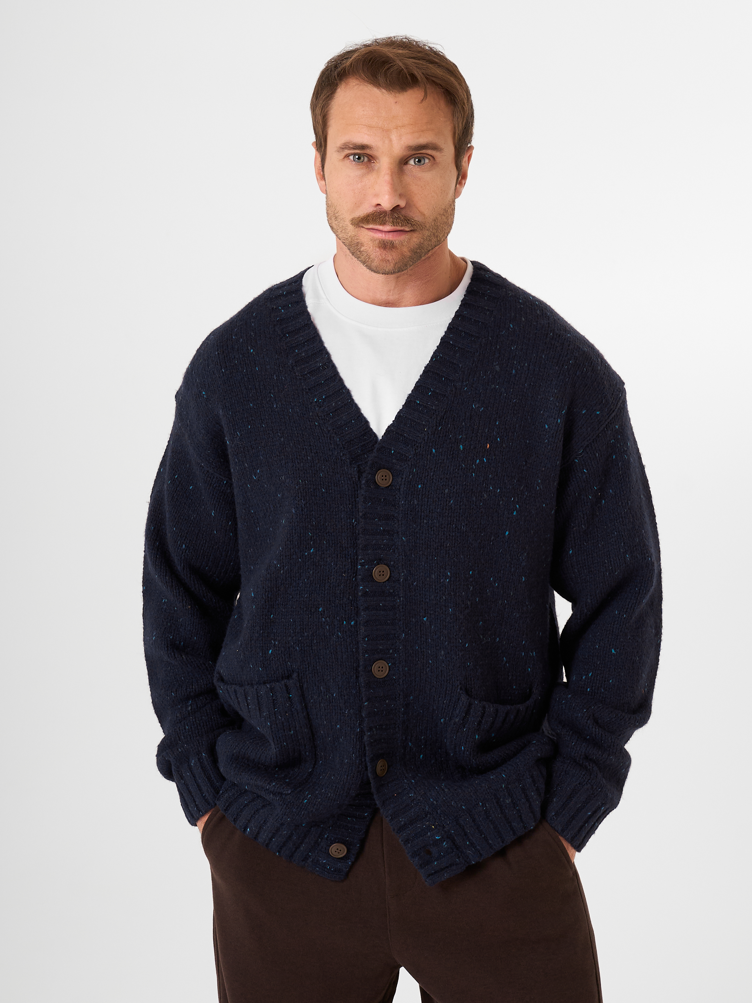 Синий шерстяной кардиган крупной вязки с голубыми вкраплениями в пряже. Незаменимая модель в любом осенне-зимнем гардеробе - идеально миксуется как с классическими образами под галстук, так и со стритвиром вроде треников и кроссовок.