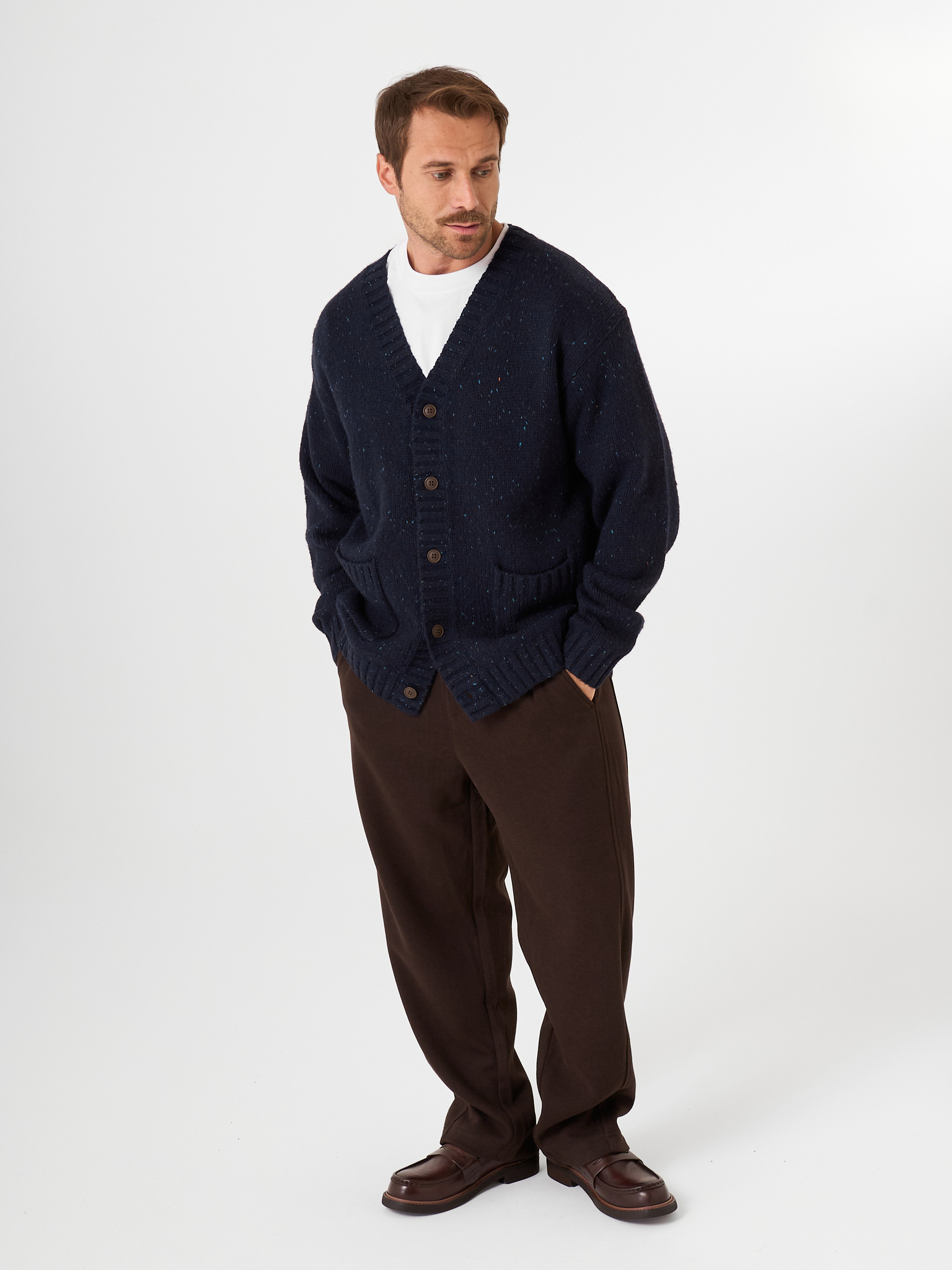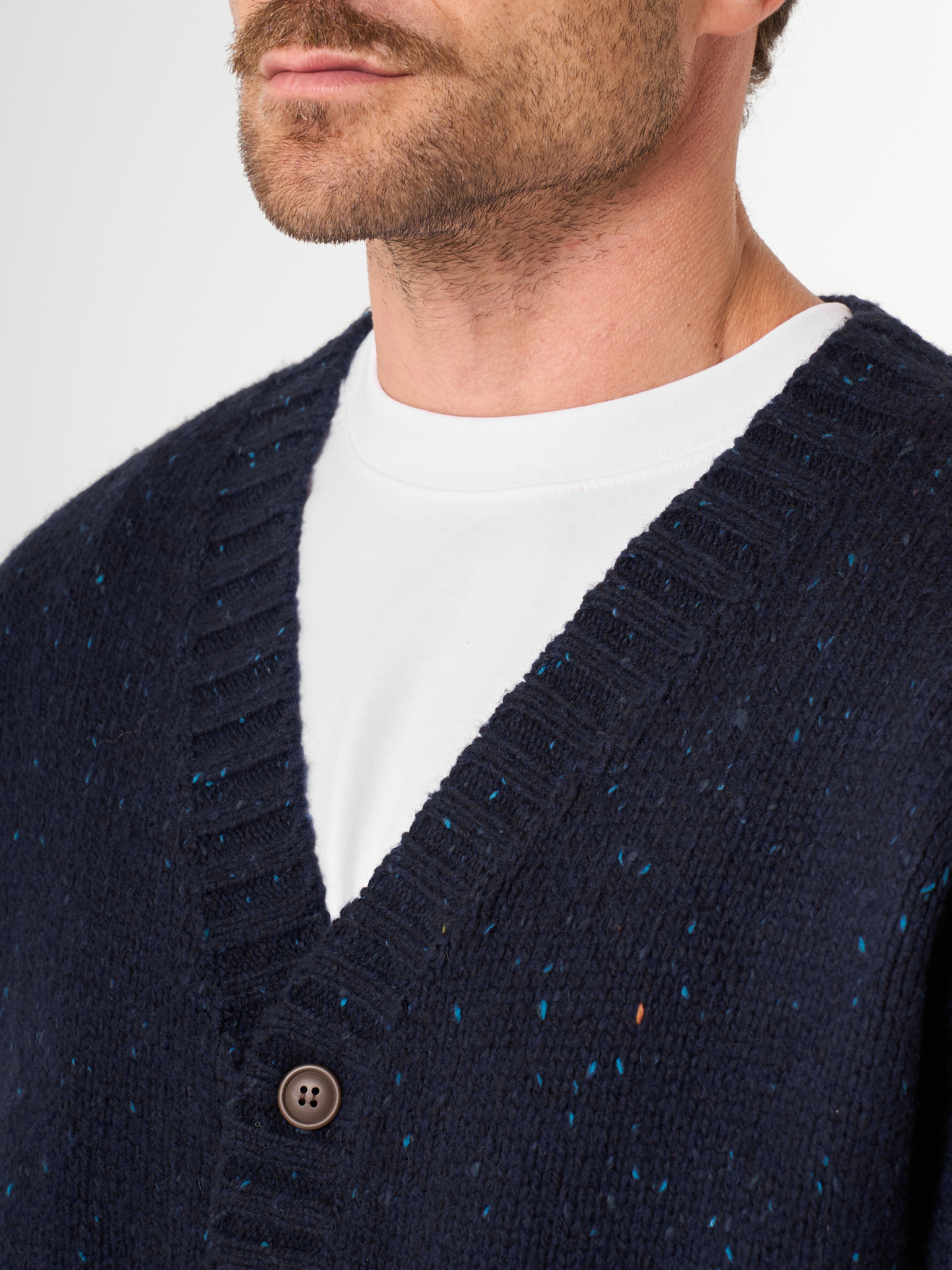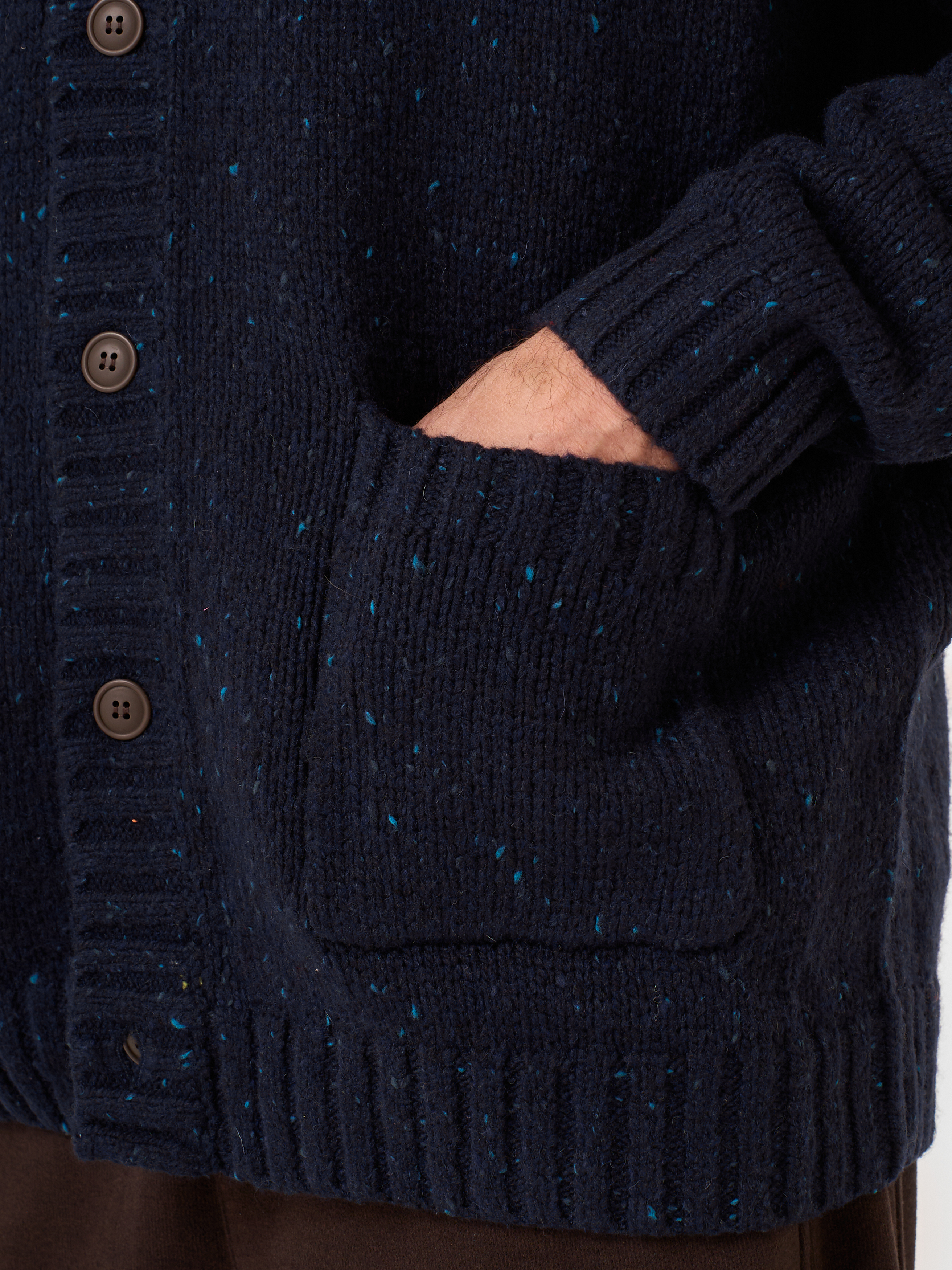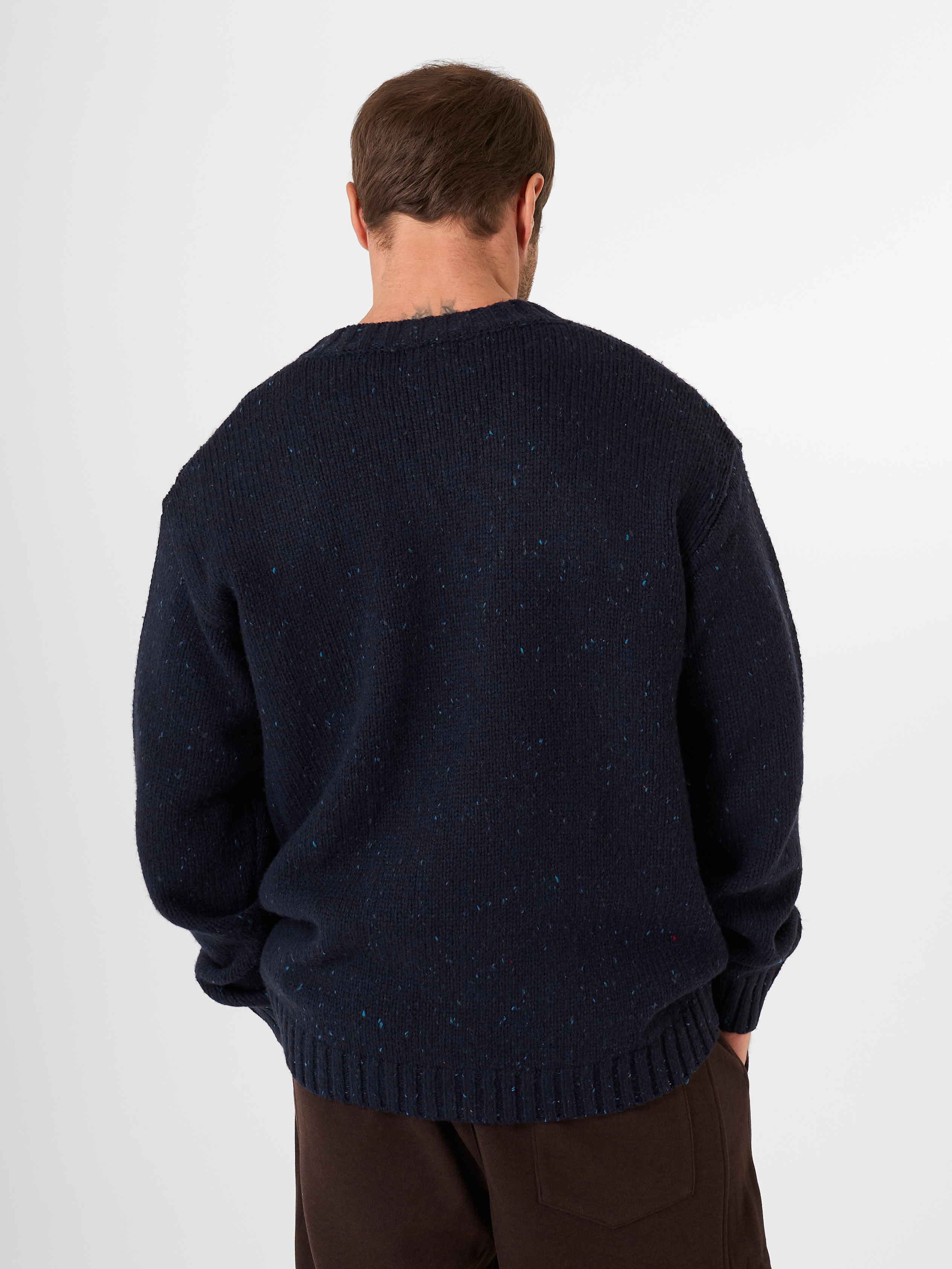 Синий шерстяной кардиган крупной вязки с голубыми вкраплениями в пряже. Незаменимая модель в любом осенне-зимнем гардеробе - идеально миксуется как с классическими образами под галстук, так и со стритвиром вроде треников и кроссовок.
