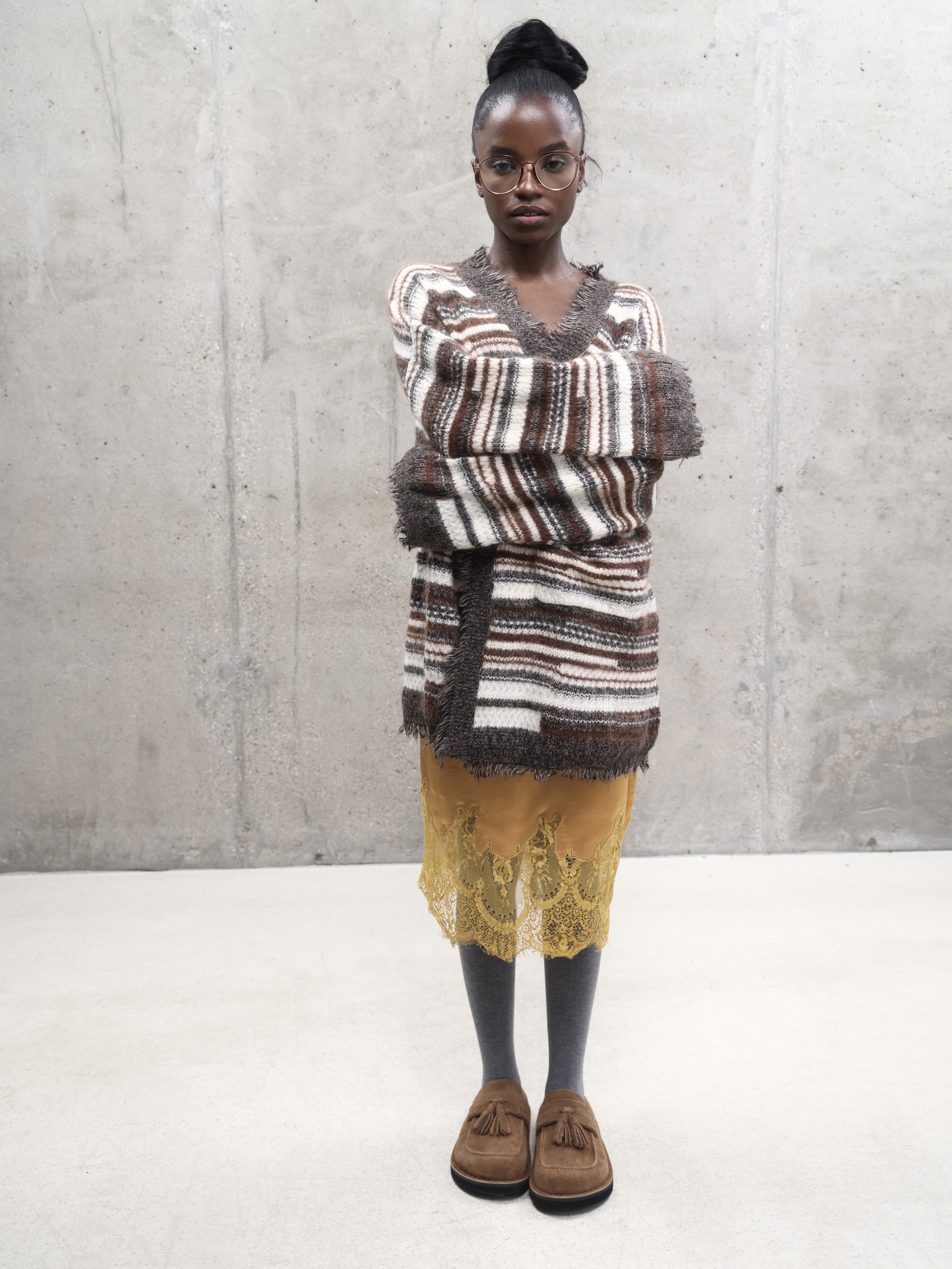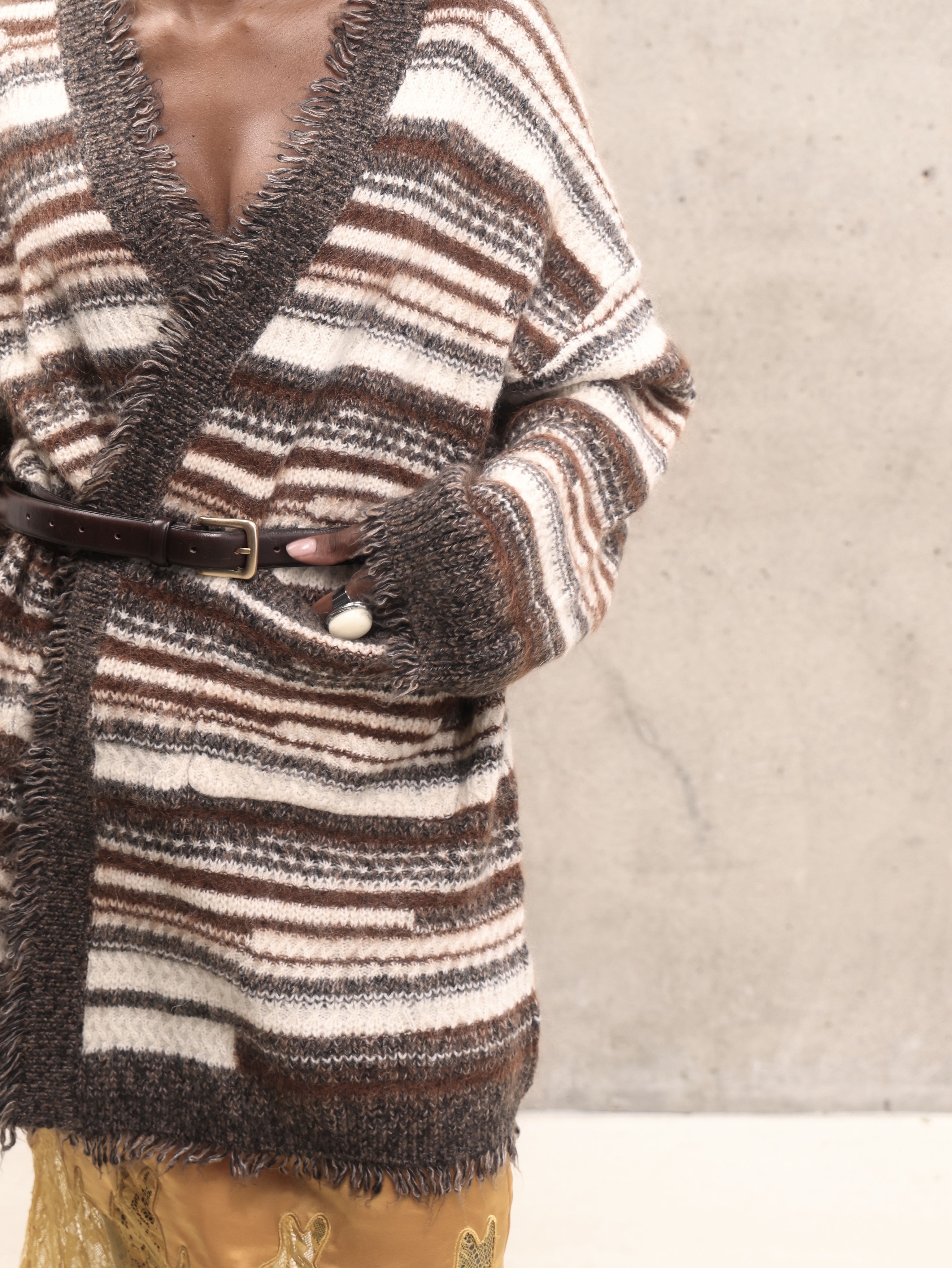 Удлиненный коричневый кардиган в полоску с необработанными краями. Идеально подходит как для повседневного образа, так и для официальных встреч. Эластичный трикотаж обеспечивает комфорт при носке, а удлиненный крой визуально вытягивает фигуру. Кардиган выполнен из высококачественного материала, который сохраняет форму и цвет после стирки. Необработанные края добавляют изделию оригинальности и особого шарма. Подходит для холодного времени года, поможет создать стильные аутфиты и сохранить тепло.
