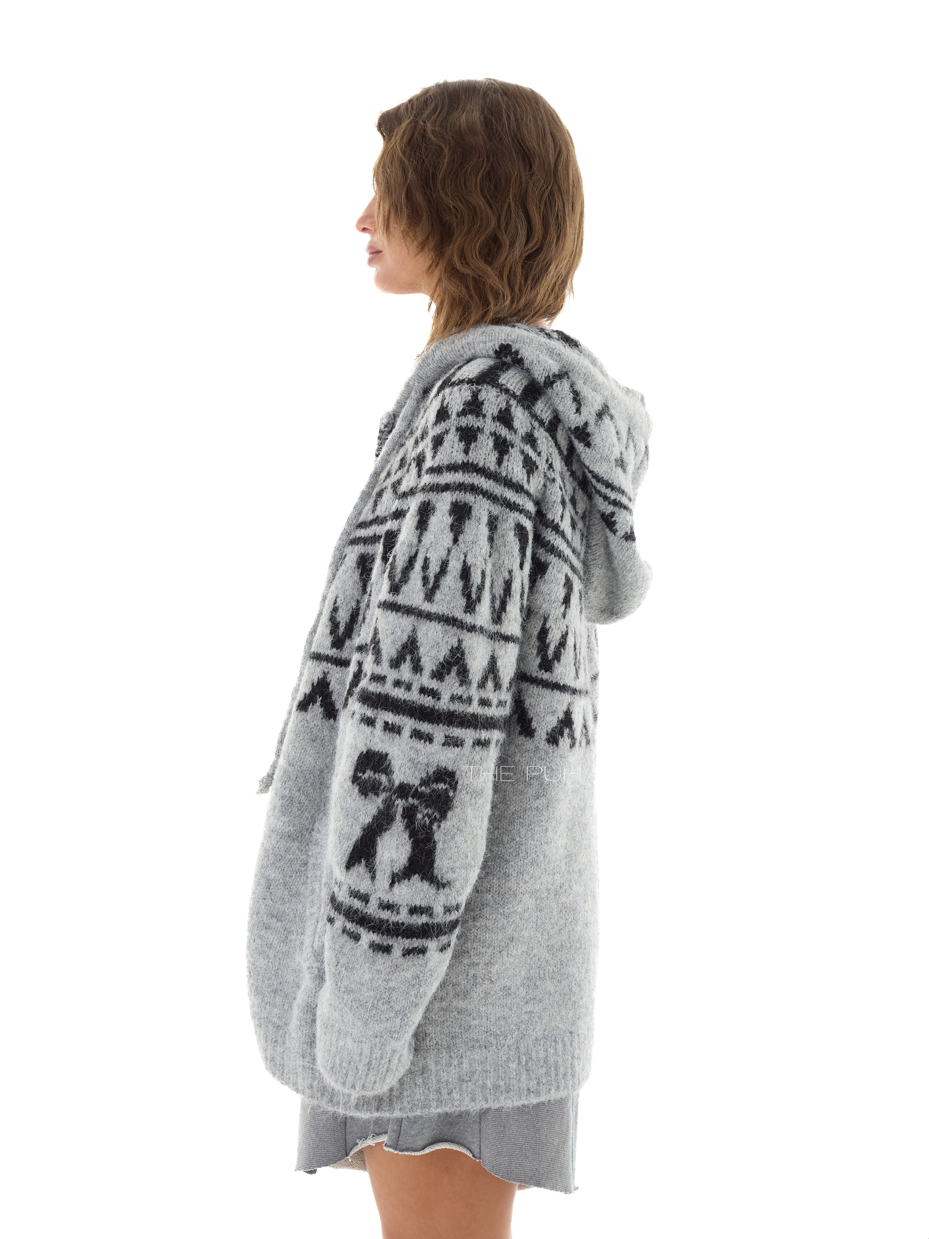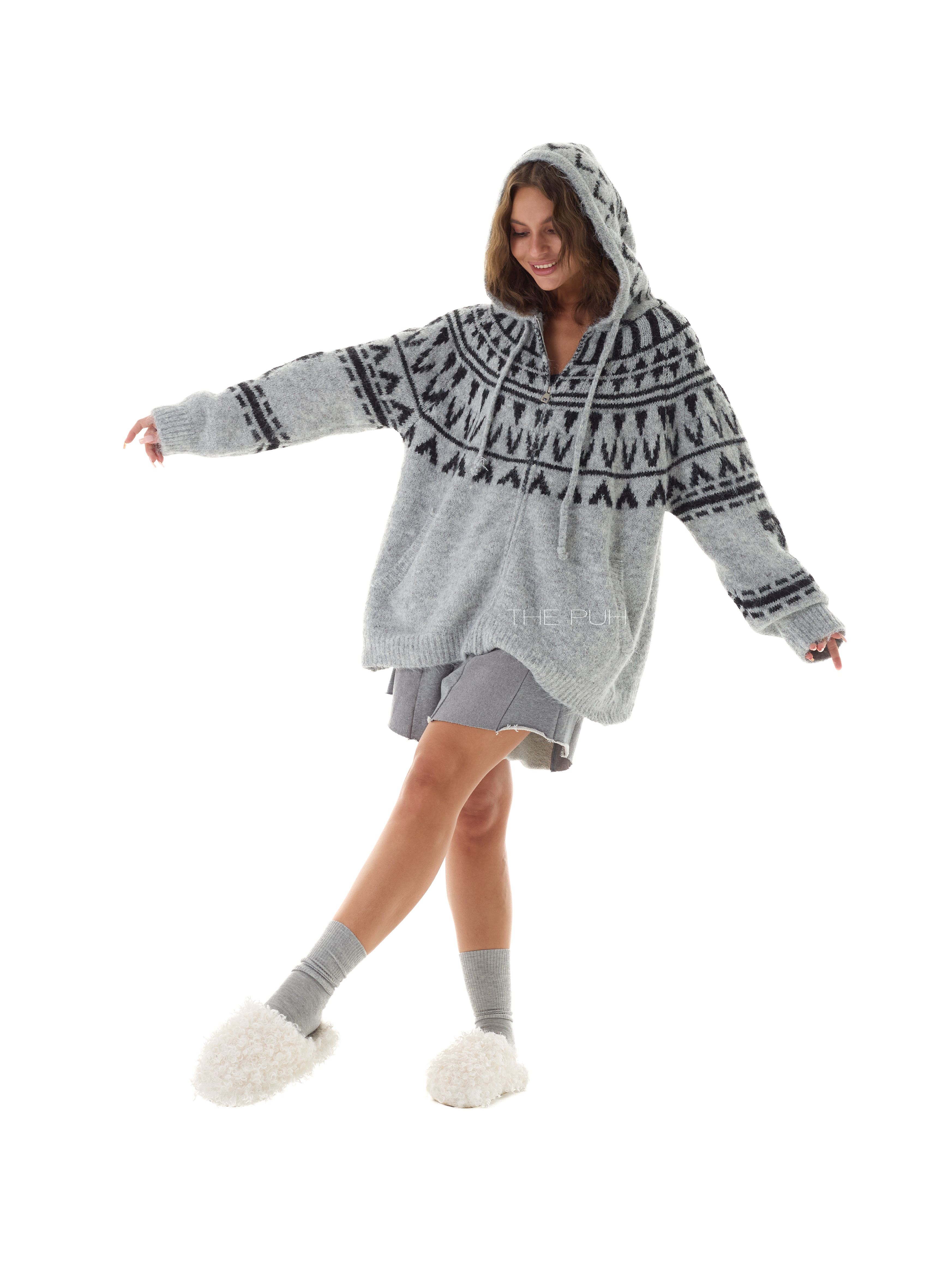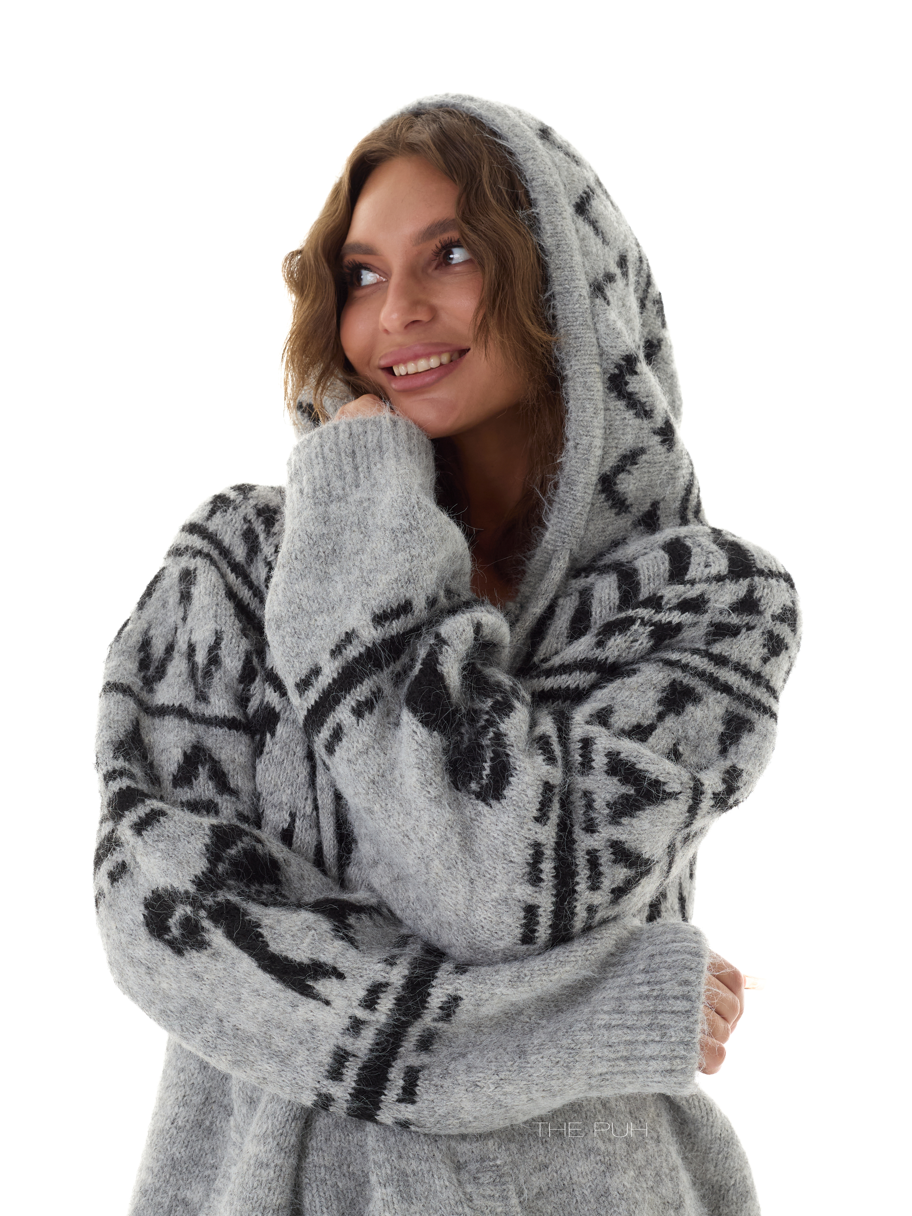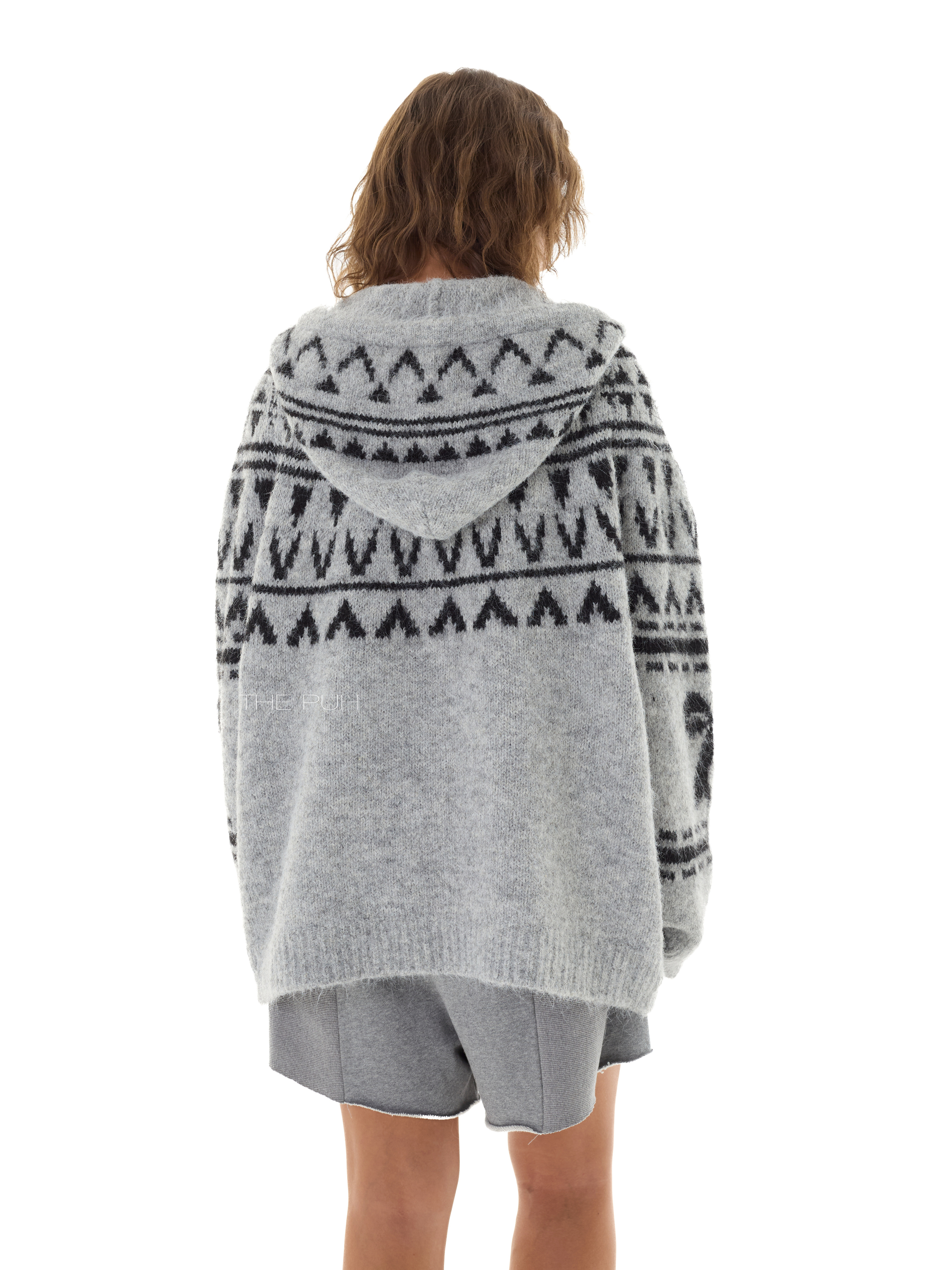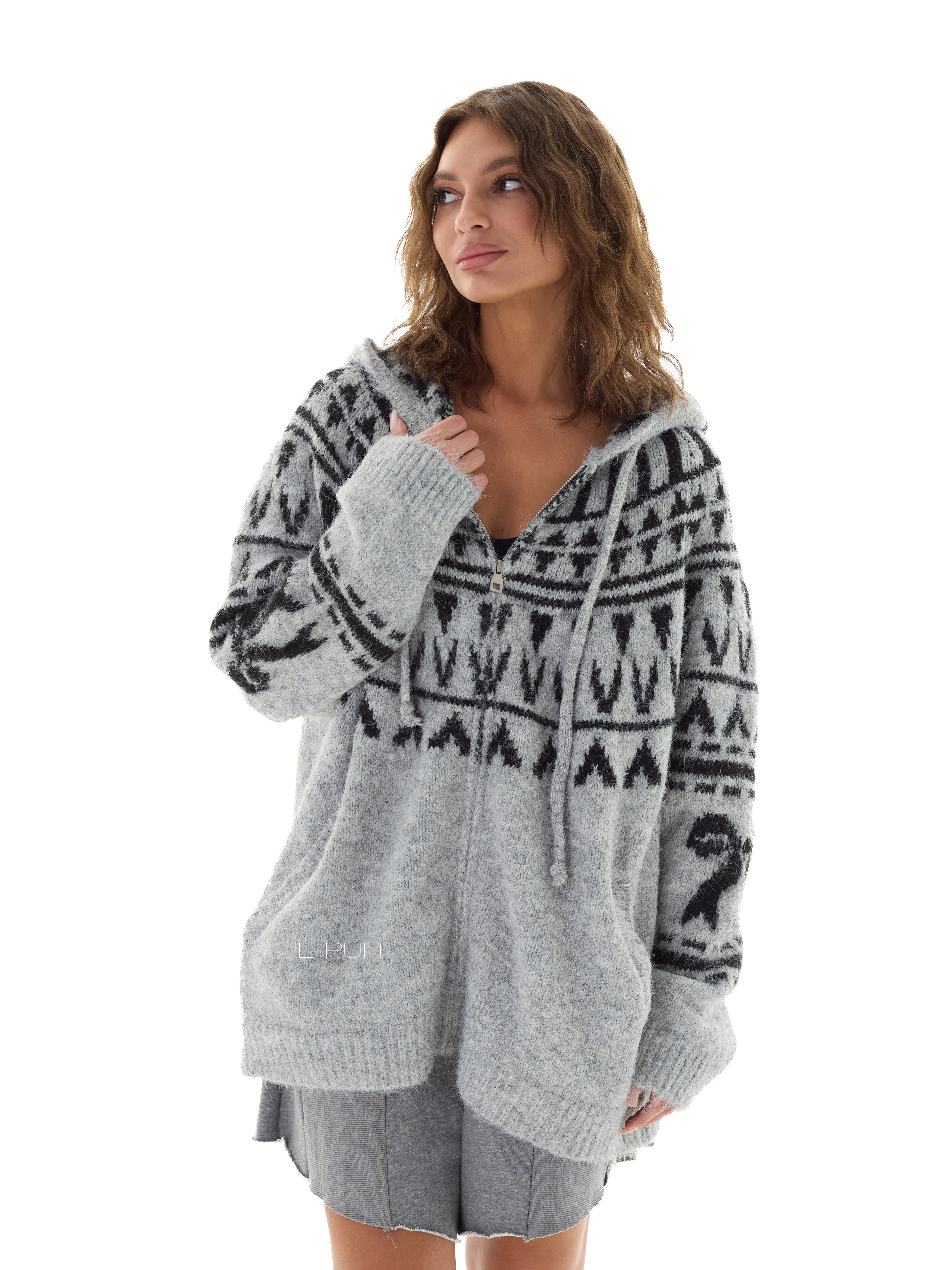 Серый свитер на молнии с капюшоном. Модель выполнена из смесовой шерсти с добавлением альпаки и украшена контрастным узором, выполненным в технике "интарсия".