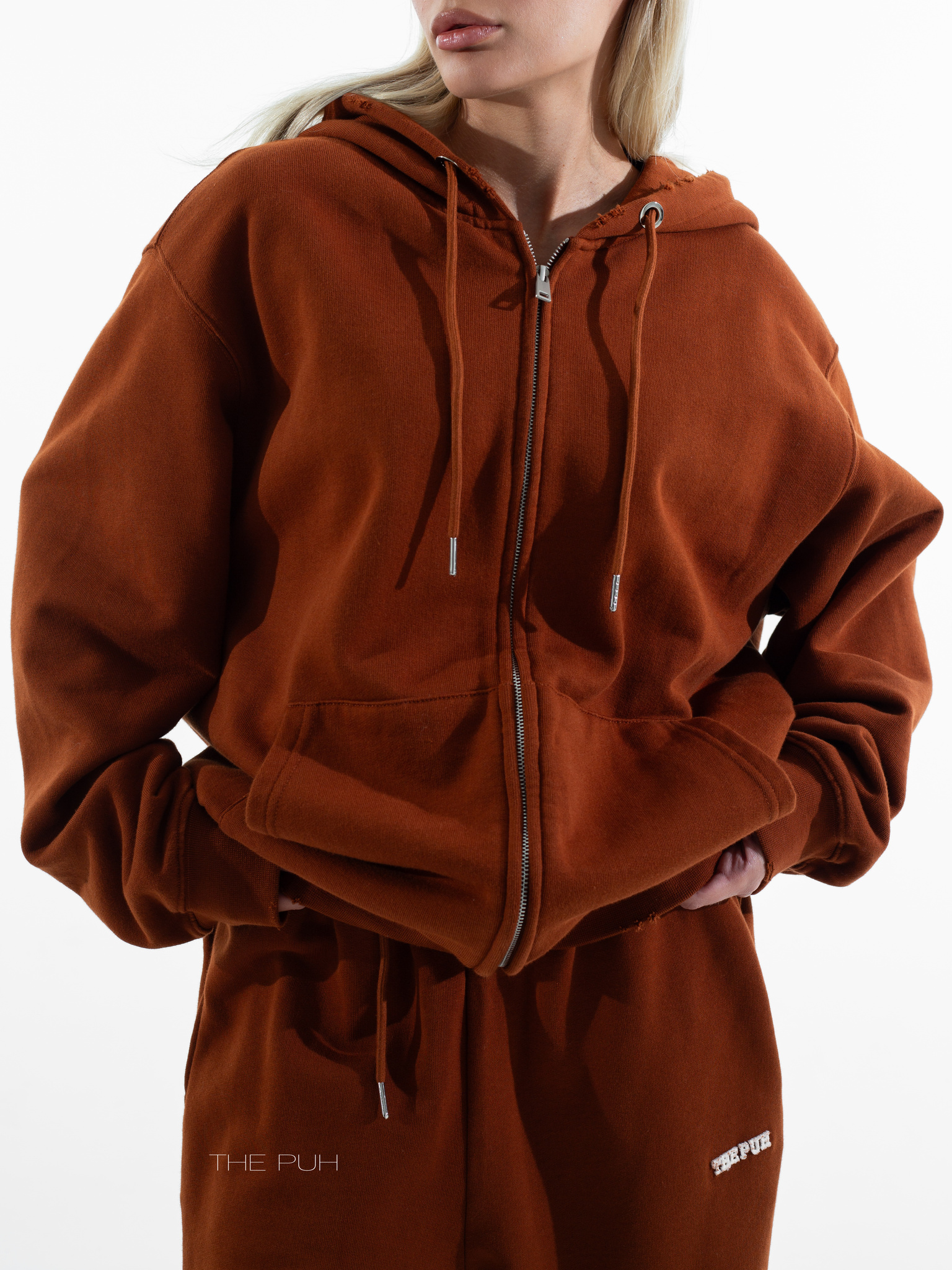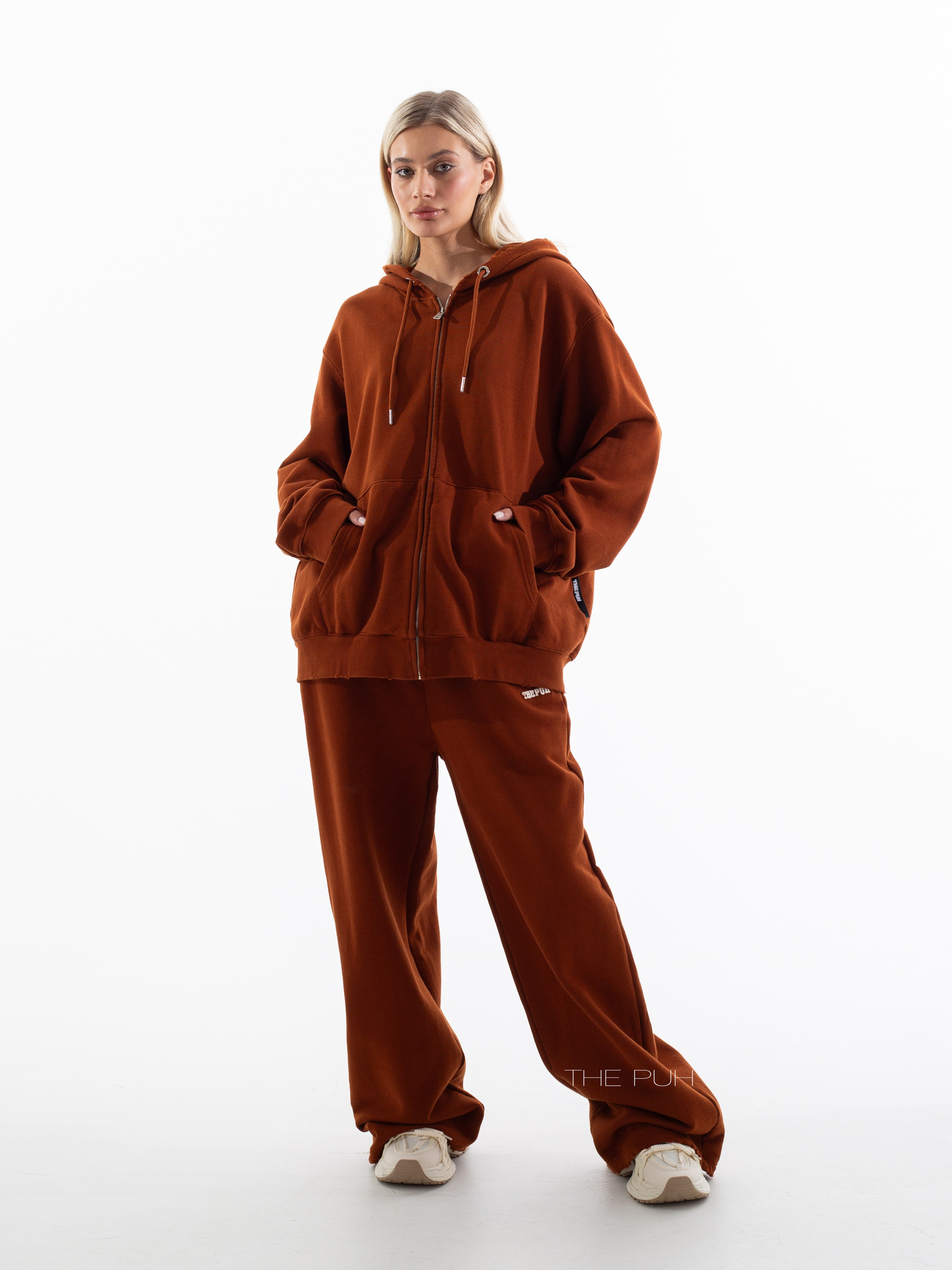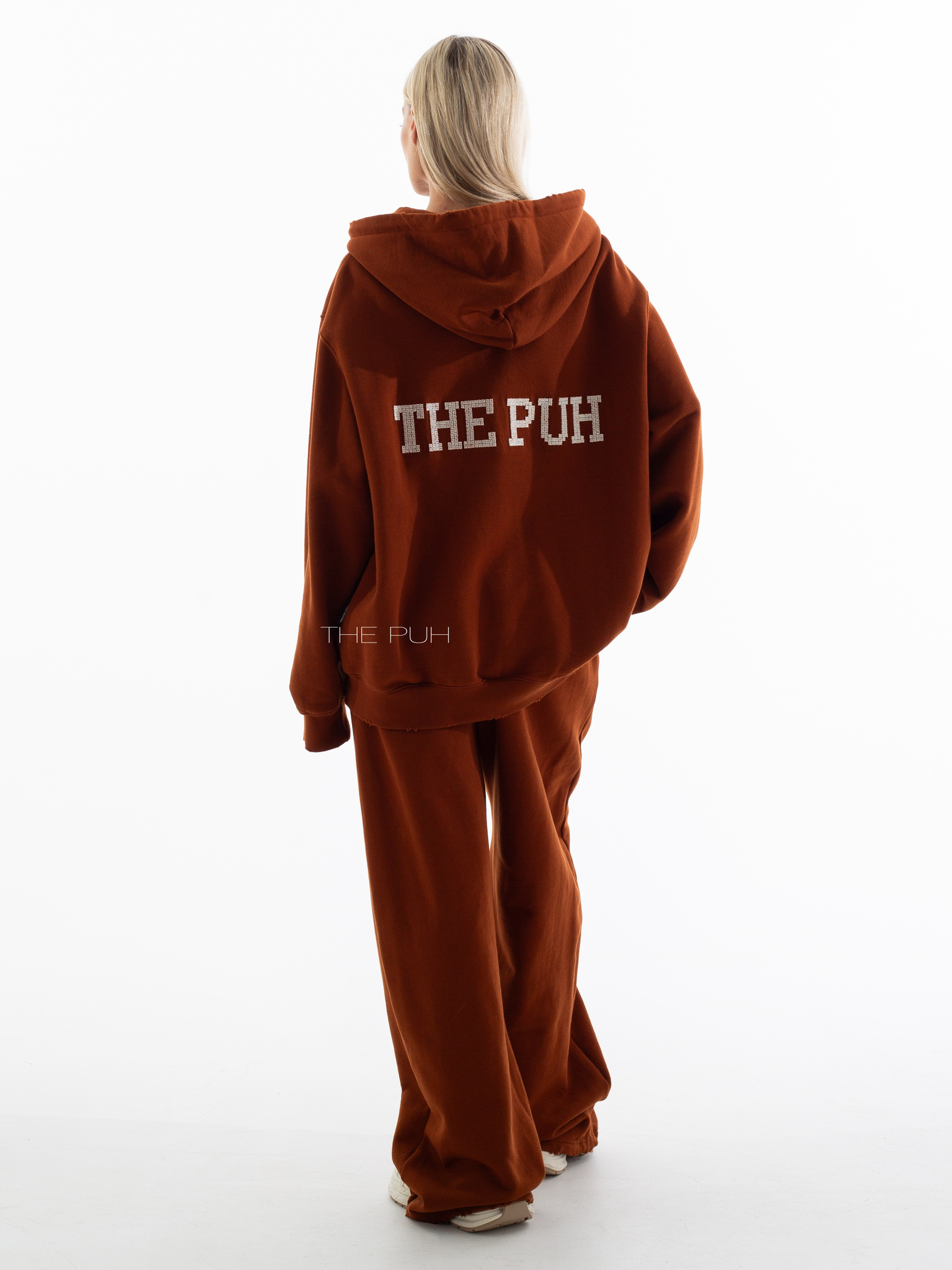 Хлопковый костюм в кирпичном цвете состоит из свободной худи на молнии и широких прямых брюк на кулиске. Модель оверсайз и дополнена контрастными логотипами, которые выполнены в технике "флок" - объемная бархатная печать.
