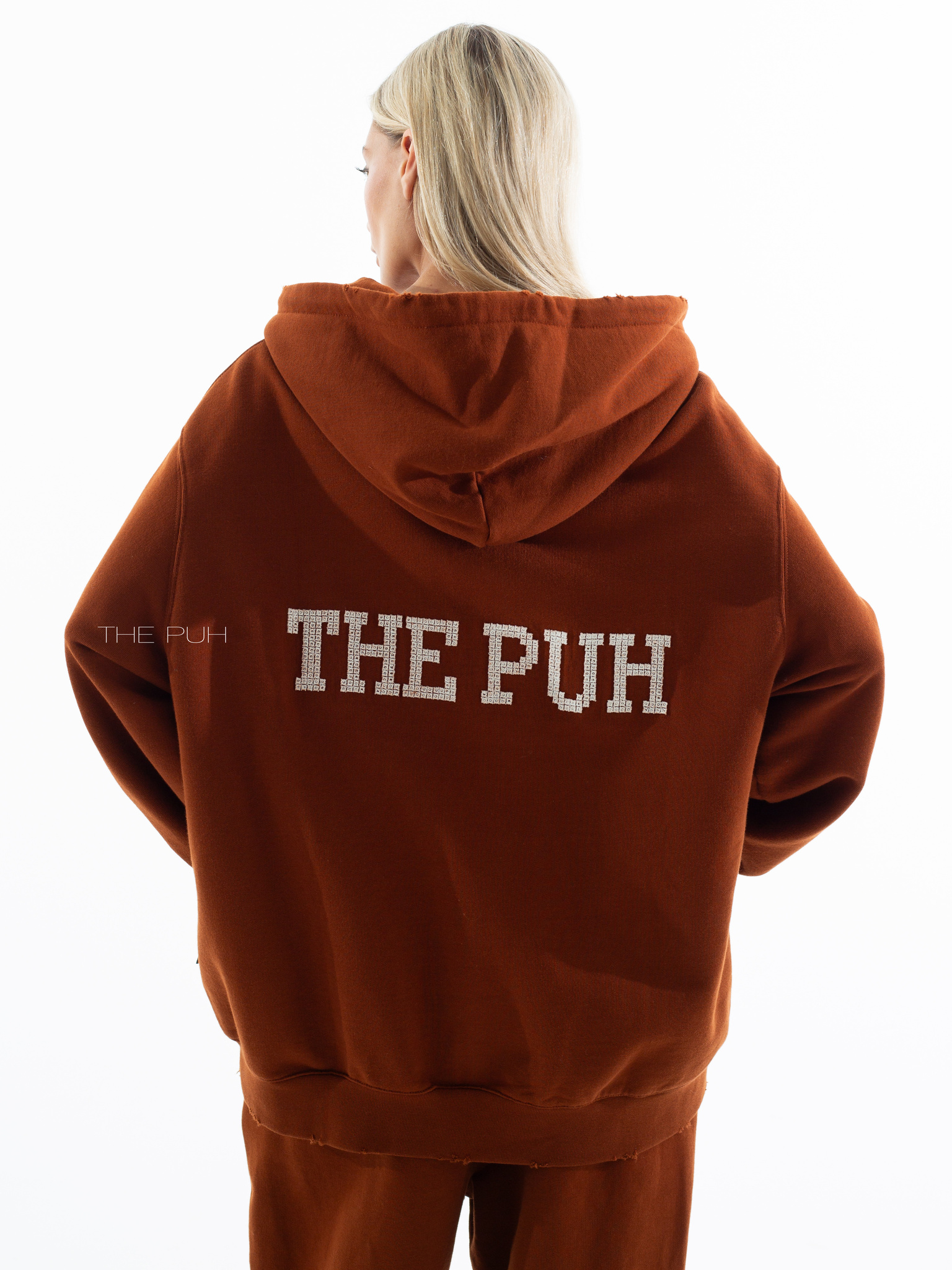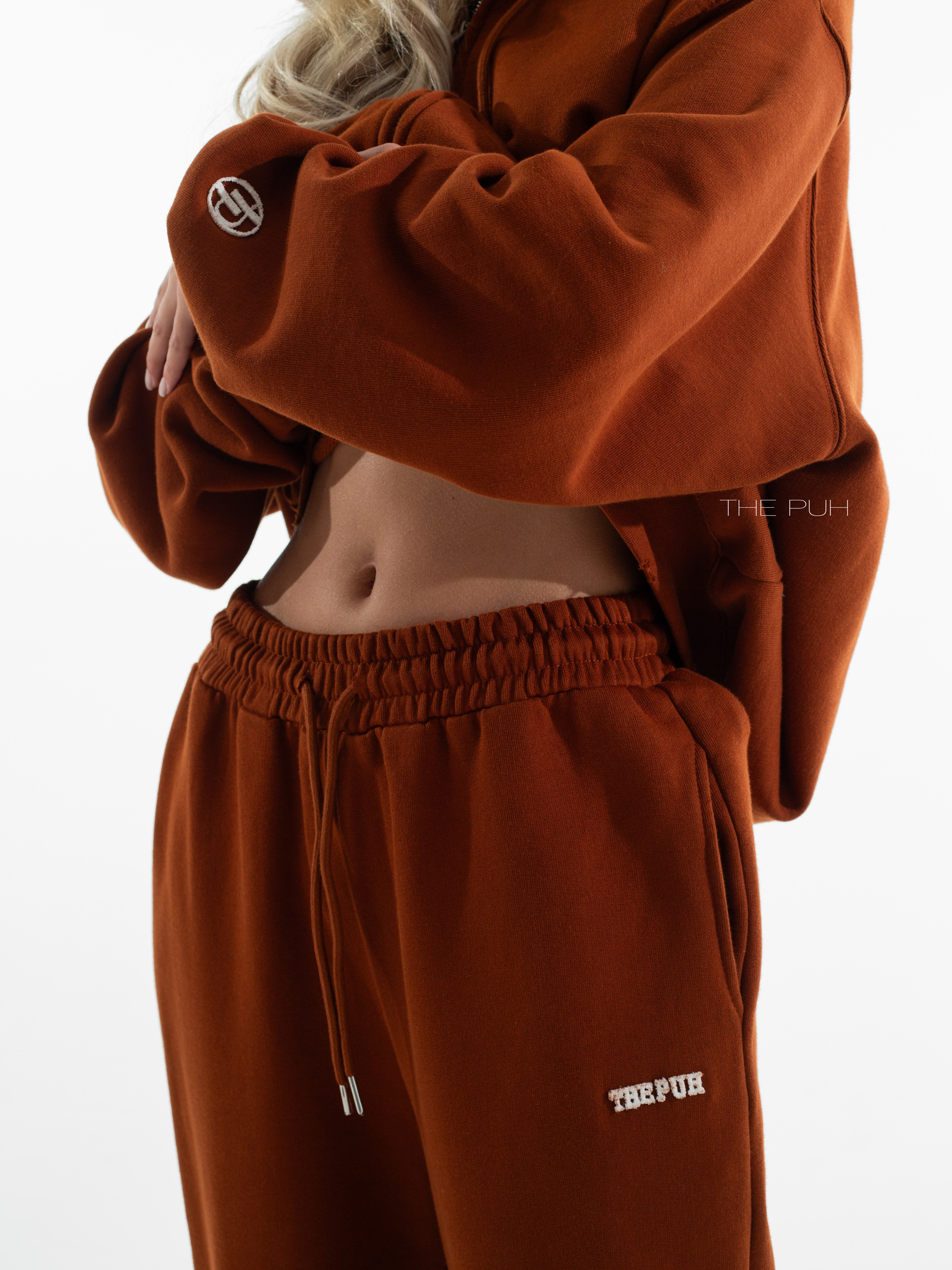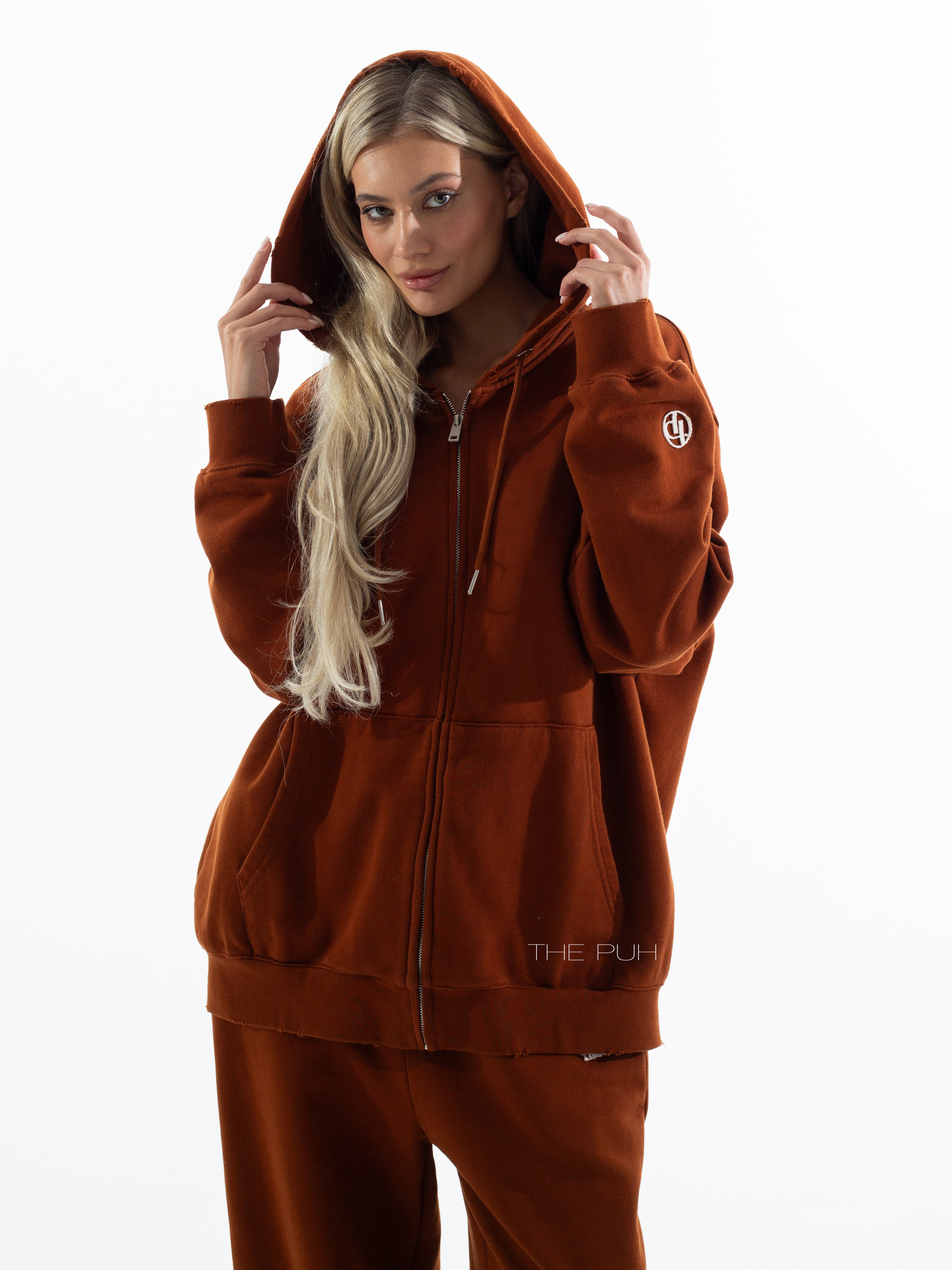 Хлопковый костюм в кирпичном цвете состоит из свободной худи на молнии и широких прямых брюк на кулиске. Модель оверсайз и дополнена контрастными логотипами, которые выполнены в технике "флок" - объемная бархатная печать.