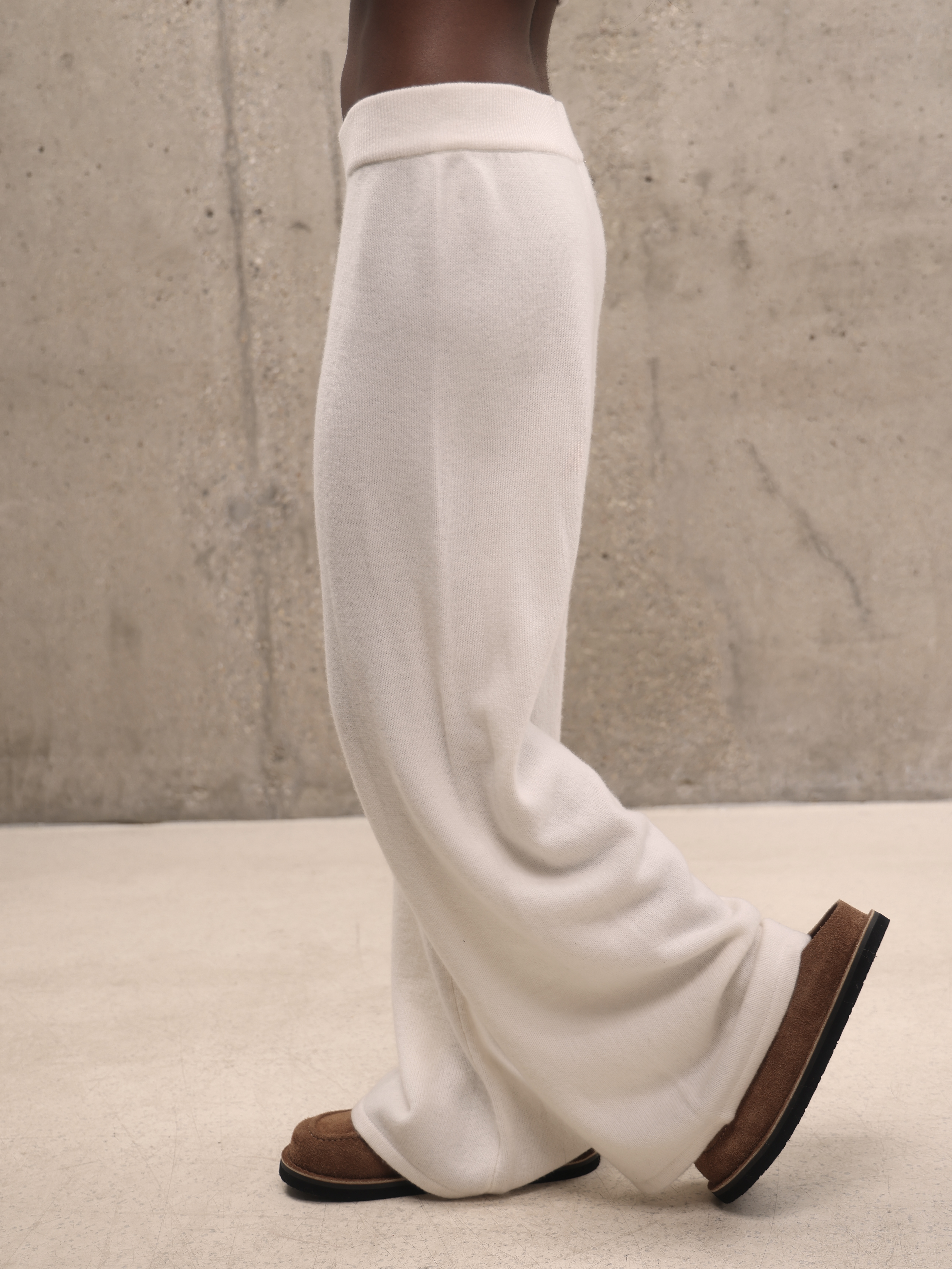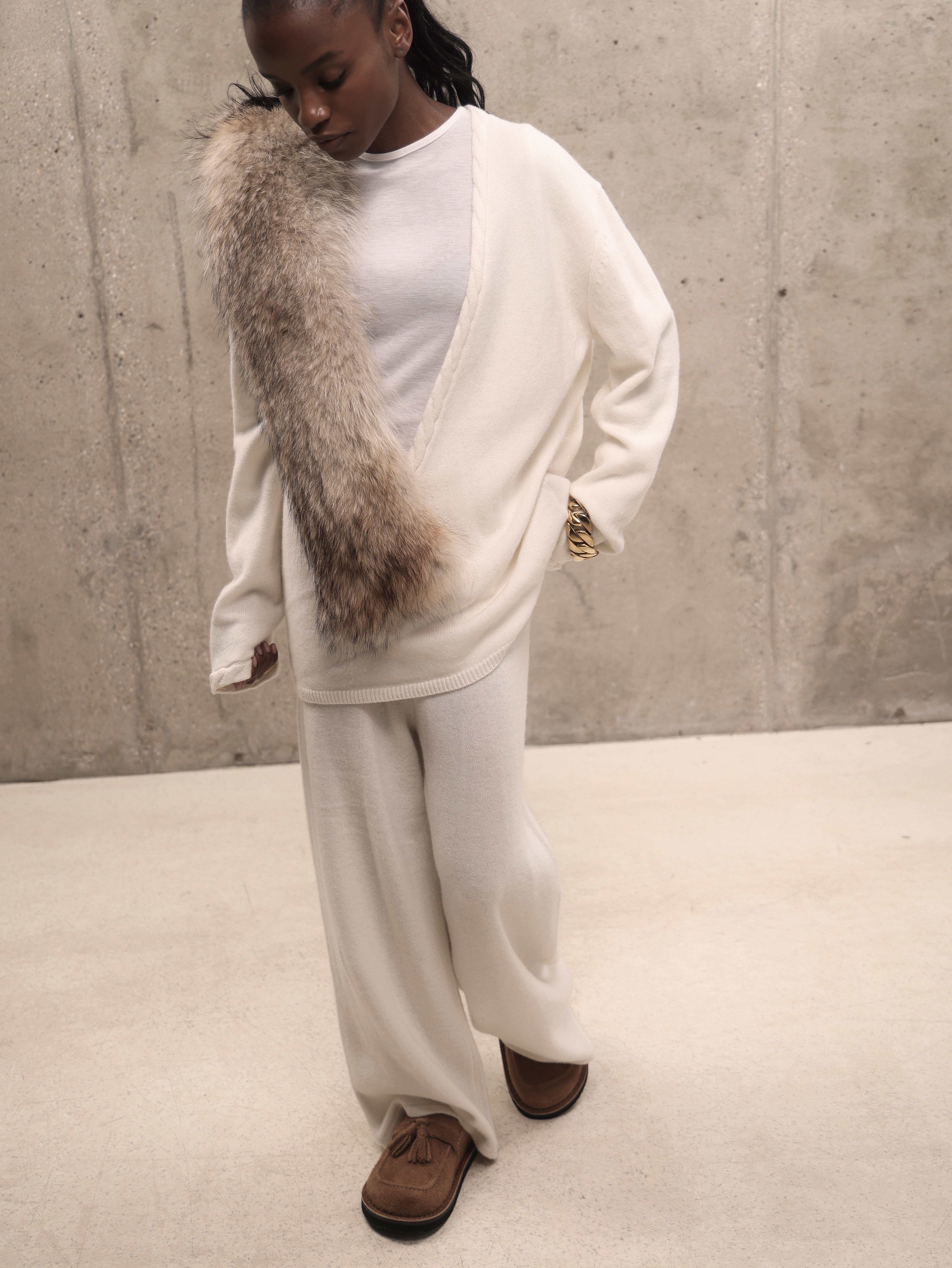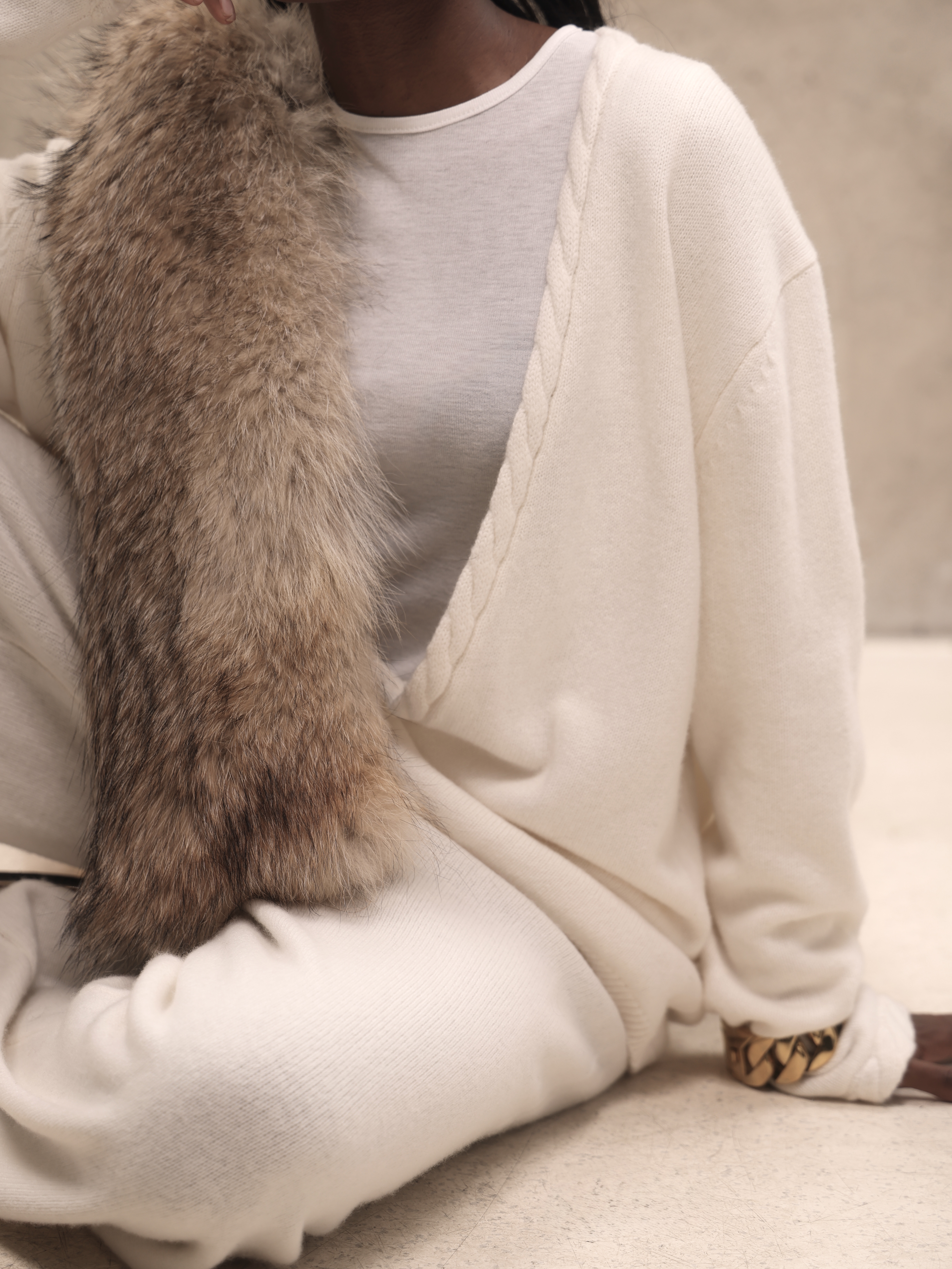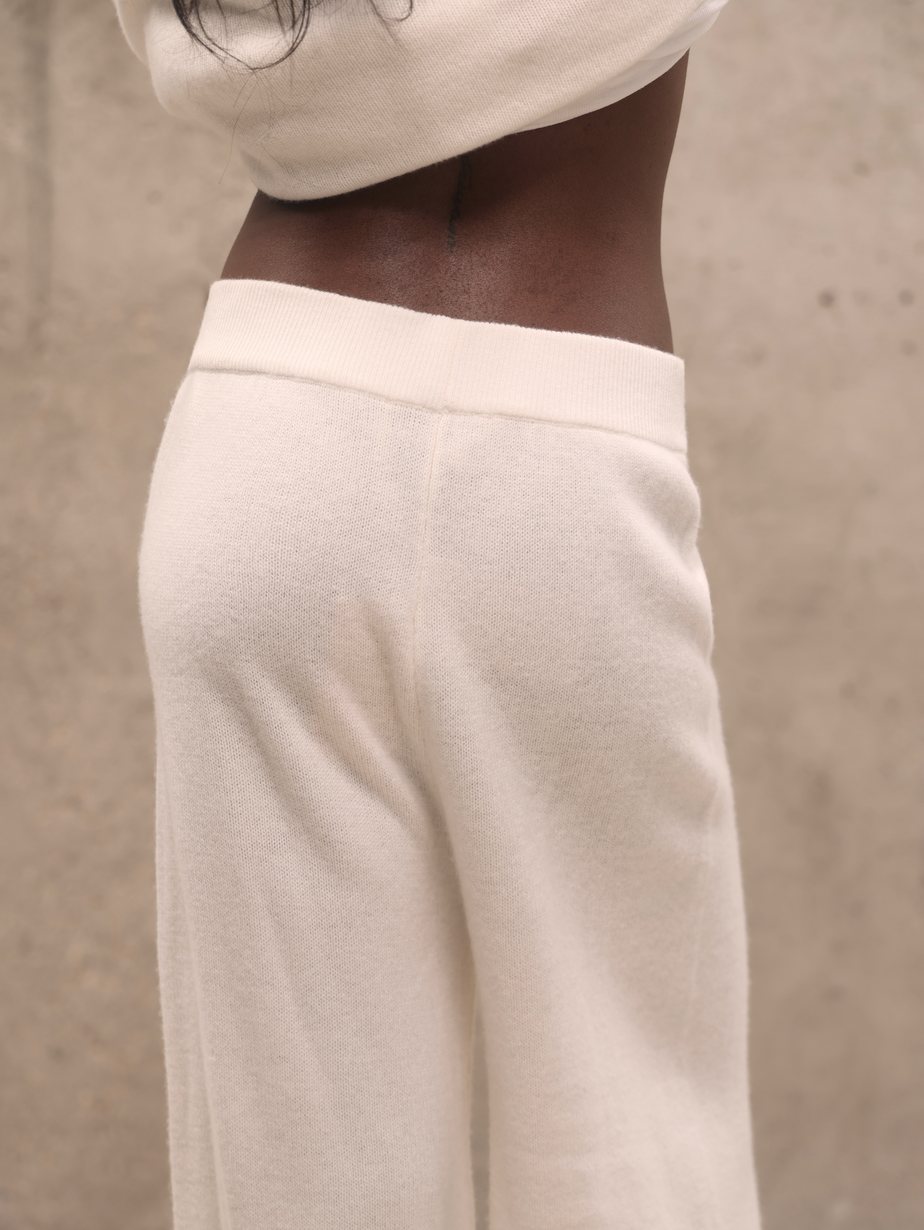 Молочный кашемировый костюм с глубоким вырезом