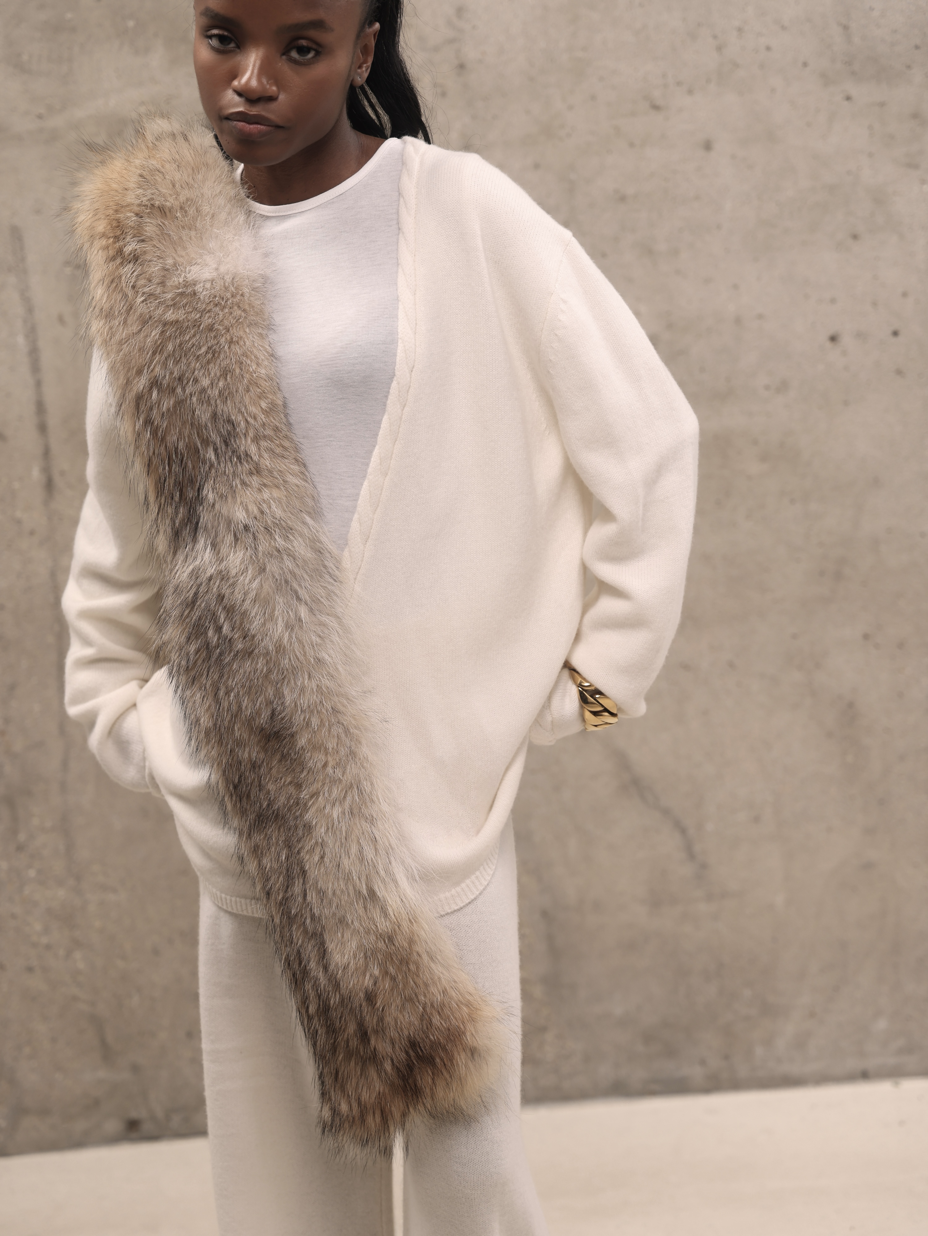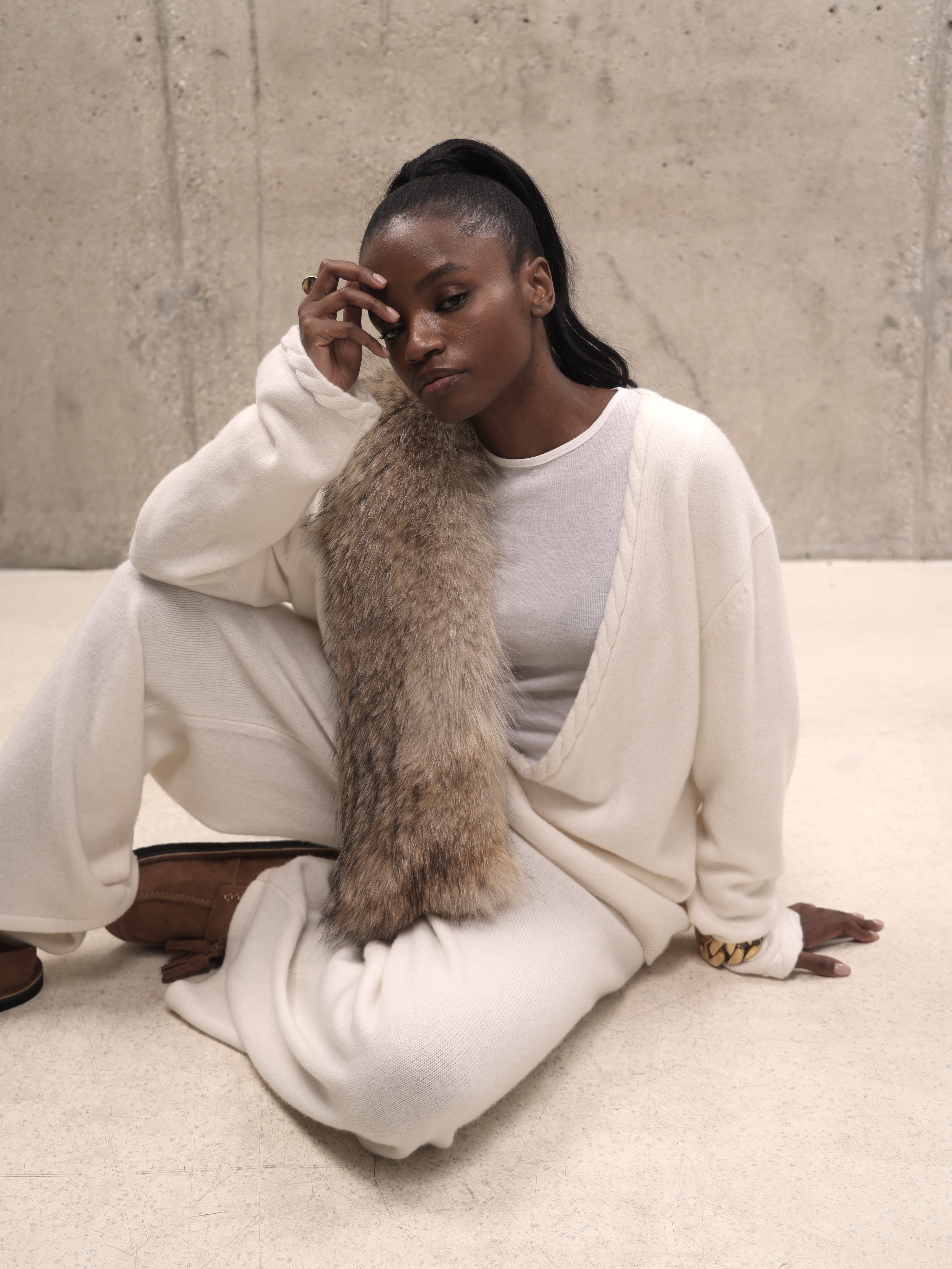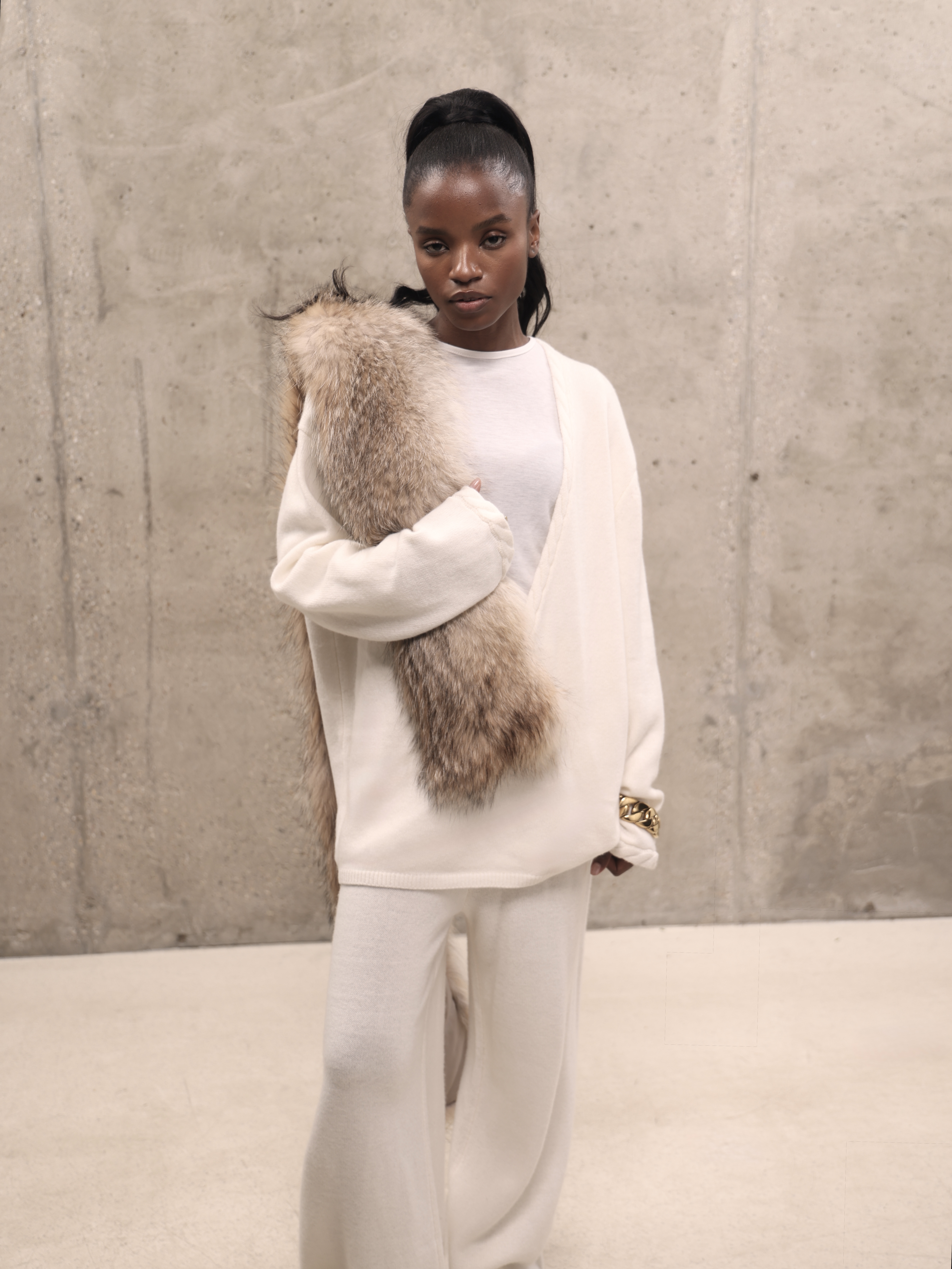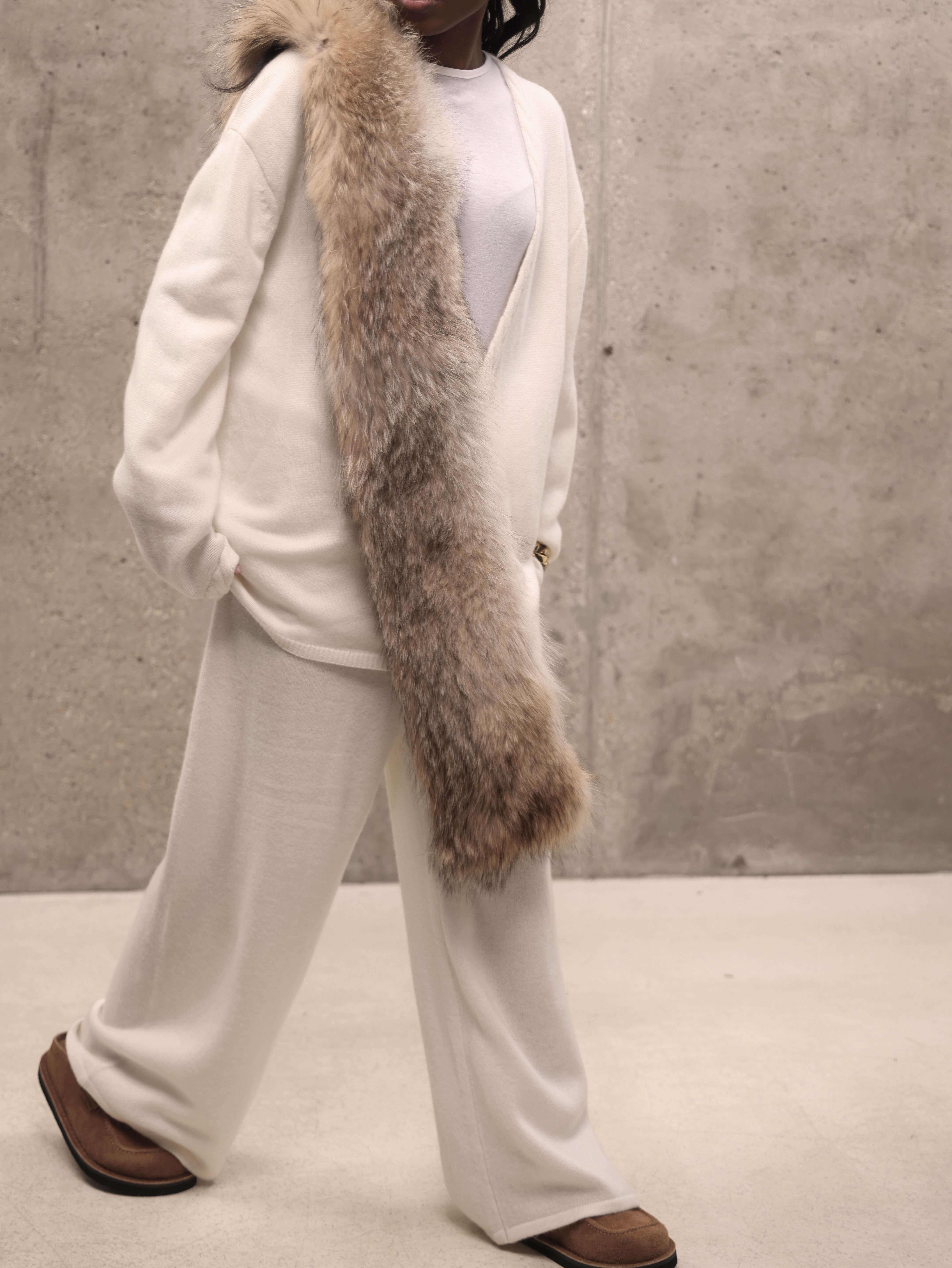 Молочный кашемировый костюм с глубоким вырезом
