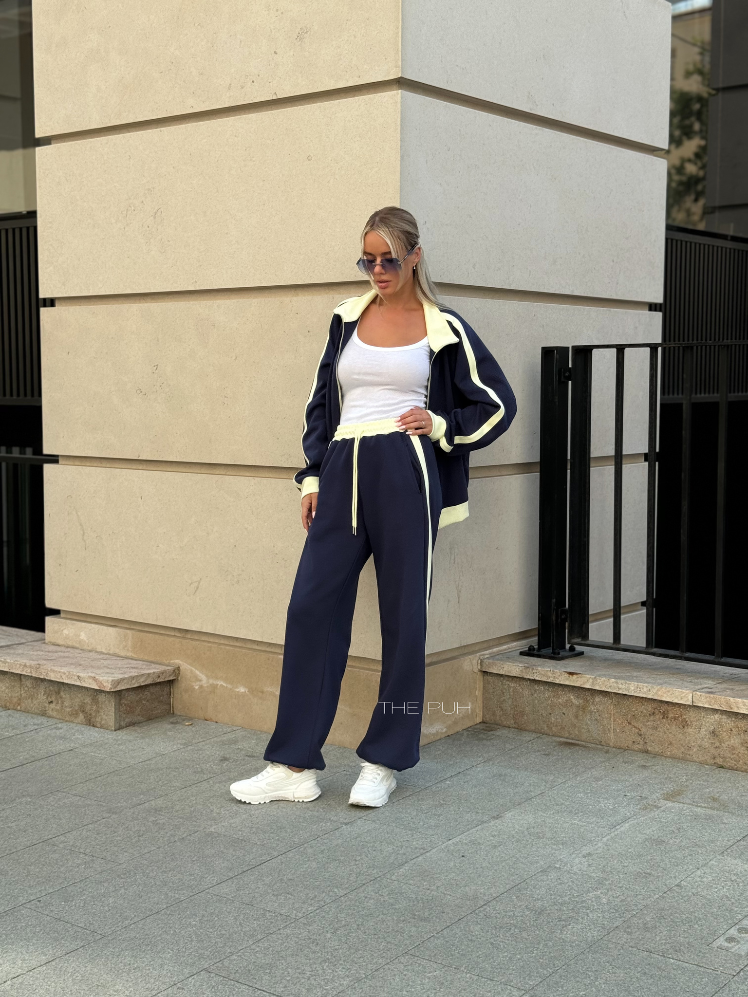 Синий спортивный костюм с лампасами из хлопка. Модель состоит из толстовки с воротником и карманами, и брюк свободного кроя на резинке.