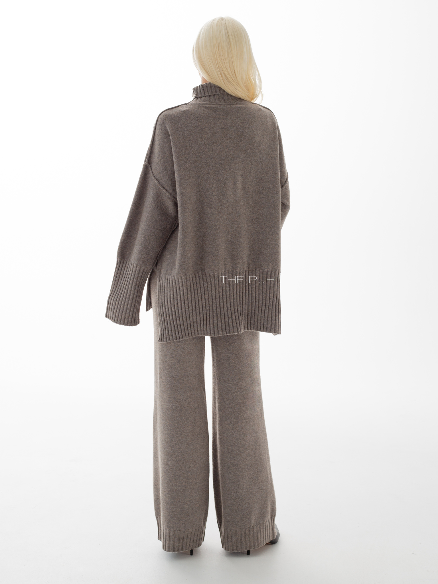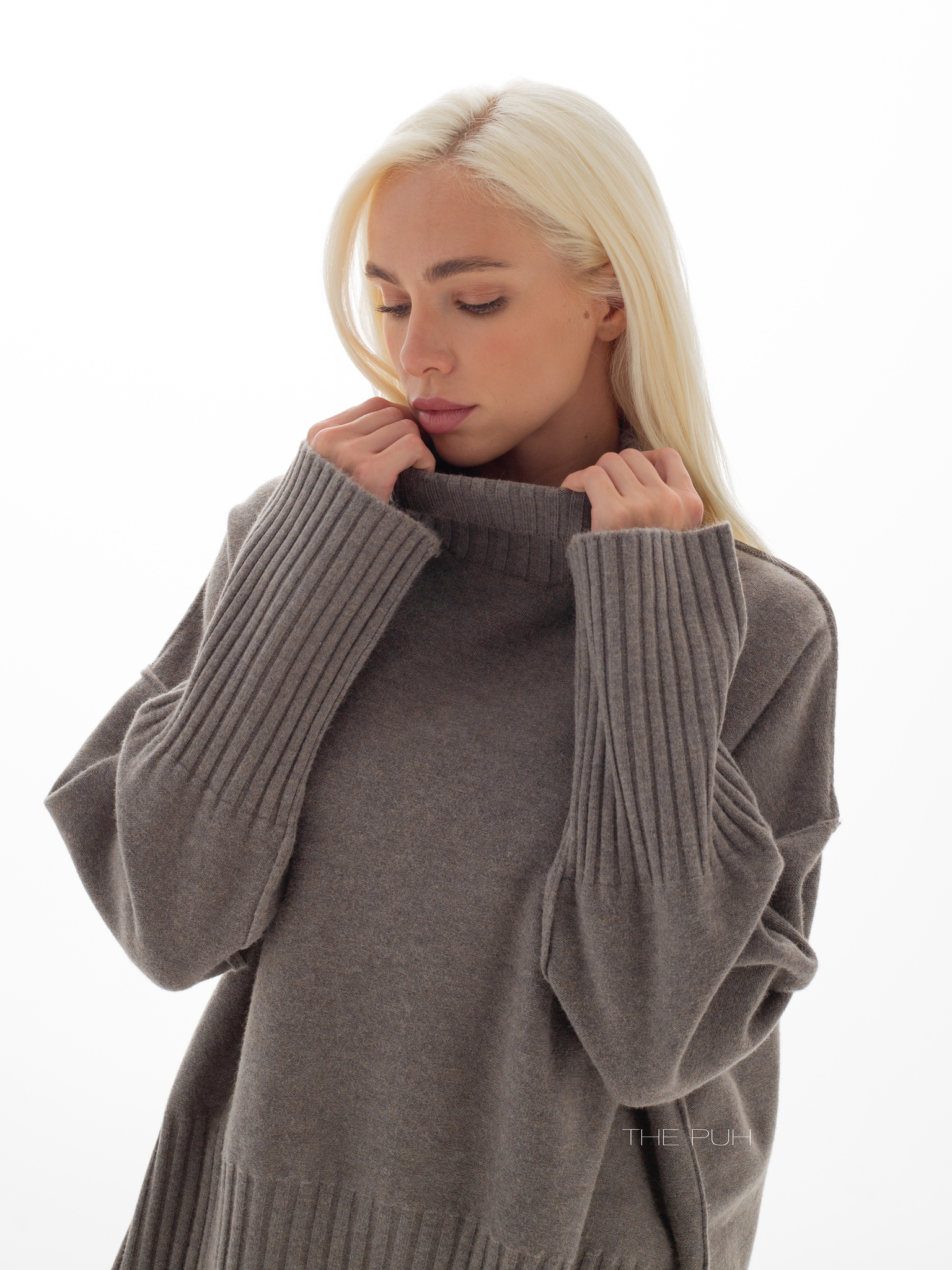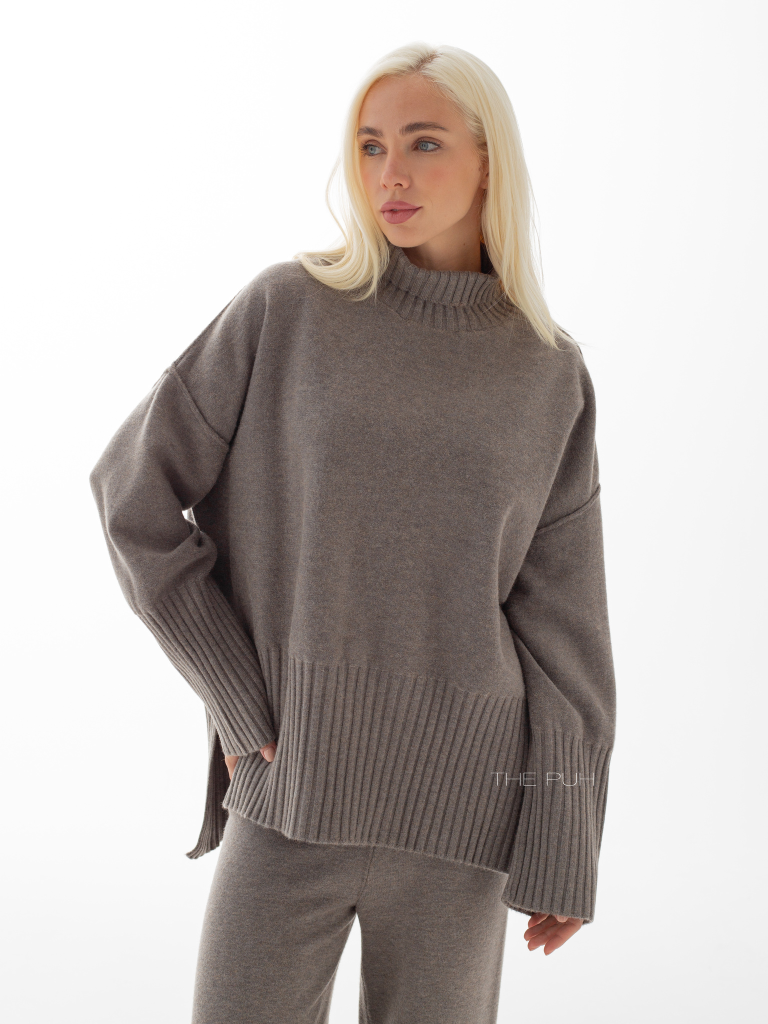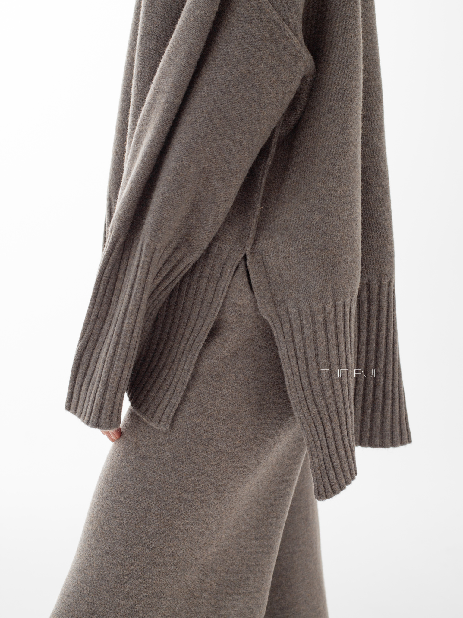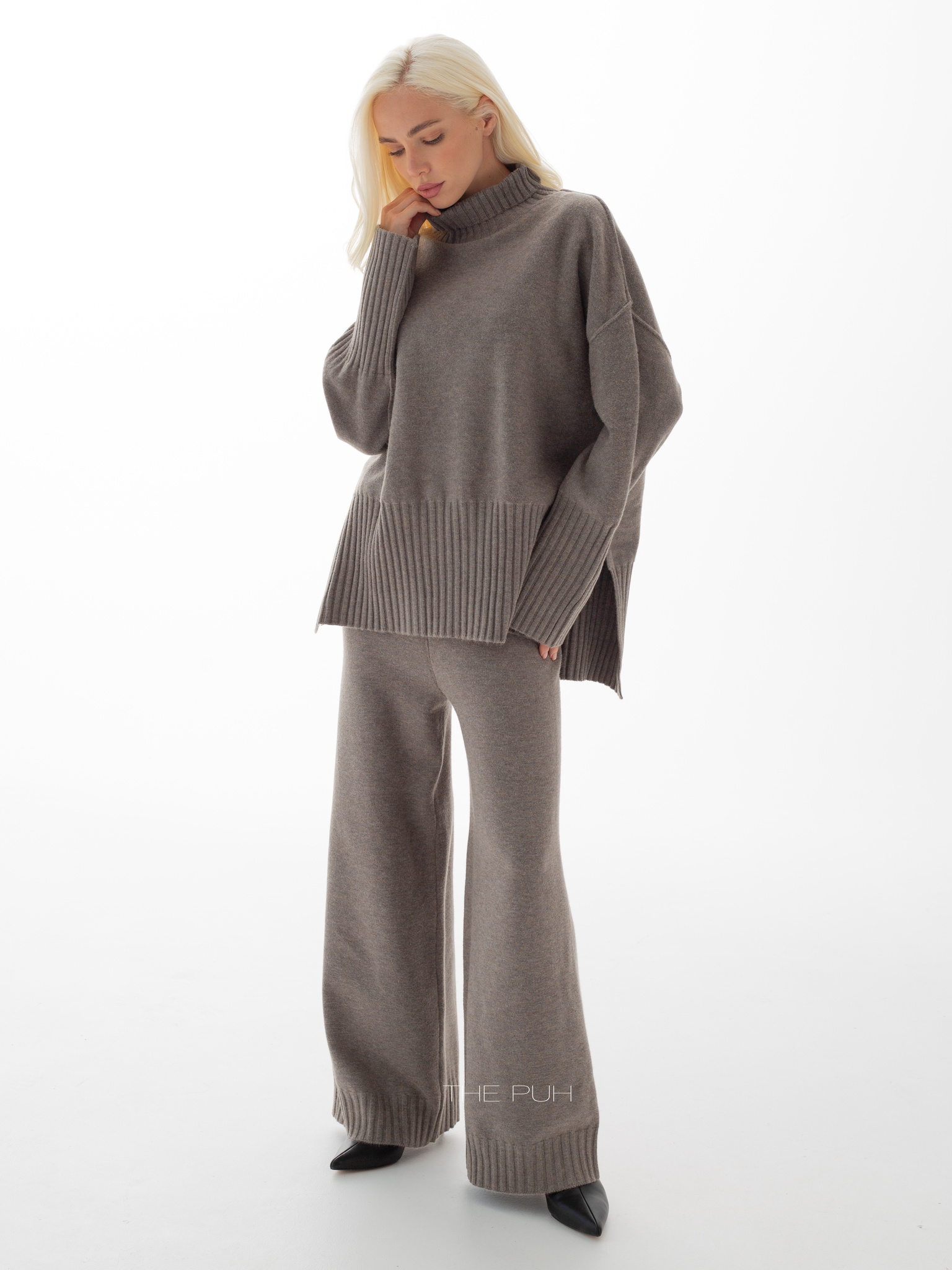 Серый костюм выполнен из смесового трикотажа с добавлением кашемира и шерсти. Модель состоит из свободного оверсайз джемпера с разрезами по бокам, удлиненной спинкой и широкими резинками в рубчик на подоле и манжетах, и прямых брюк высокой посадки на комфортной резинке.