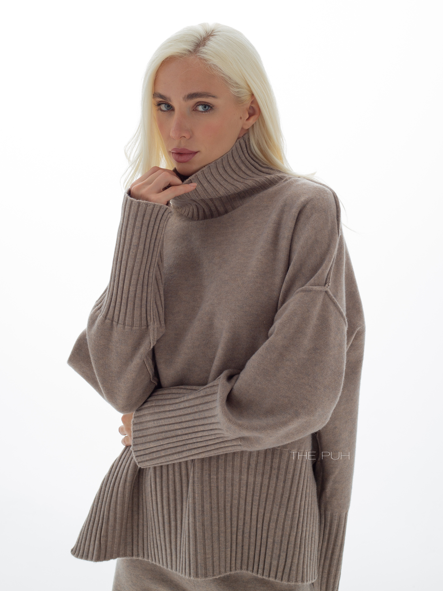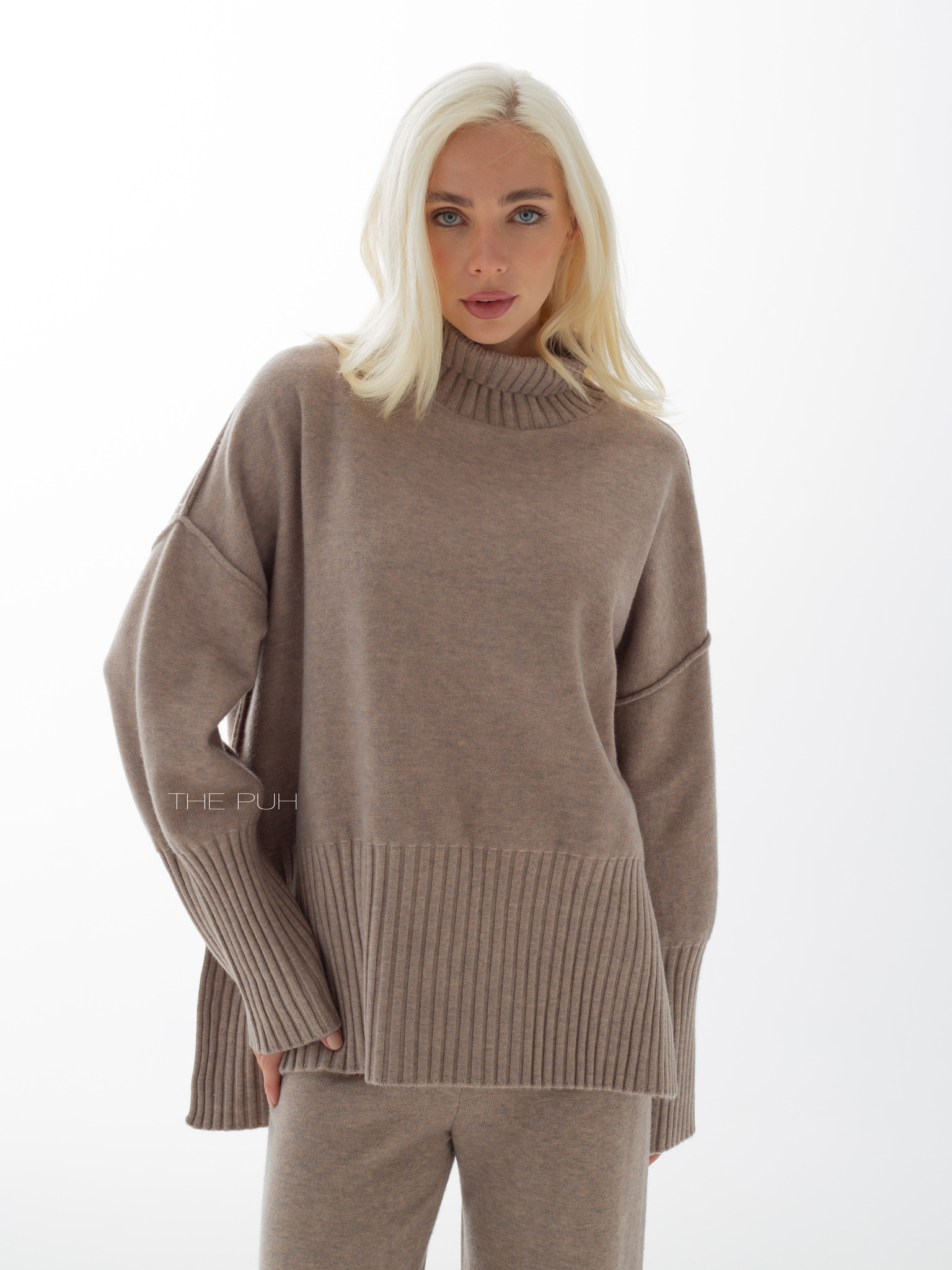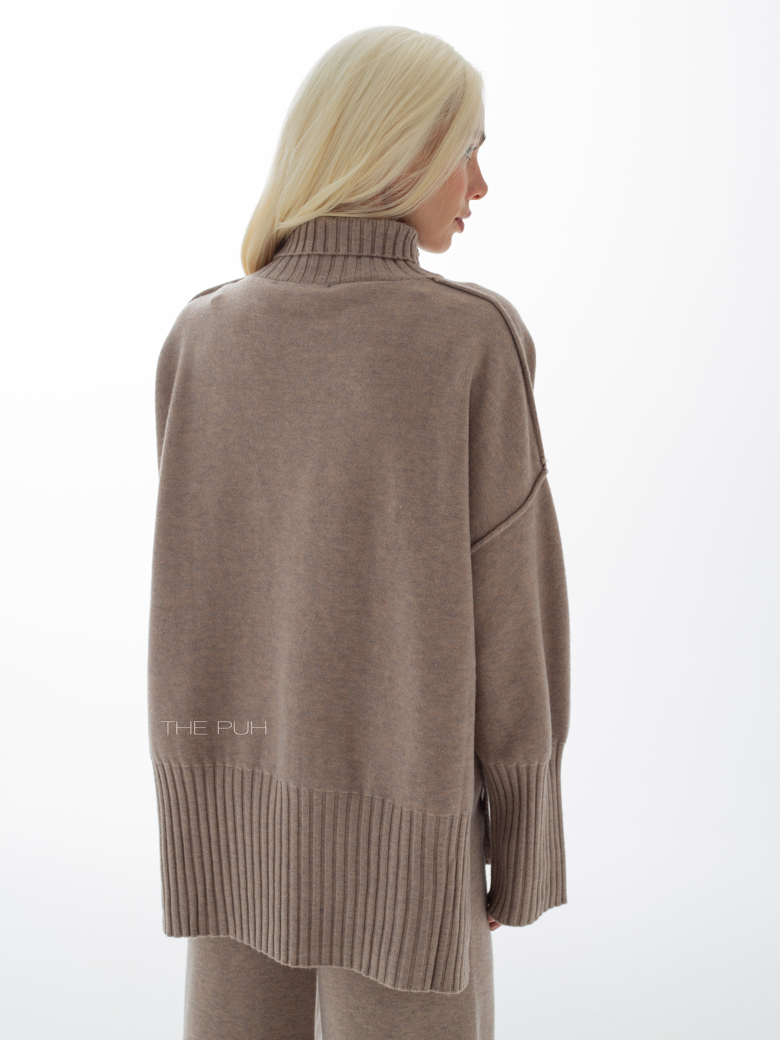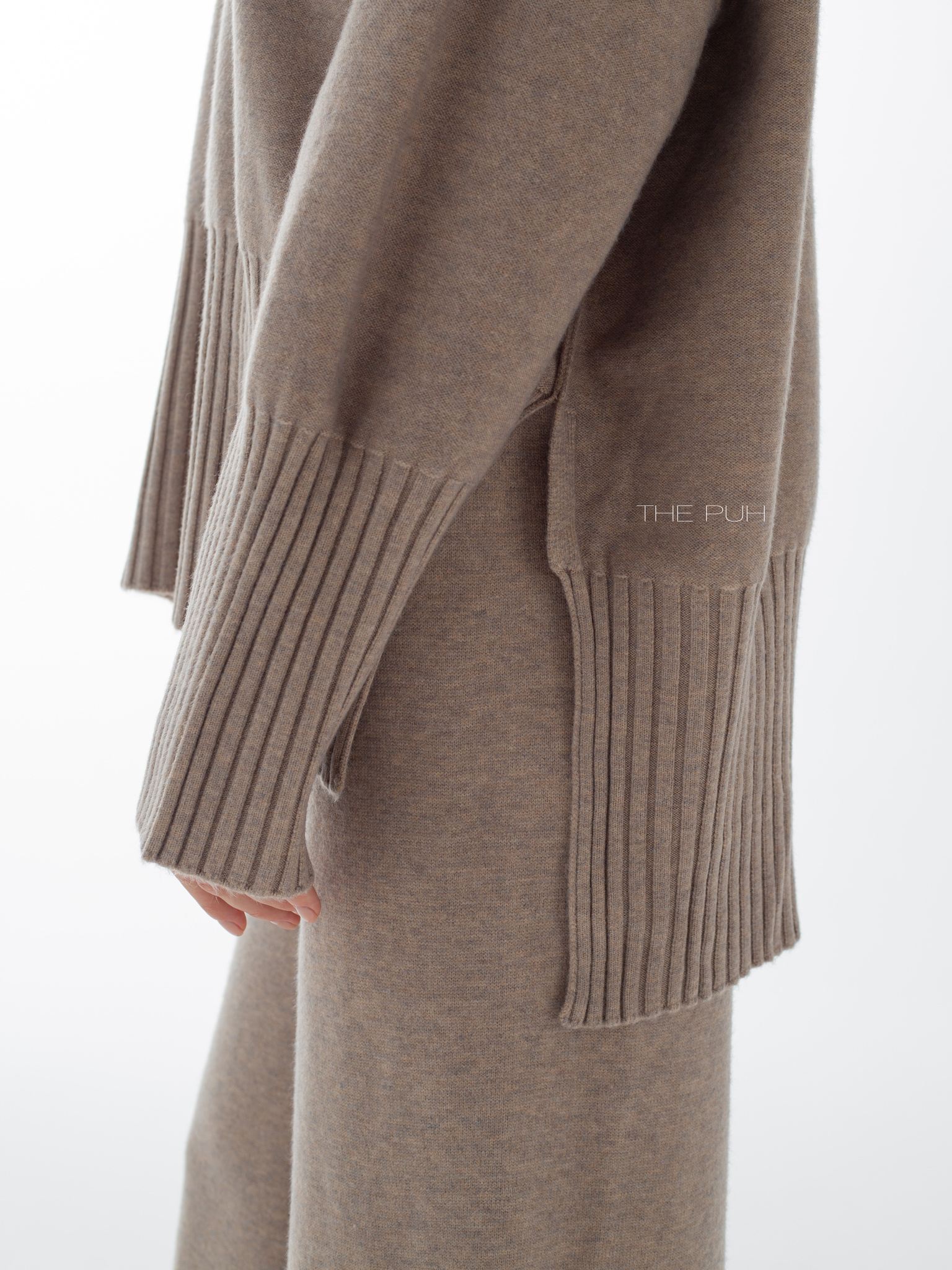 Костюм в цвете капучино выполнен из смесового трикотажа с добавлением кашемира и шерсти. Модель состоит из свободного оверсайз джемпера с разрезами по бокам, удлиненной спинкой и широкими резинками в рубчик на подоле и манжетах, и прямых брюк высокой посадки на комфортной резинке.