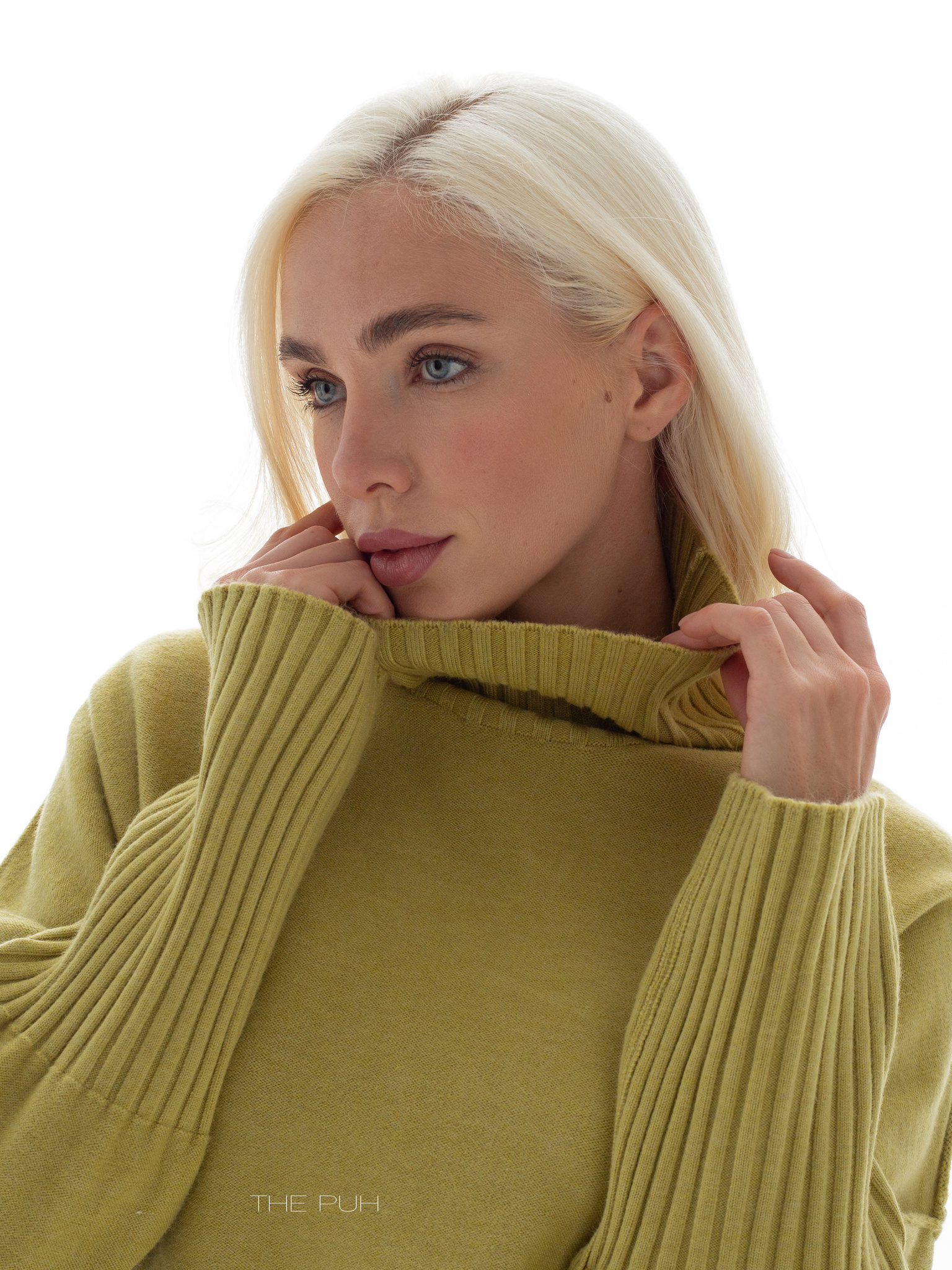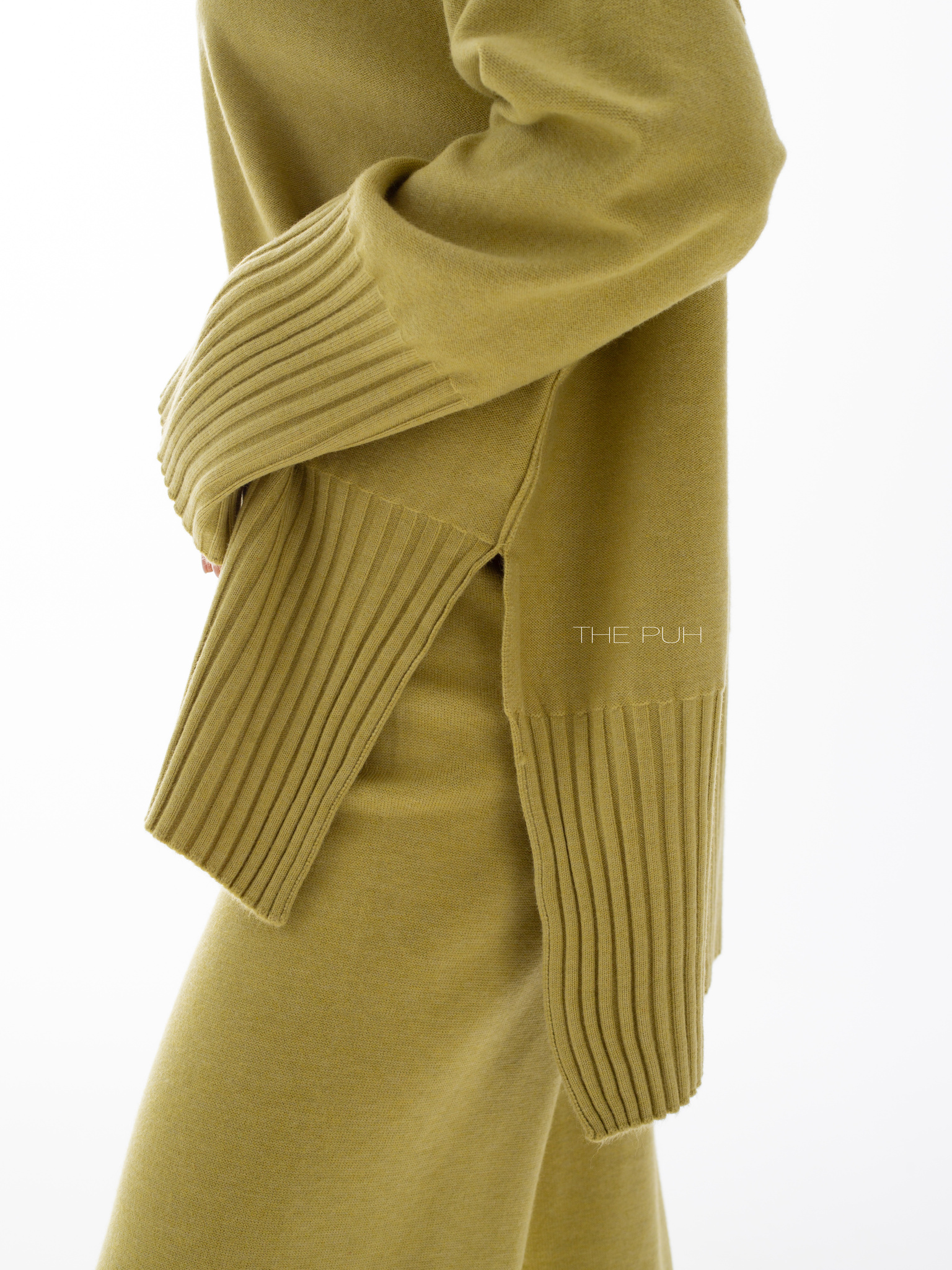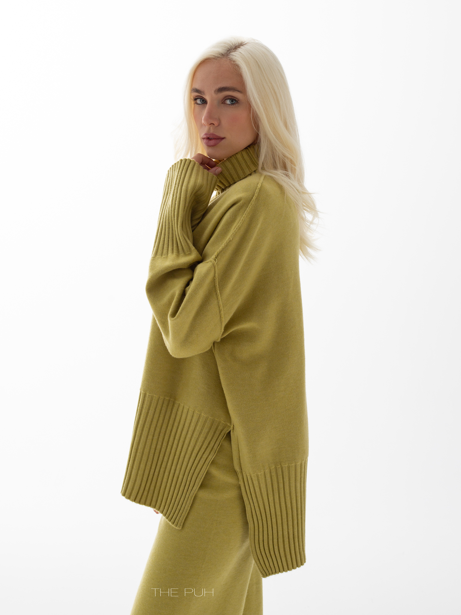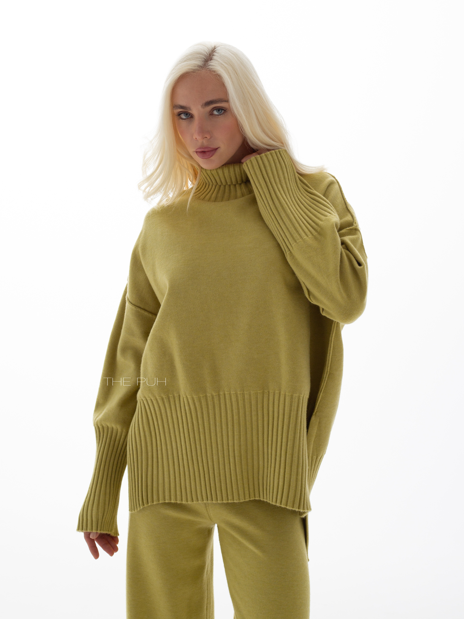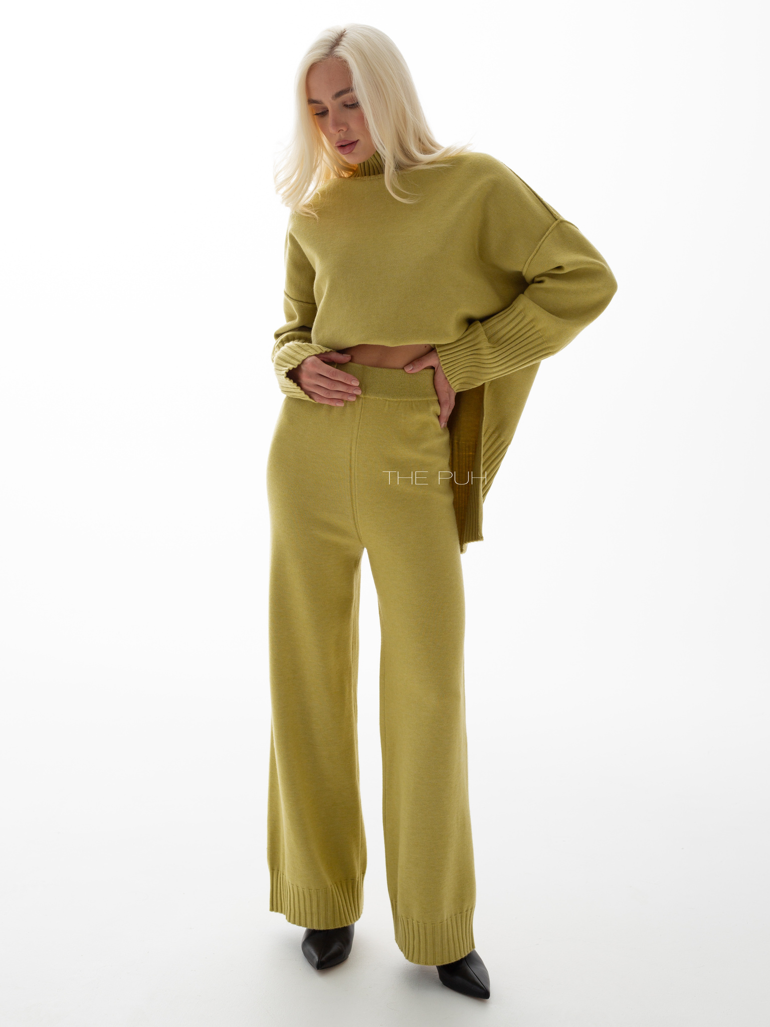 Темно-салатовый костюм выполнен из смесового трикотажа с добавлением кашемира и шерсти. Модель состоит из свободного оверсайз джемпера с разрезами по бокам, удлиненной спинкой и широкими резинками в рубчик на подоле и манжетах, и прямых брюк высокой посадки на комфортной резинке.