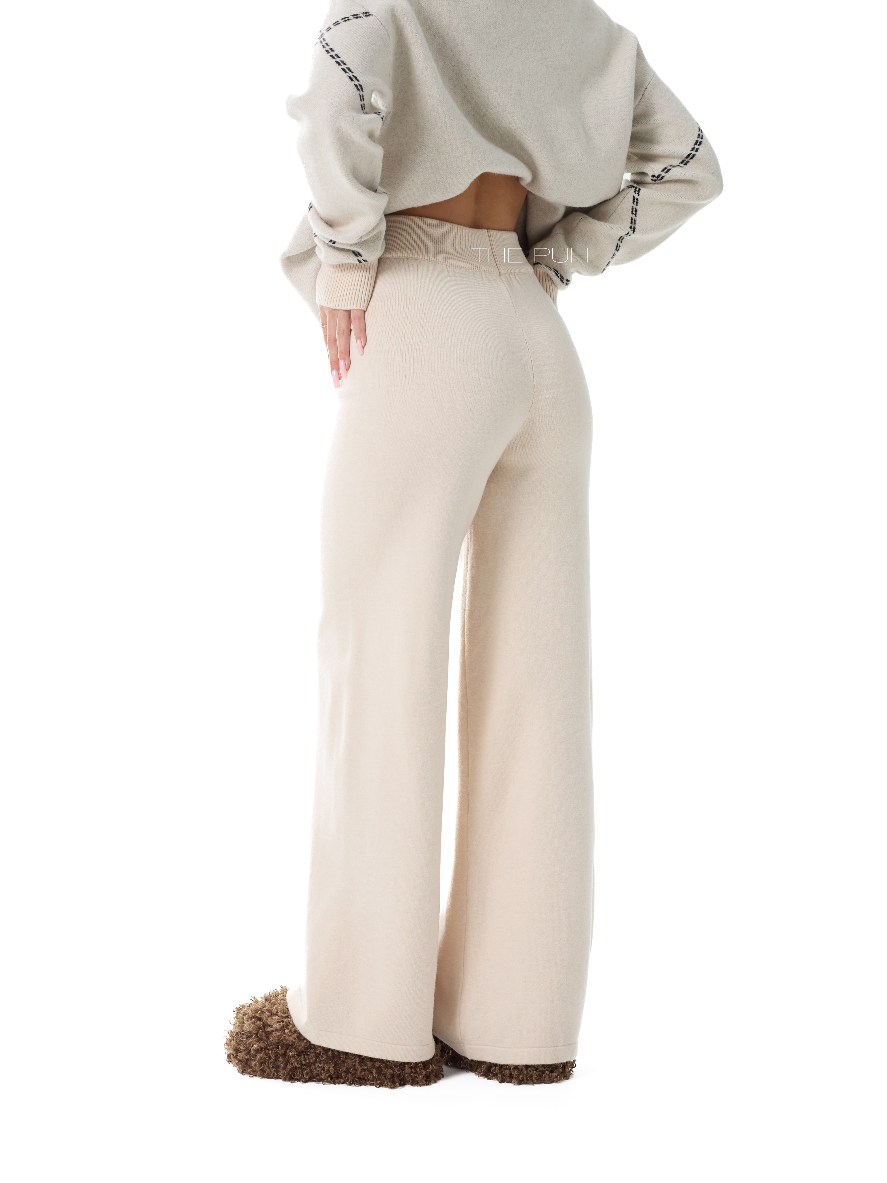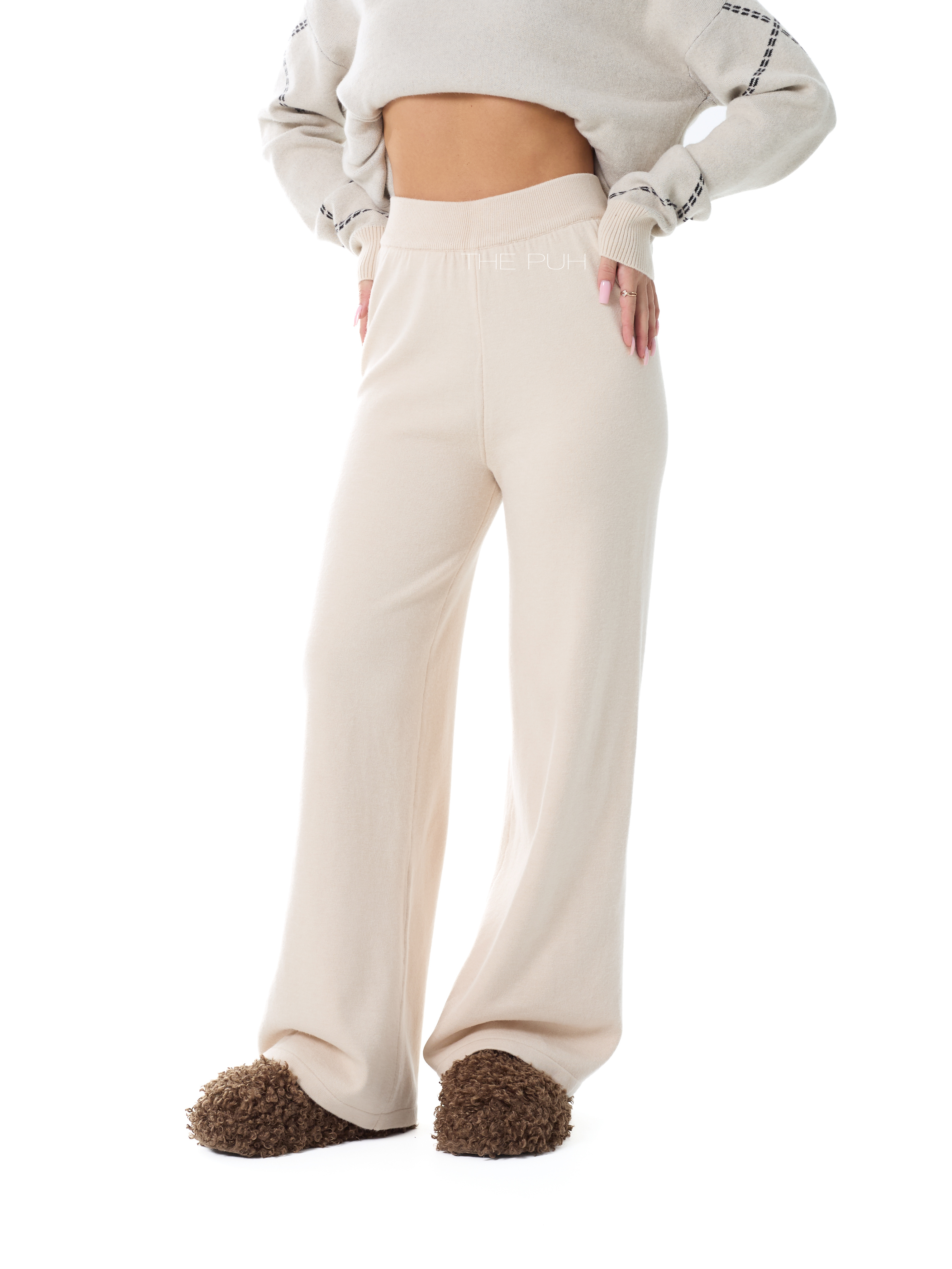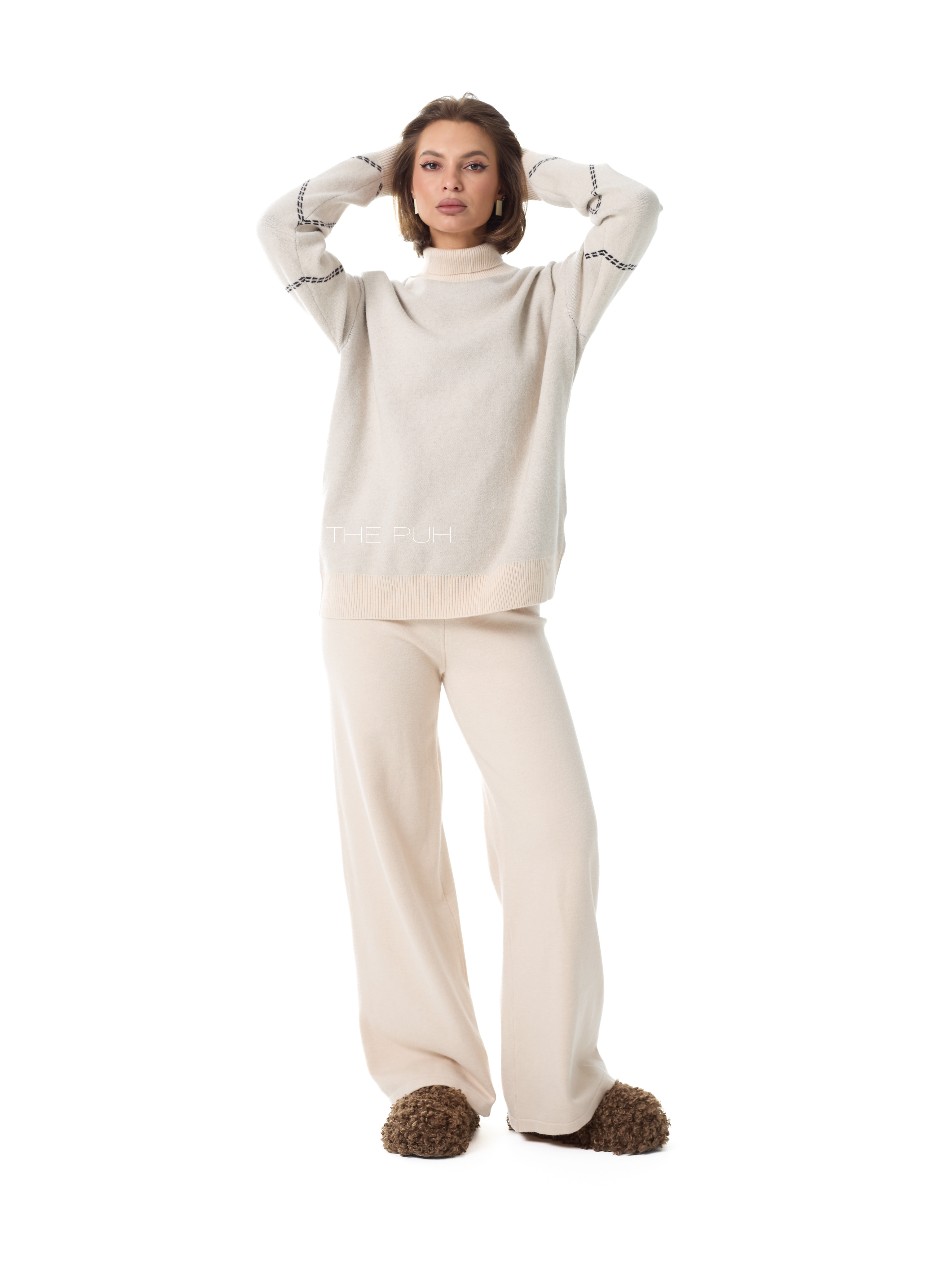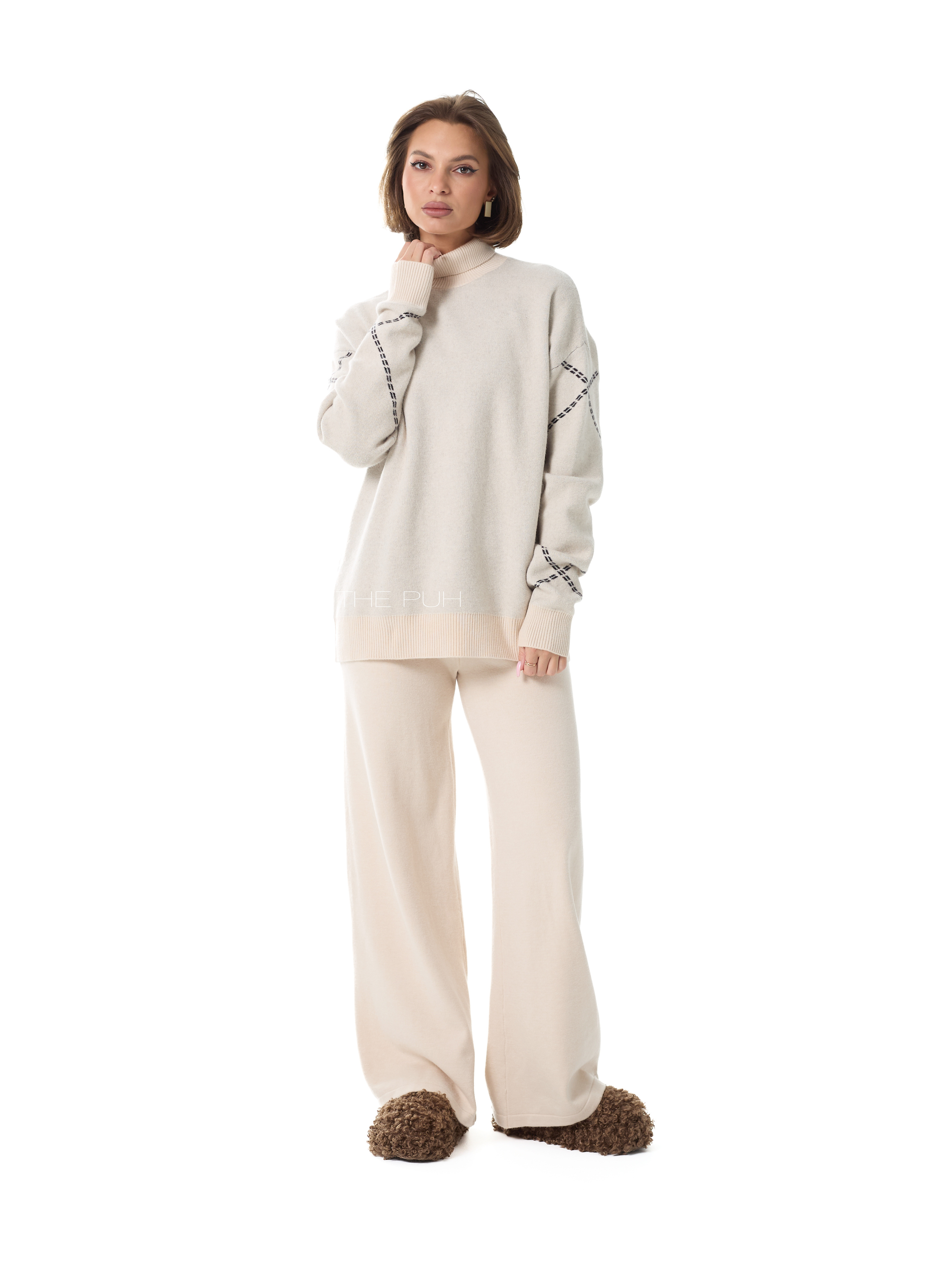Вязаный костюм джемпер + брюки выполнен из мягкой овечьей шерсти (virgin wool - шерсть молодых овец, которая не была ранее в употреблении) с добавлением кашемира и вискозы.