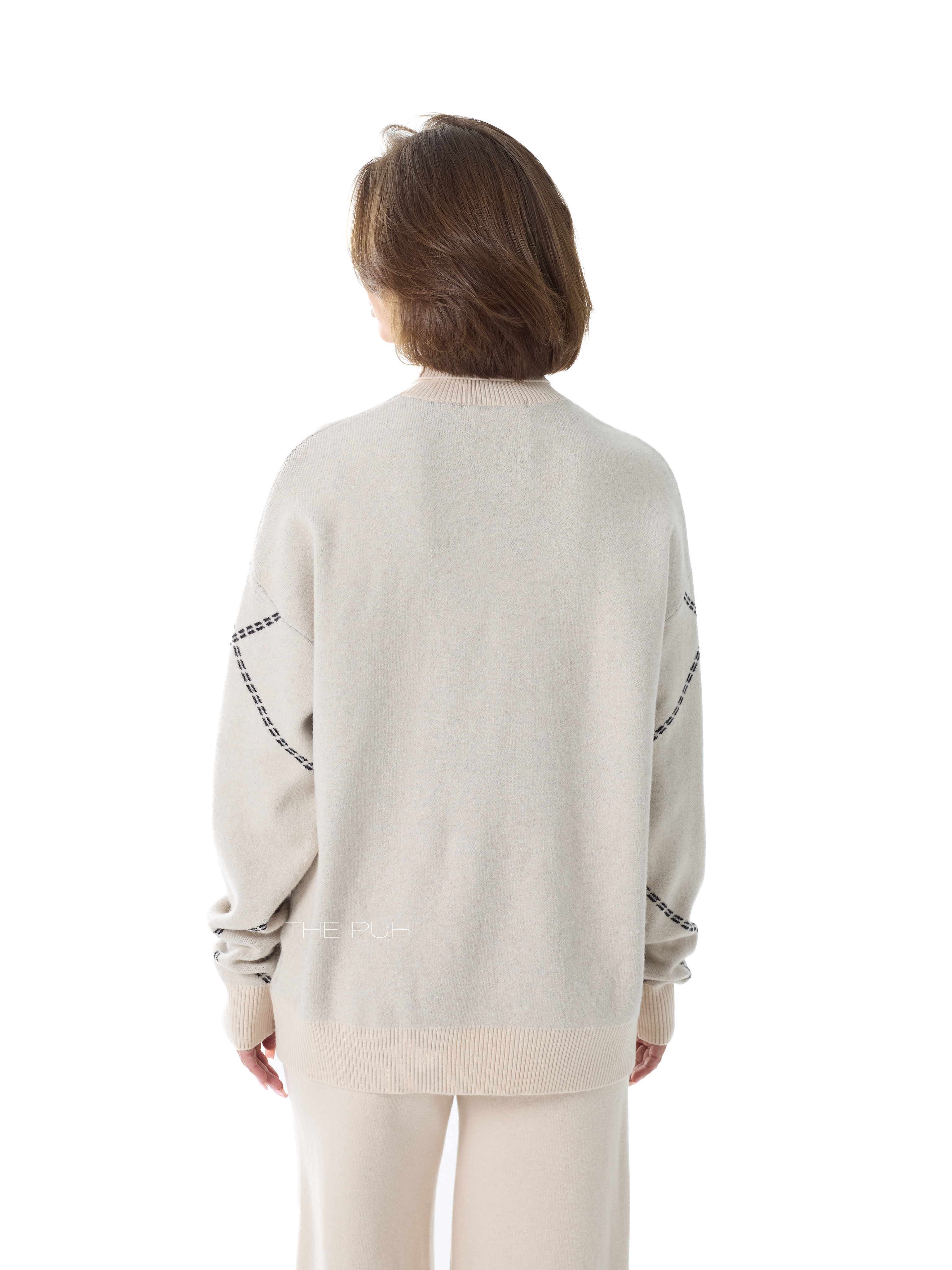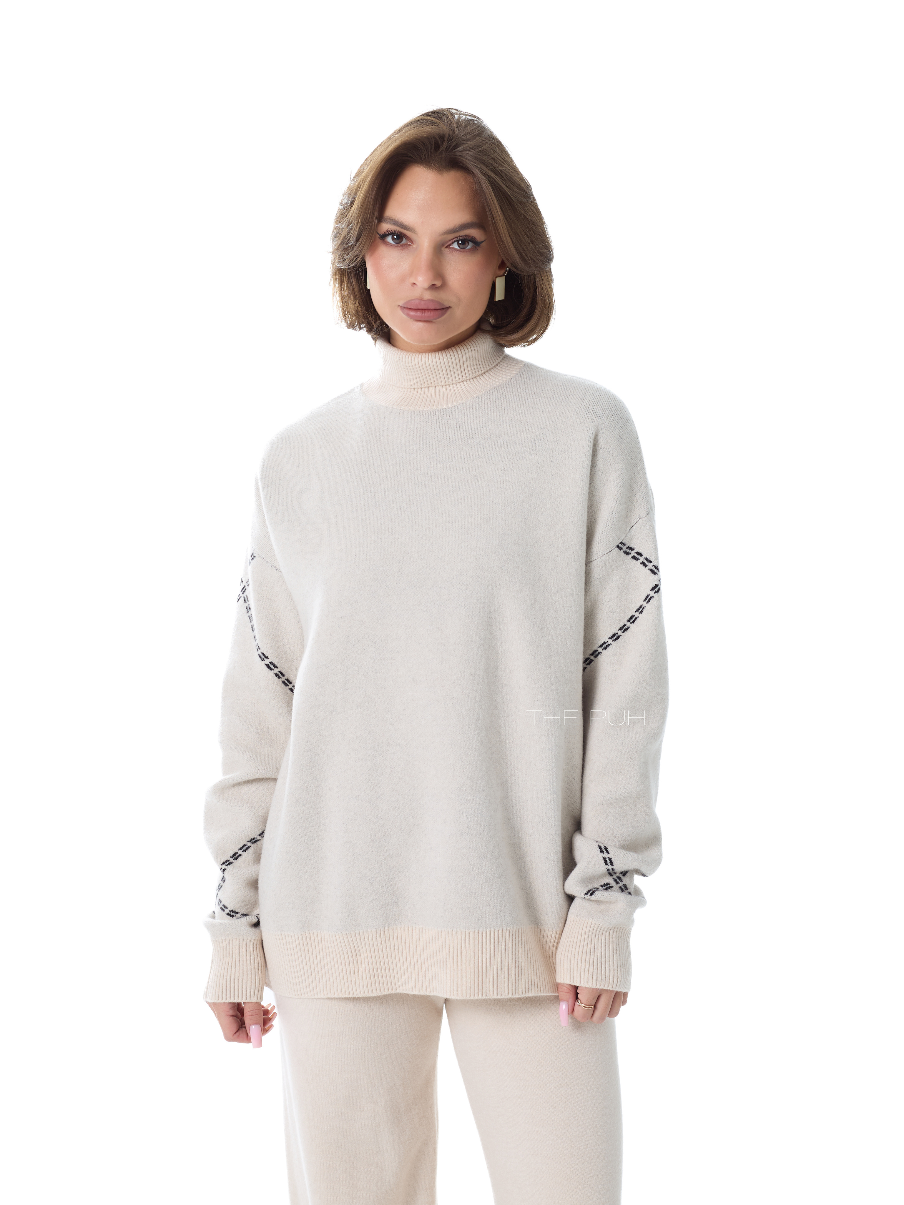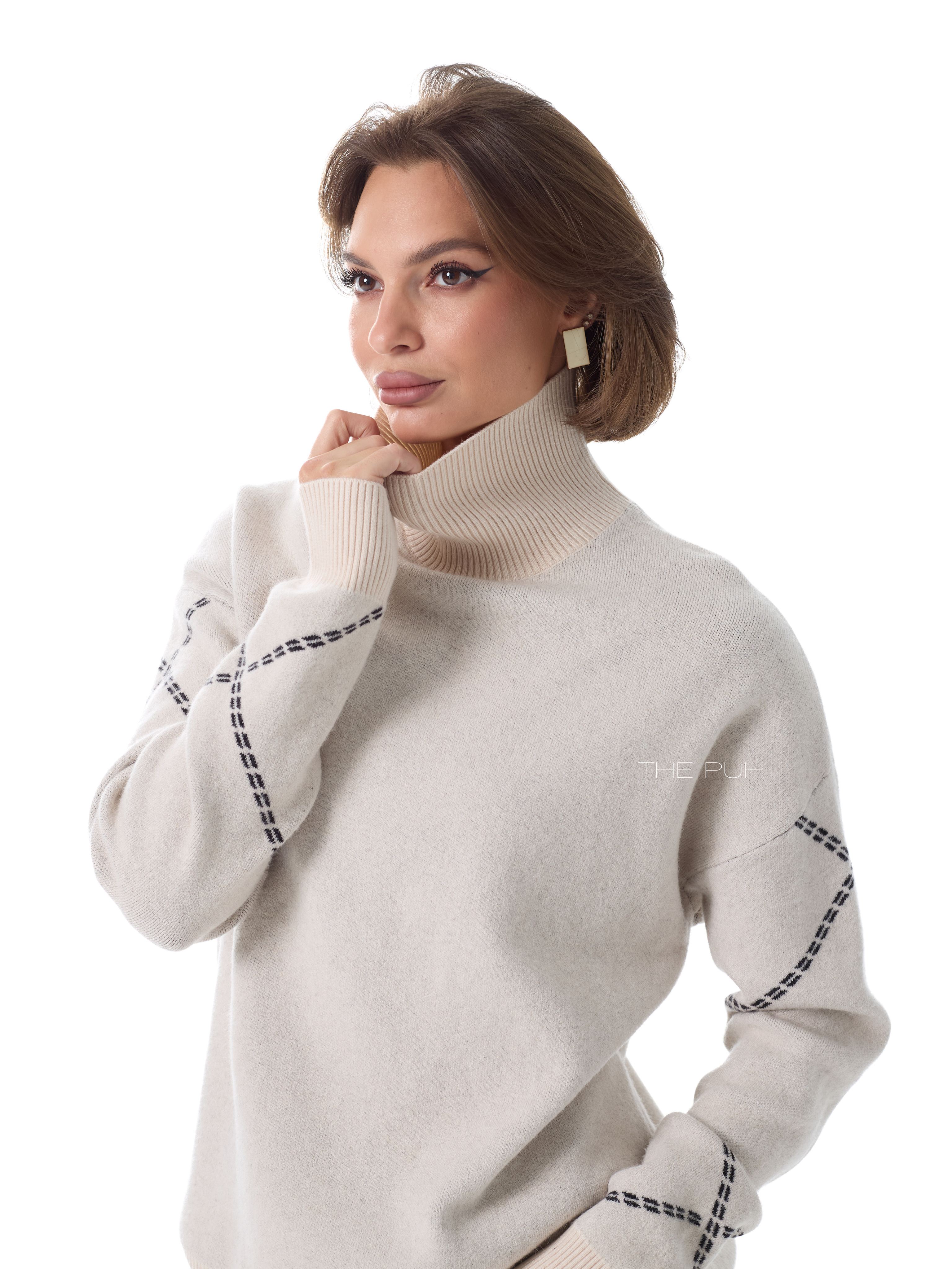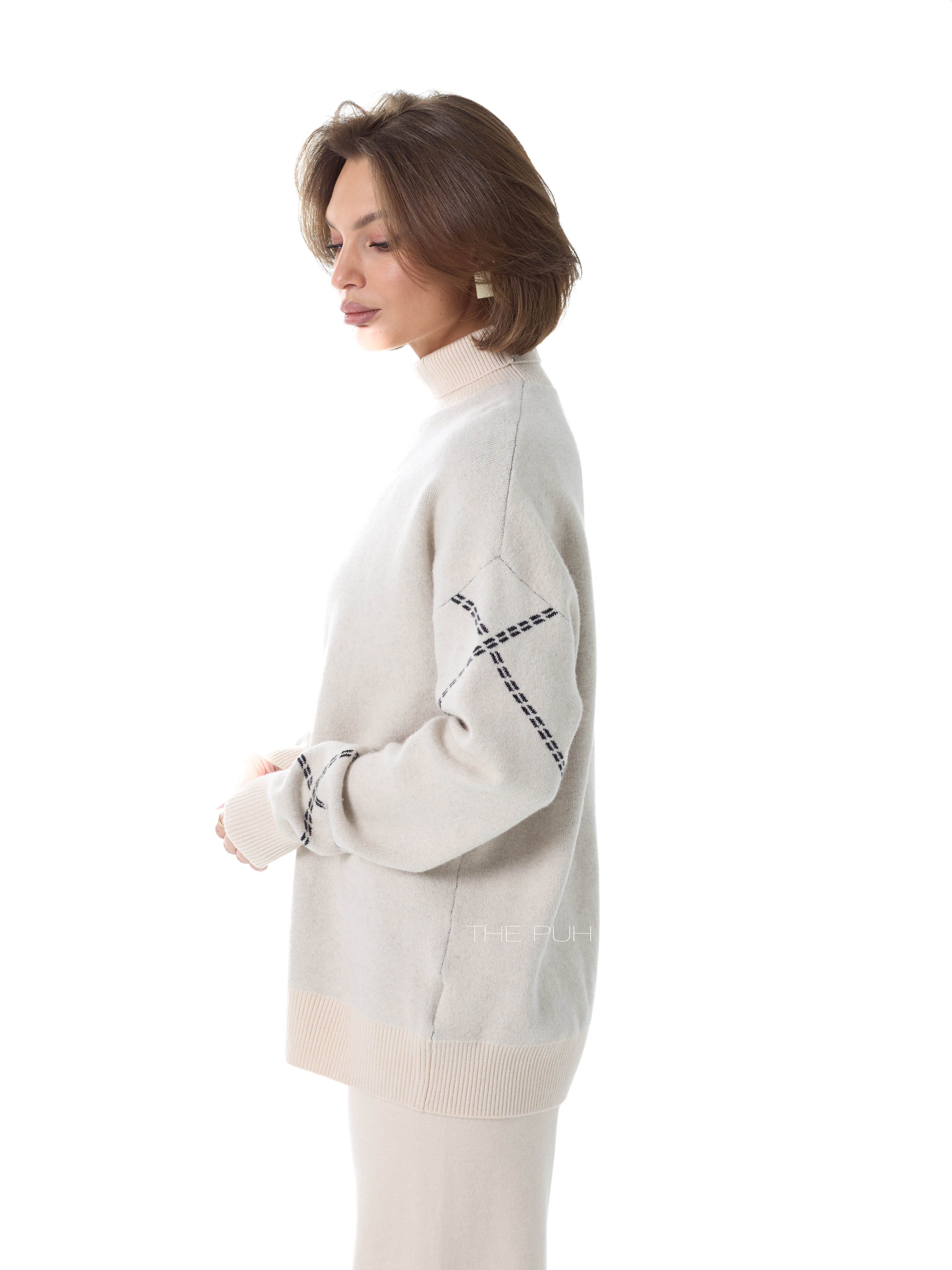 Детали джемпера: свободный силуэт, высокая горловина, приспущенные плечи.