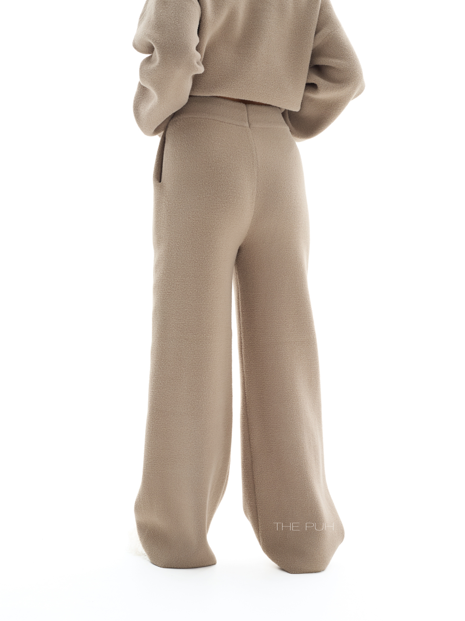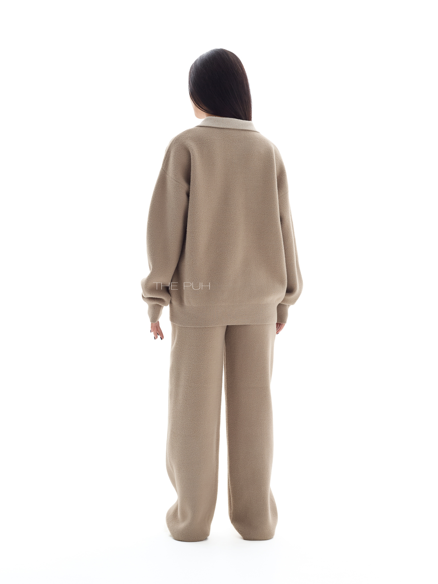 Трикотажный костюм бежевого цвета, изготовленный из смесовой пряжи с добавлением шерсти и кашемира, обеспечивает несравненное ощущение мягкости и тепла.