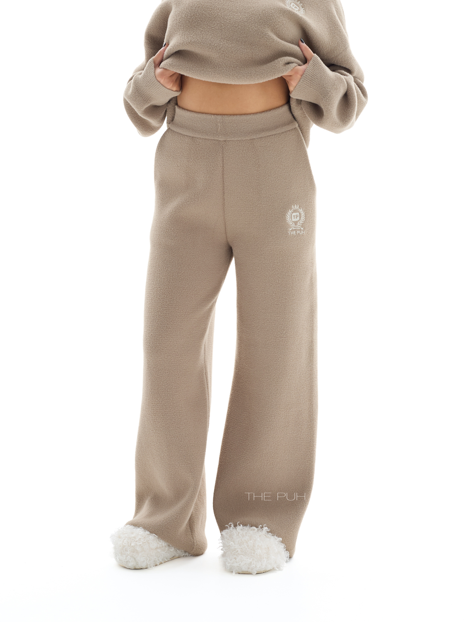 В комплект с свитеру идут брюки прямого кроя с двумя прорезными карманами по бокам. Брюки имеют высокую посадку с поясом на широкой эластичной резинке.