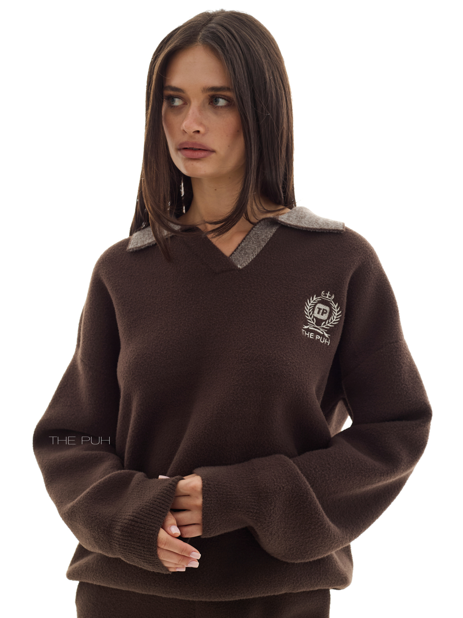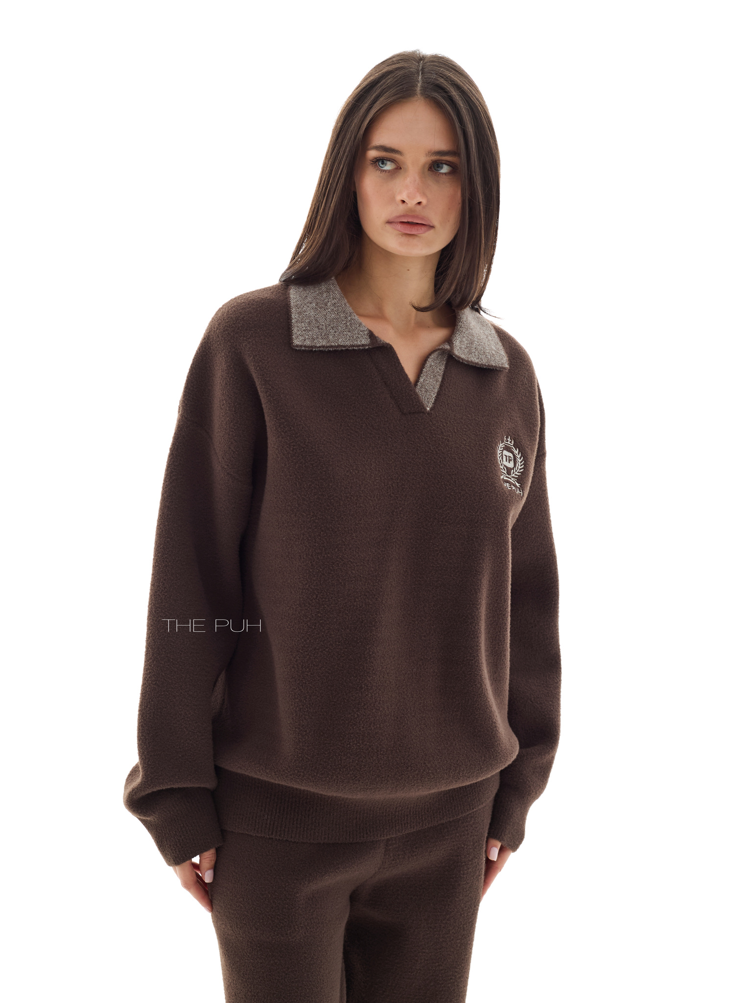 Верх костюма состоит из свитера в стиле спорт-шик с контрастным воротником-поло и вышивкой в виде герба с логотипом бренда.