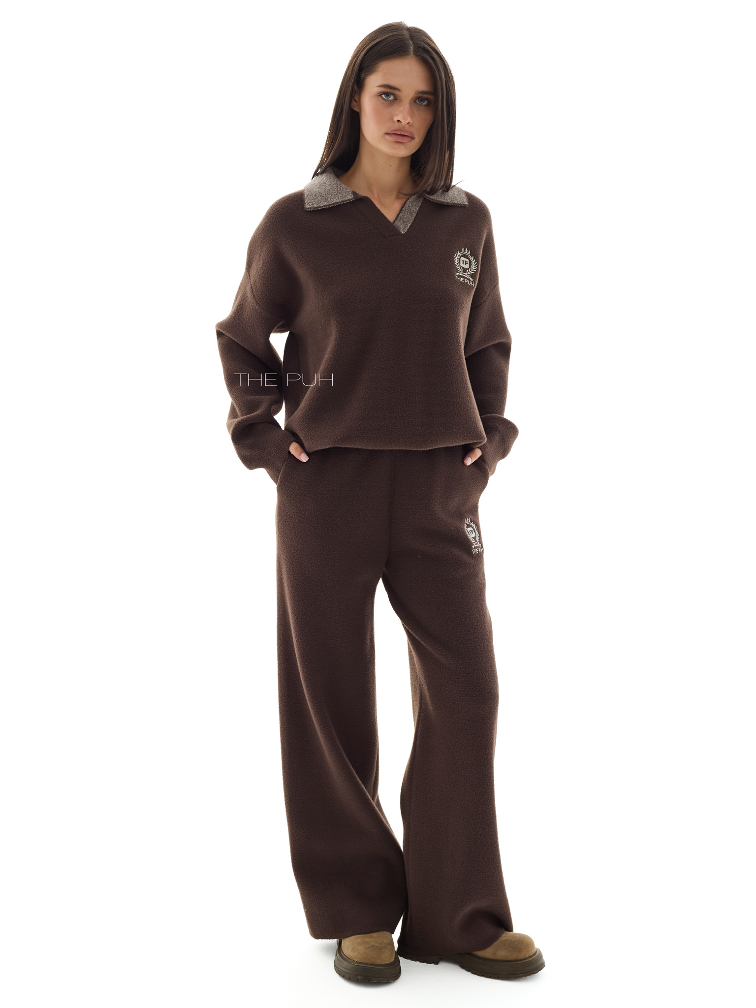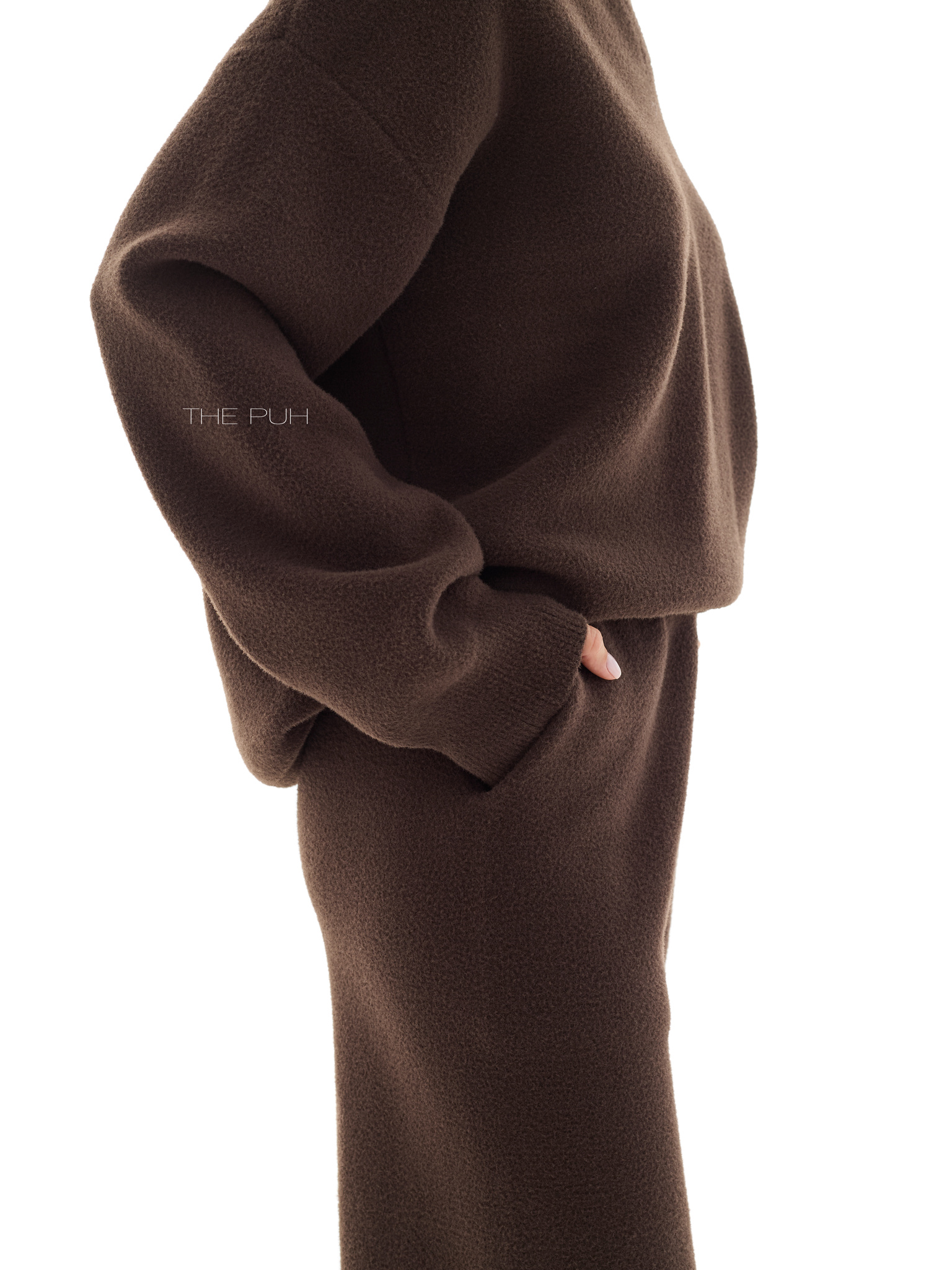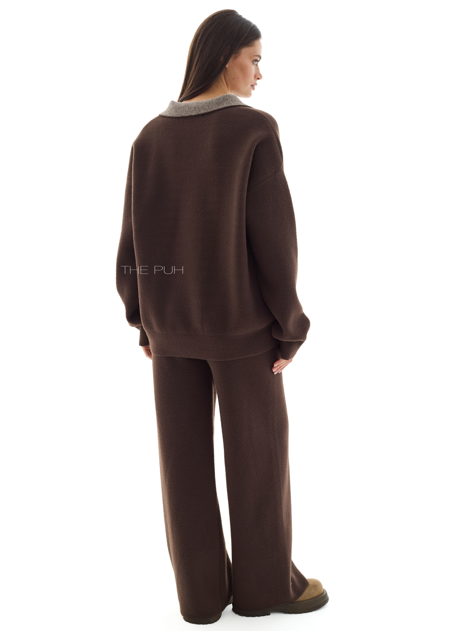 Трикотажный костюм шоколадного цвета, изготовленный из смесовой пряжи с добавлением шерсти и кашемира, обеспечивает несравненное ощущение мягкости и тепла.