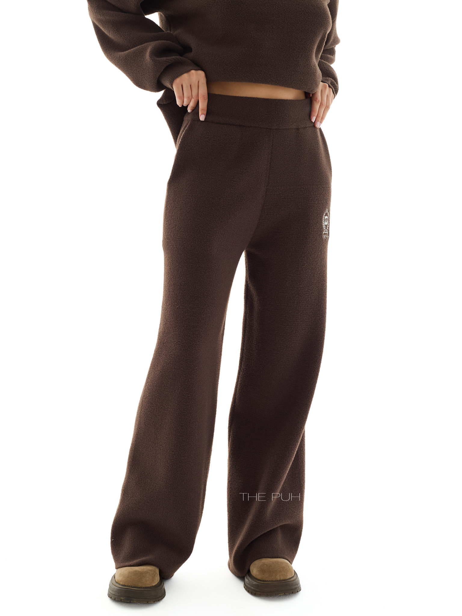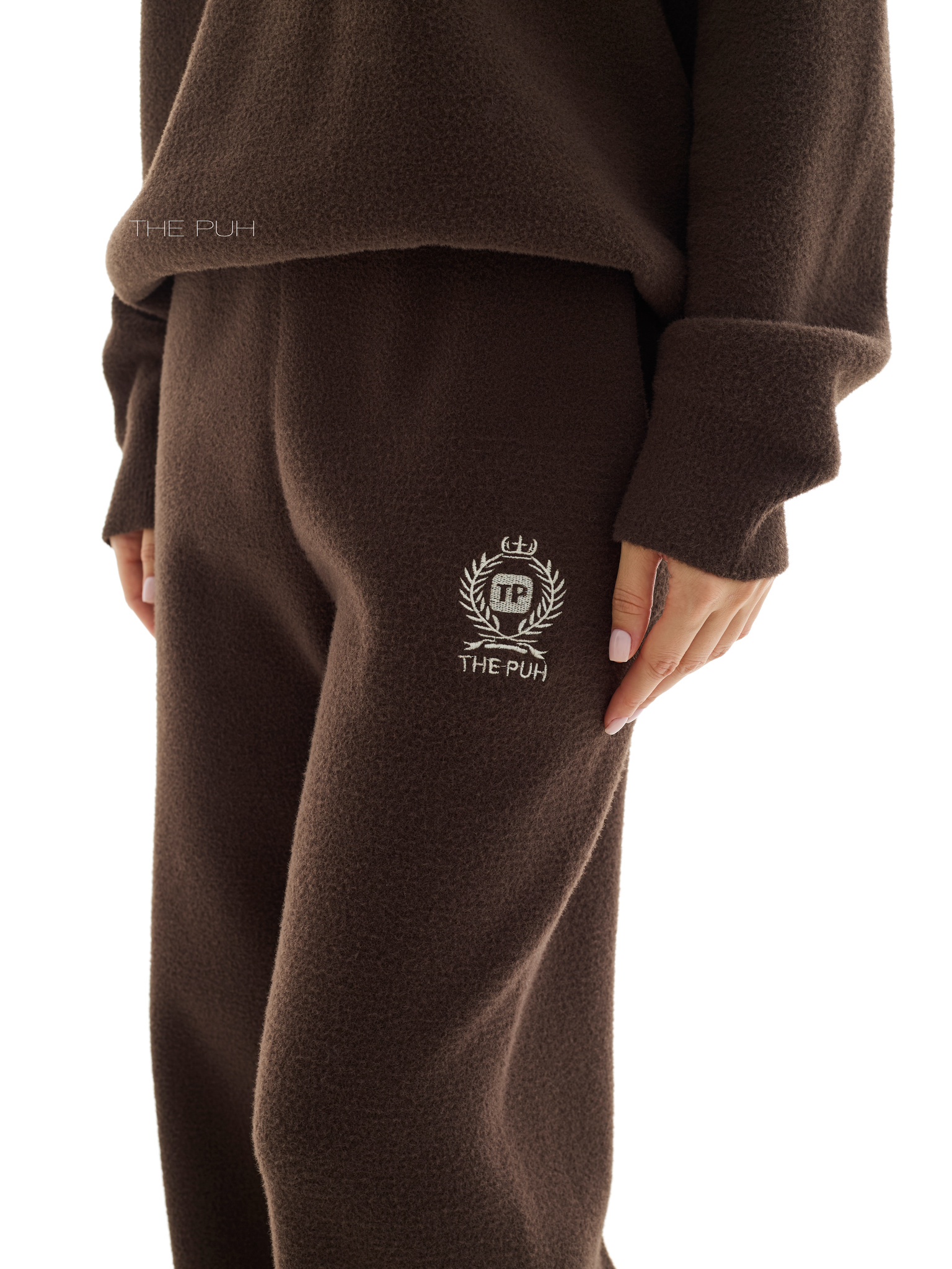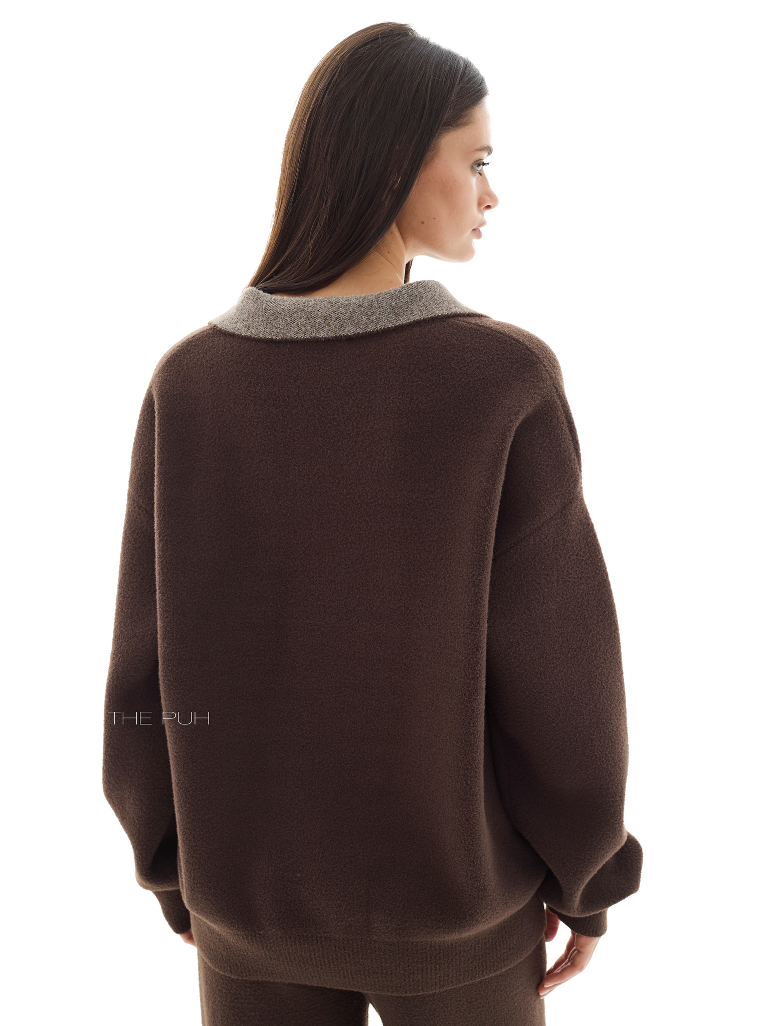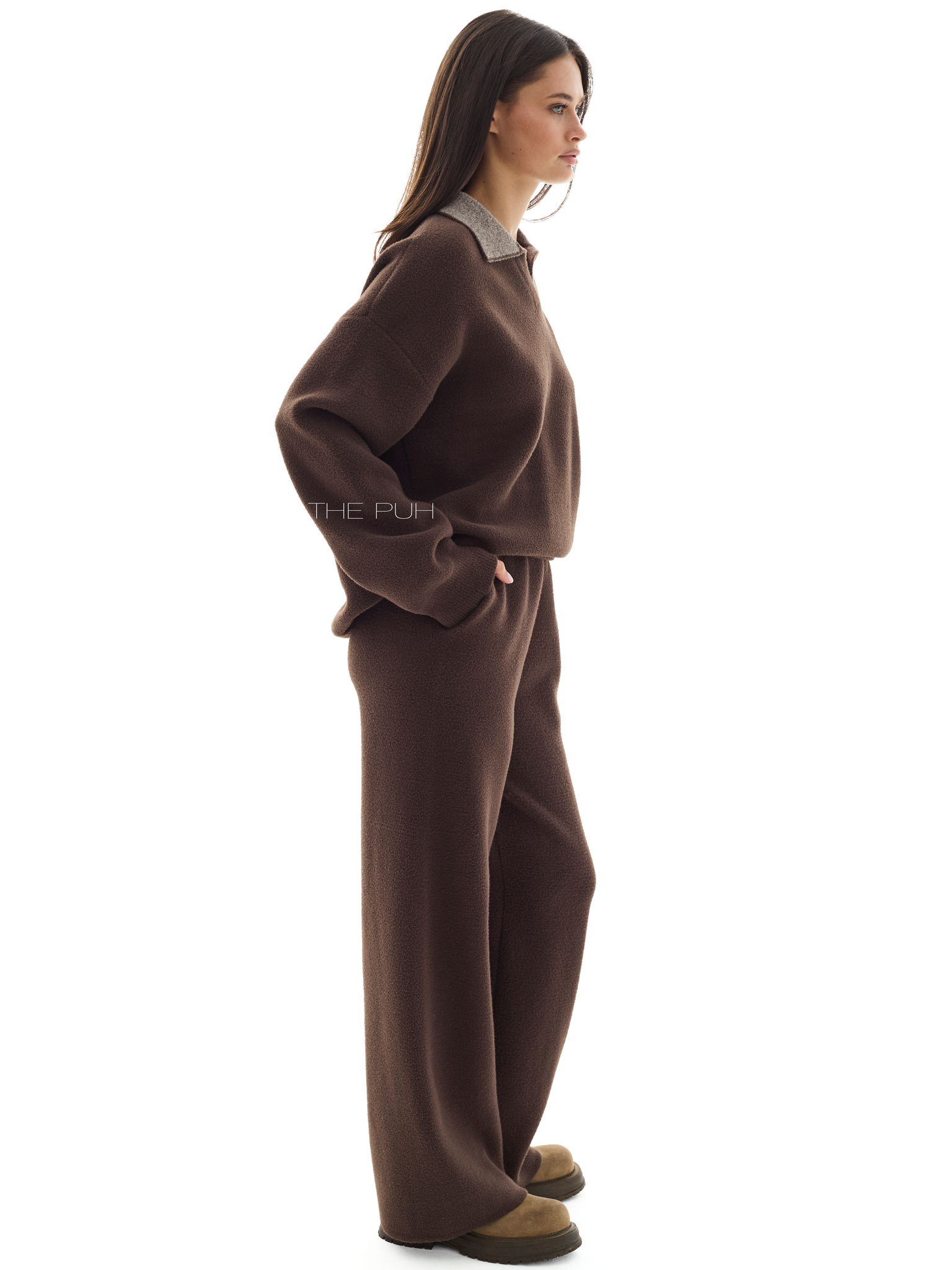 Трикотажный костюм шоколадного цвета, изготовленный из смесовой пряжи с добавлением шерсти и кашемира, обеспечивает несравненное ощущение мягкости и тепла.